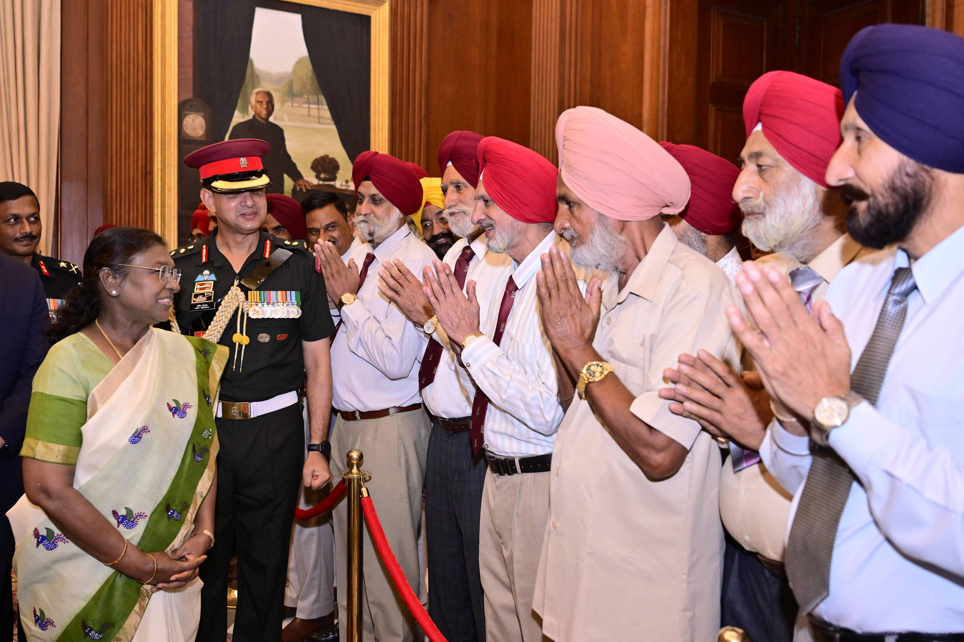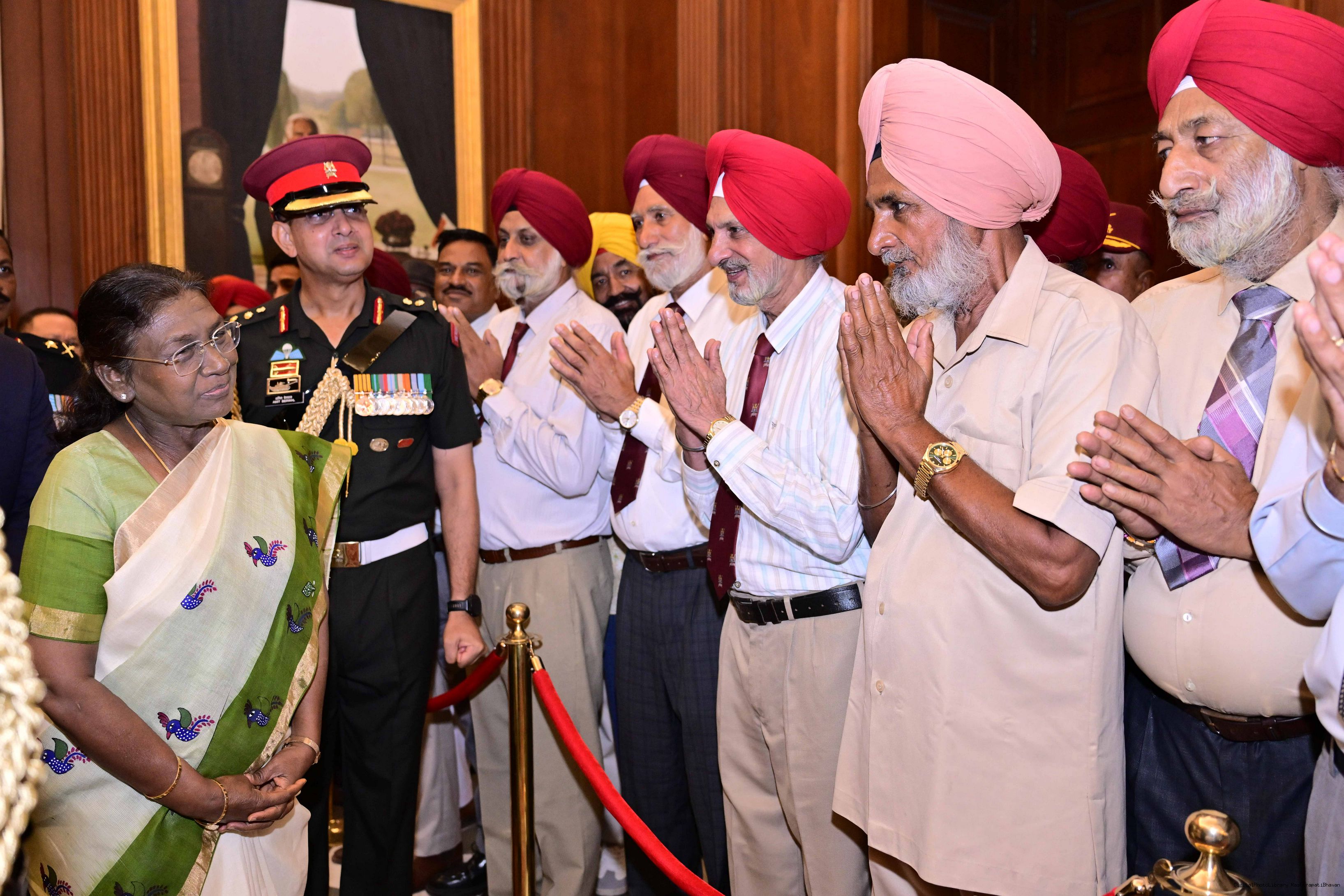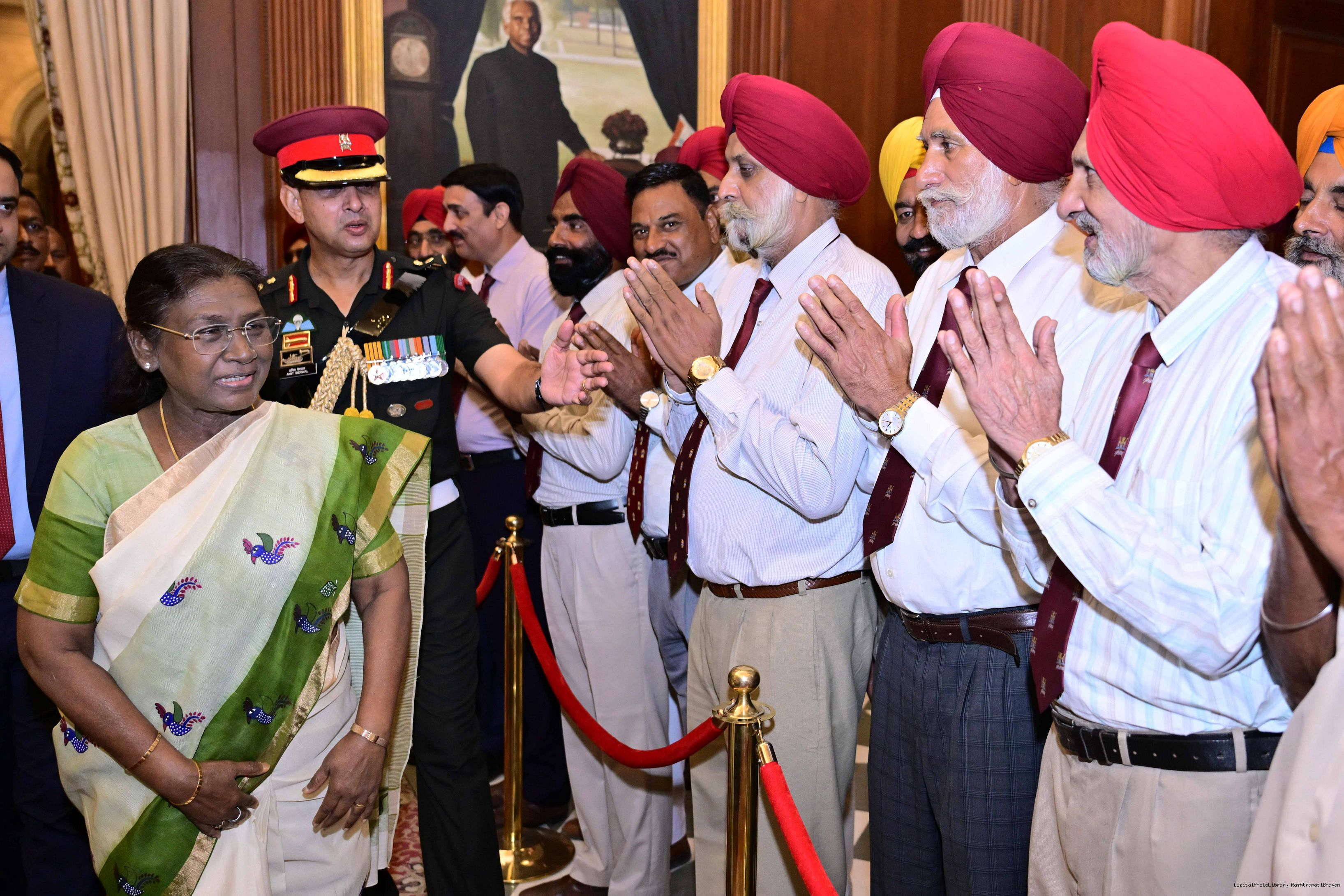 | Caption: | The President of India, Smt. Droupadi Murmu met and posing a group photograph with PBG personnel on the occasion of 75 years of being designated 'The President's Bodyguards' at Rashtrapati Bhavan on September 30, 2025. |