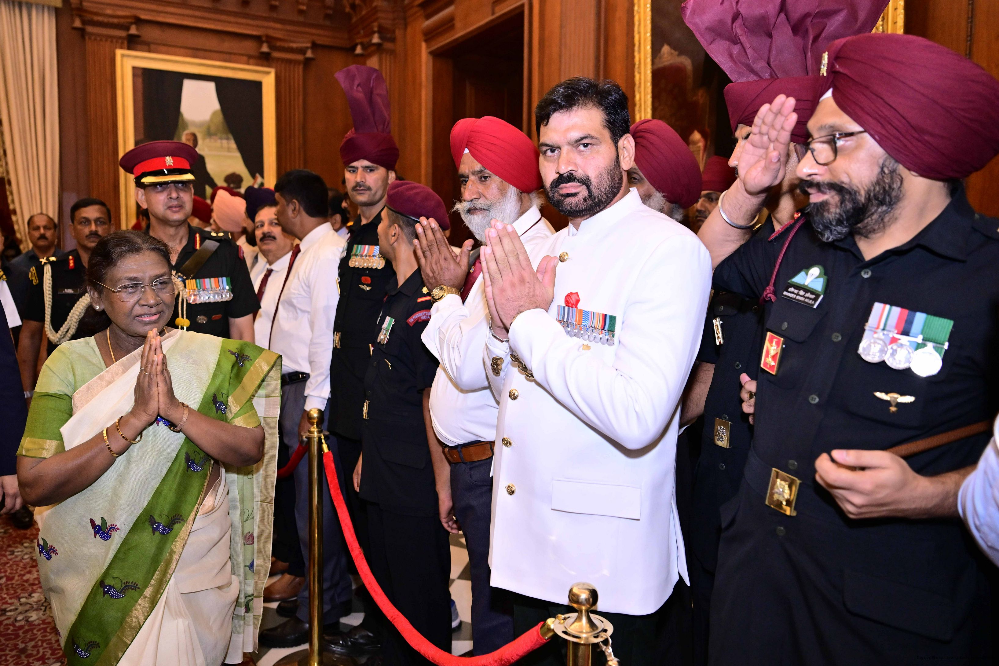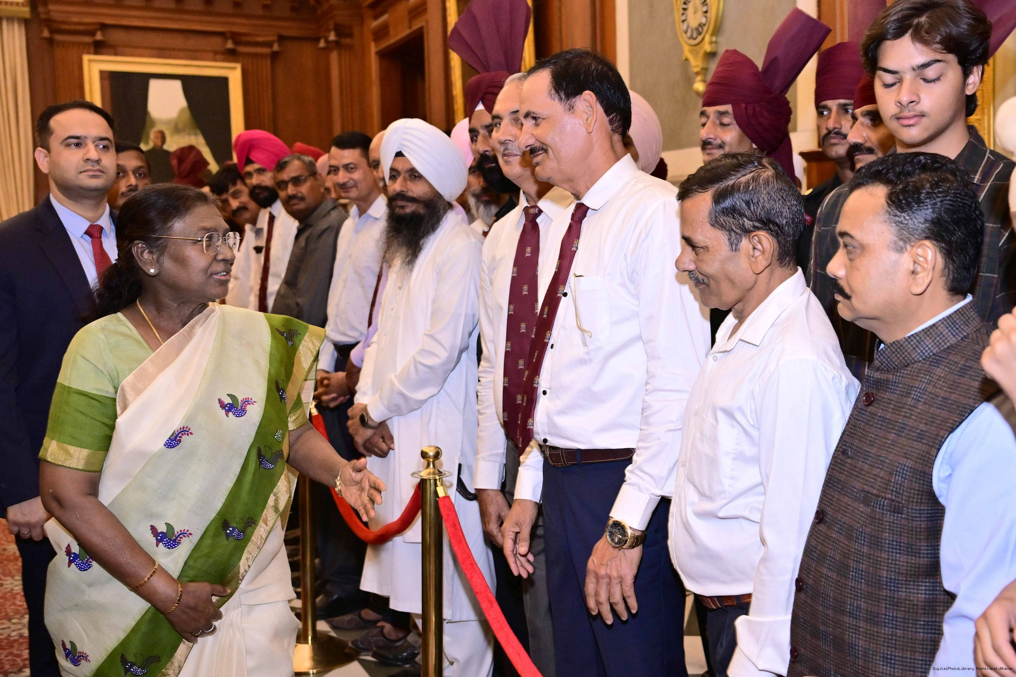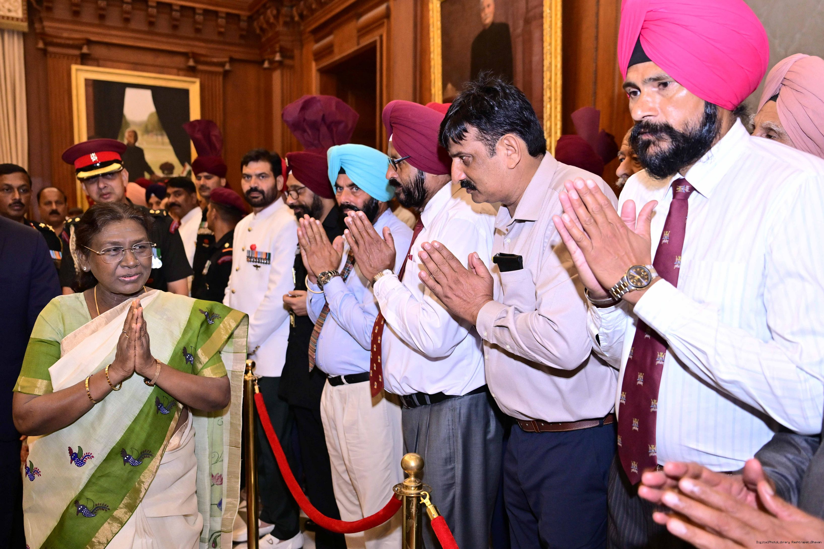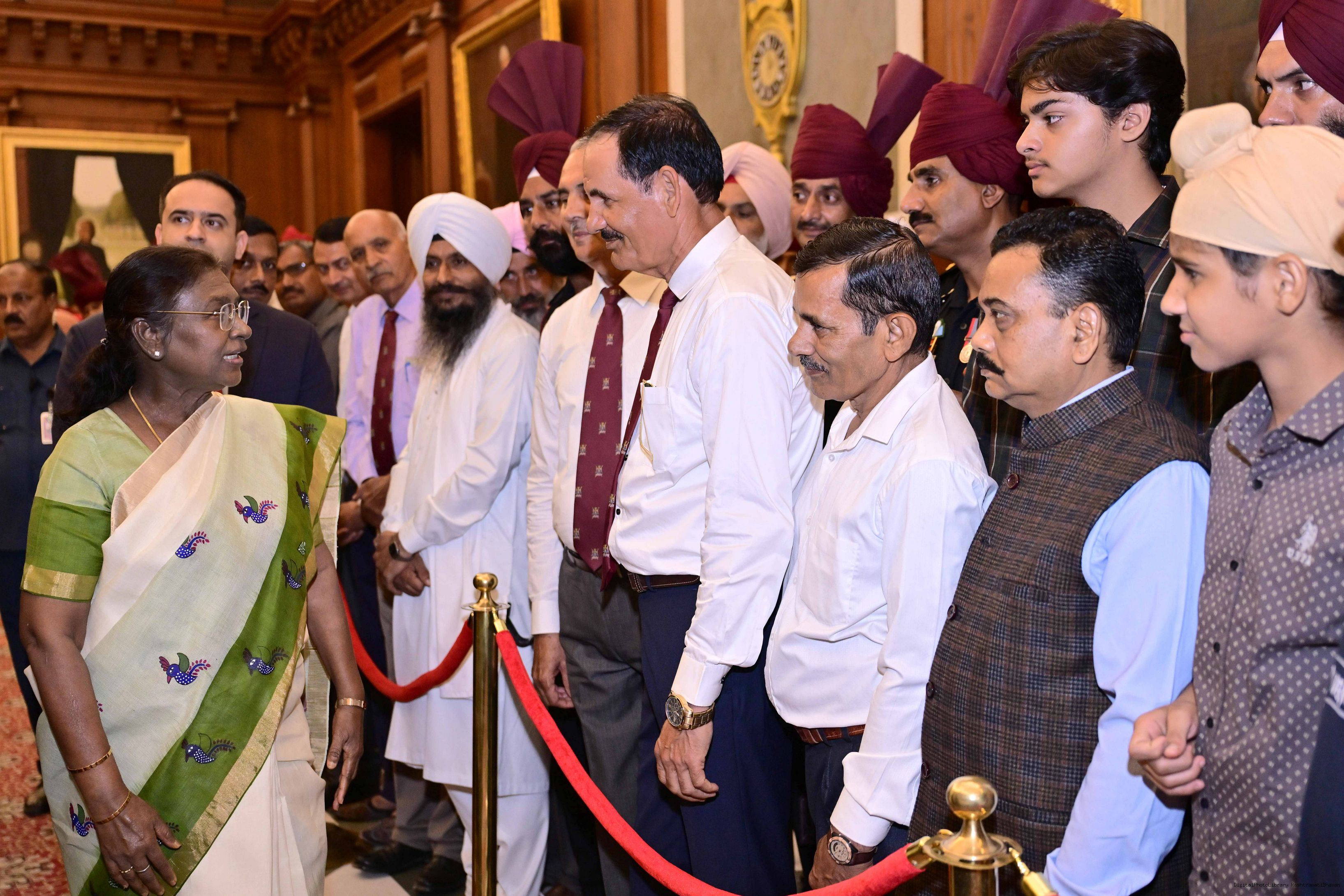 | Caption: | The President of India, Smt. Droupadi Murmu met and posing a group photograph with PBG personnel on the occasion of 75 years of being designated 'The President's Bodyguards' at Rashtrapati Bhavan on September 30, 2025. |