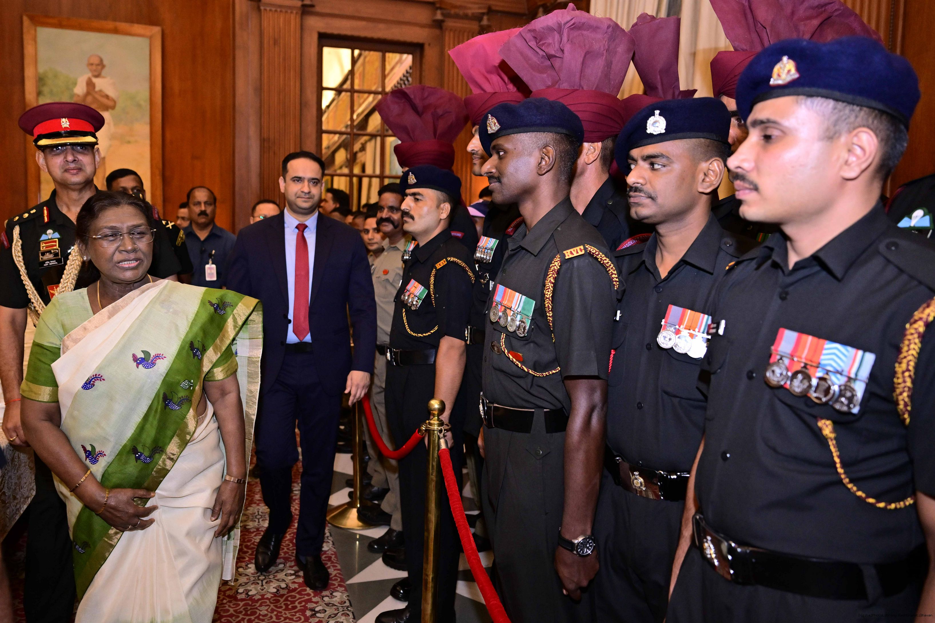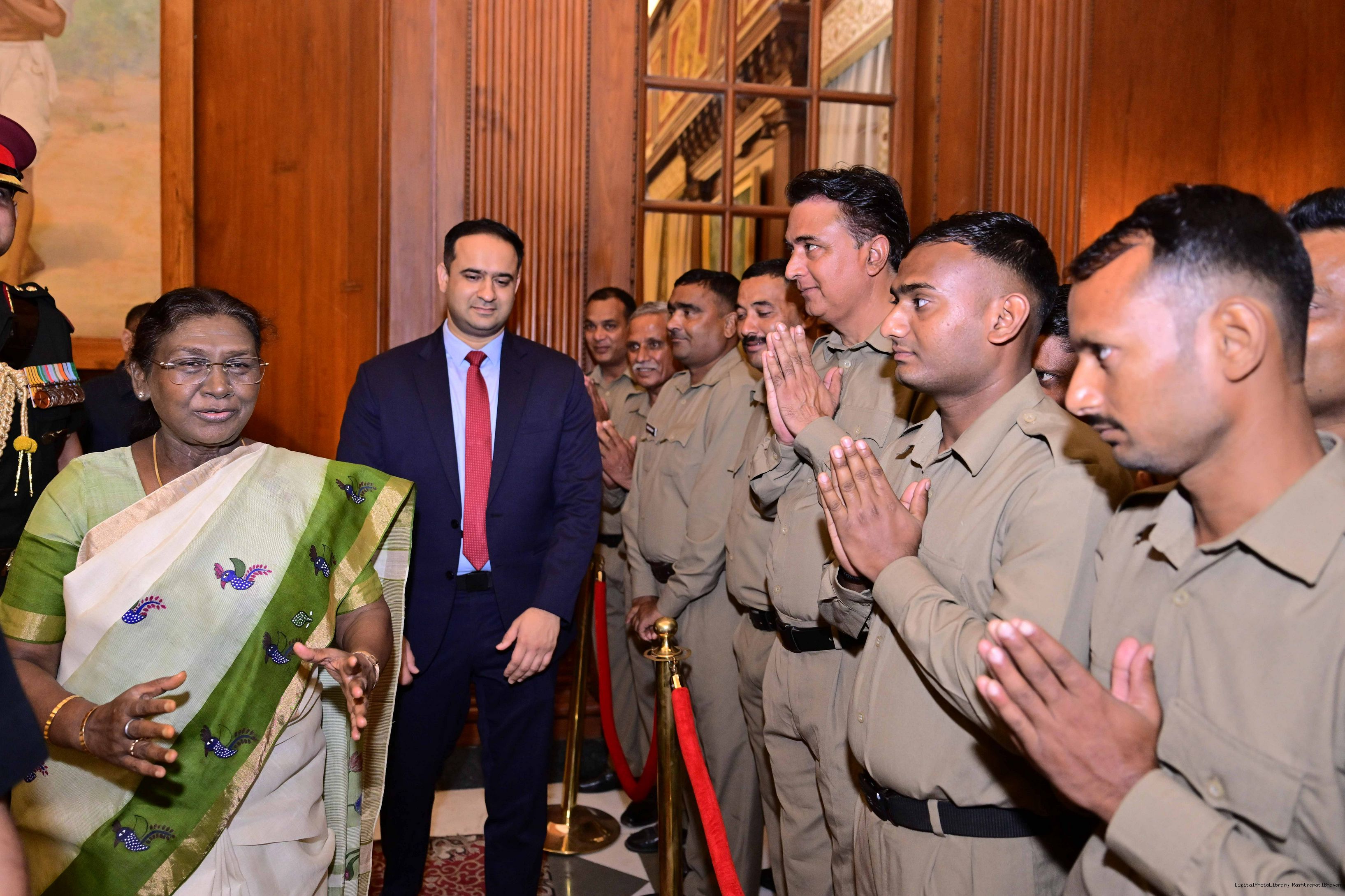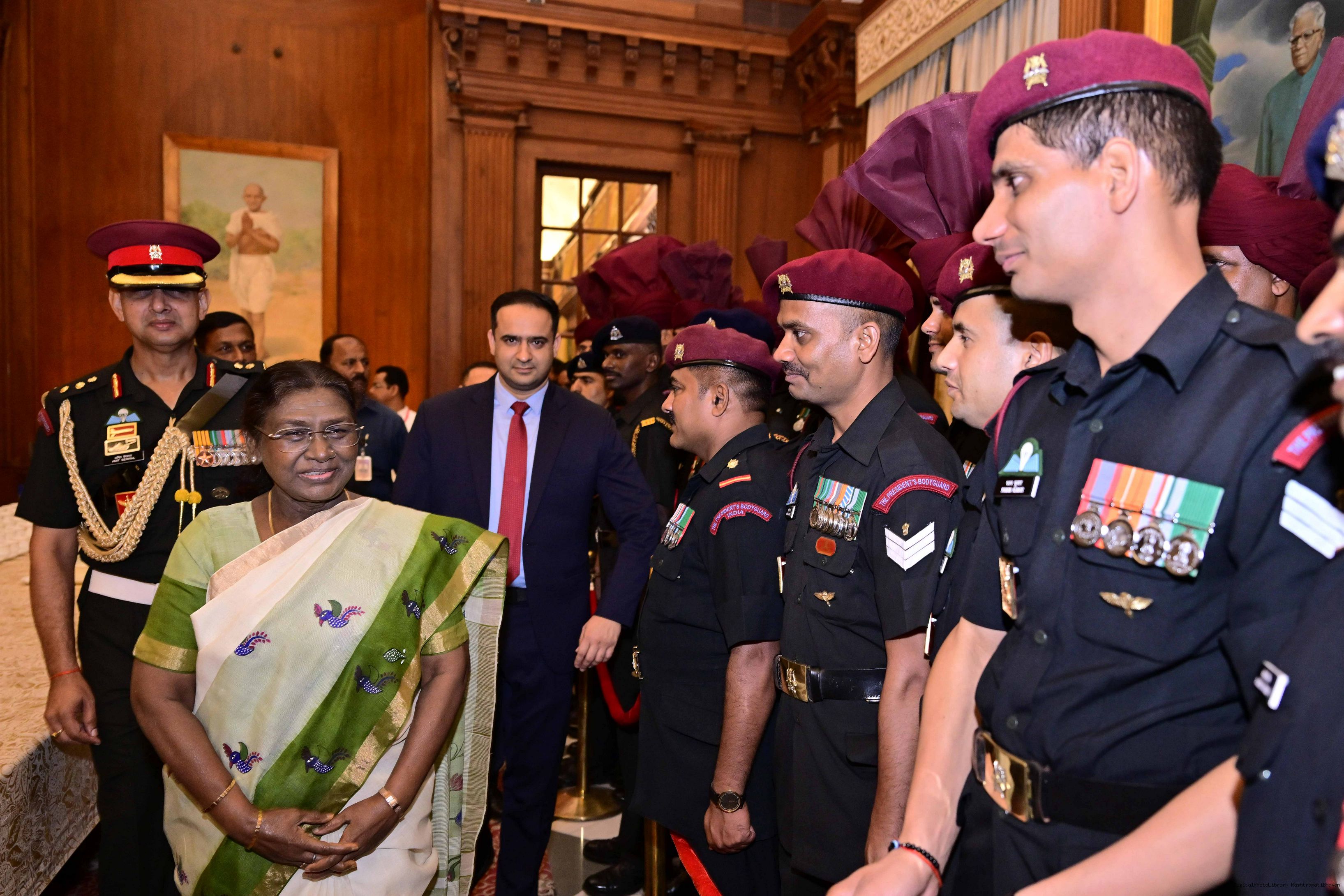 | Caption: | The President of India, Smt. Droupadi Murmu met and posing a group photograph with PBG personnel on the occasion of 75 years of being designated 'The President's Bodyguards' at Rashtrapati Bhavan on September 30, 2025. |