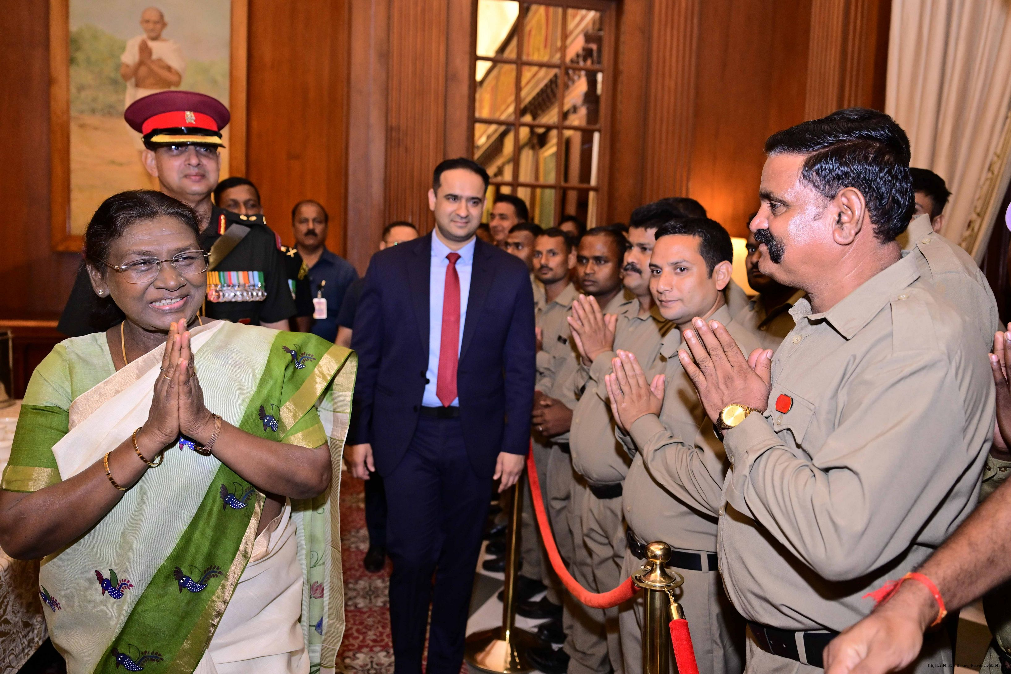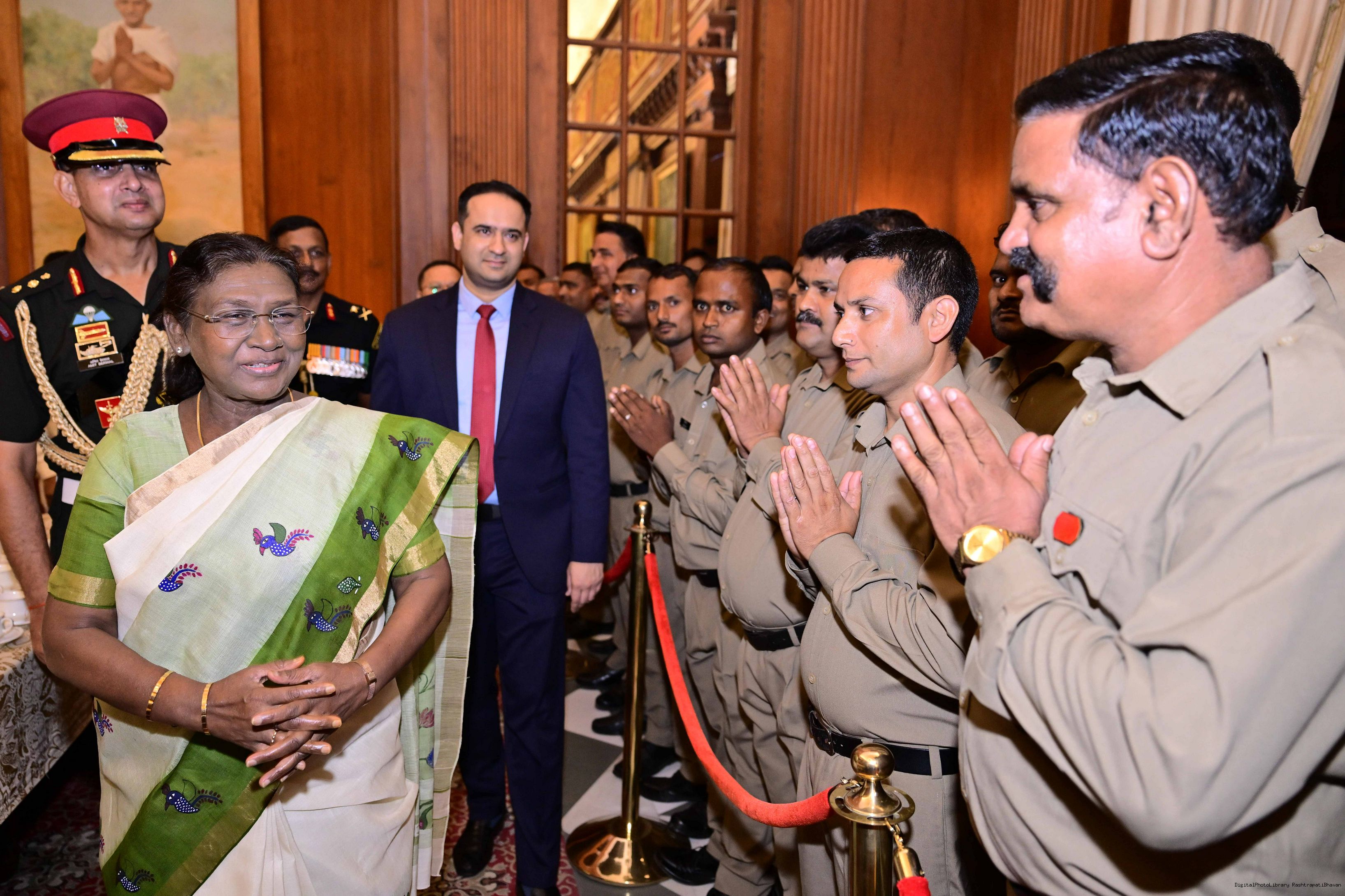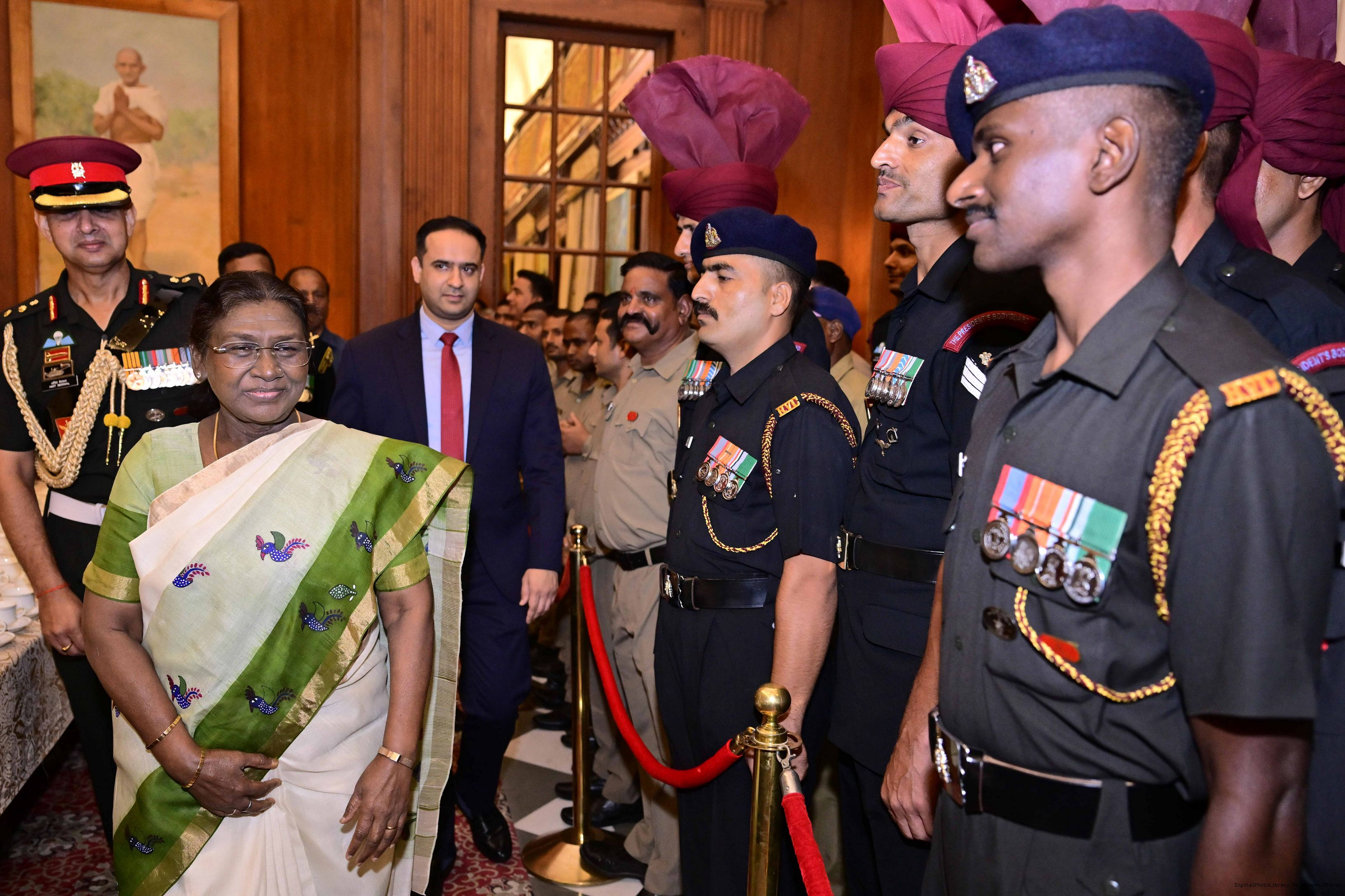 | Caption: | The President of India, Smt. Droupadi Murmu met and posing a group photograph with PBG personnel on the occasion of 75 years of being designated 'The President's Bodyguards' at Rashtrapati Bhavan on September 30, 2025. |