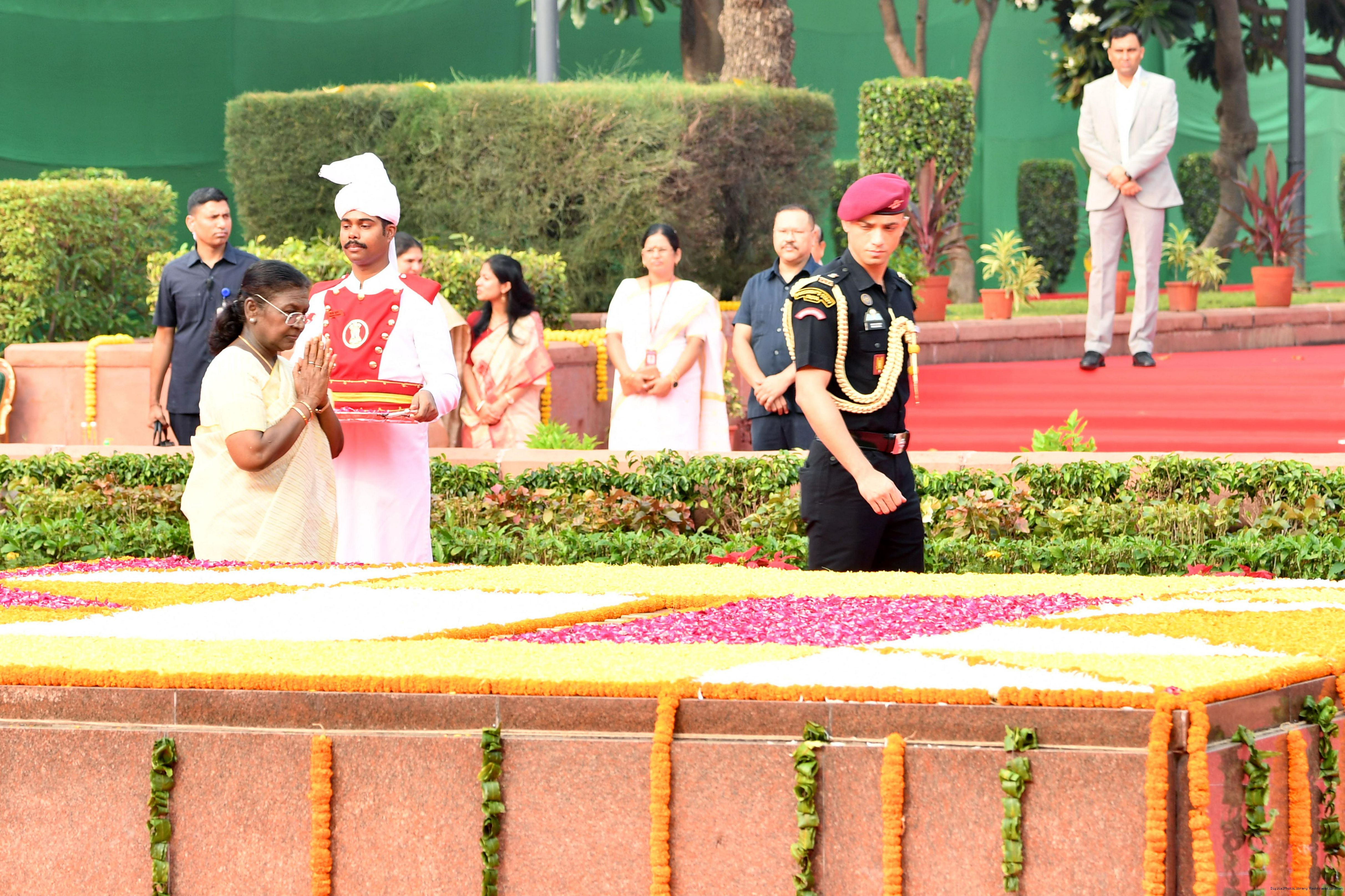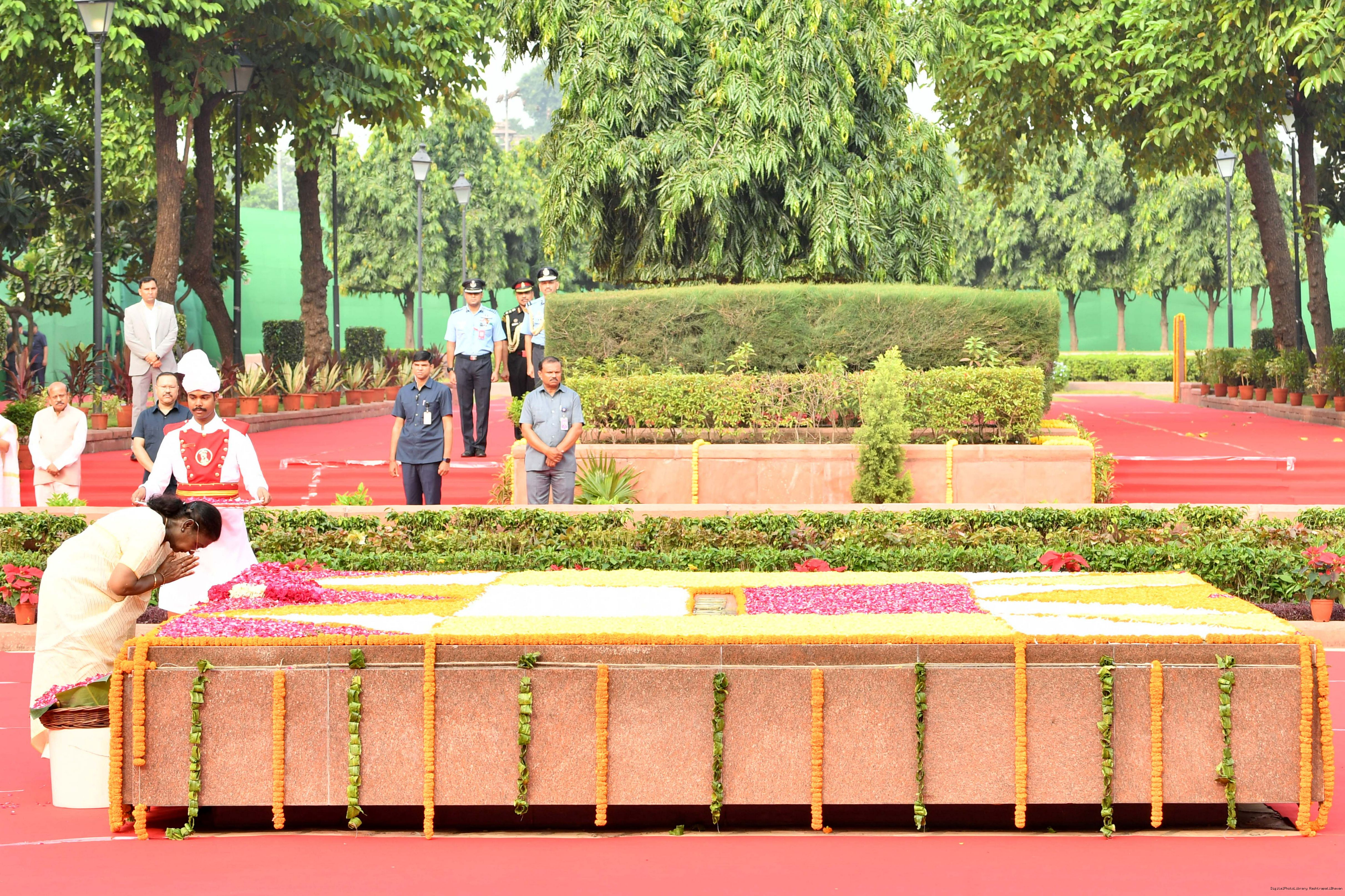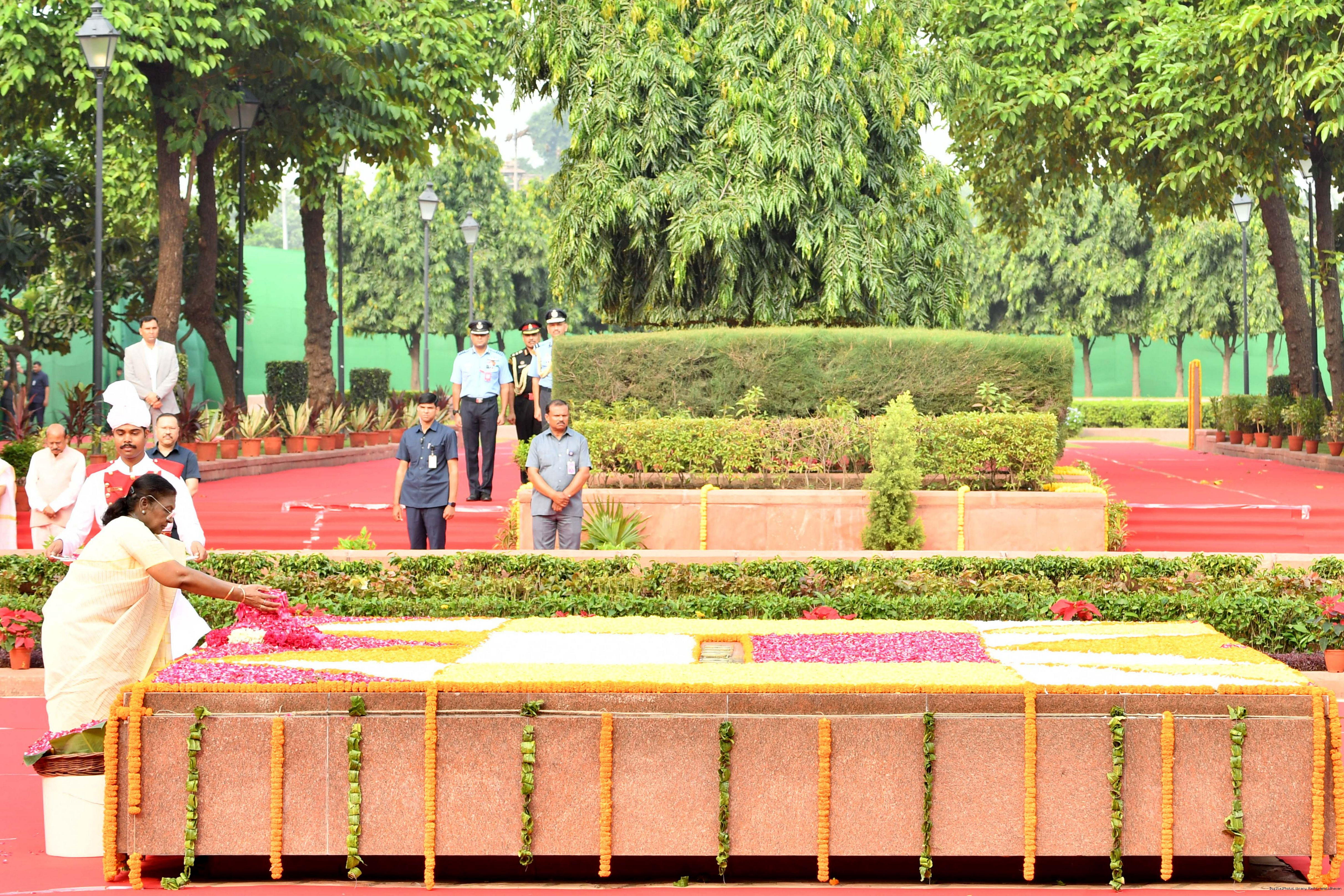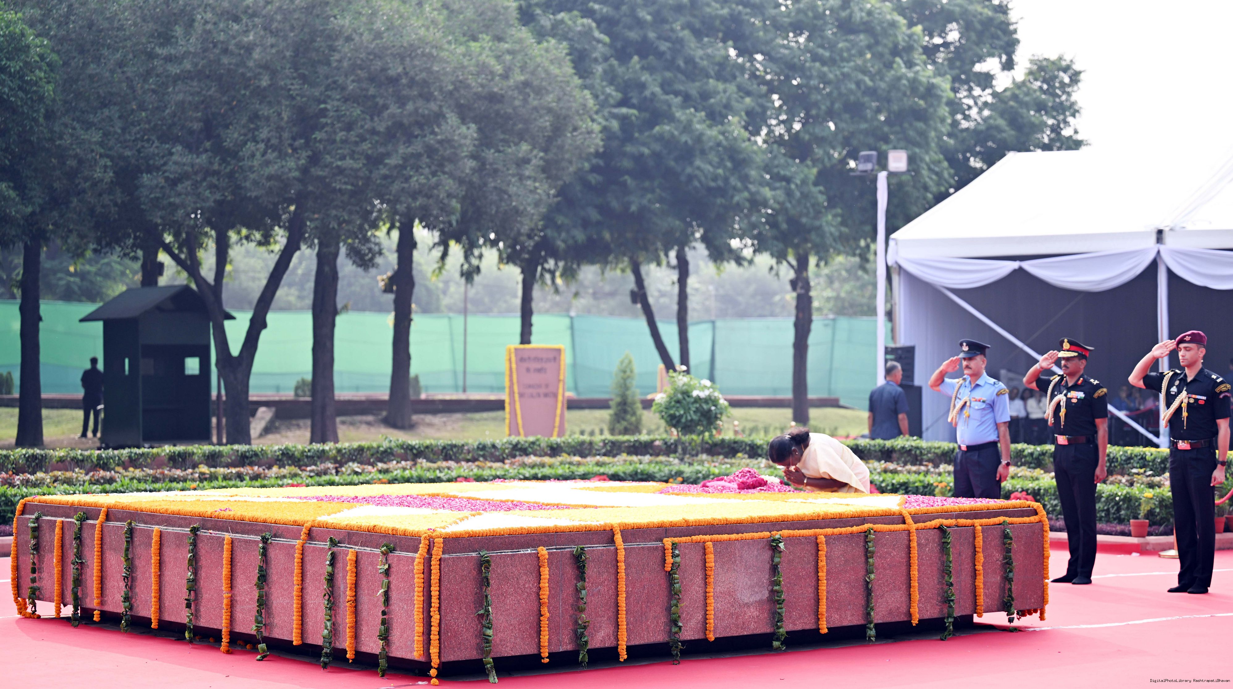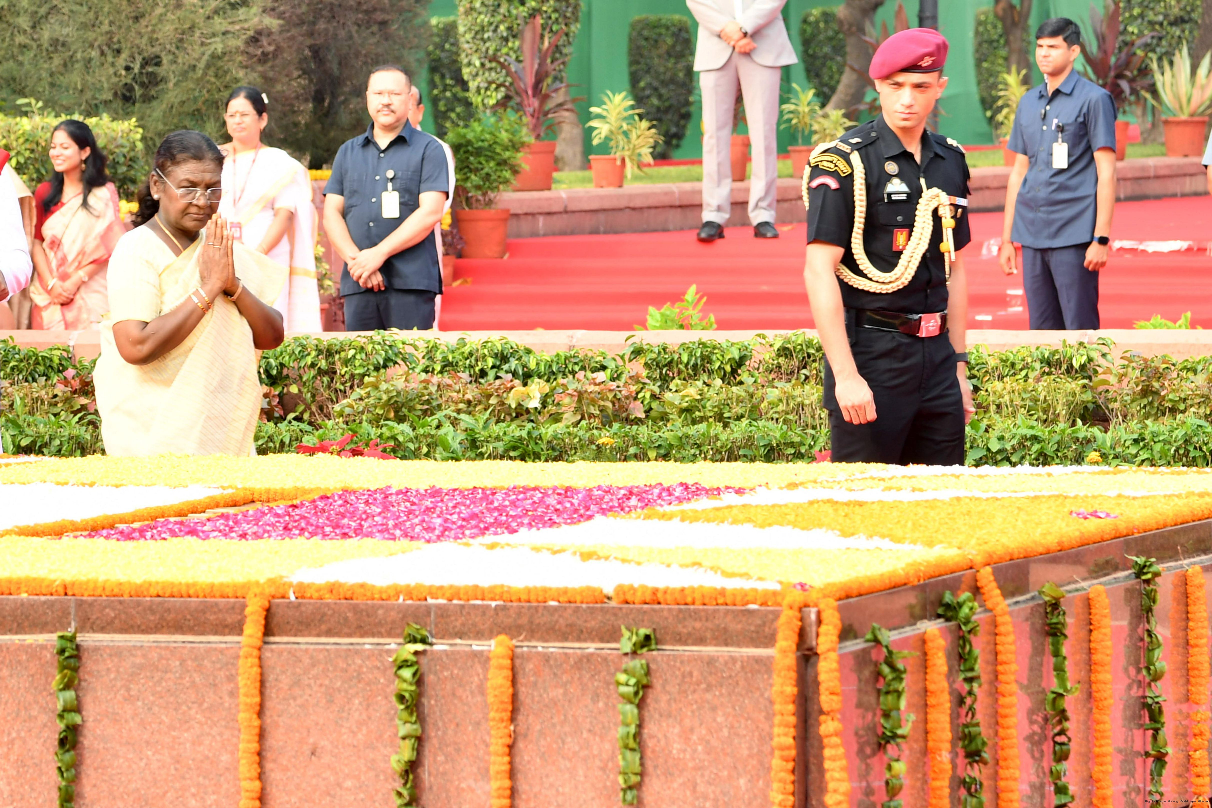 | Caption: | The President of India, Smt. Droupadi Murmu paid tributes to Shri Lal Bahadur Shastri, former Prime Minister of India on his birth anniversary at Vijay Ghat, New Delhi on October 2, 2025. |