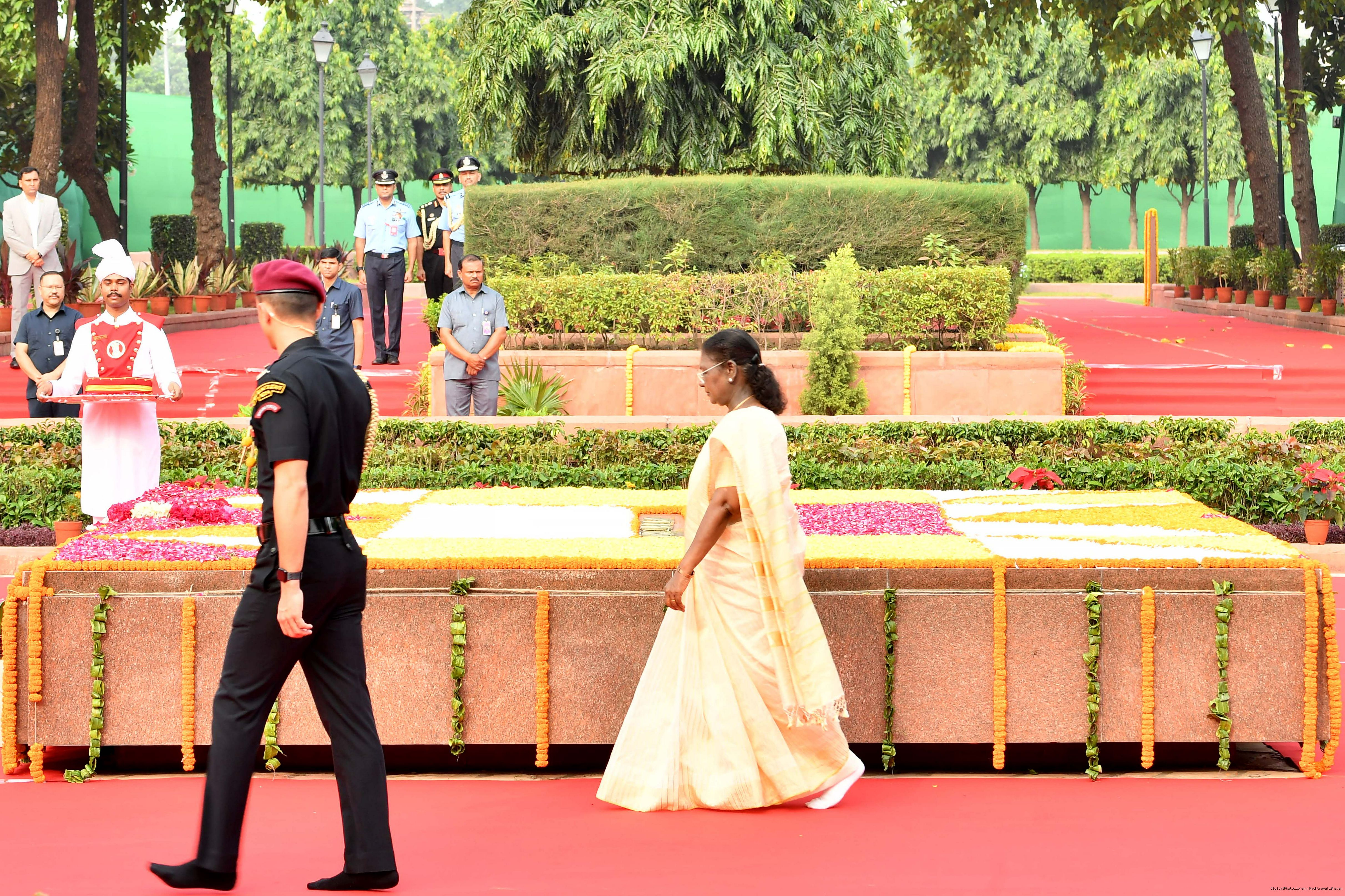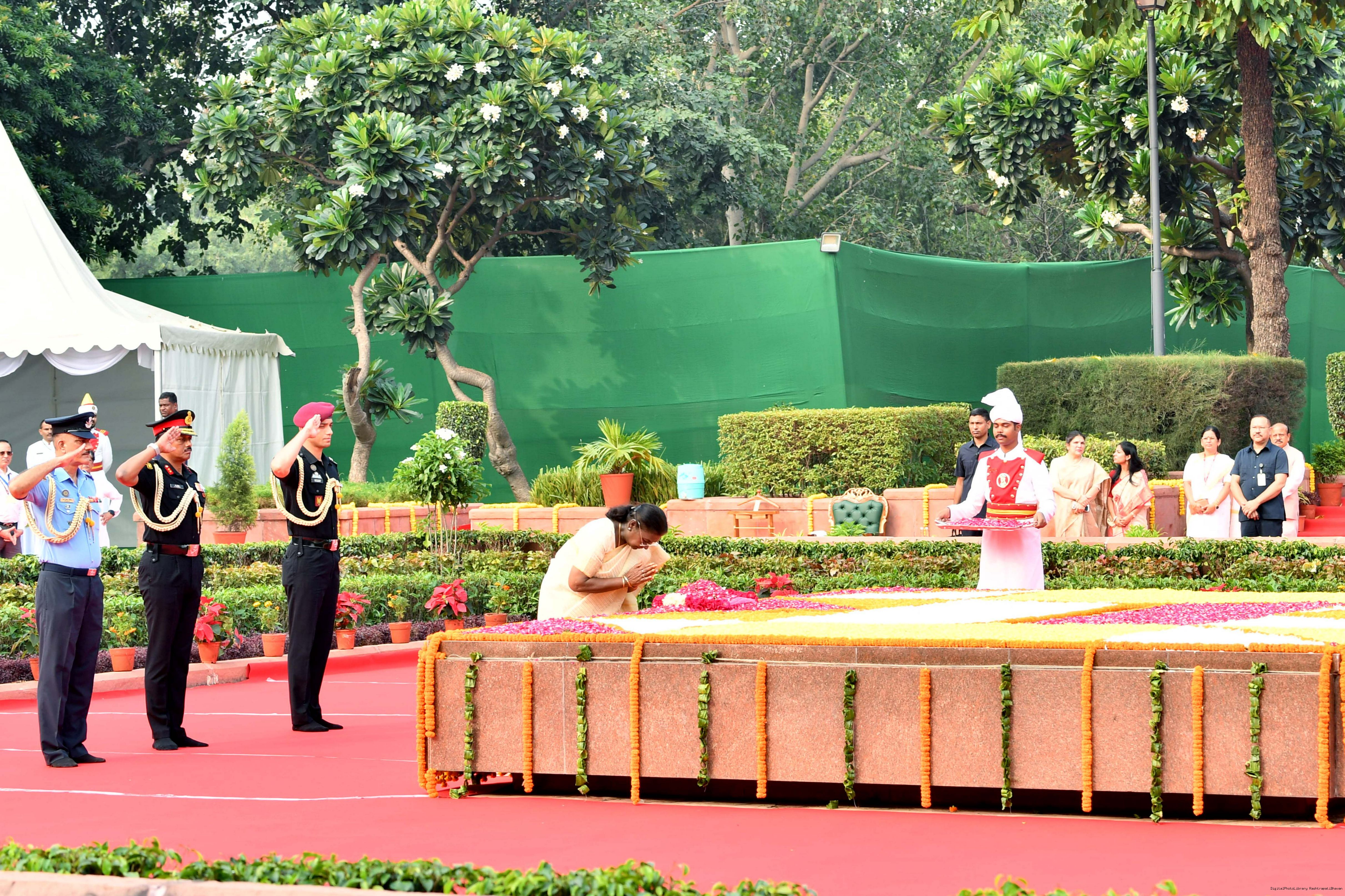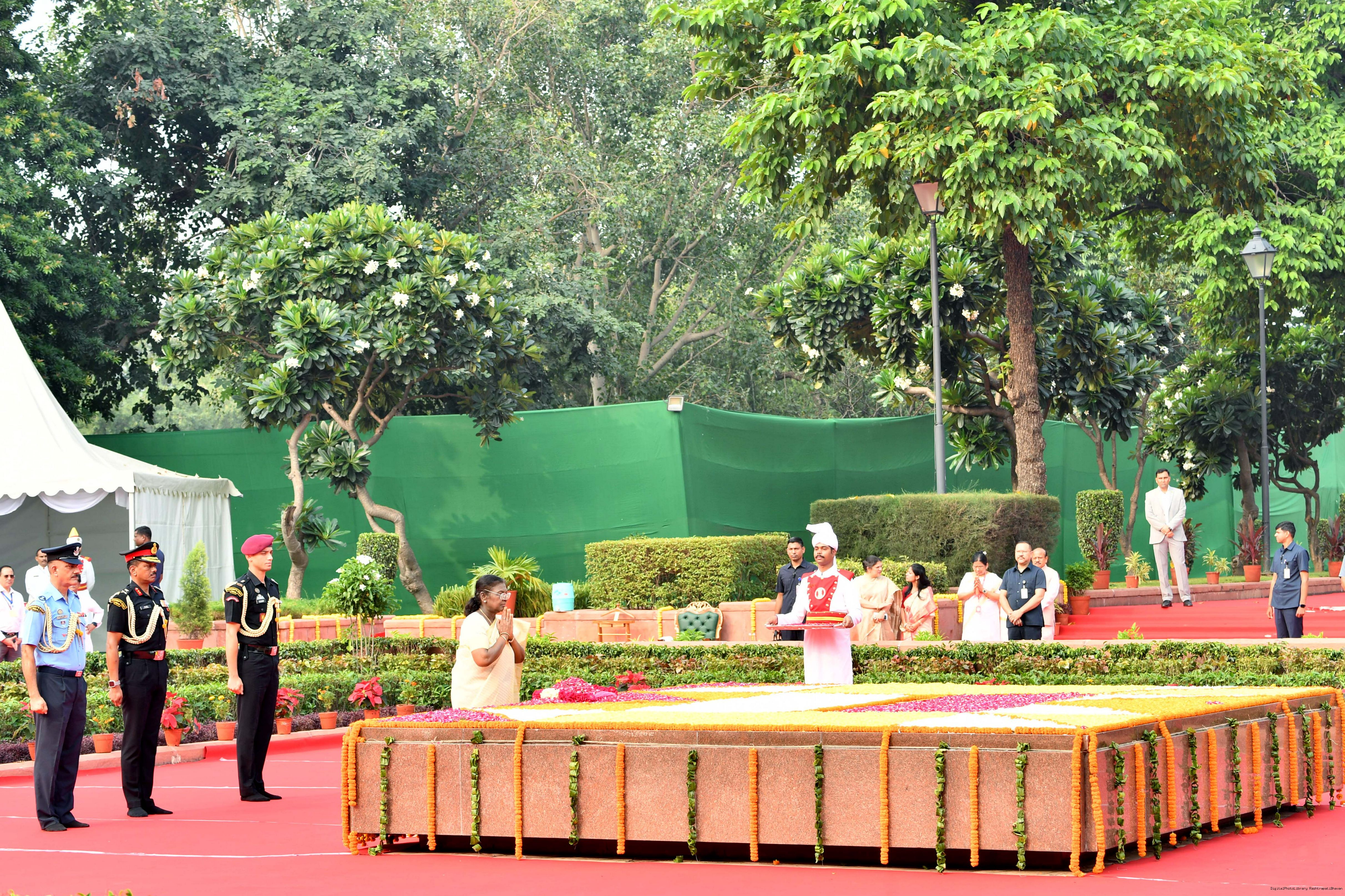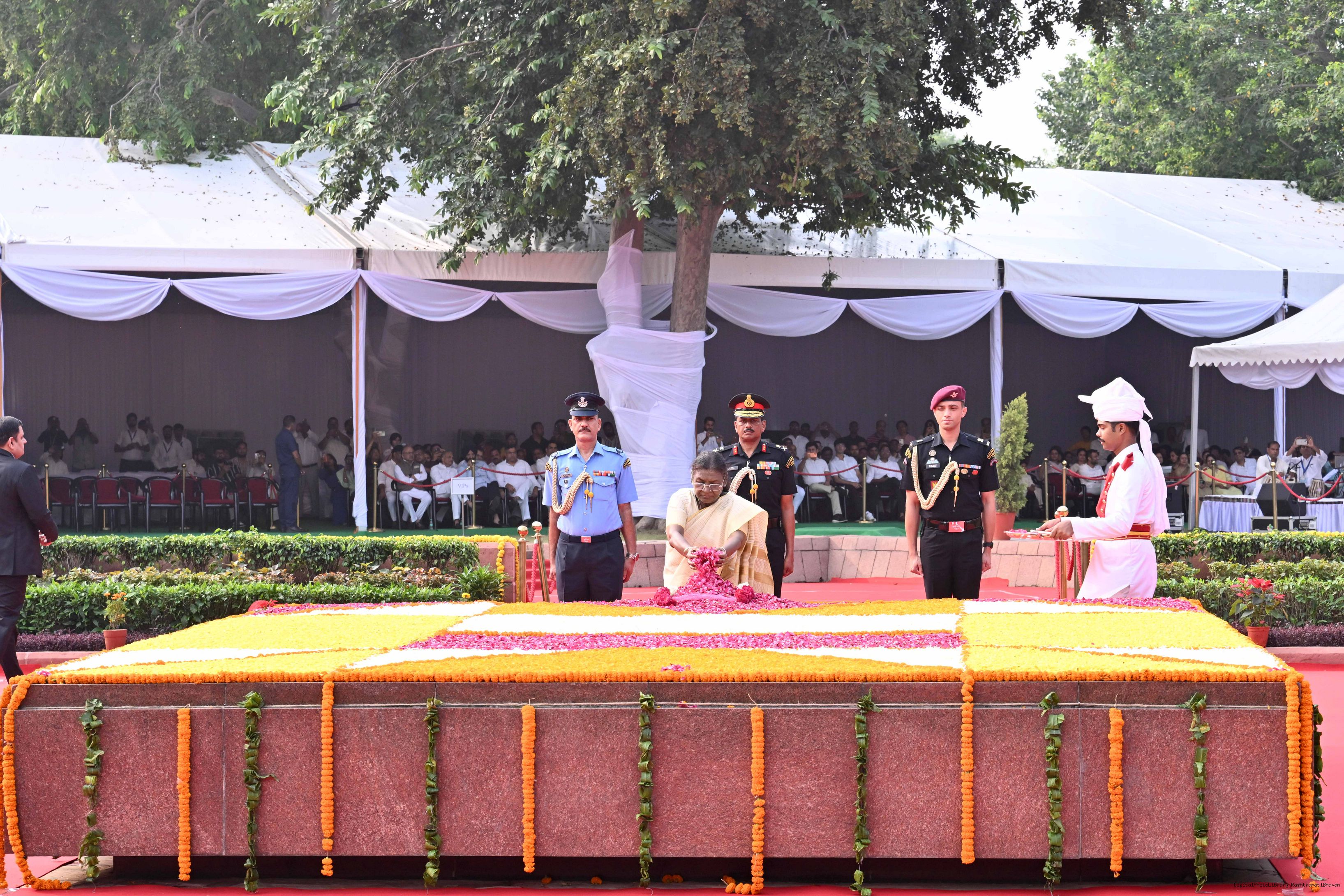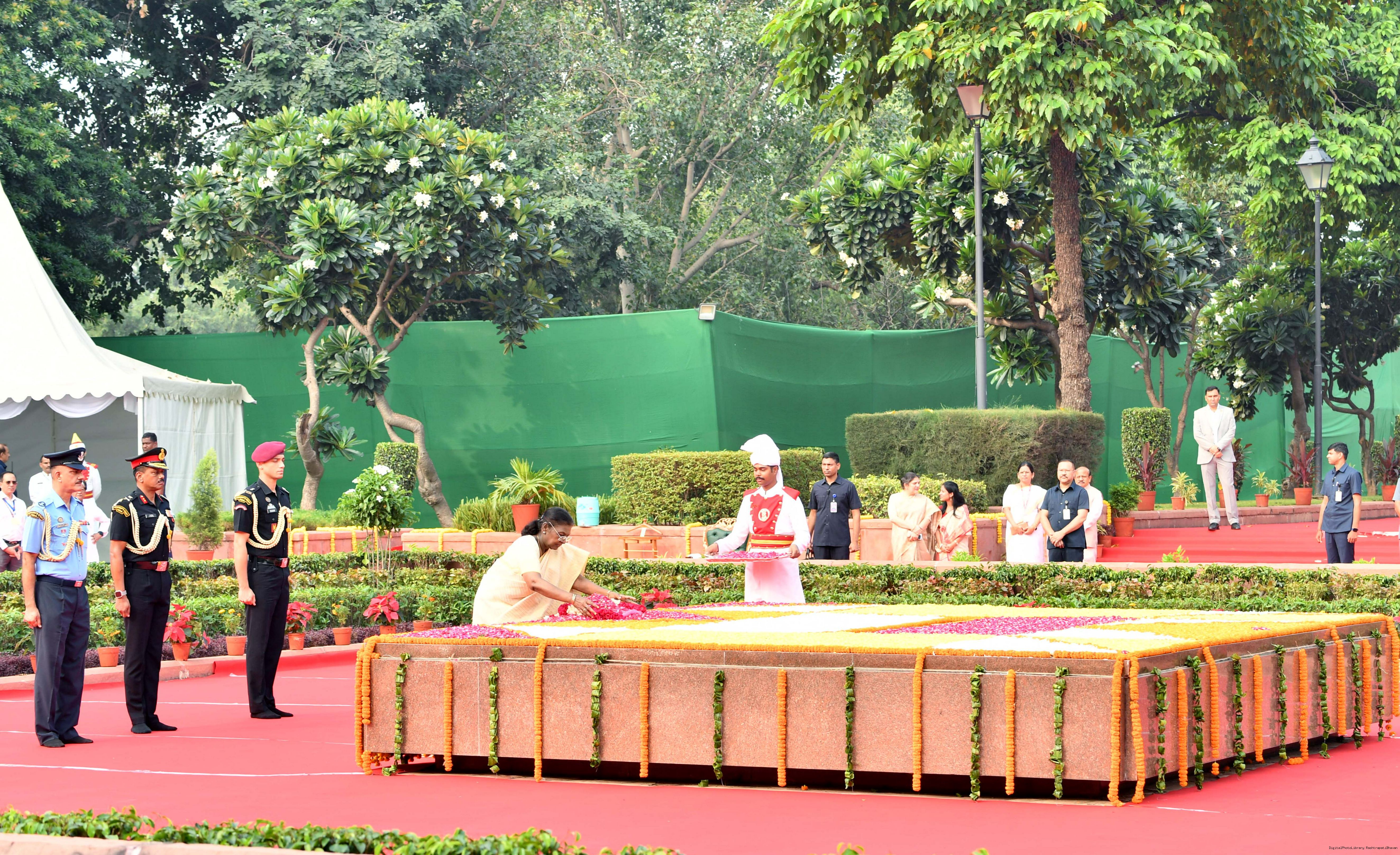 | Caption: | The President of India, Smt. Droupadi Murmu paid tributes to Shri Lal Bahadur Shastri, former Prime Minister of India on his birth anniversary at Vijay Ghat, New Delhi on October 2, 2025. |