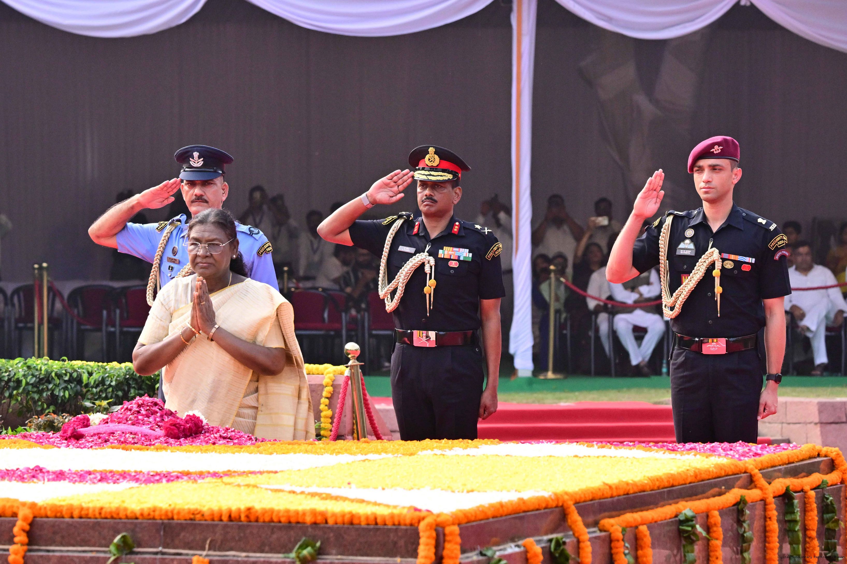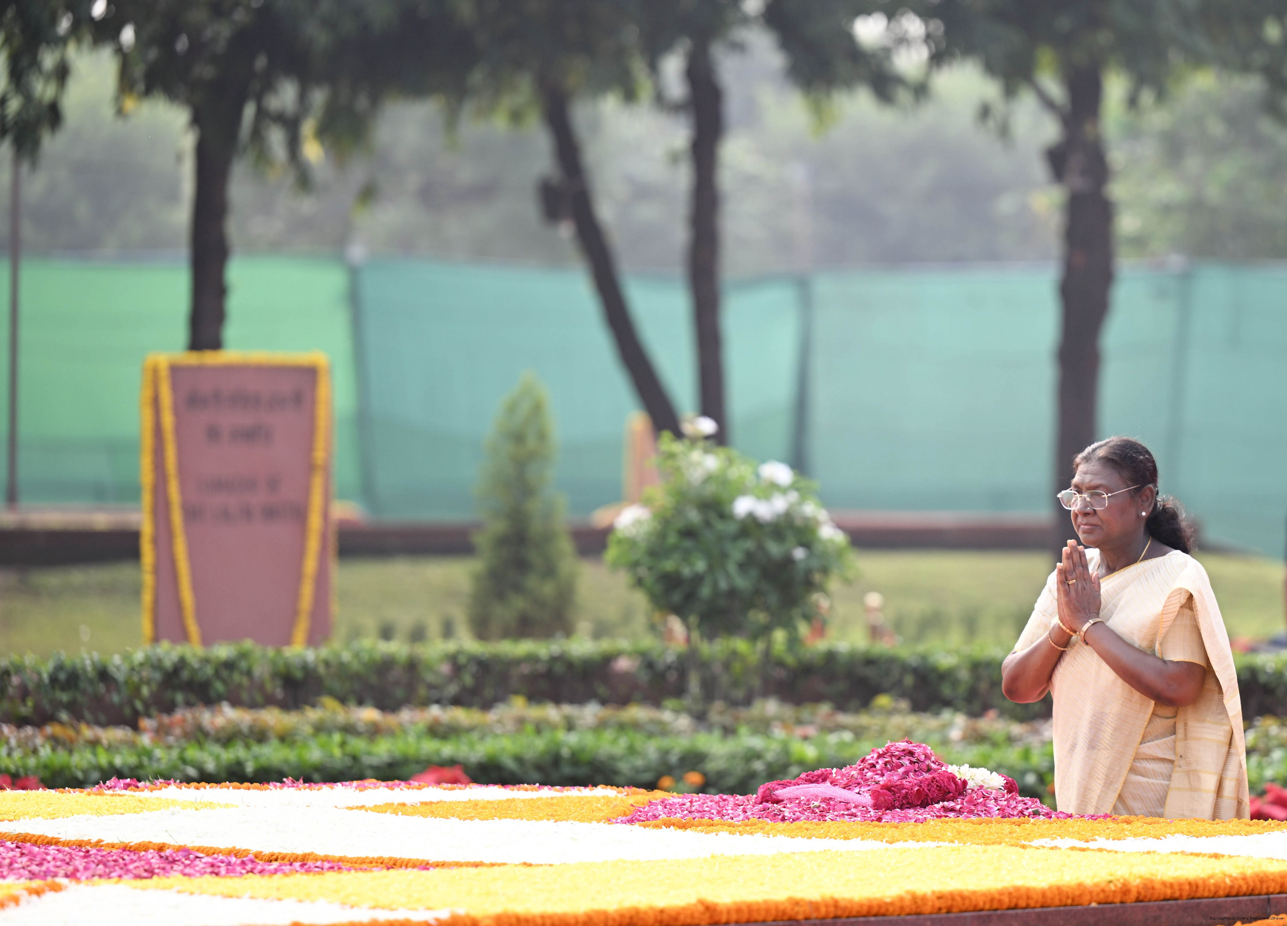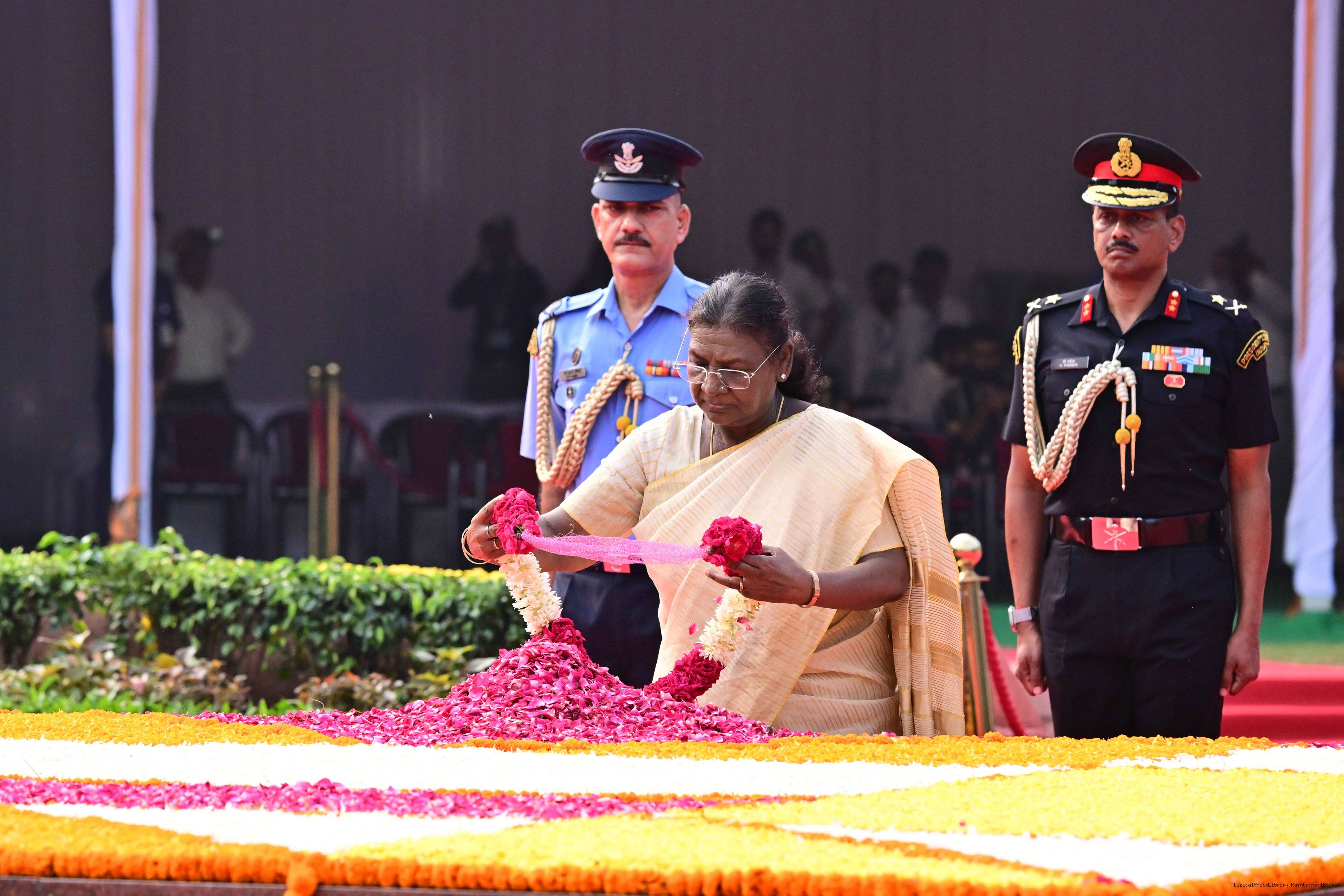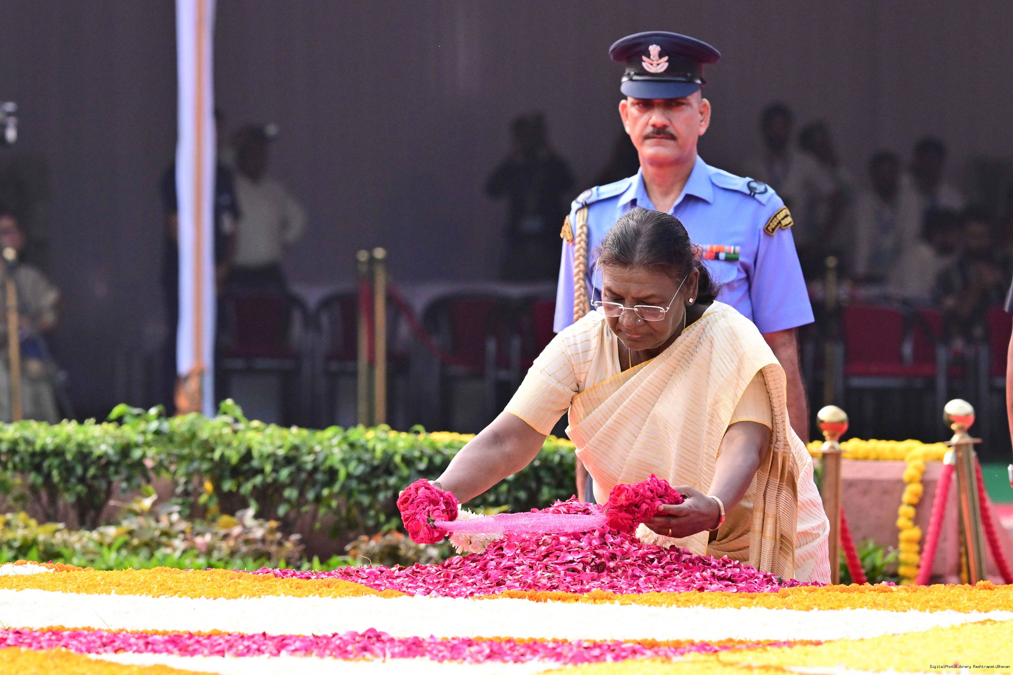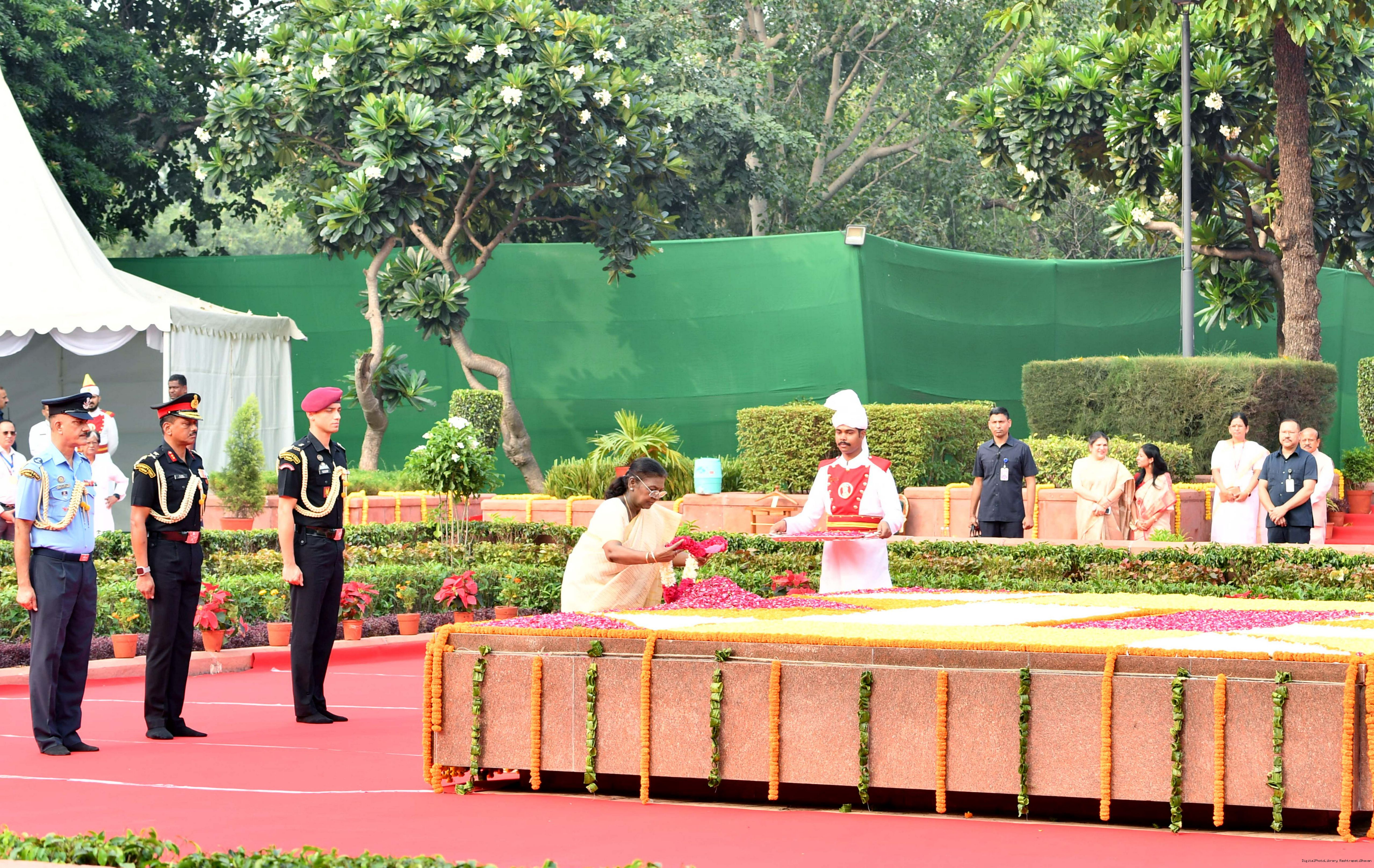 | Caption: | The President of India, Smt. Droupadi Murmu paid tributes to Shri Lal Bahadur Shastri, former Prime Minister of India on his birth anniversary at Vijay Ghat, New Delhi on October 2, 2025. |