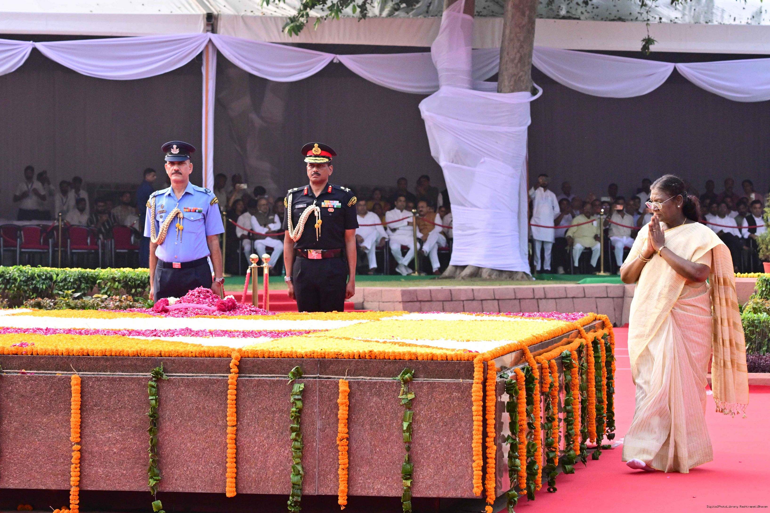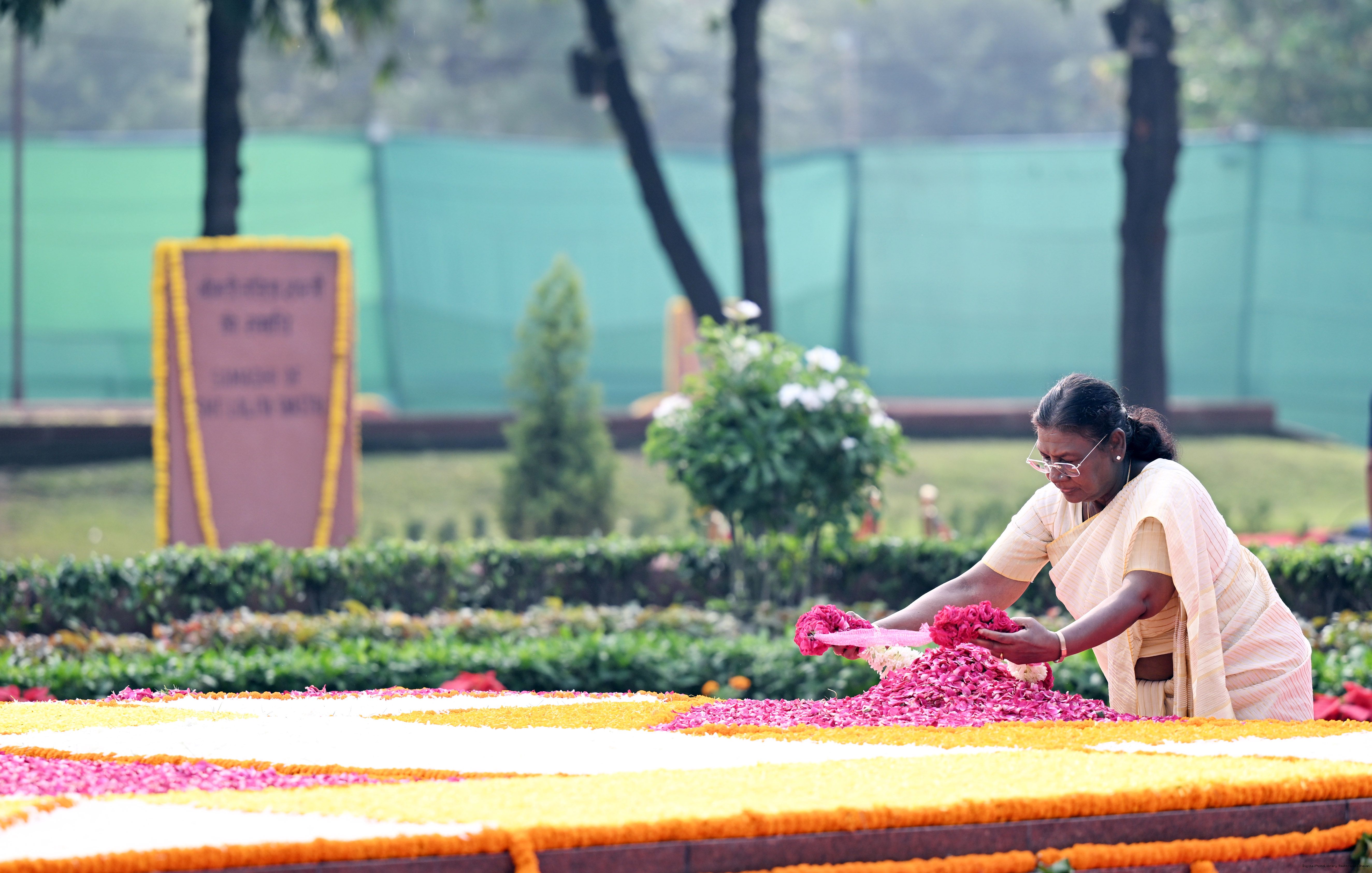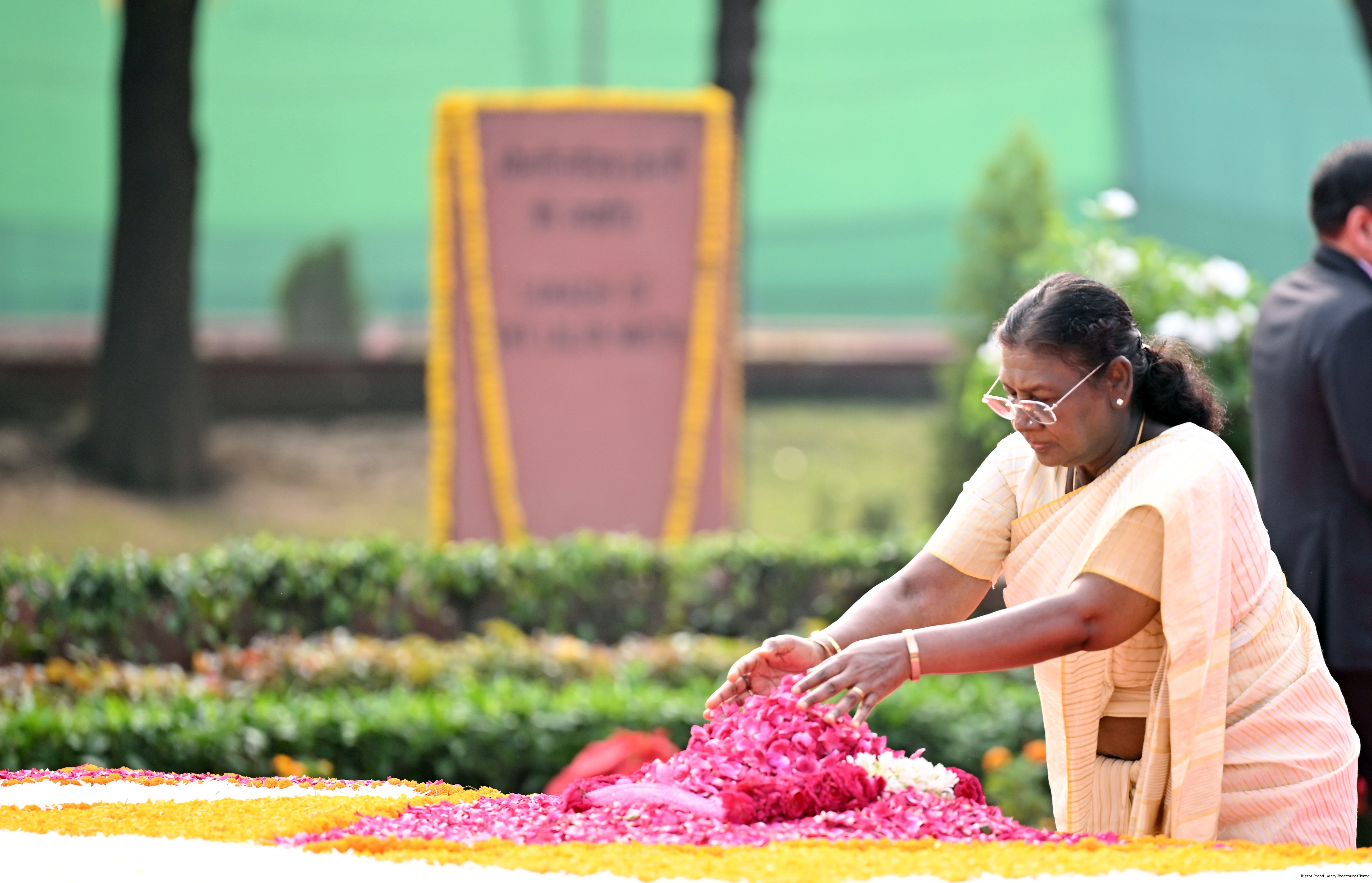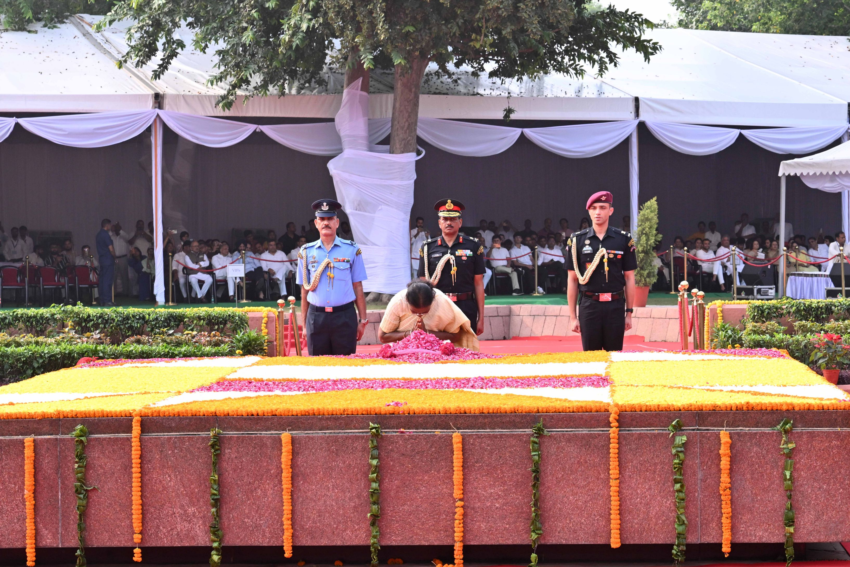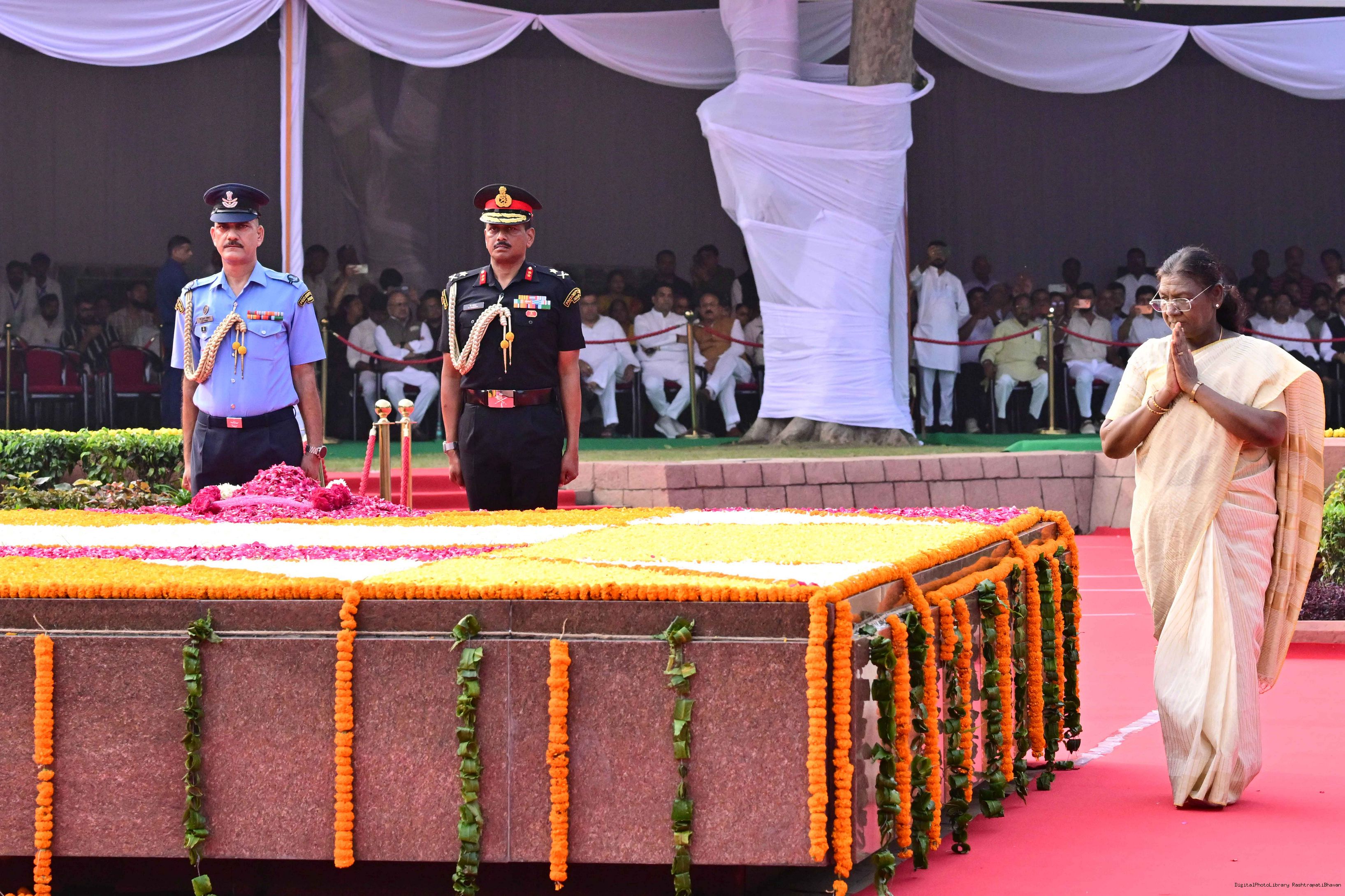 | Caption: | The President of India, Smt. Droupadi Murmu paid tributes to Shri Lal Bahadur Shastri, former Prime Minister of India on his birth anniversary at Vijay Ghat, New Delhi on October 2, 2025. |