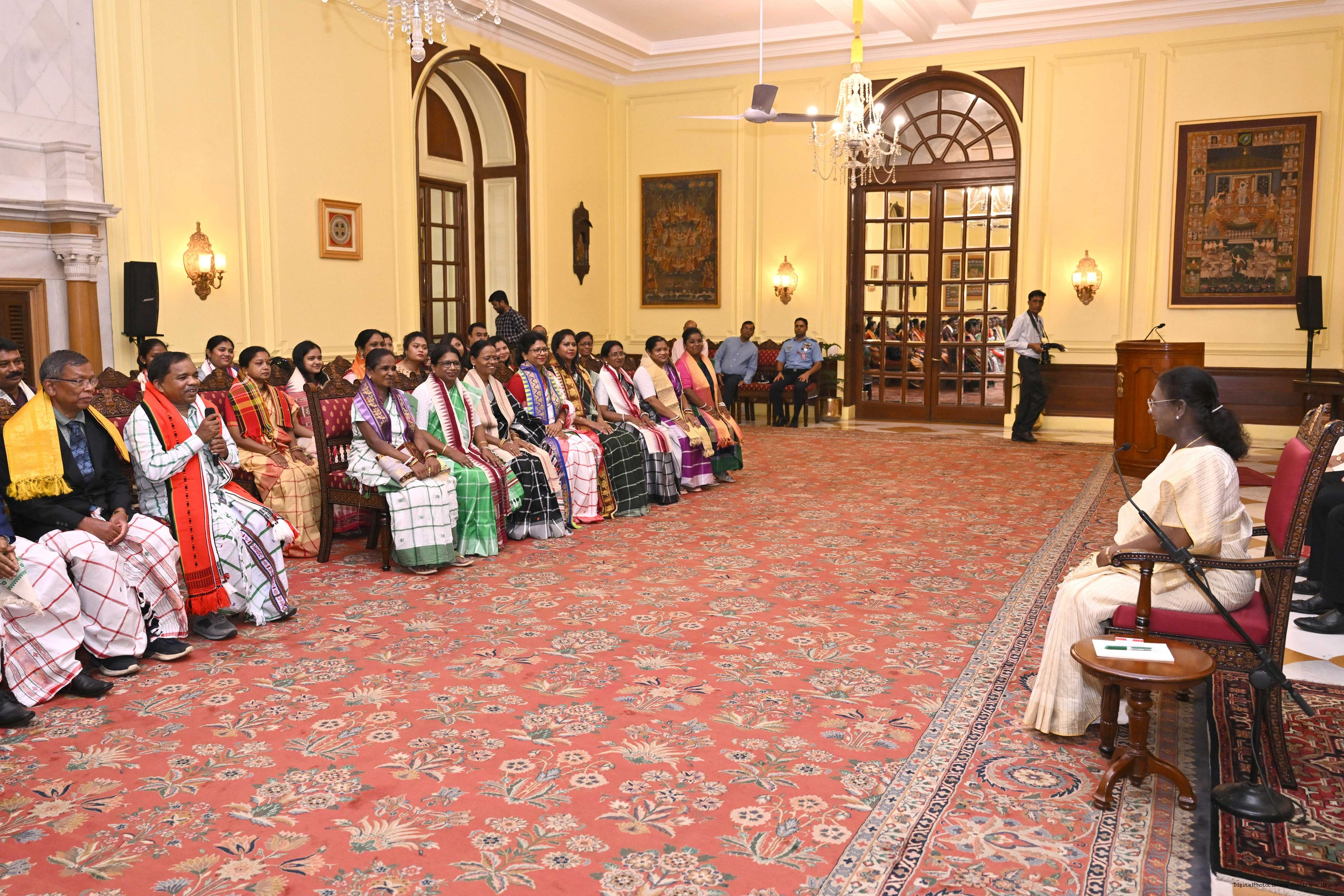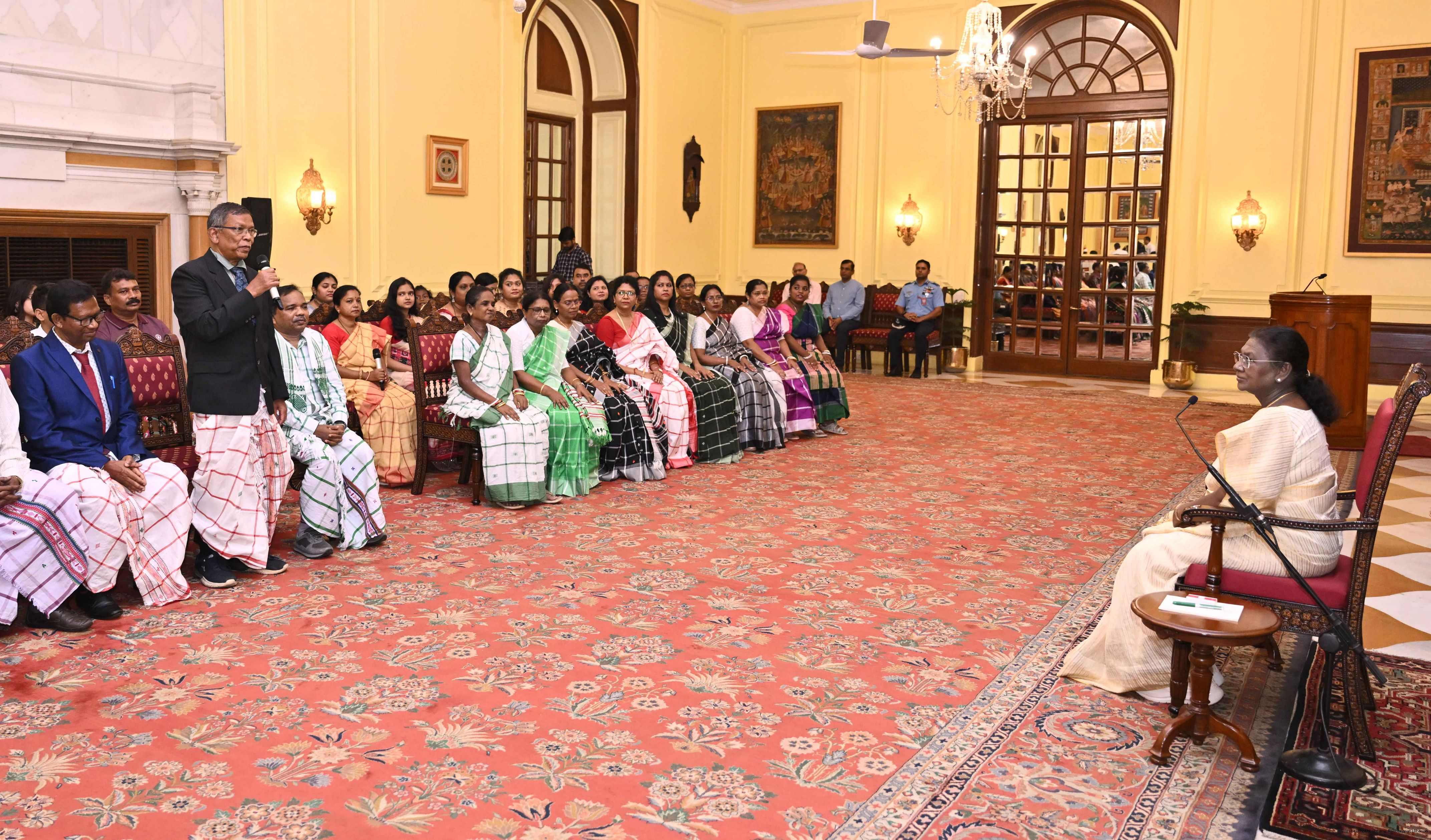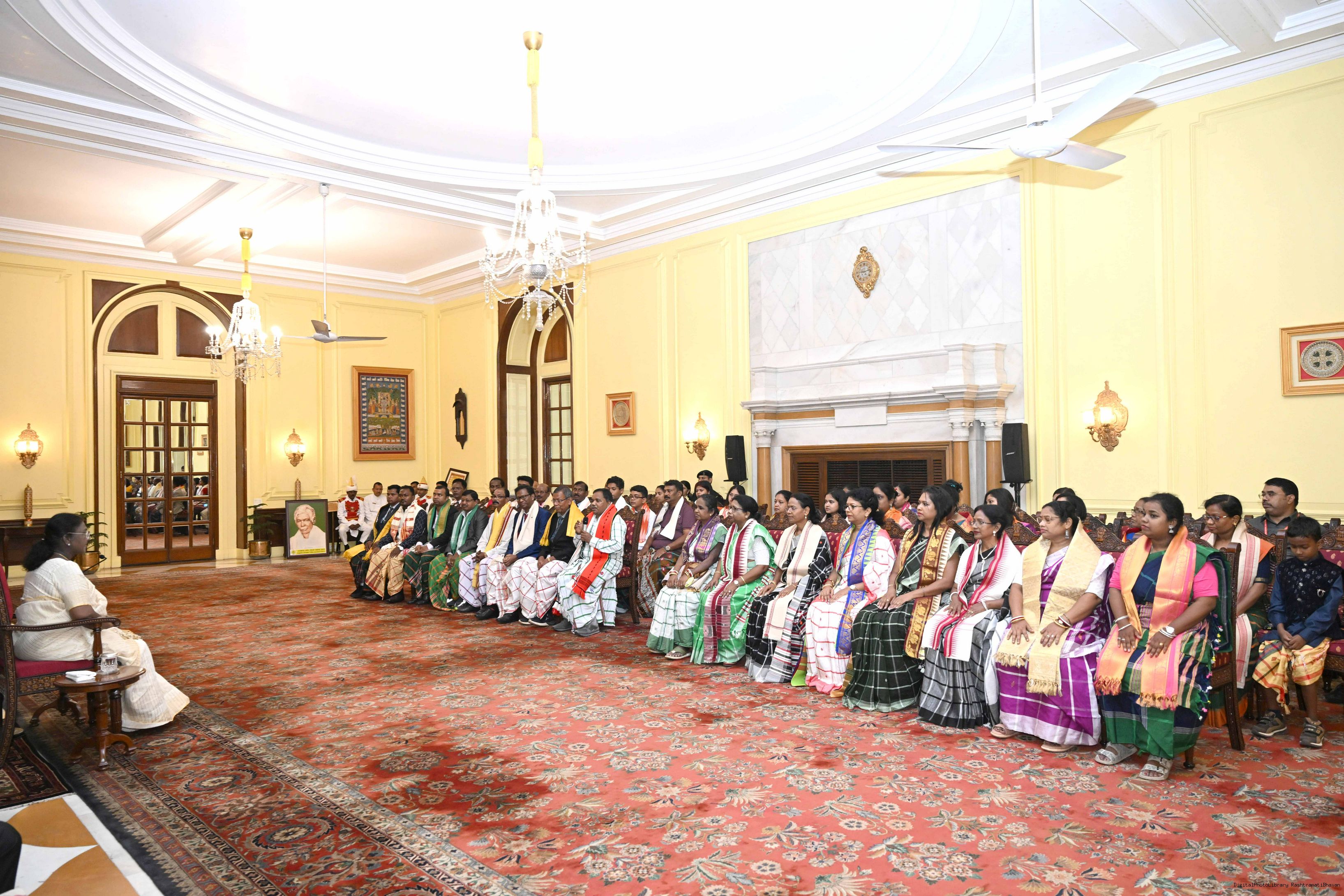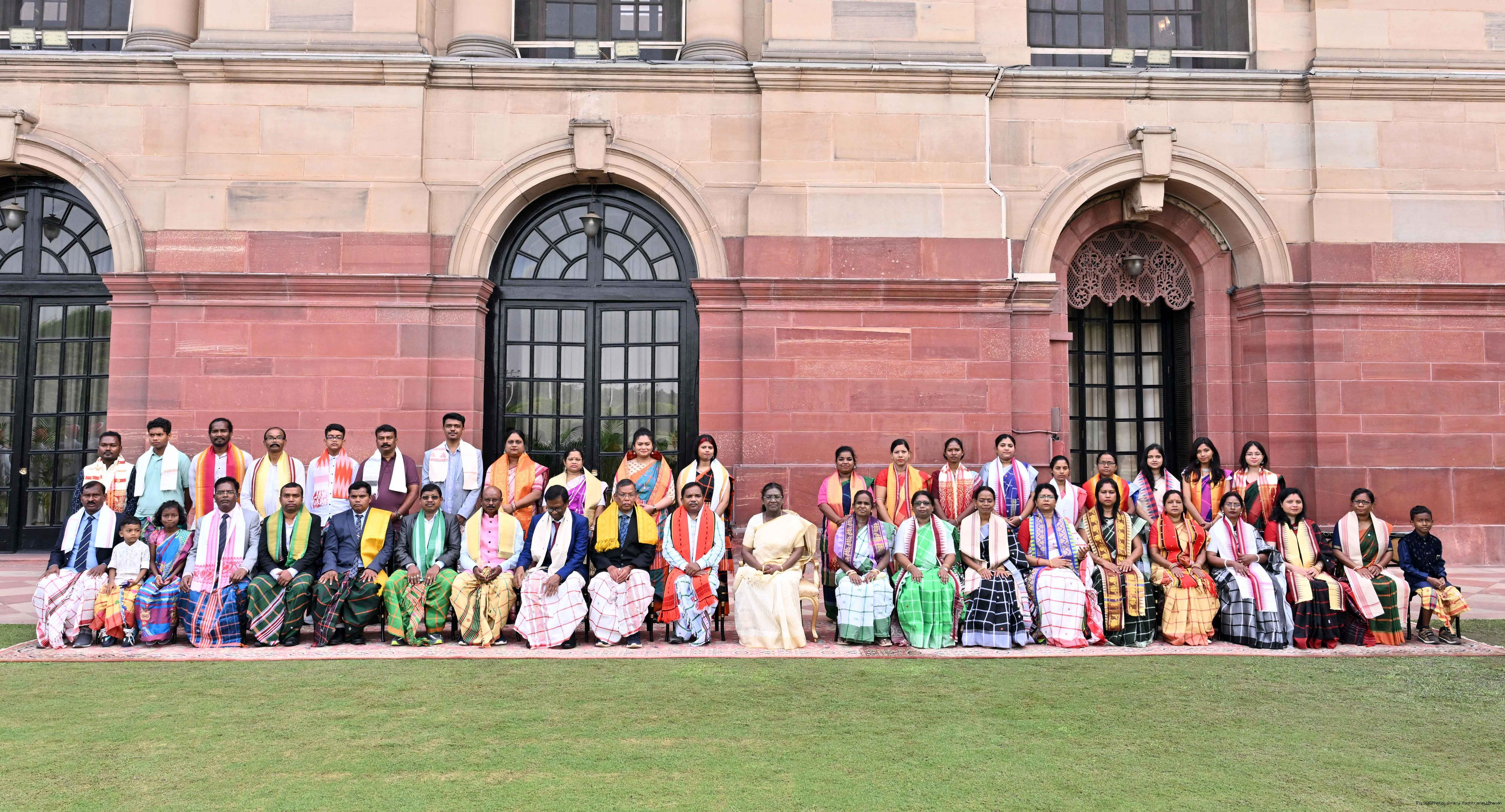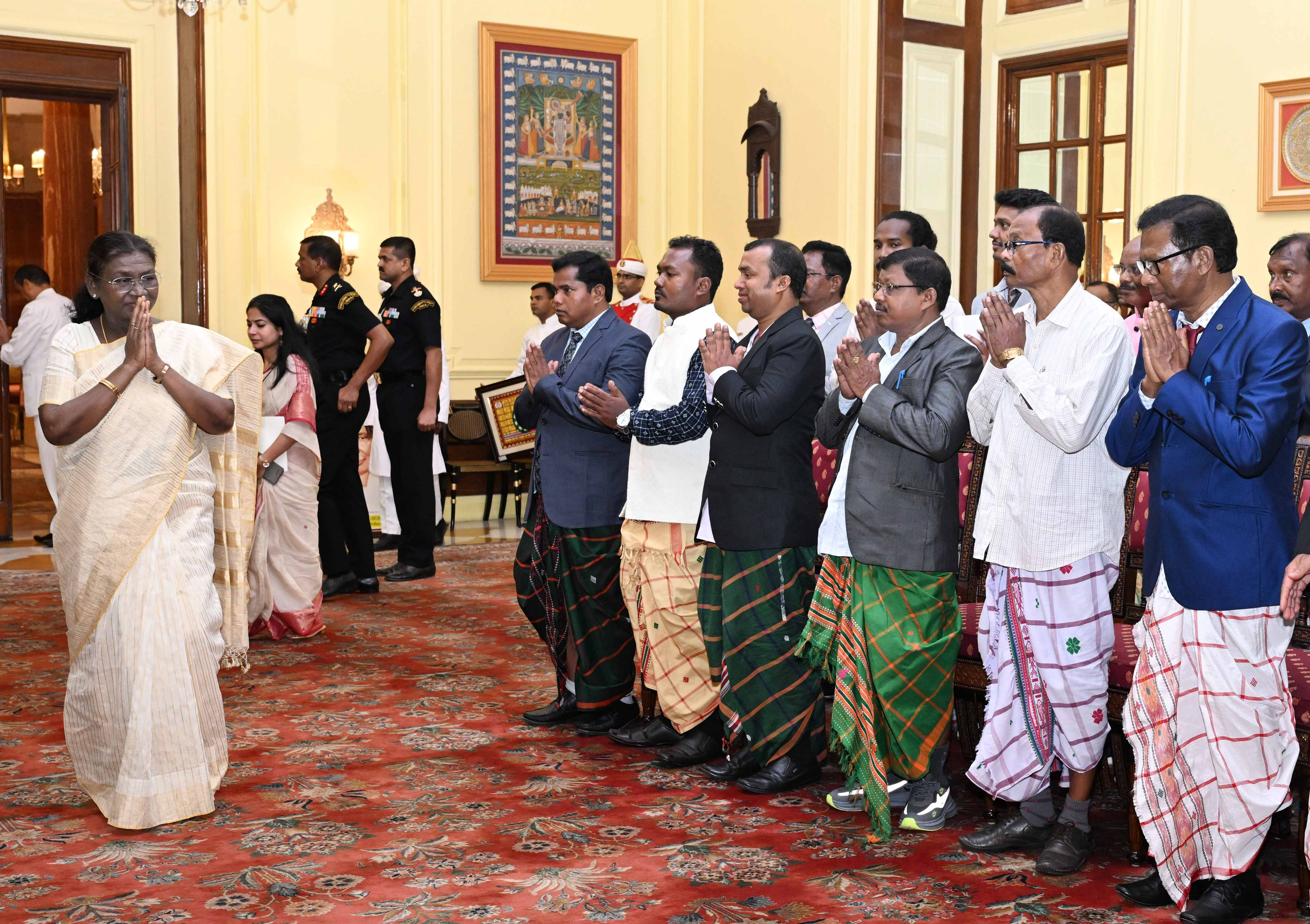 | Caption: | Smt Malat Murmu PublisherEditor FAGUN Bhubaneswar along with 44 others meeting with the President of India, Smt. Droupadi Murmu at Rashtrapati Bhavan on October 2, 2025. |