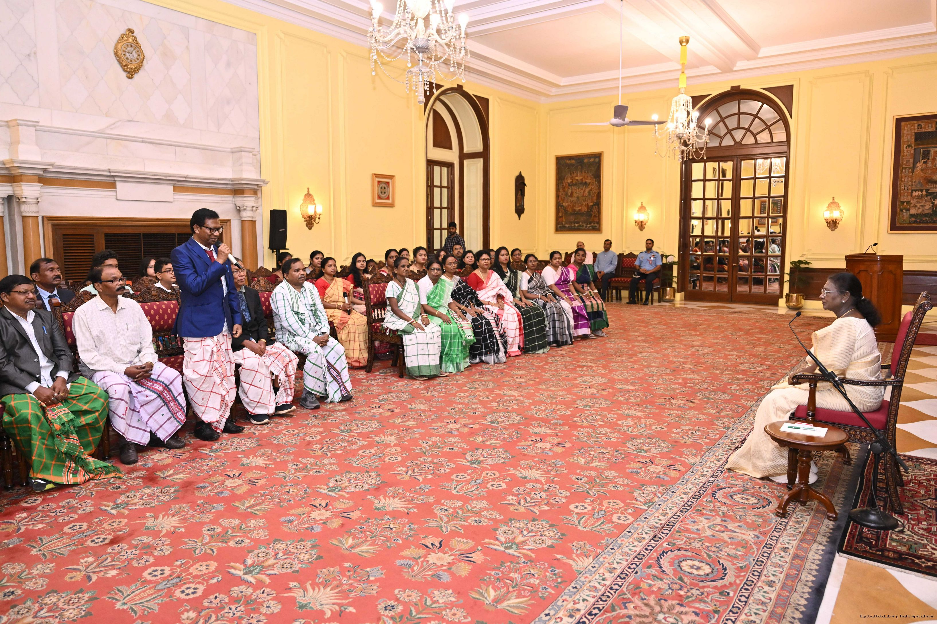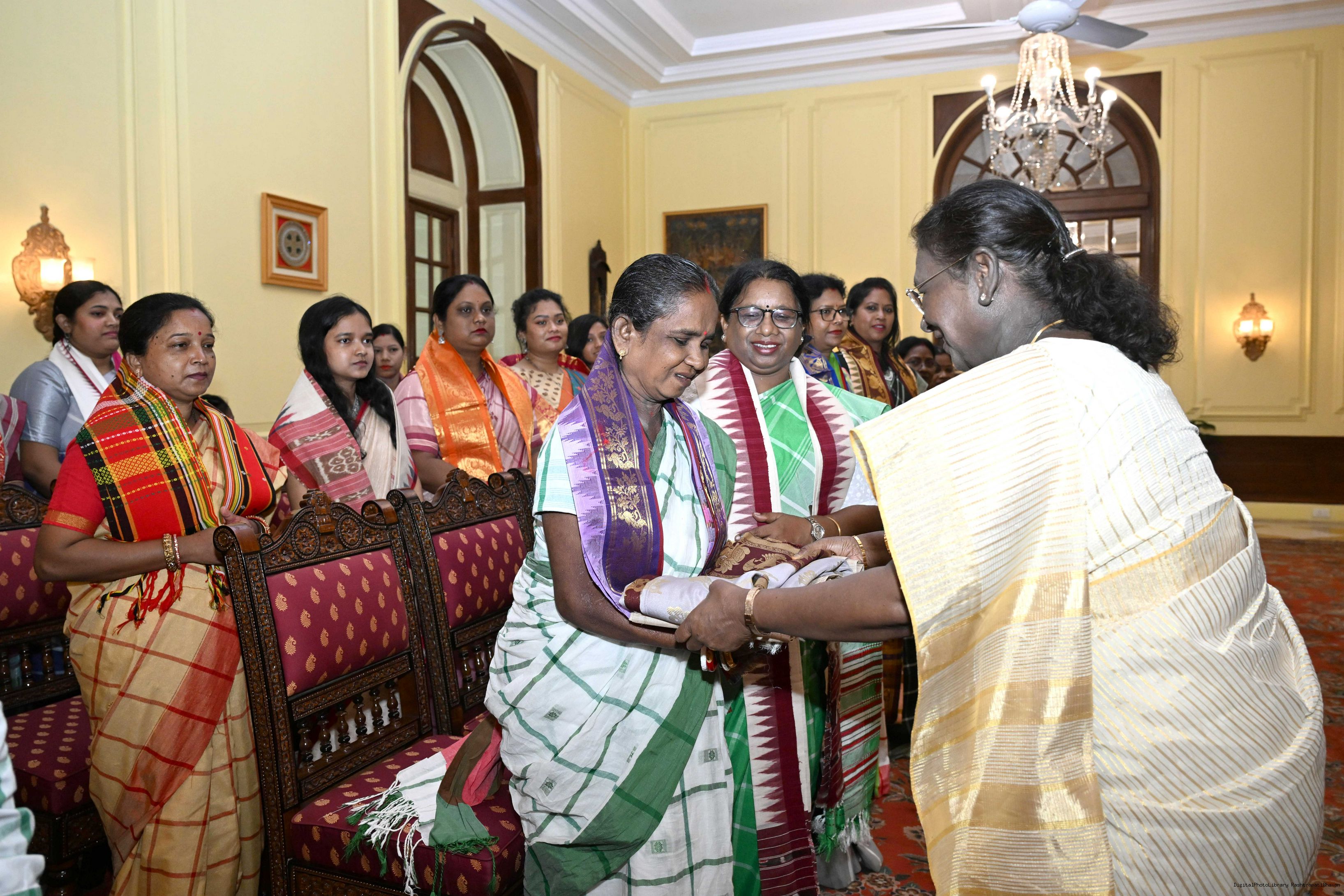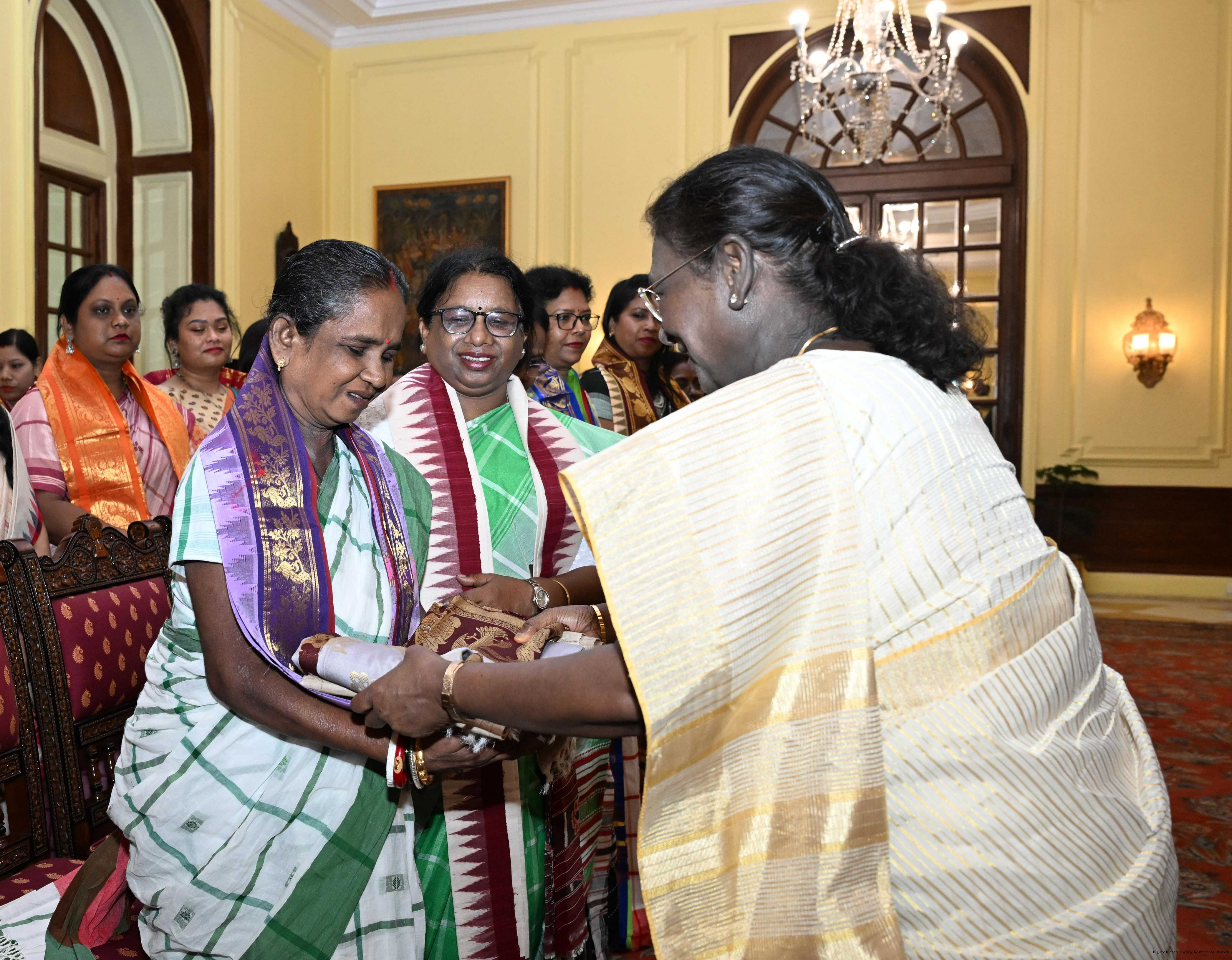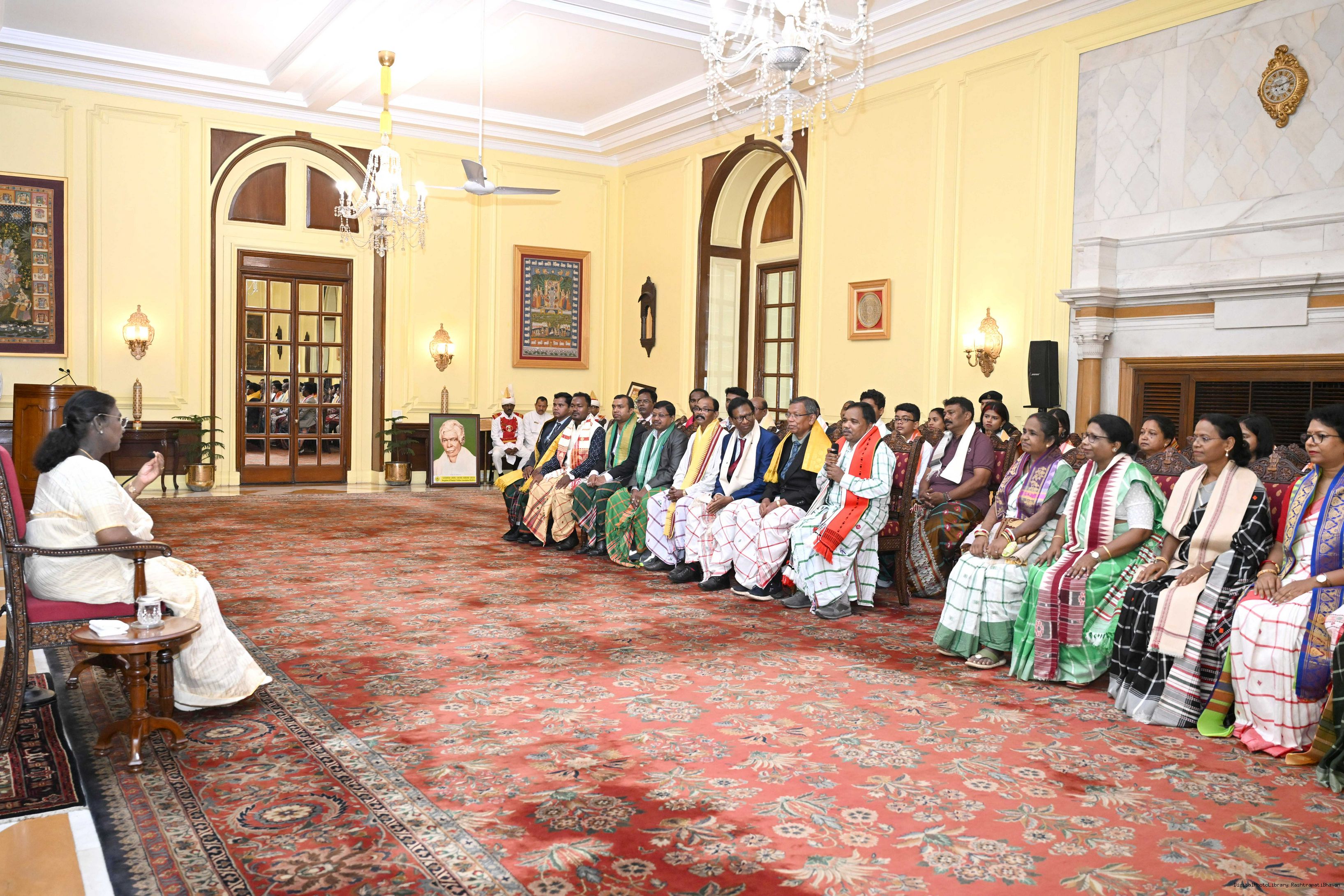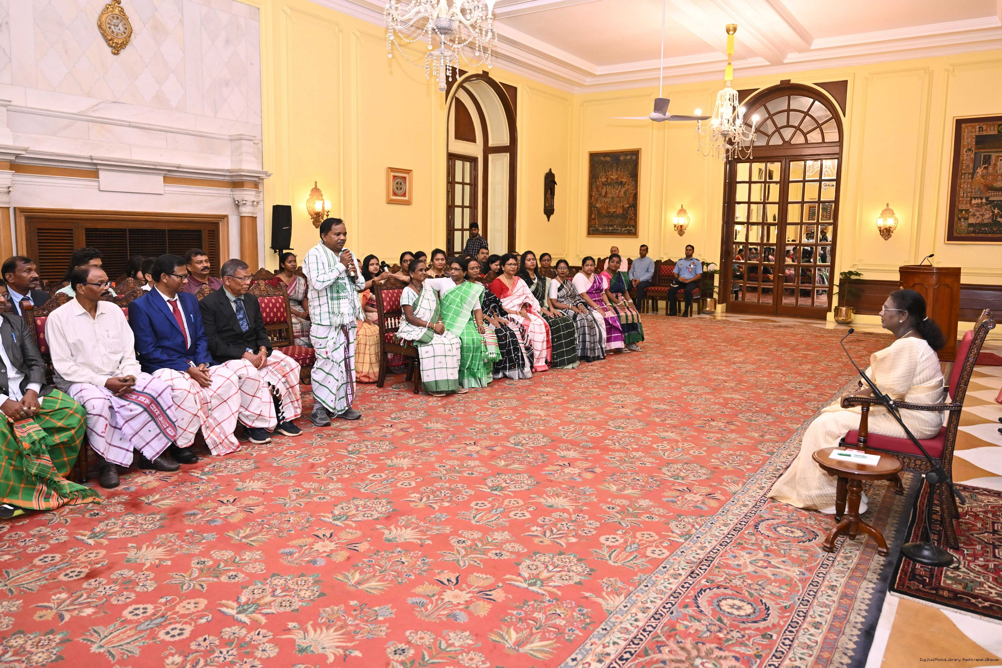 | Caption: | Smt Malat Murmu PublisherEditor FAGUN Bhubaneswar along with 44 others meeting with the President of India, Smt. Droupadi Murmu at Rashtrapati Bhavan on October 2, 2025. |