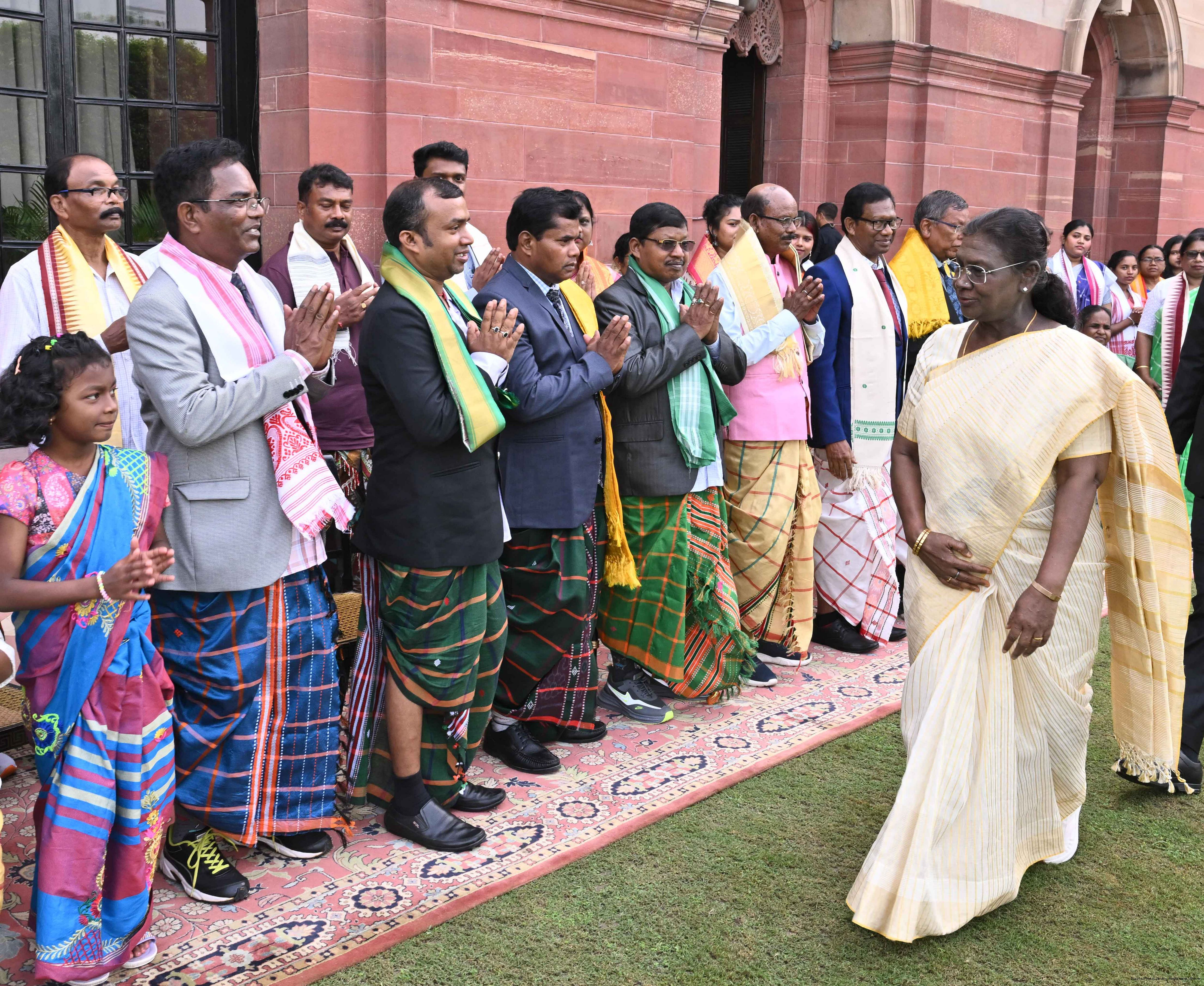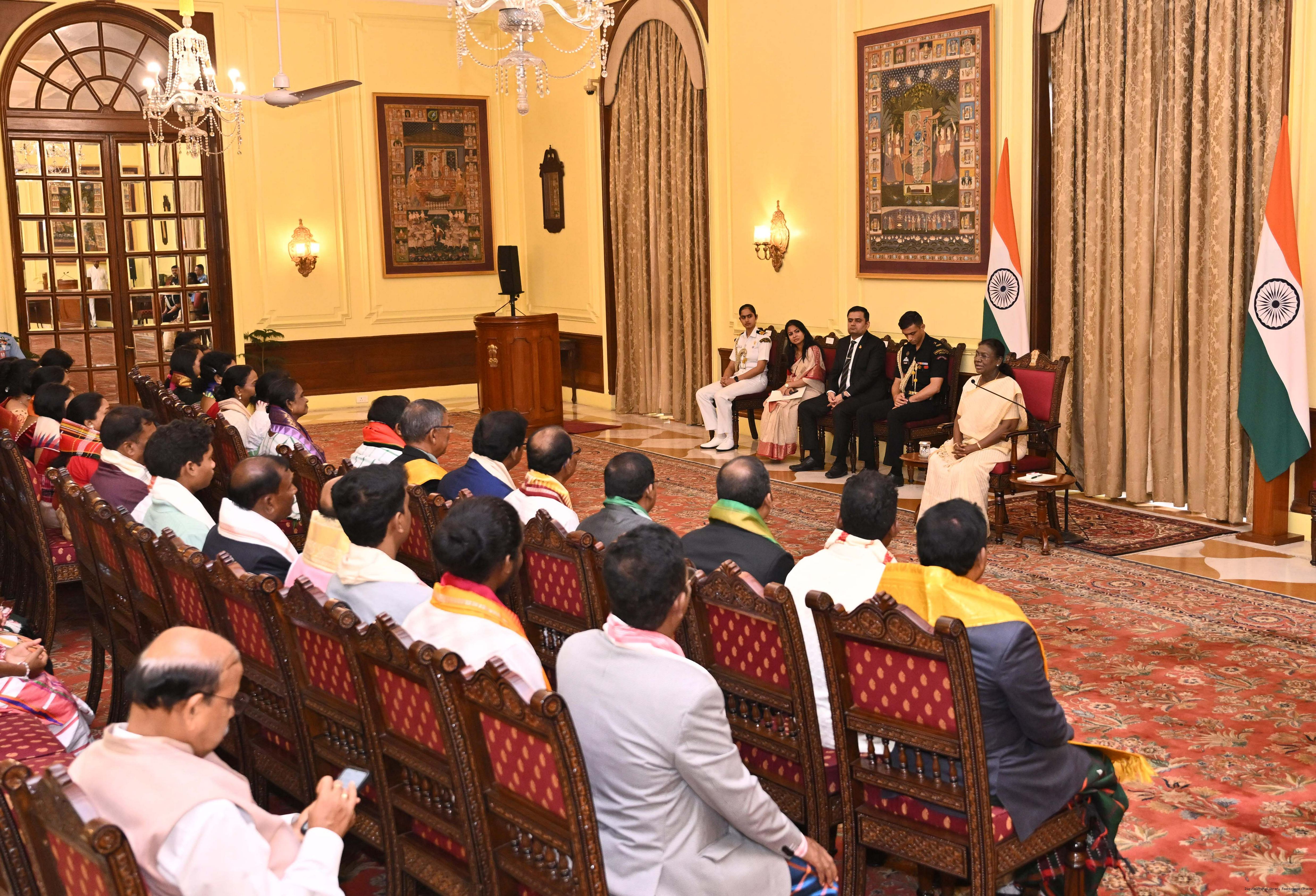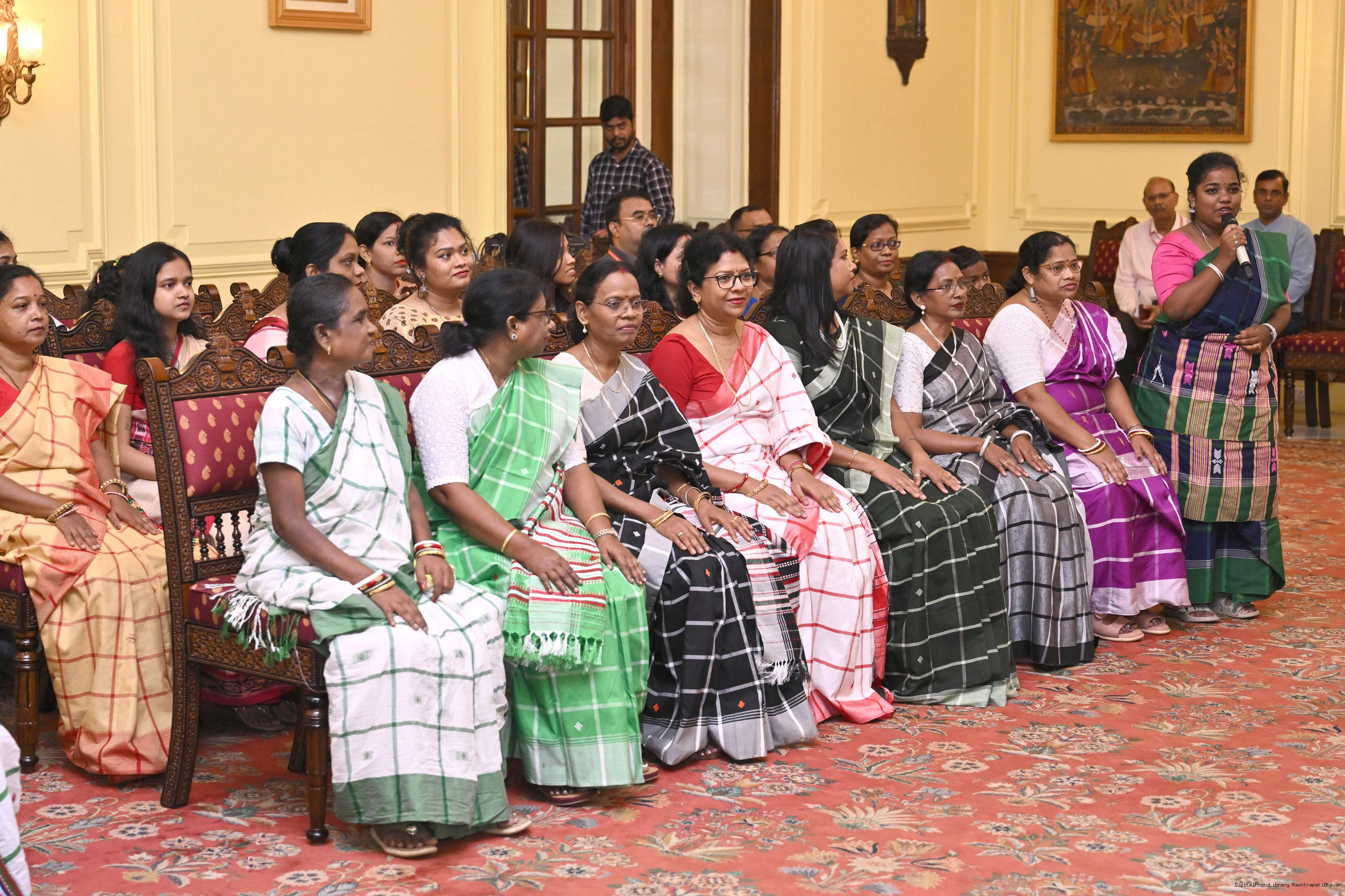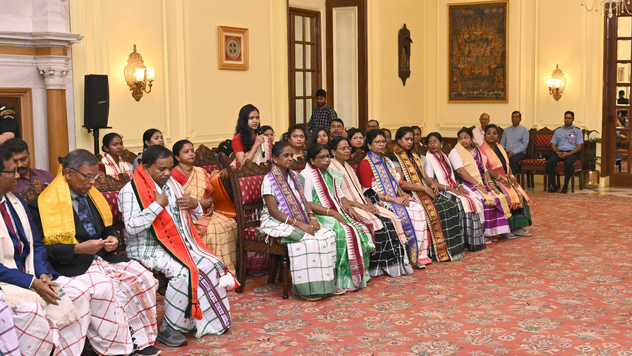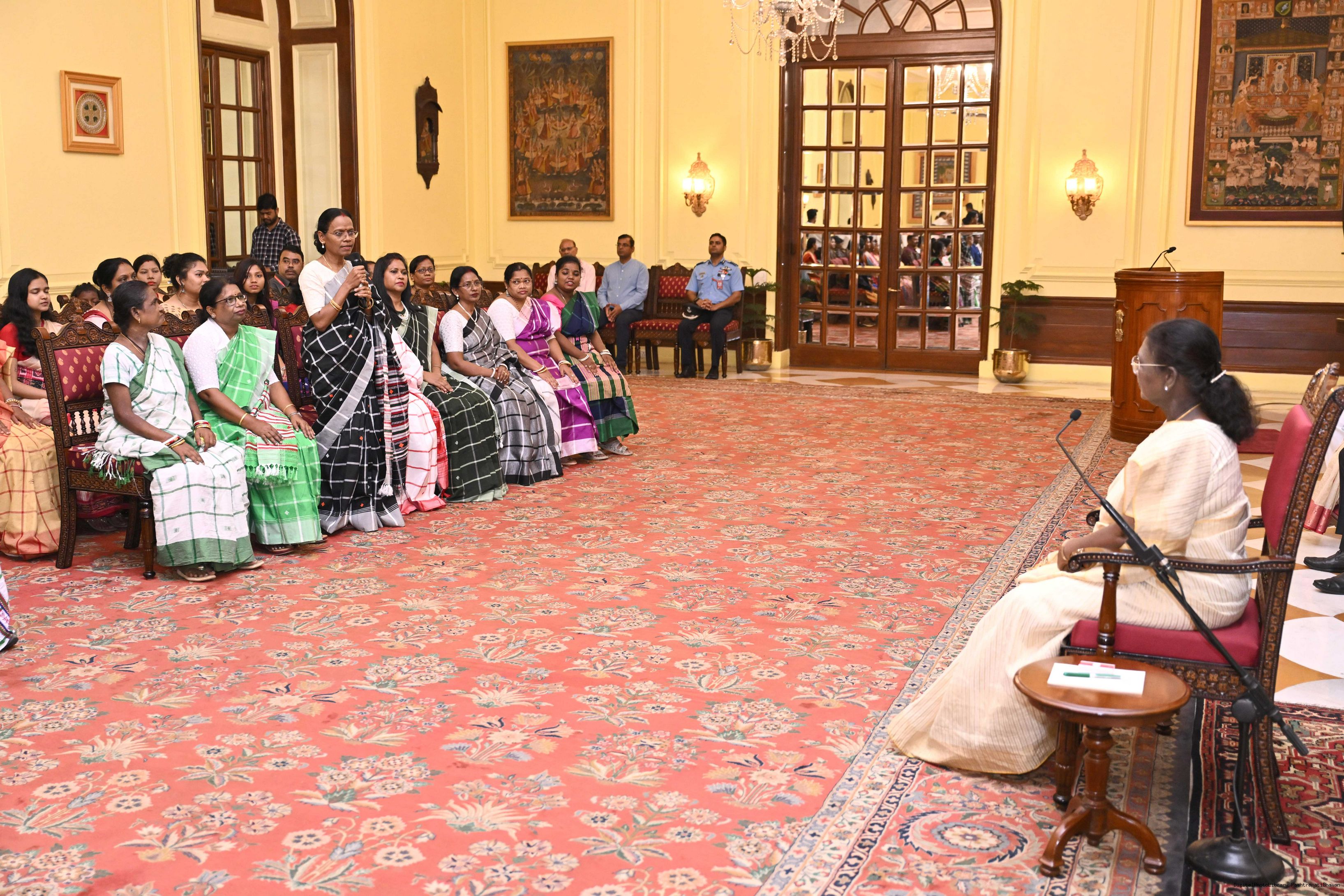 | Caption: | Smt Malat Murmu PublisherEditor FAGUN Bhubaneswar along with 44 others meeting with the President of India, Smt. Droupadi Murmu at Rashtrapati Bhavan on October 2, 2025. |