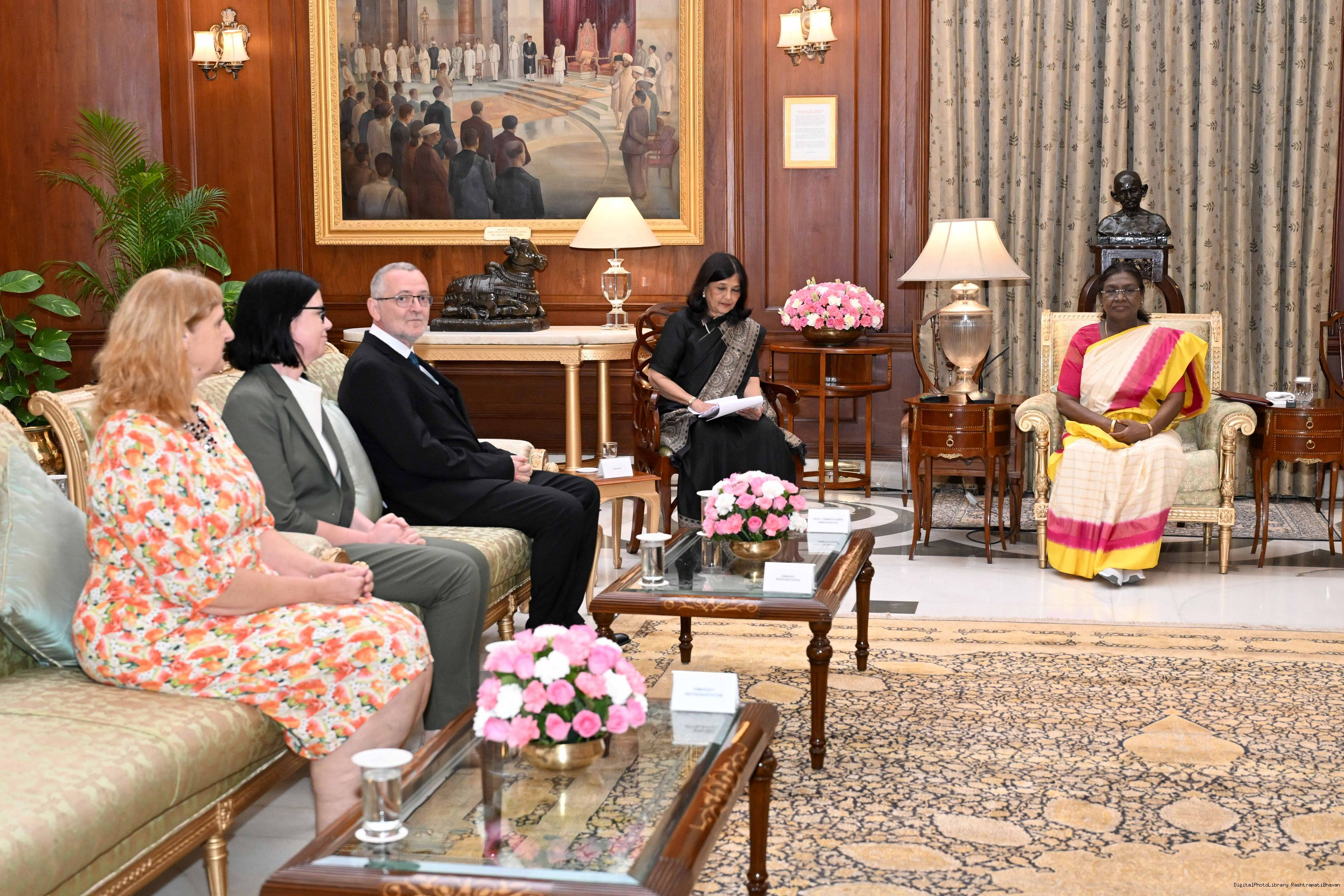 | Caption: | The Ambassador-designate of the Republic of Slovenia, H.E. Mr. Tomaz Mencin presenting his credentials to the President of India, Smt Droupadi Murmu at Ashok Hall of Rashtrapati Bhavan in New Delhi on on October 3, 2025. |