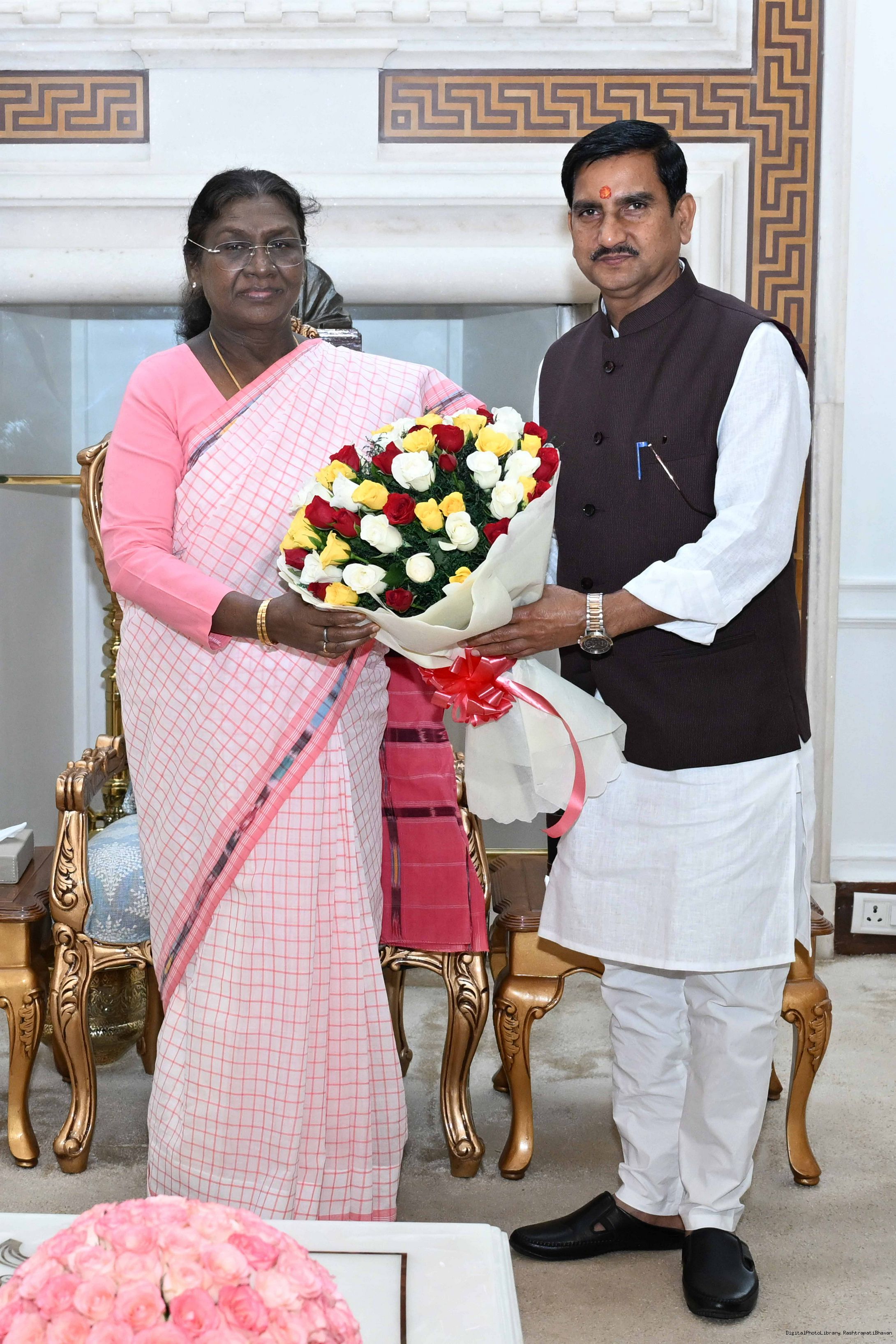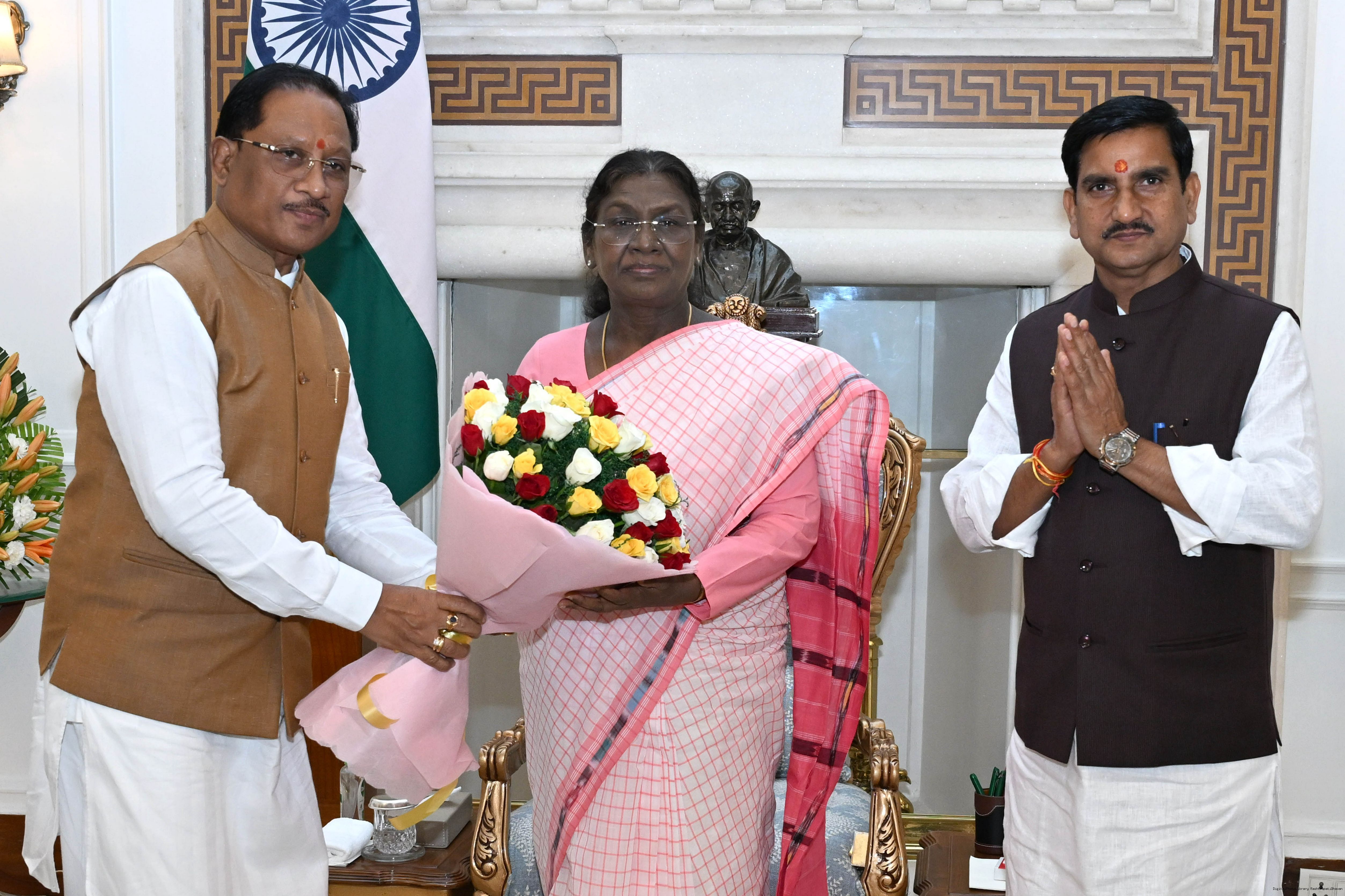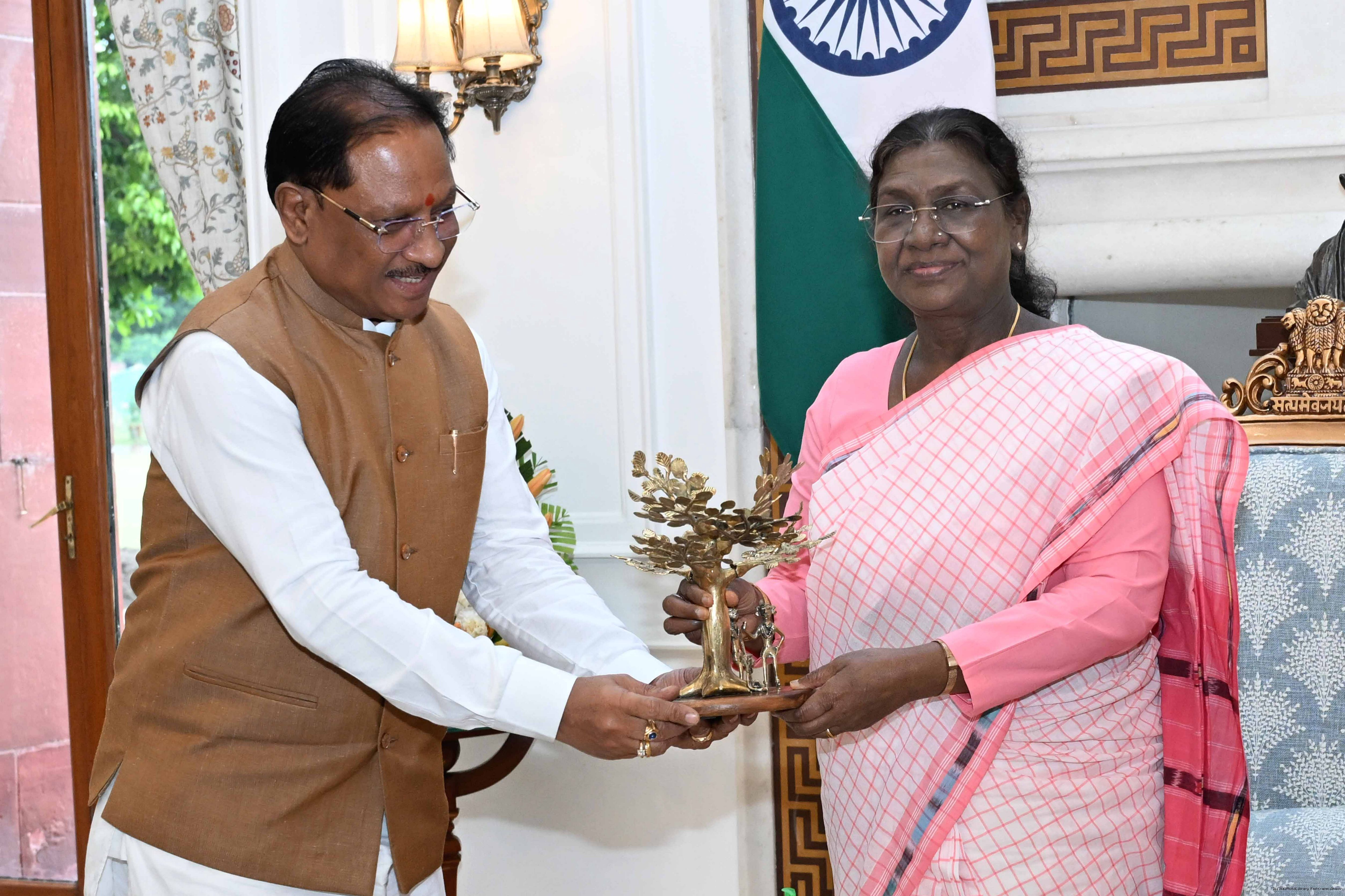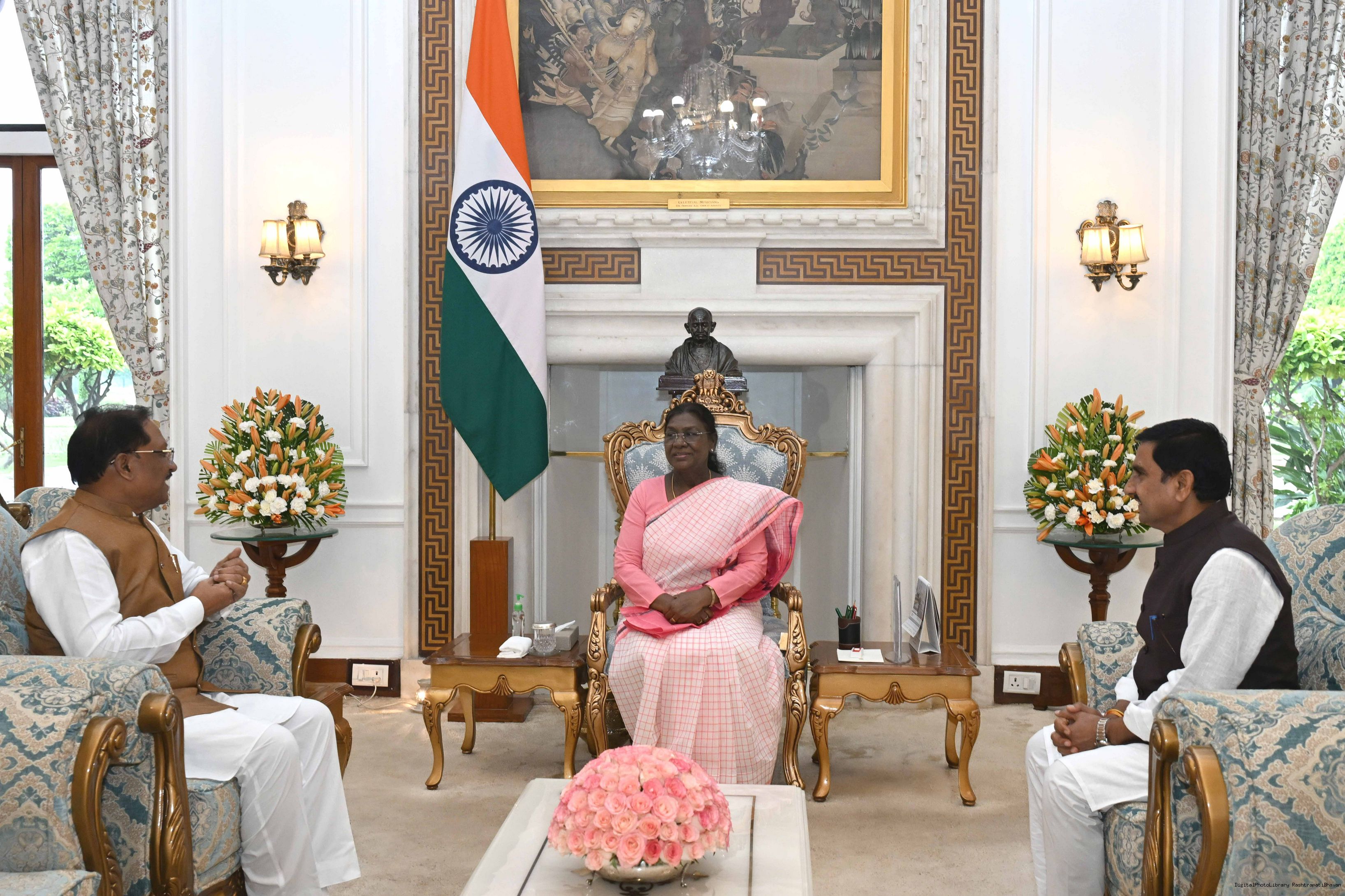 | Caption: | The Chief Minister of Chhattisgarh, Shri Vishnu Deo Sai, along with Union Minister of State for Housing and Urban Affairs, Shri Tokhan Sahu, called on the President of India, Smt. Droupadi Murmu at Rashtrapati Bhavan on October 6, 2025. |