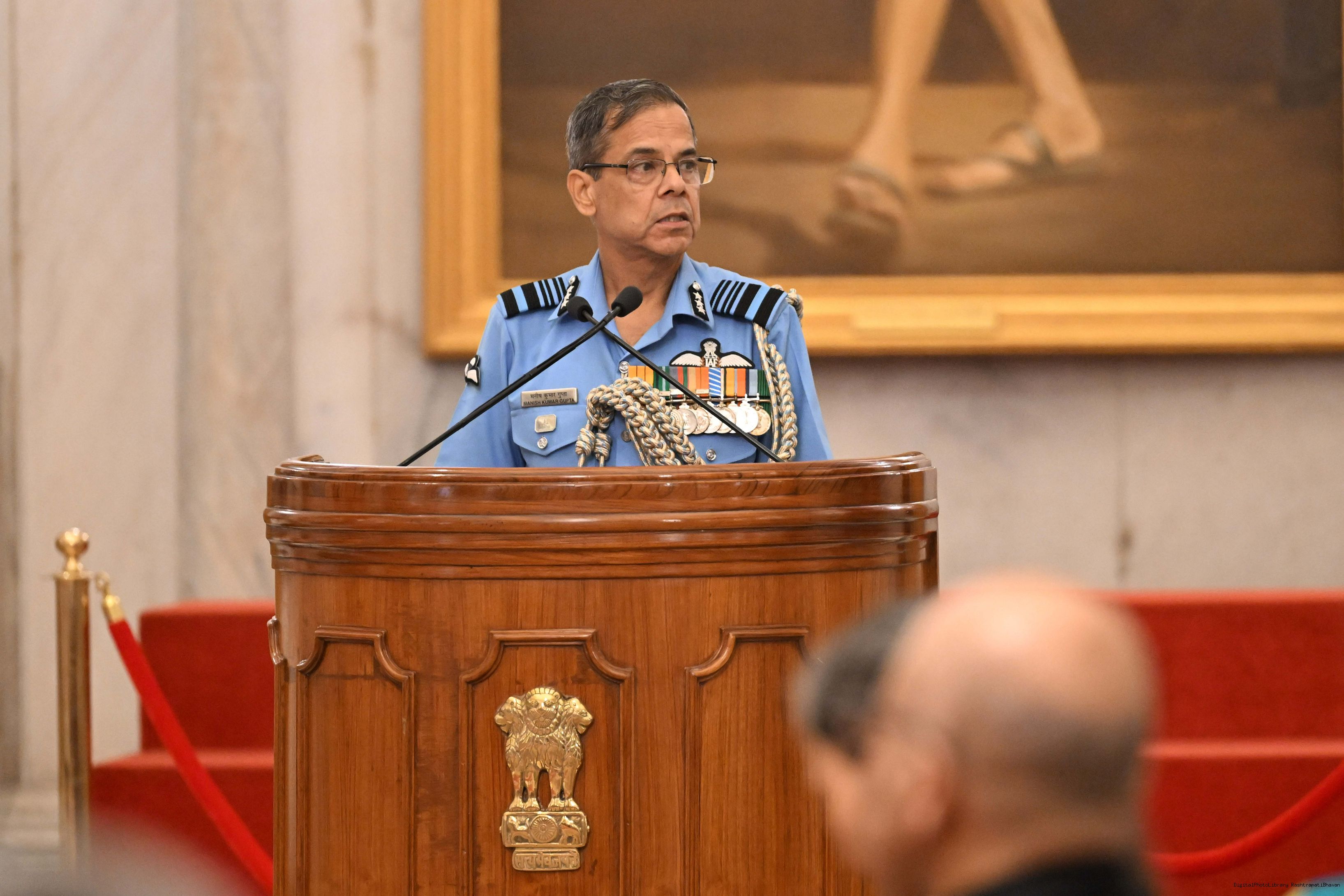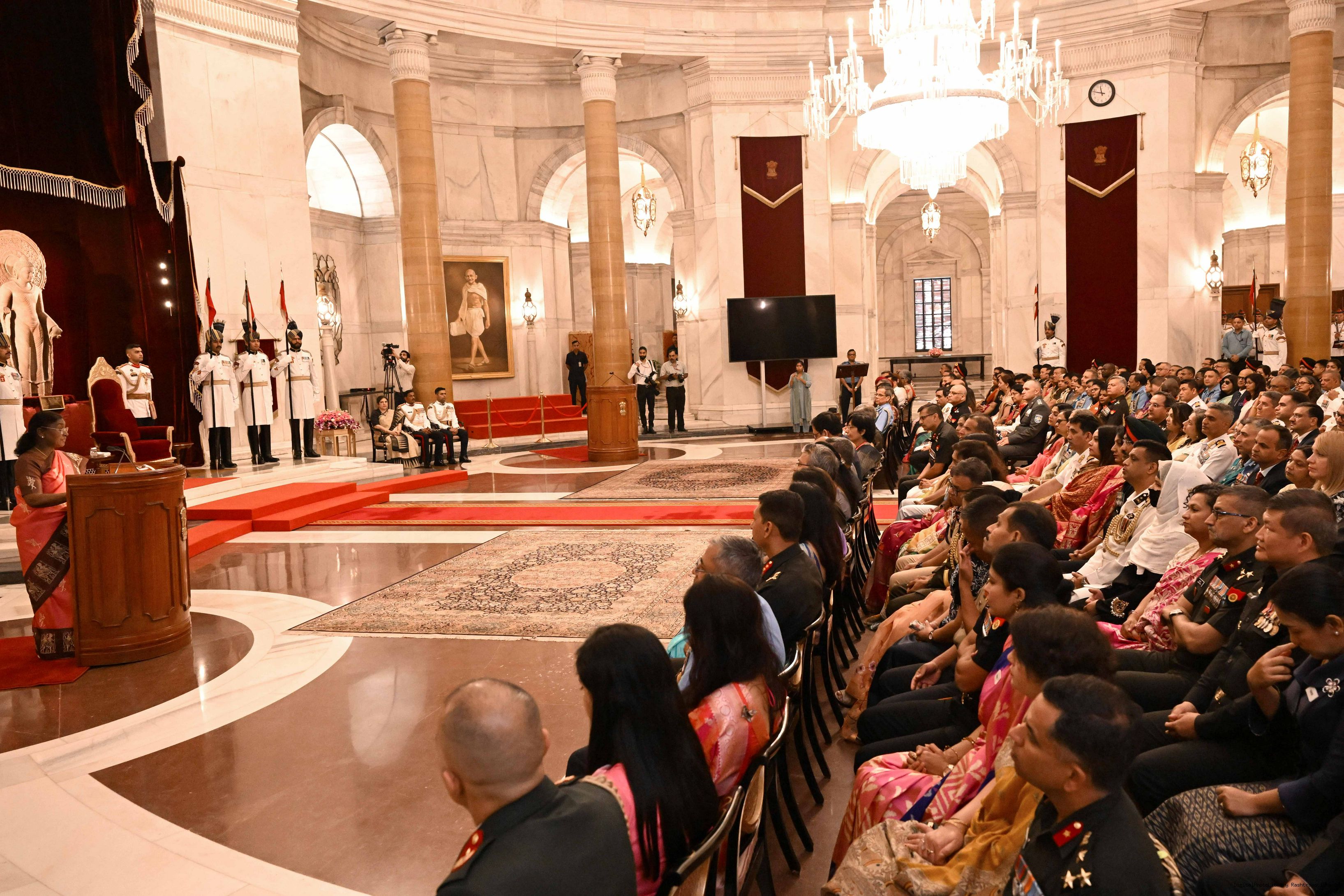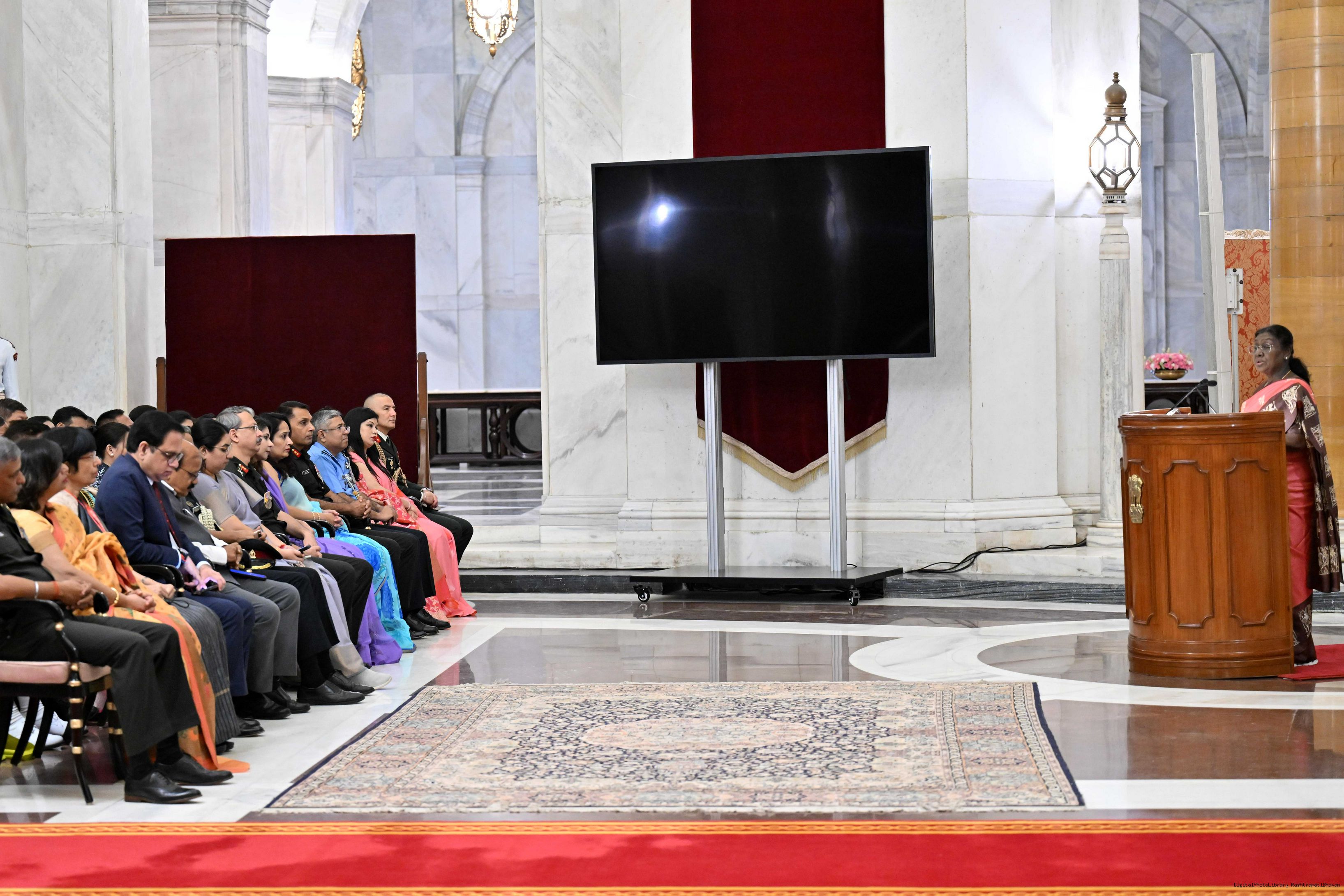 | Caption: | The faculty and course members of the 65th National Defence College Course called on the President of India, Smt Droupadi Murmu, at Rashtrapati Bhavan on October 7, 2025. |