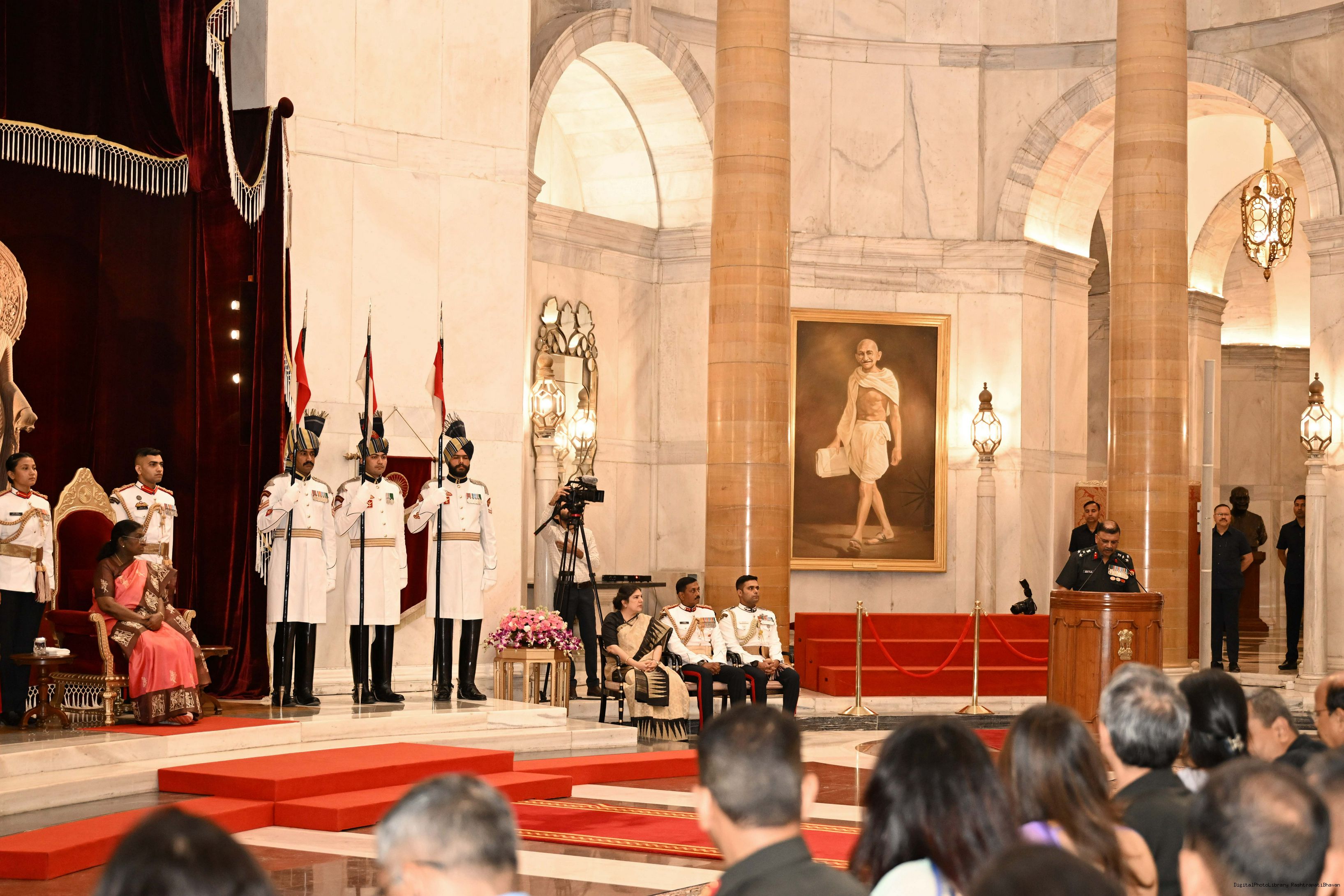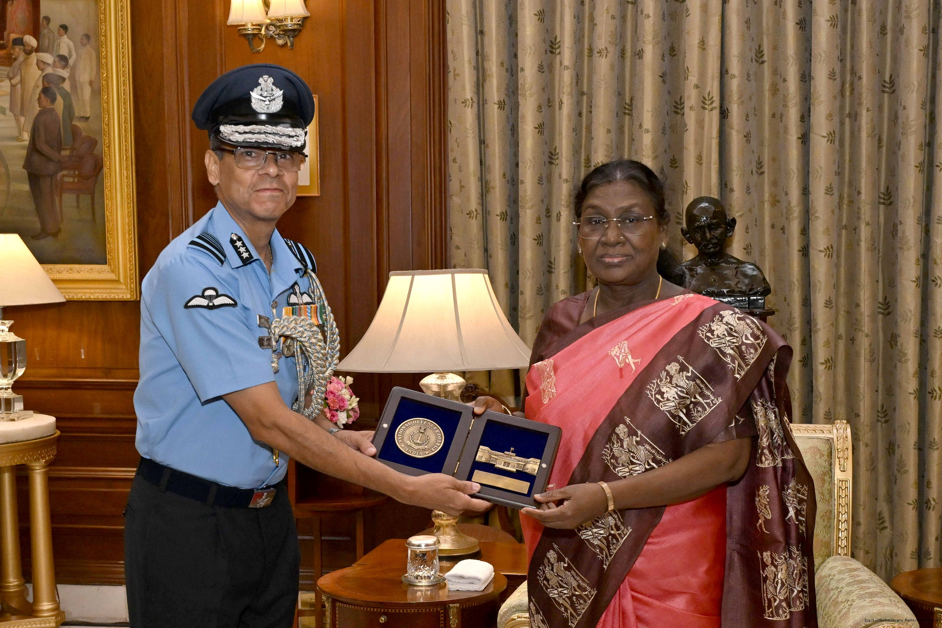 | Caption: | The faculty and course members of the 65th National Defence College Course called on the President of India, Smt Droupadi Murmu, at Rashtrapati Bhavan on October 7, 2025. |