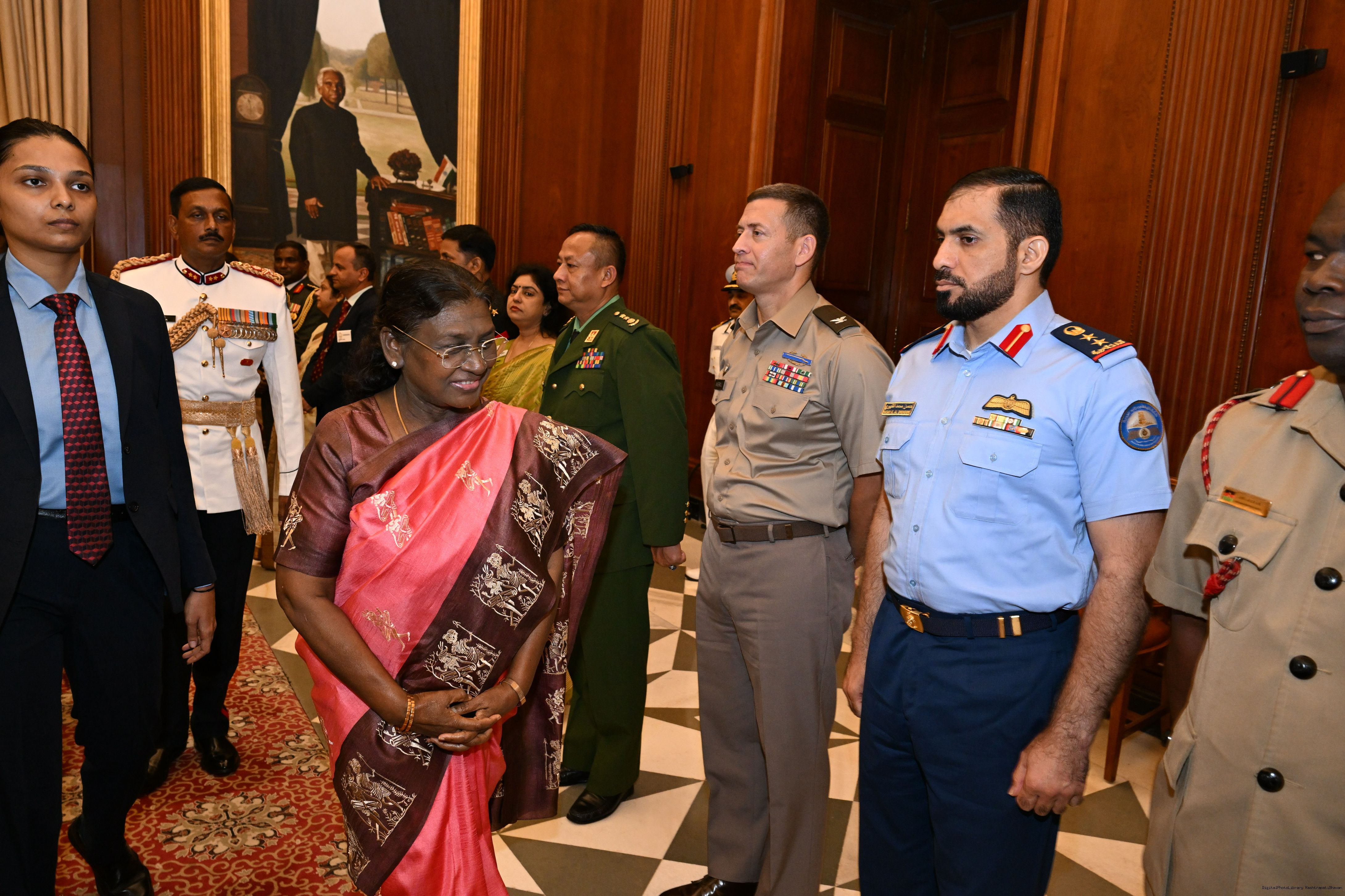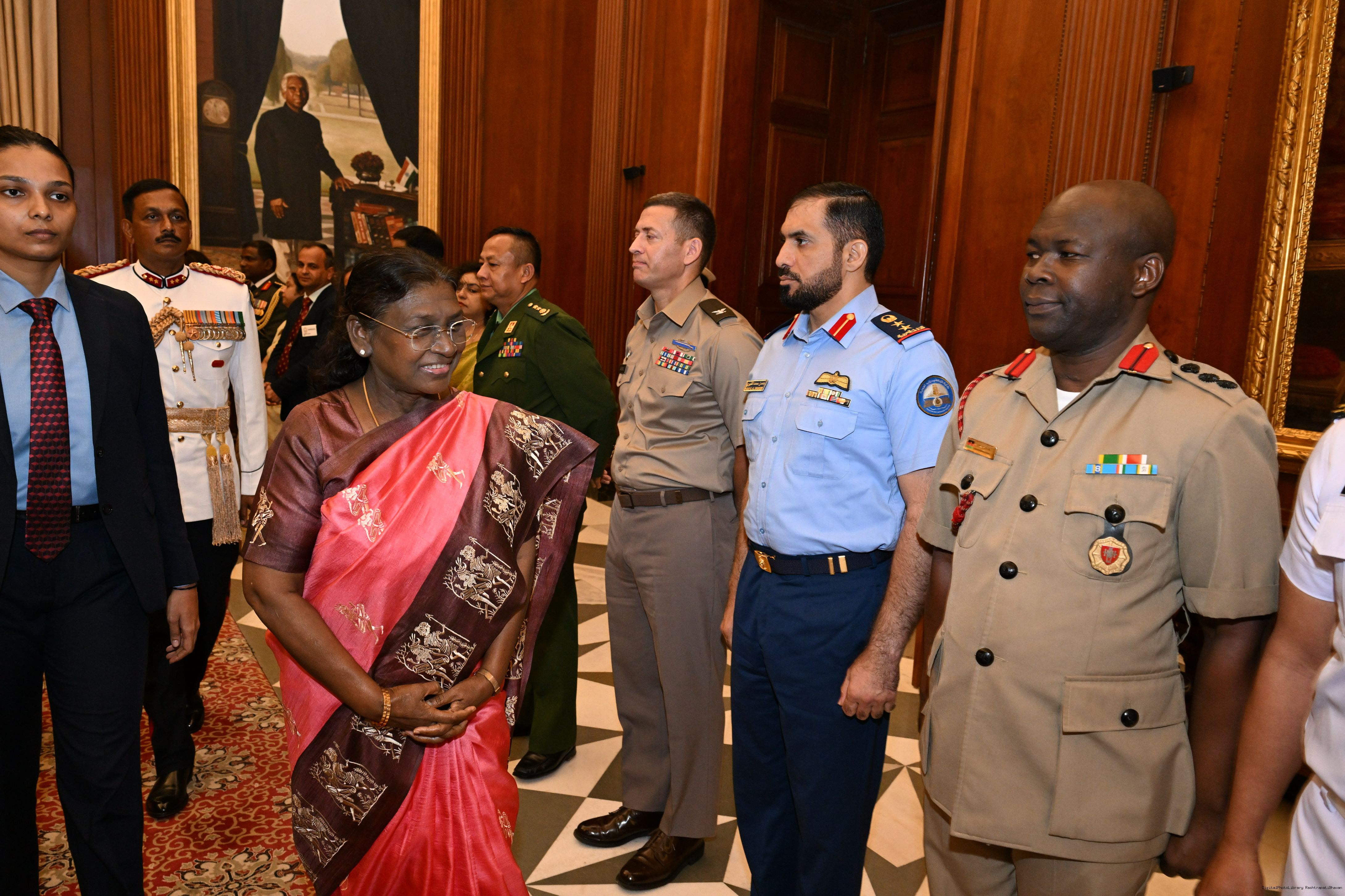 | Caption: | The faculty and course members of the 65th National Defence College Course called on the President of India, Smt Droupadi Murmu, at Rashtrapati Bhavan on October 7, 2025. |