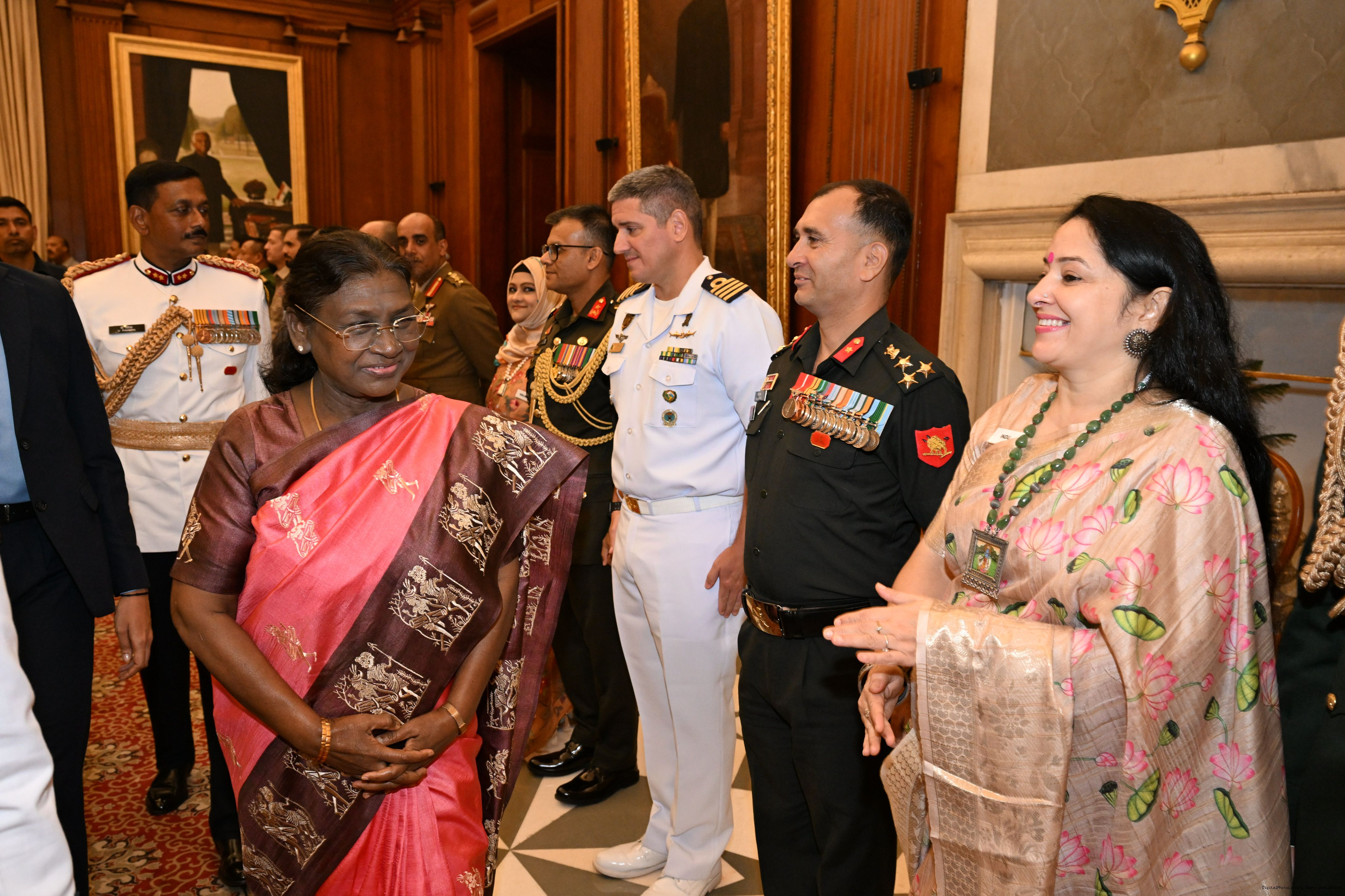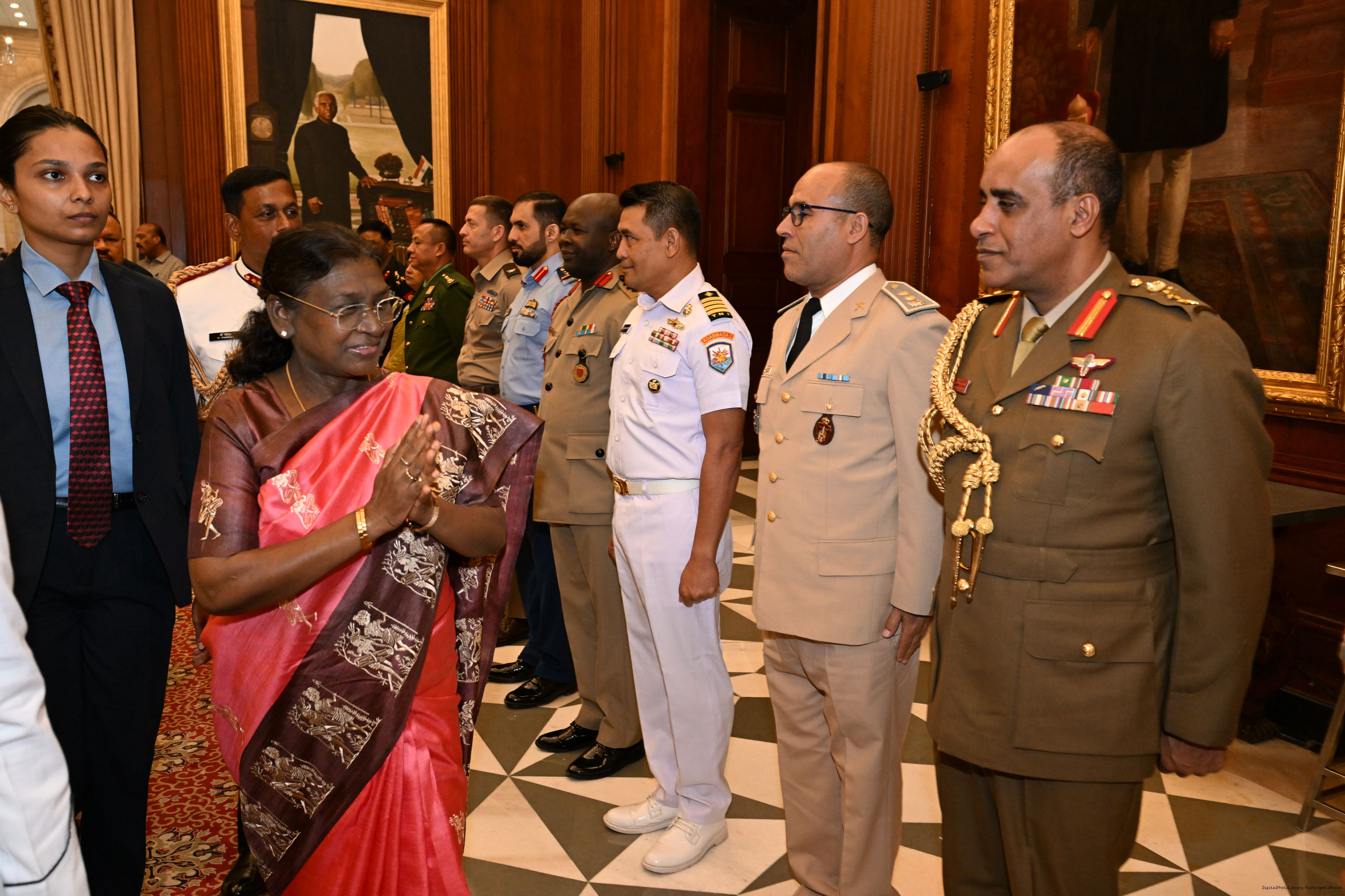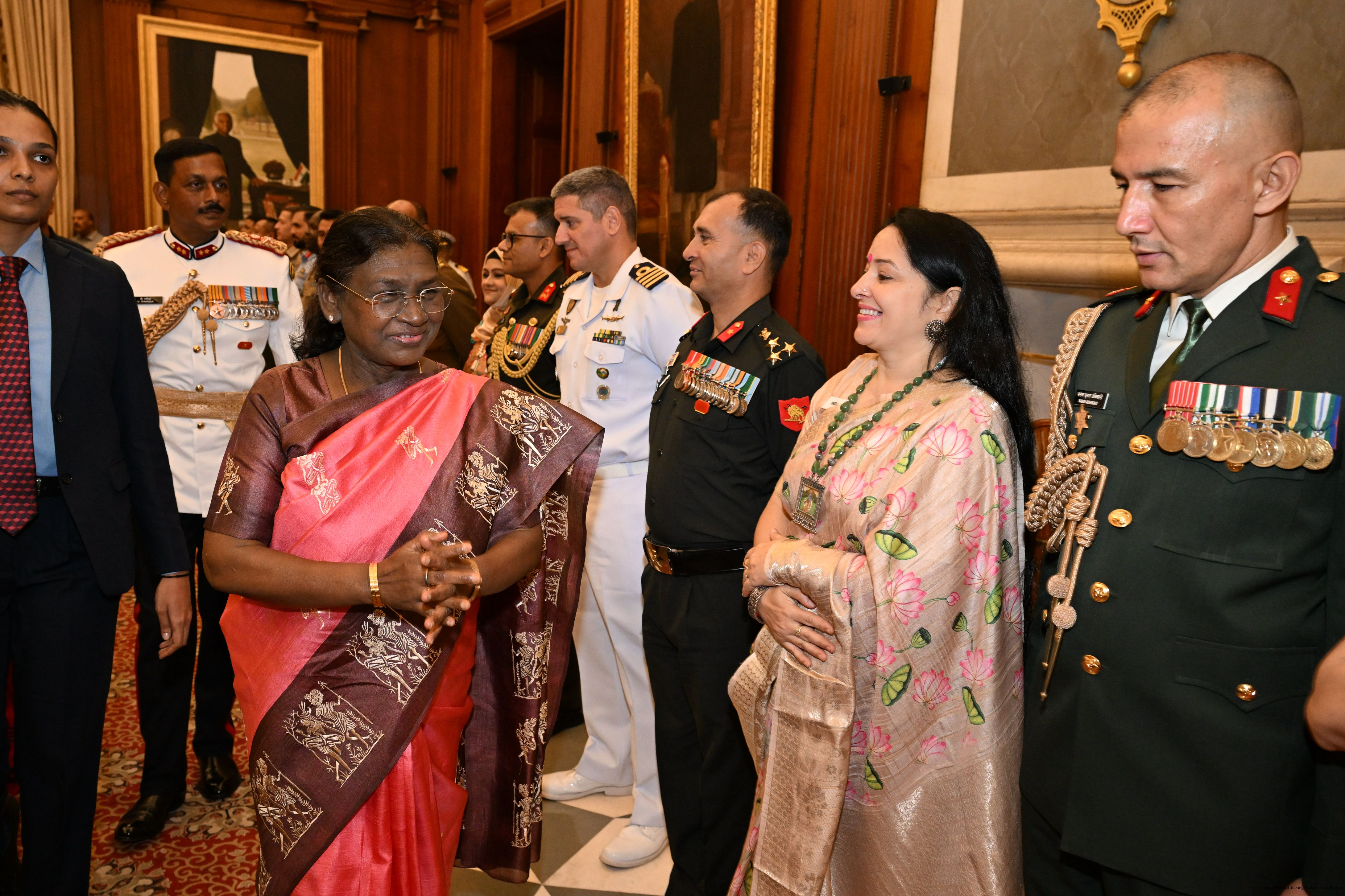 | Caption: | The faculty and course members of the 65th National Defence College Course called on the President of India, Smt Droupadi Murmu, at Rashtrapati Bhavan on October 7, 2025. |