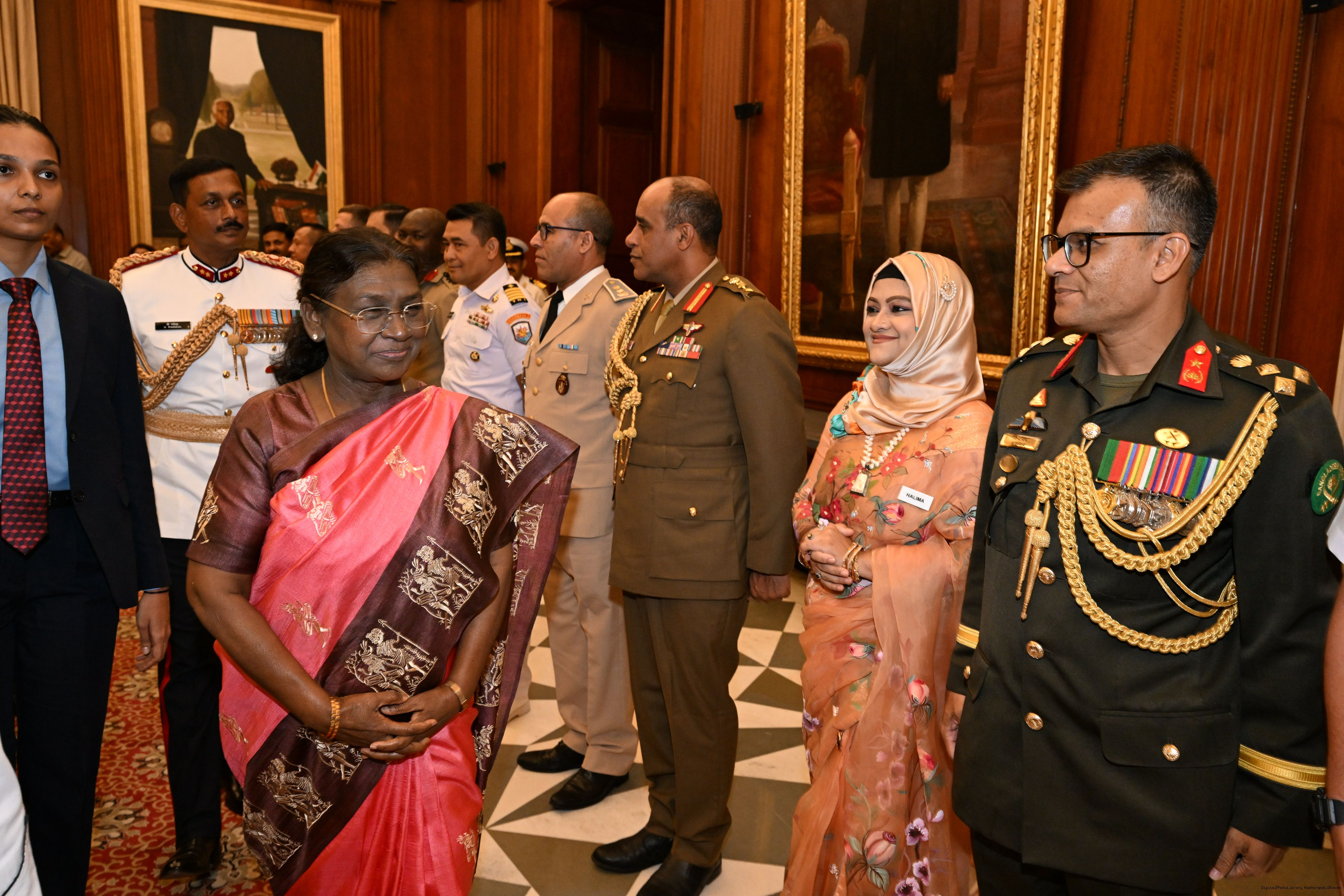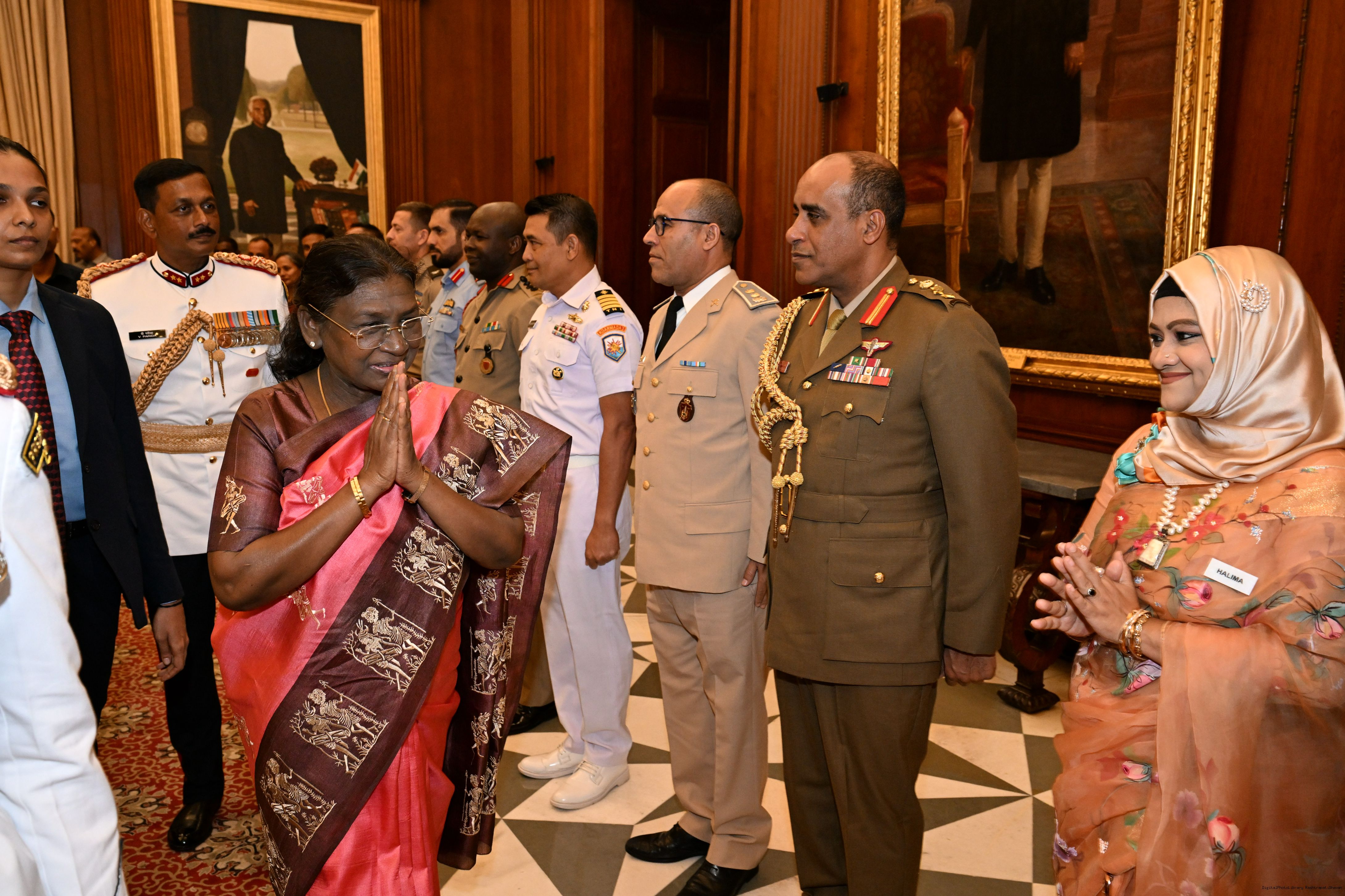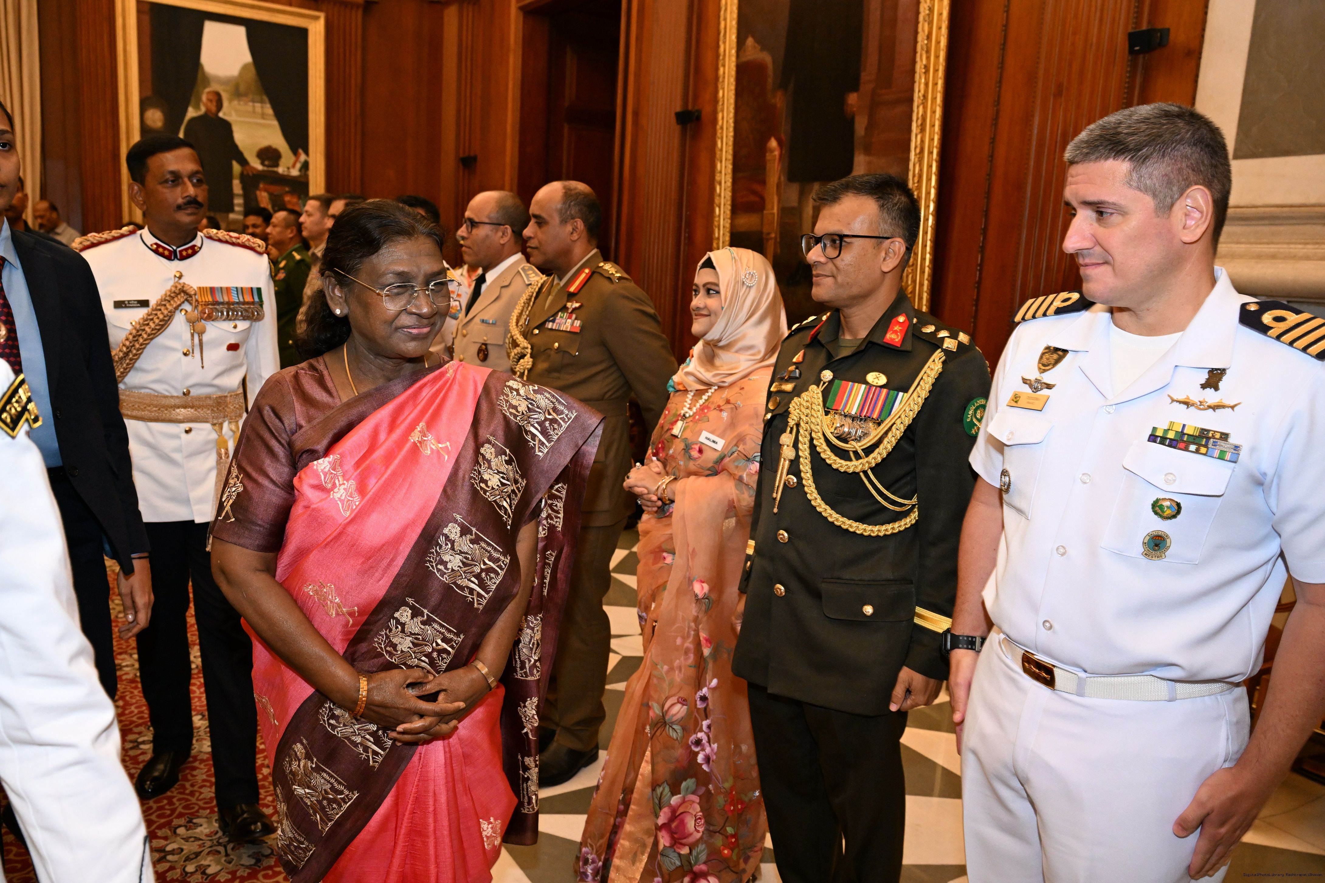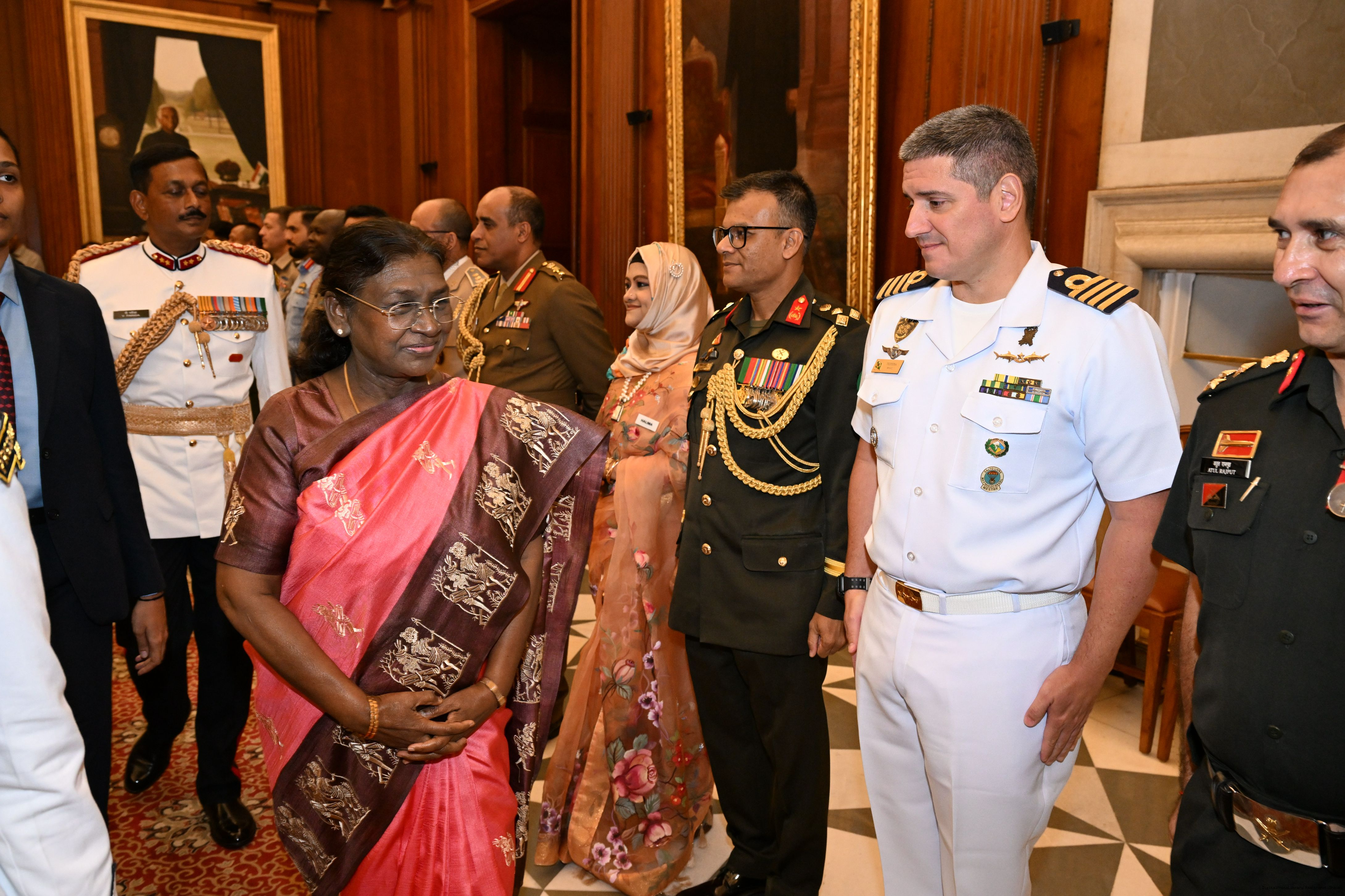 | Caption: | The faculty and course members of the 65th National Defence College Course called on the President of India, Smt Droupadi Murmu, at Rashtrapati Bhavan on October 7, 2025. |