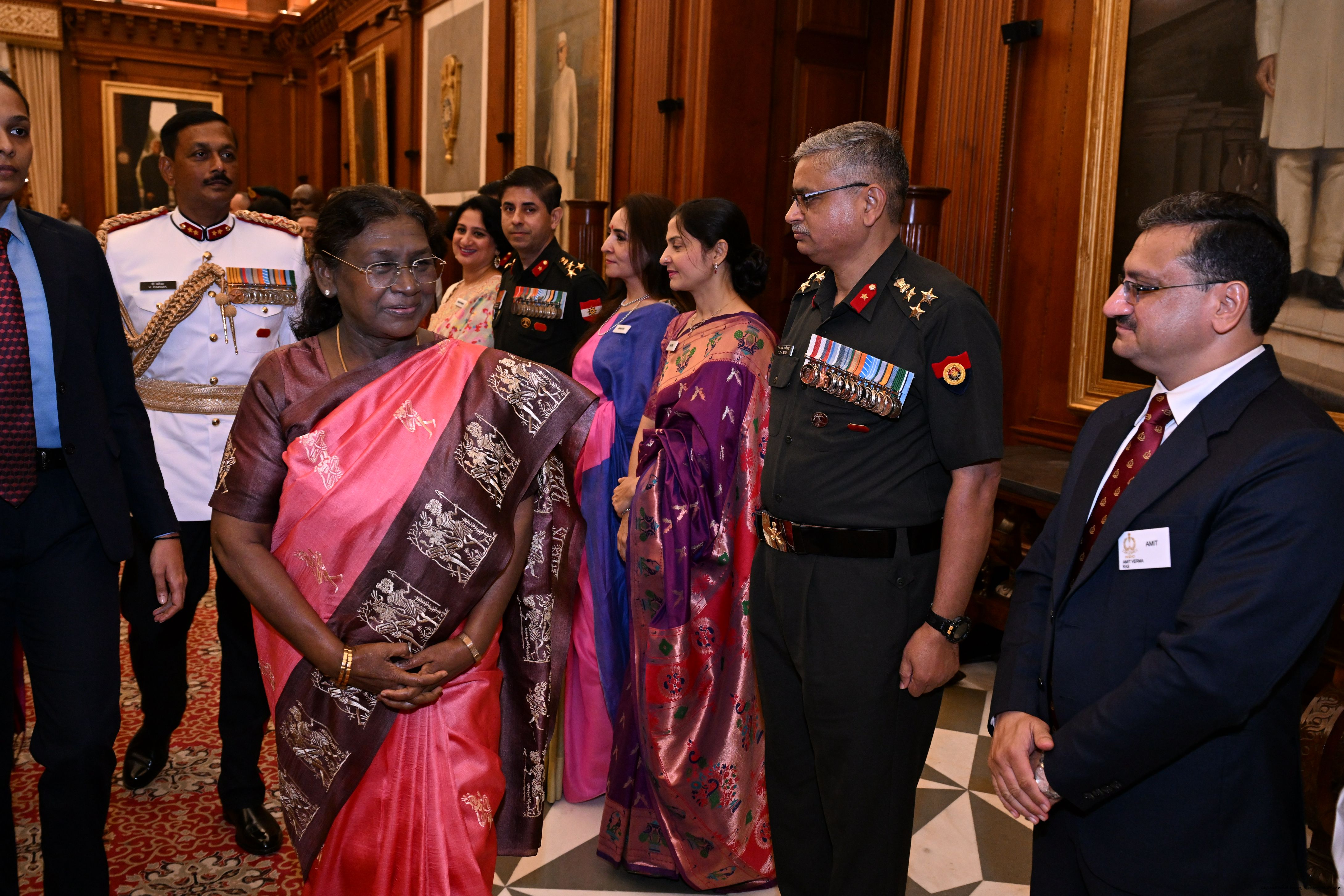 | Caption: | The faculty and course members of the 65th National Defence College Course called on the President of India, Smt Droupadi Murmu, at Rashtrapati Bhavan on October 7, 2025. |