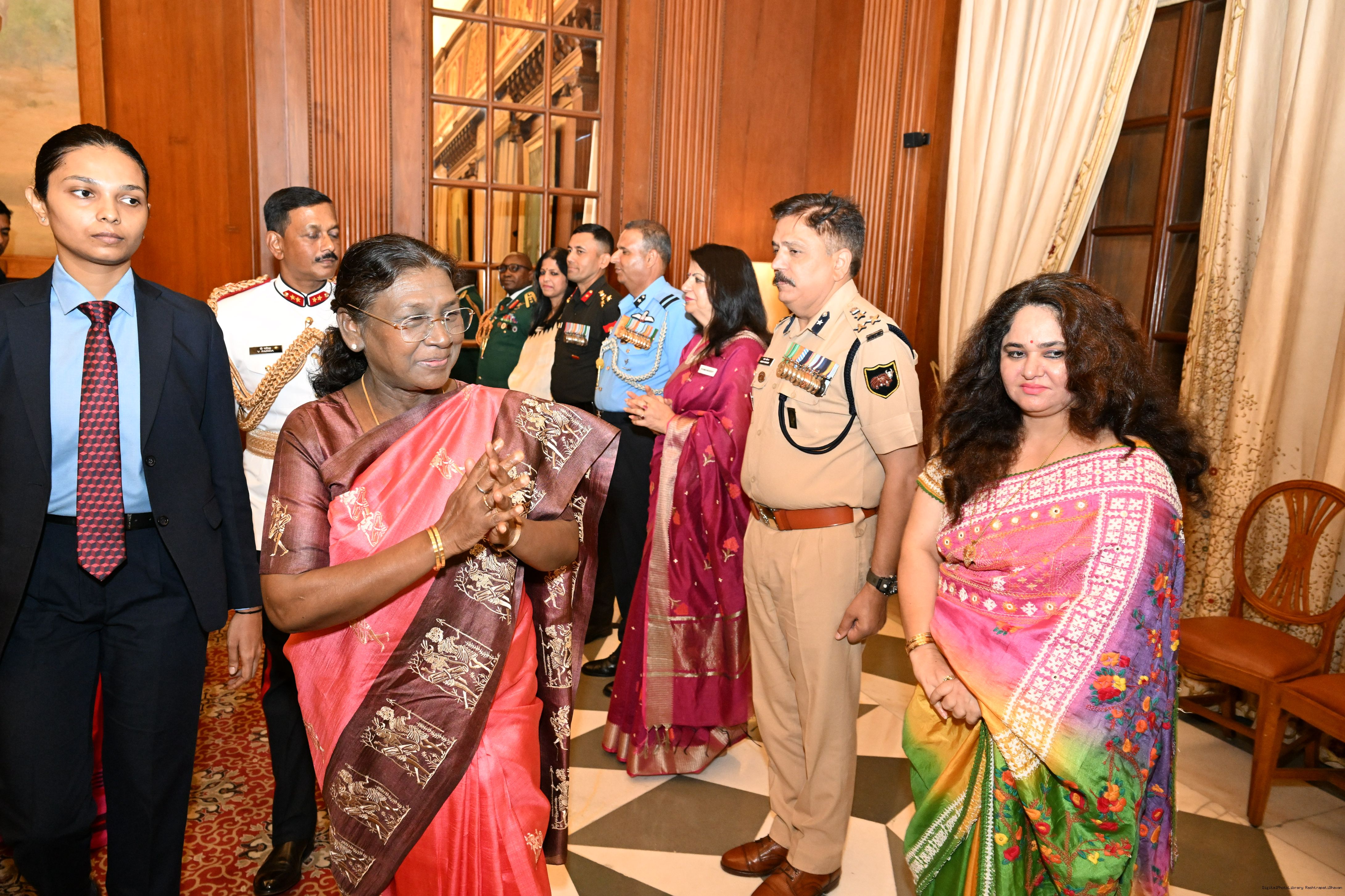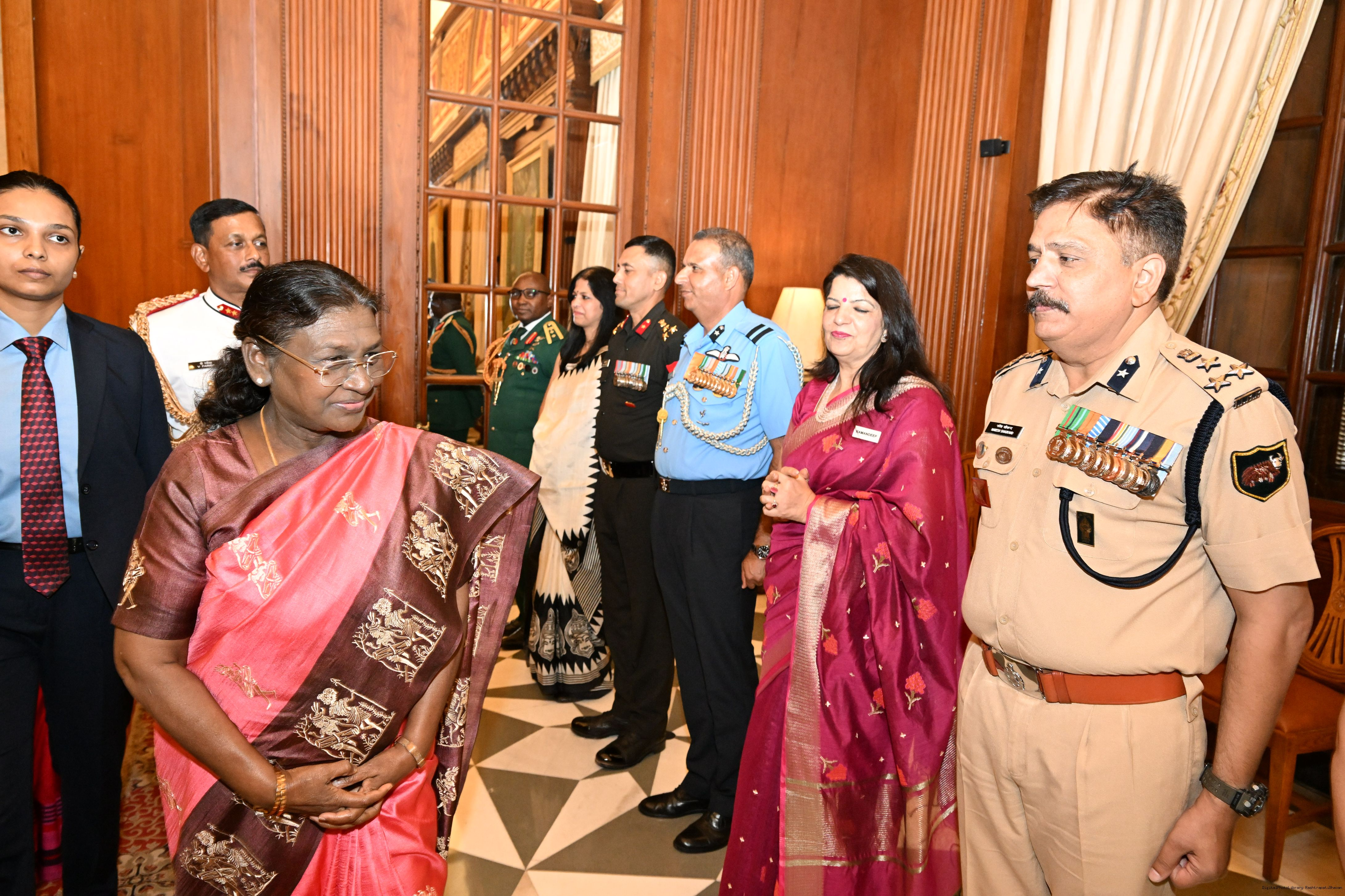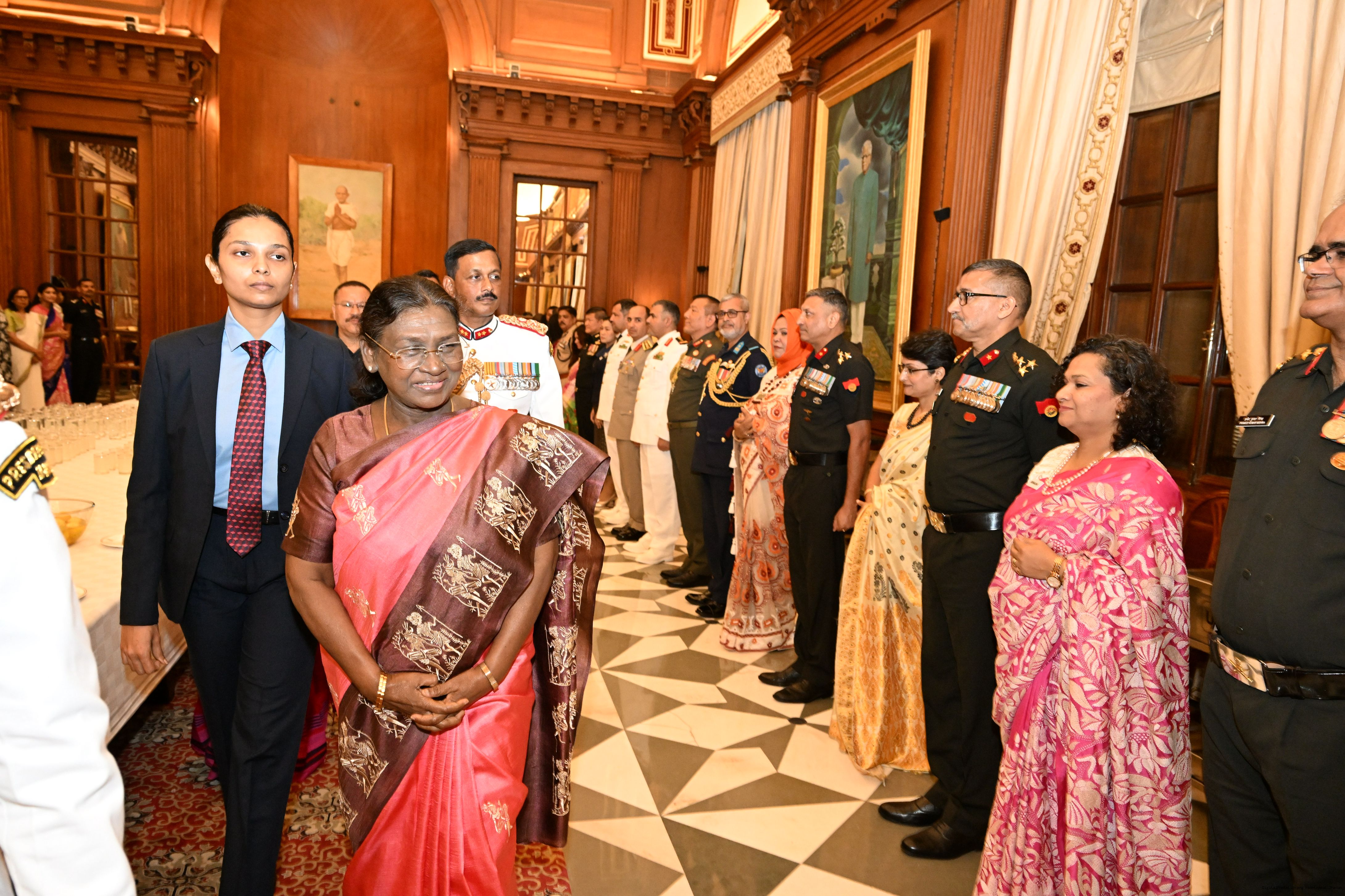 | Caption: | The faculty and course members of the 65th National Defence College Course called on the President of India, Smt Droupadi Murmu, at Rashtrapati Bhavan on October 7, 2025. |