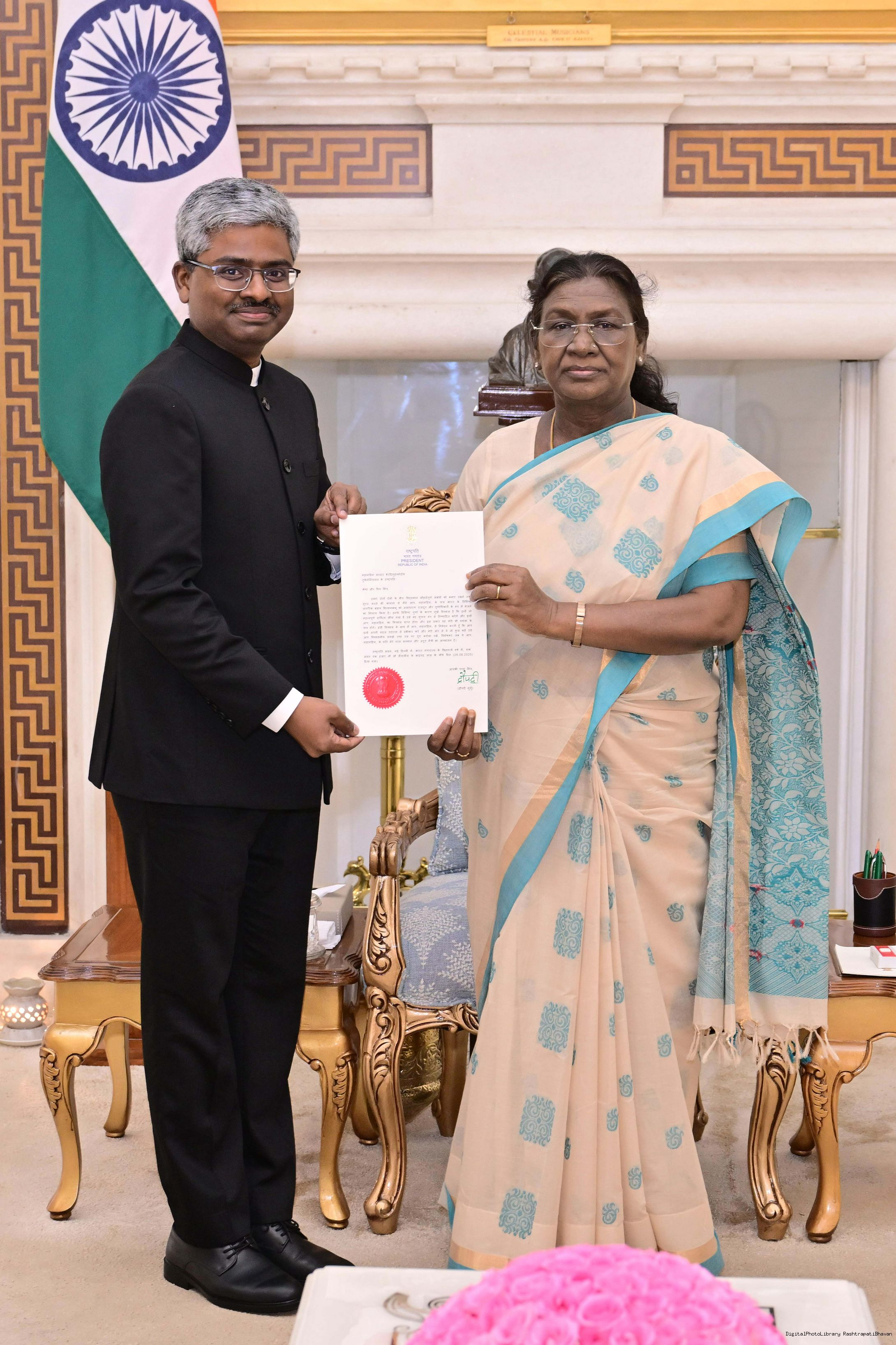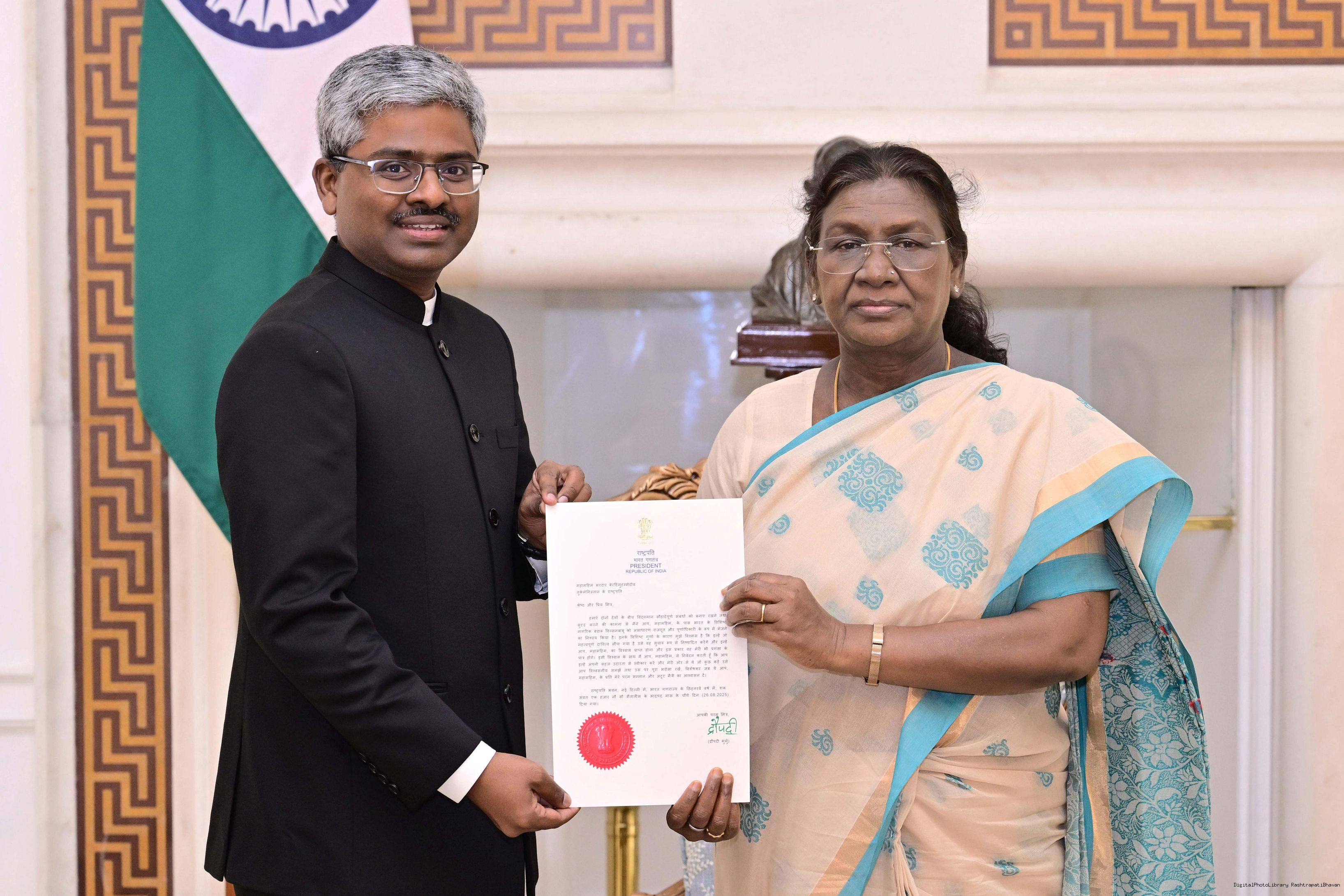 | Caption: | The Ambassador-designate of India to Turkmenistan, Shri Bandaru Wilsonbabu meeting with the President of India, Smt. Droupadi Murmu at Rashtrapati Bhavan on October 8, 2025. |