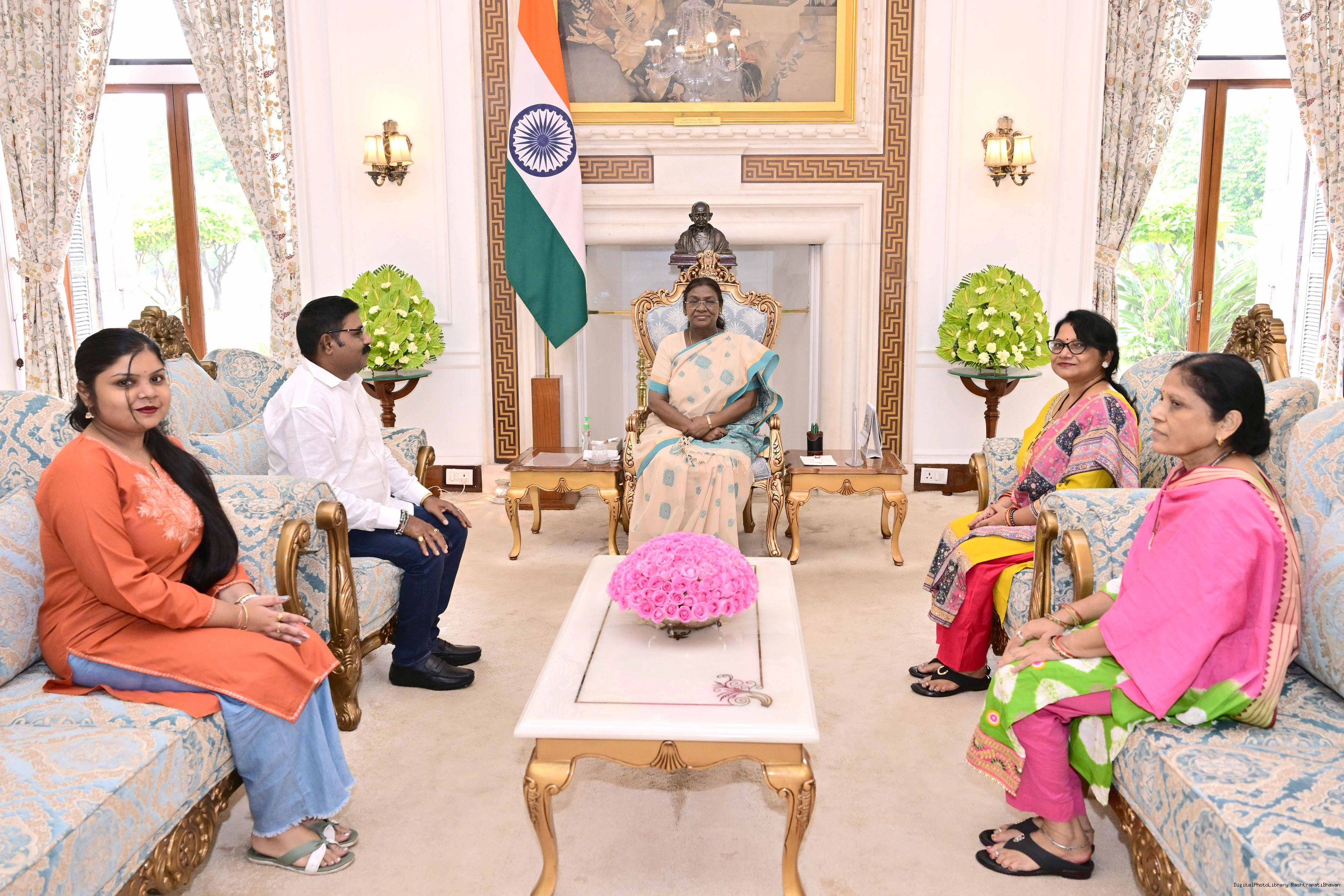 | Caption: | Shri Malay Kumar Jena S/O Shri Maheswar Chandra Jena from Baripada, mayurbhanj along with others meeting with the President of India, Smt. Droupadi Murmu at Rashtrapati Bhavan on October 8, 2025. |
