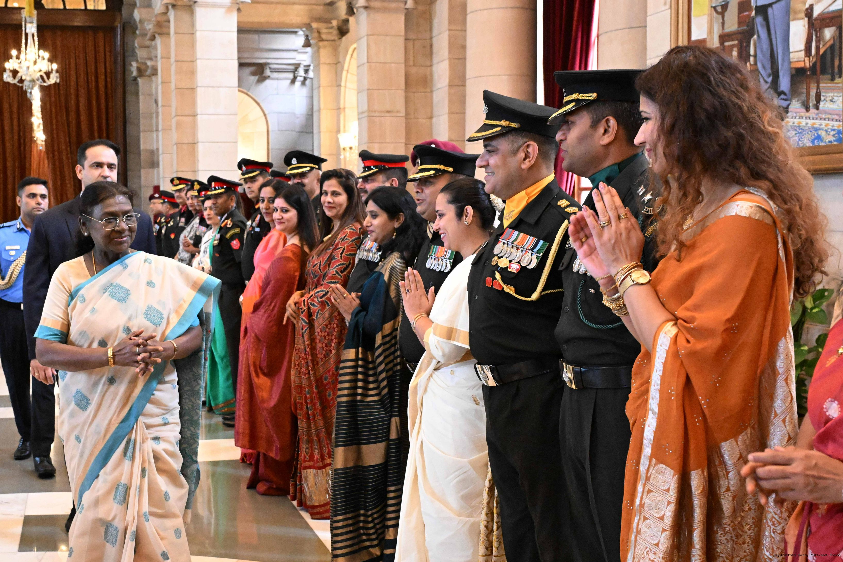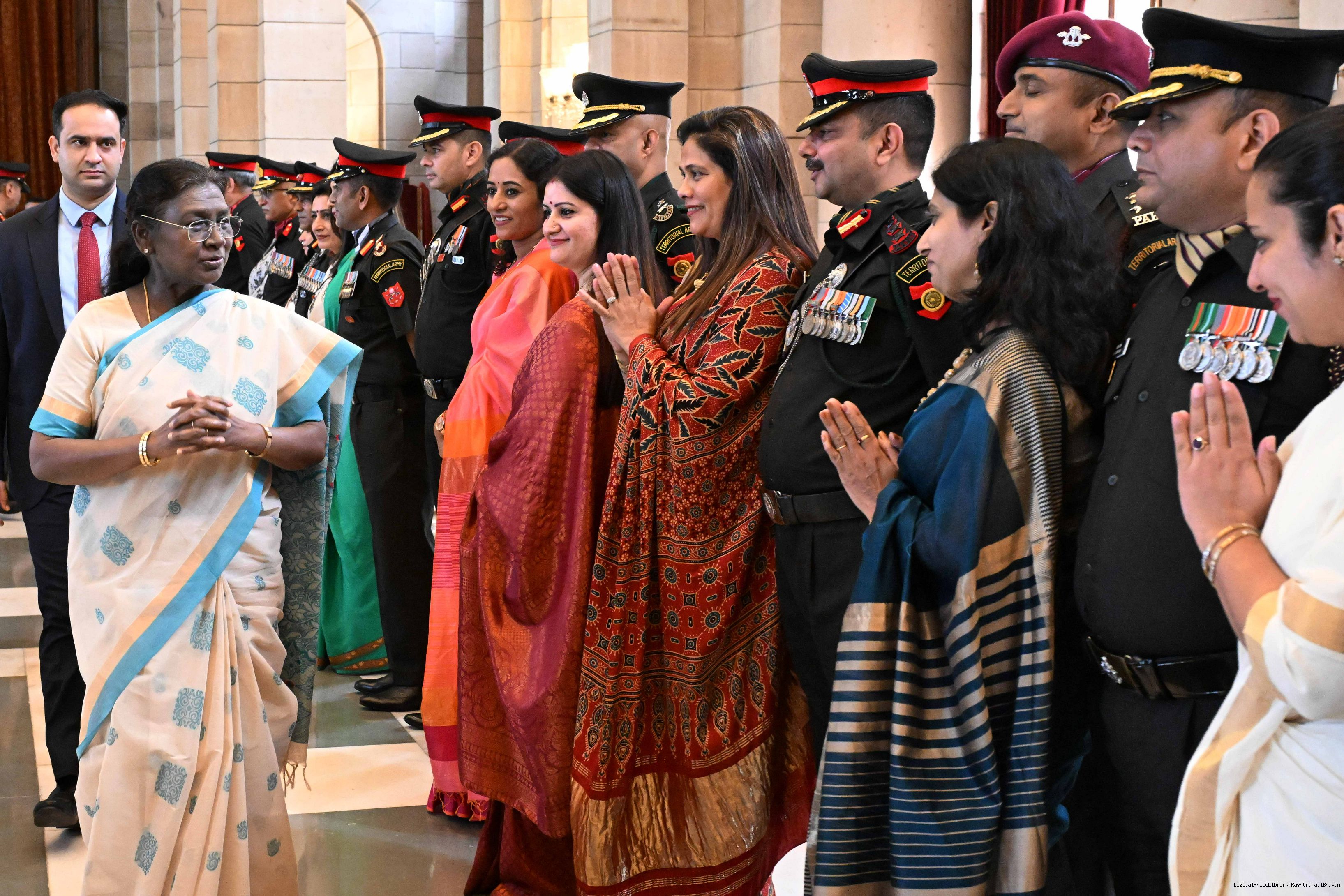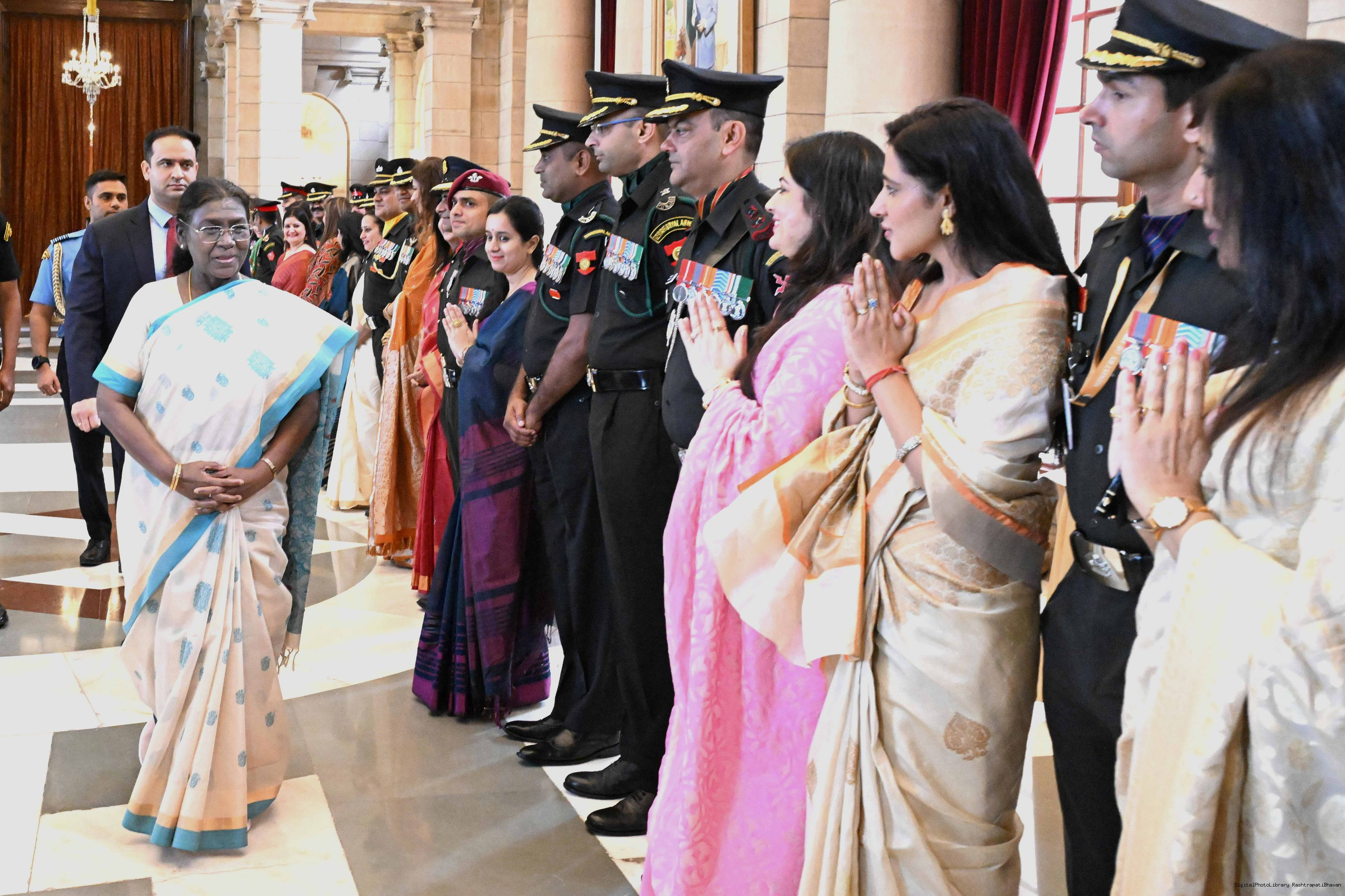 | Caption: | The President of India, Smt. Droupadi Murmu interacted and met Territorial Army (TA) Officers, JCOs and Ors and their families with selected civilian staff of the Territorial Army Directorate at Rashtrapati Bhavan on October 8, 2025. |