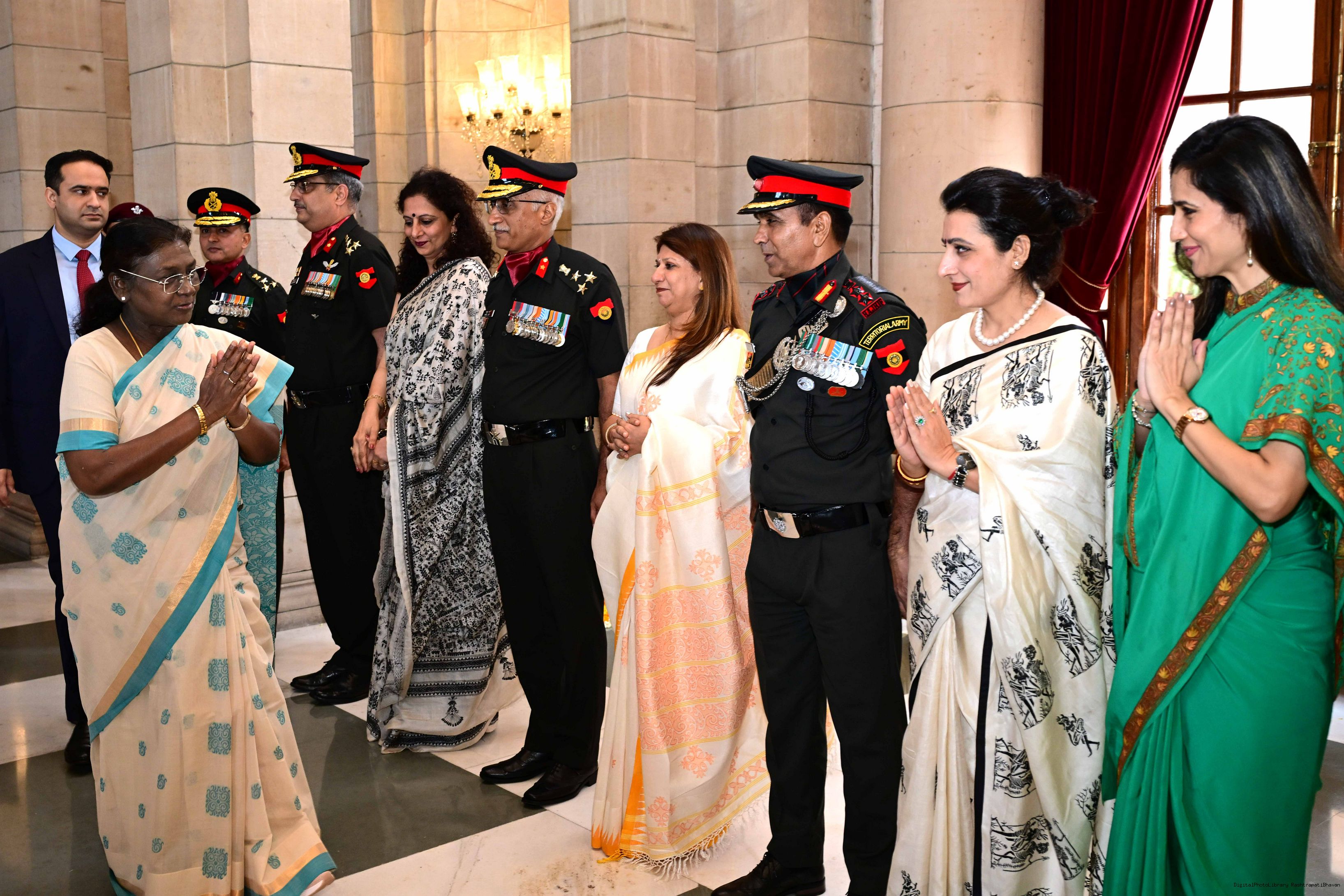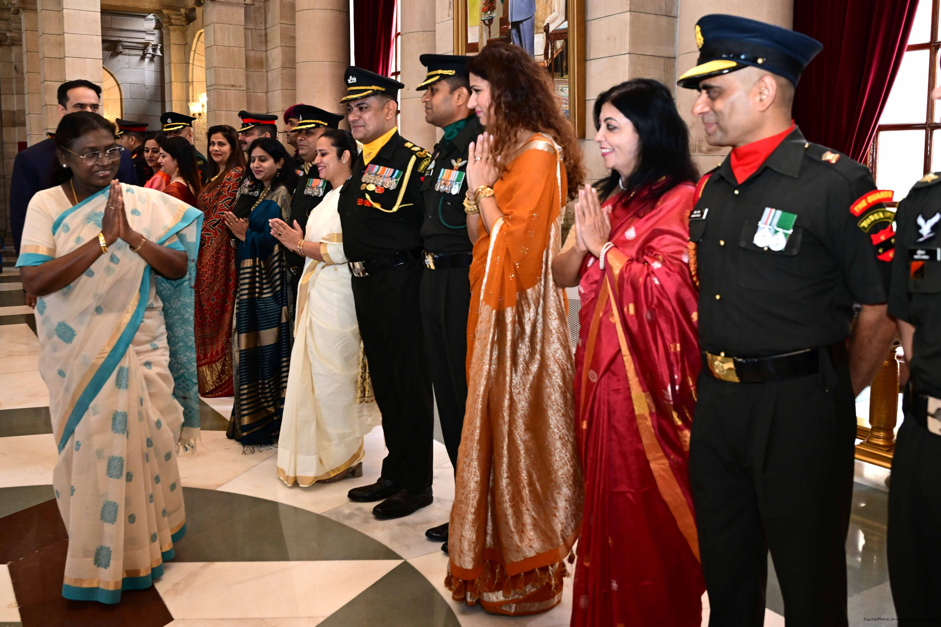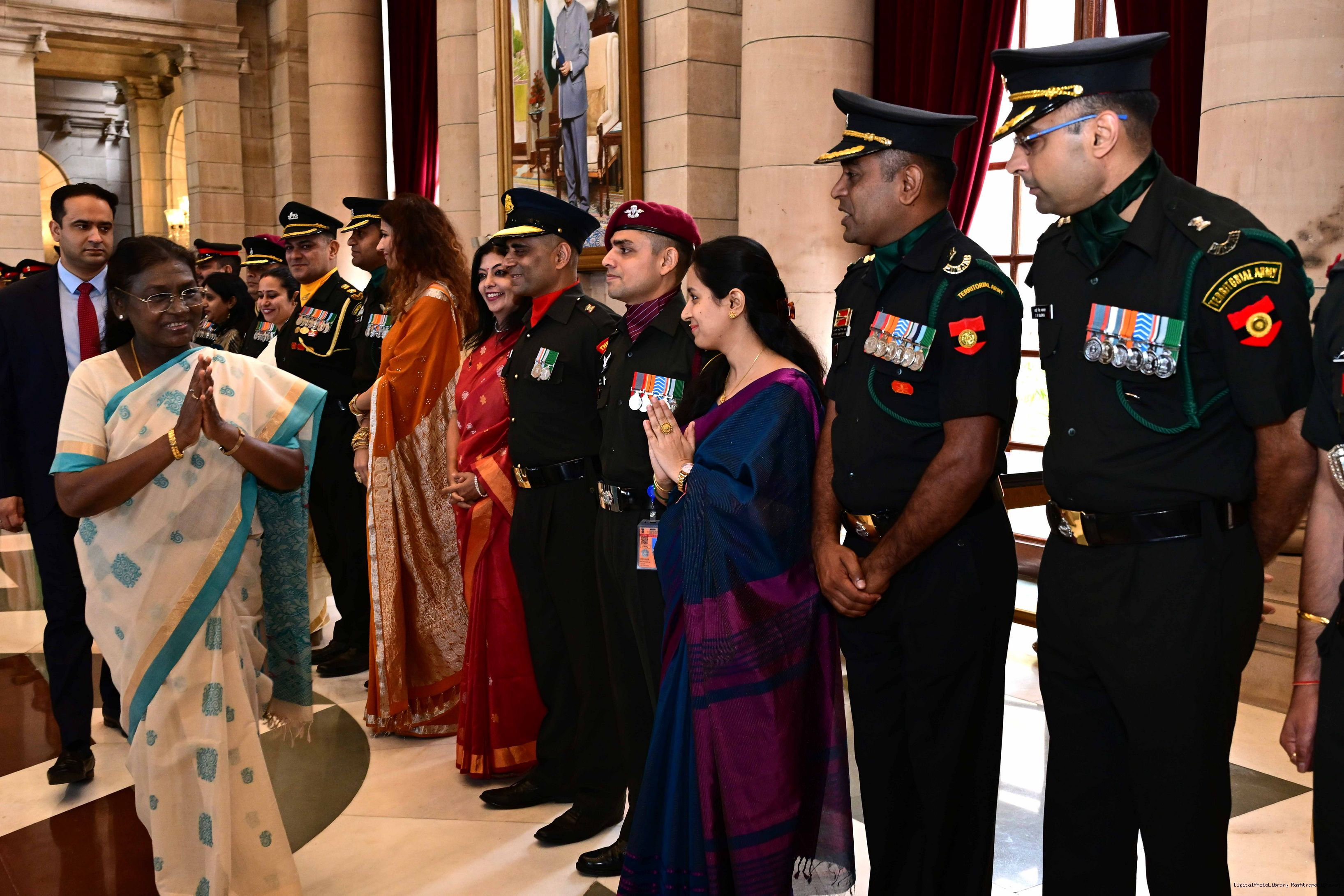 | Caption: | The President of India, Smt. Droupadi Murmu interacted and met Territorial Army (TA) Officers, JCOs and Ors and their families with selected civilian staff of the Territorial Army Directorate at Rashtrapati Bhavan on October 8, 2025. |