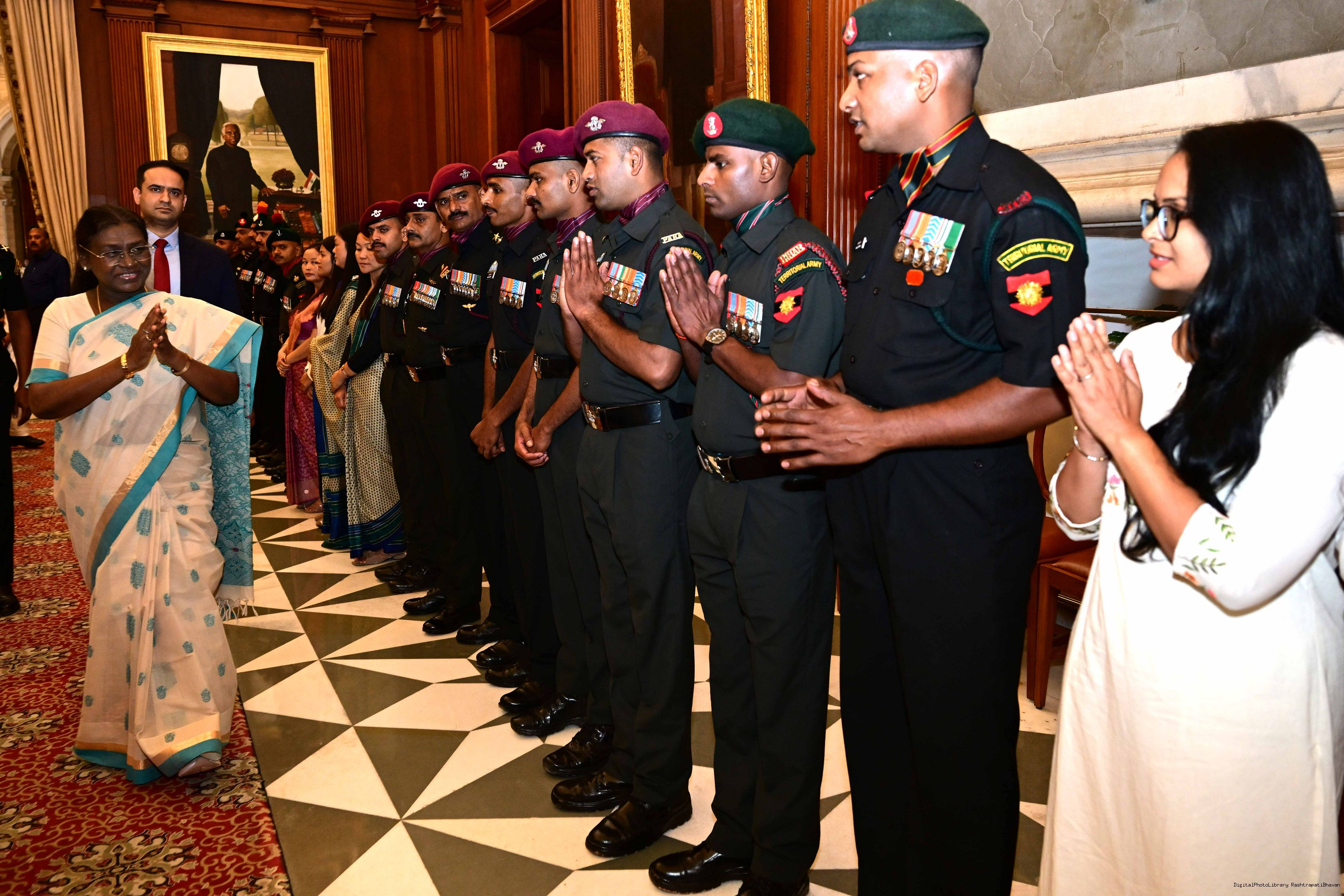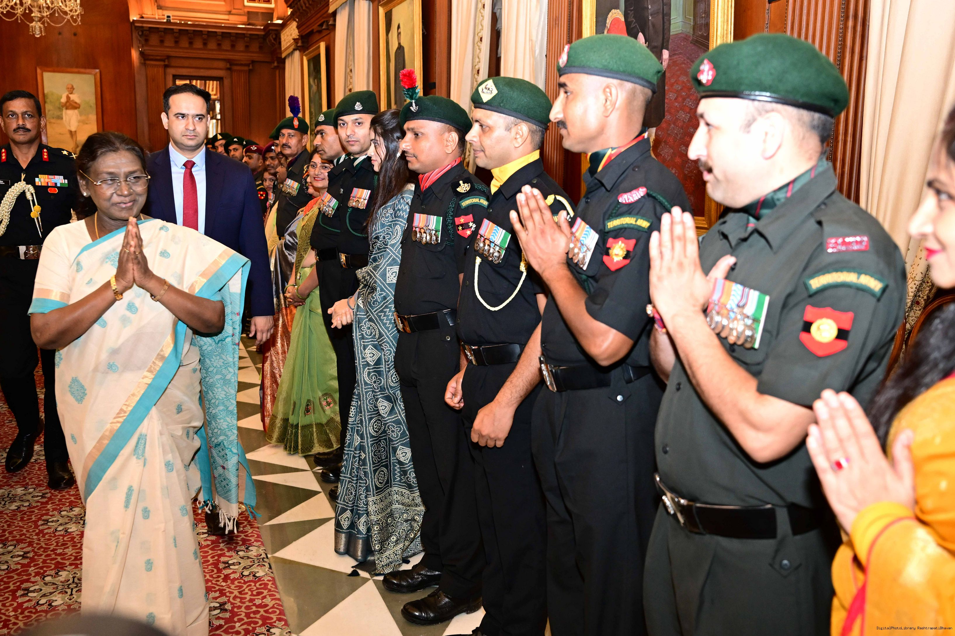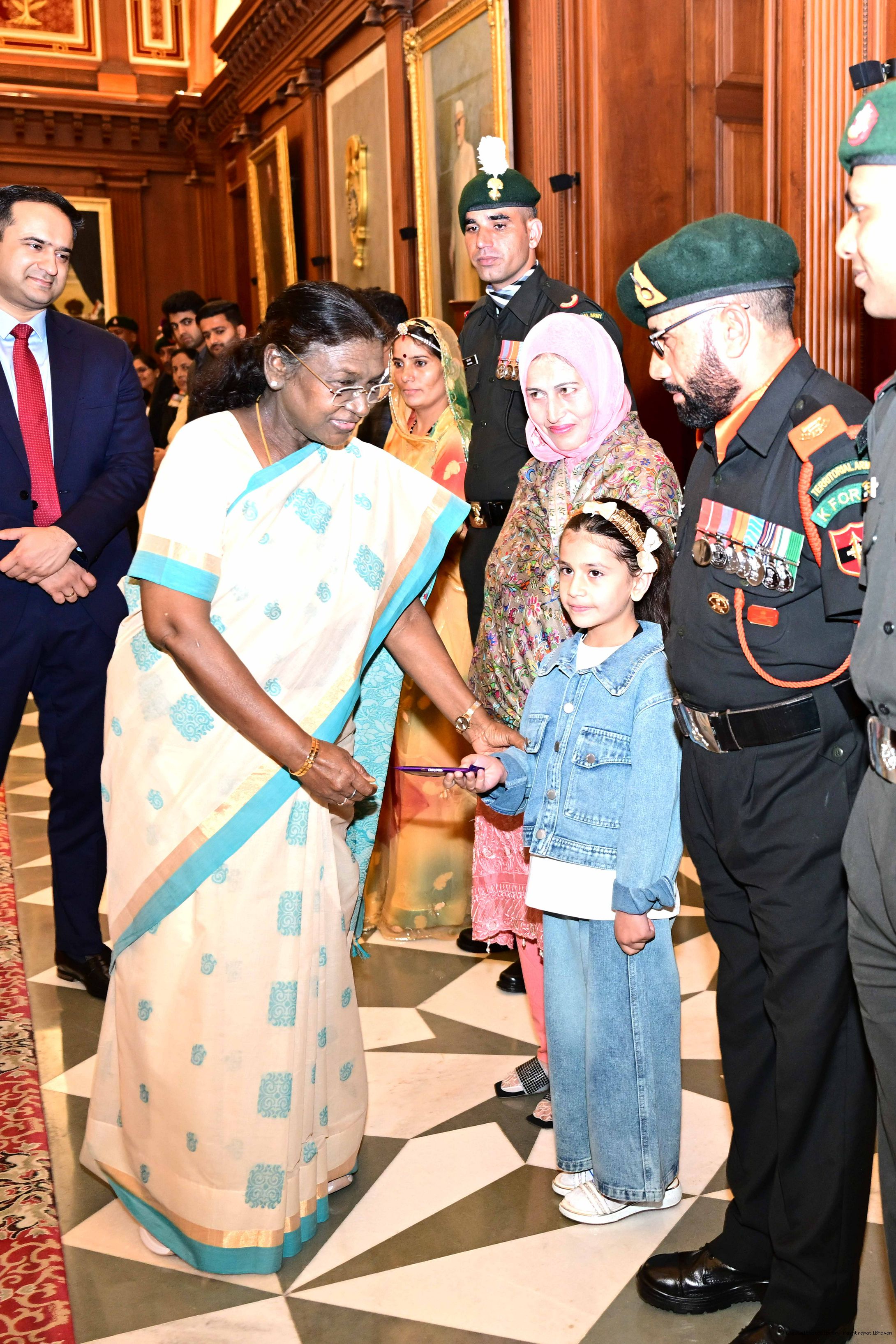 | Caption: | The President of India, Smt. Droupadi Murmu interacted and met Territorial Army (TA) Officers, JCOs and Ors and their families with selected civilian staff of the Territorial Army Directorate at Rashtrapati Bhavan on October 8, 2025. |