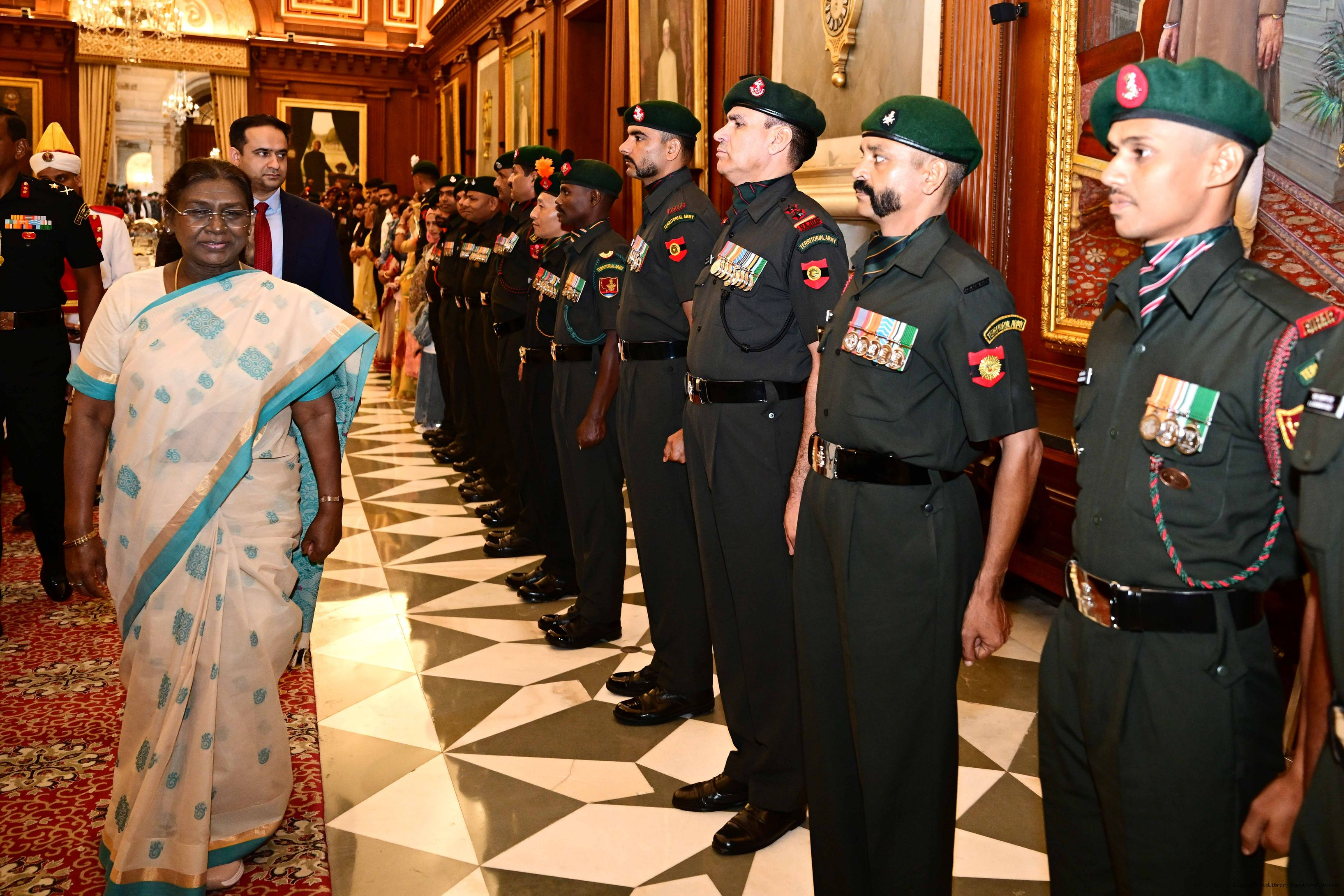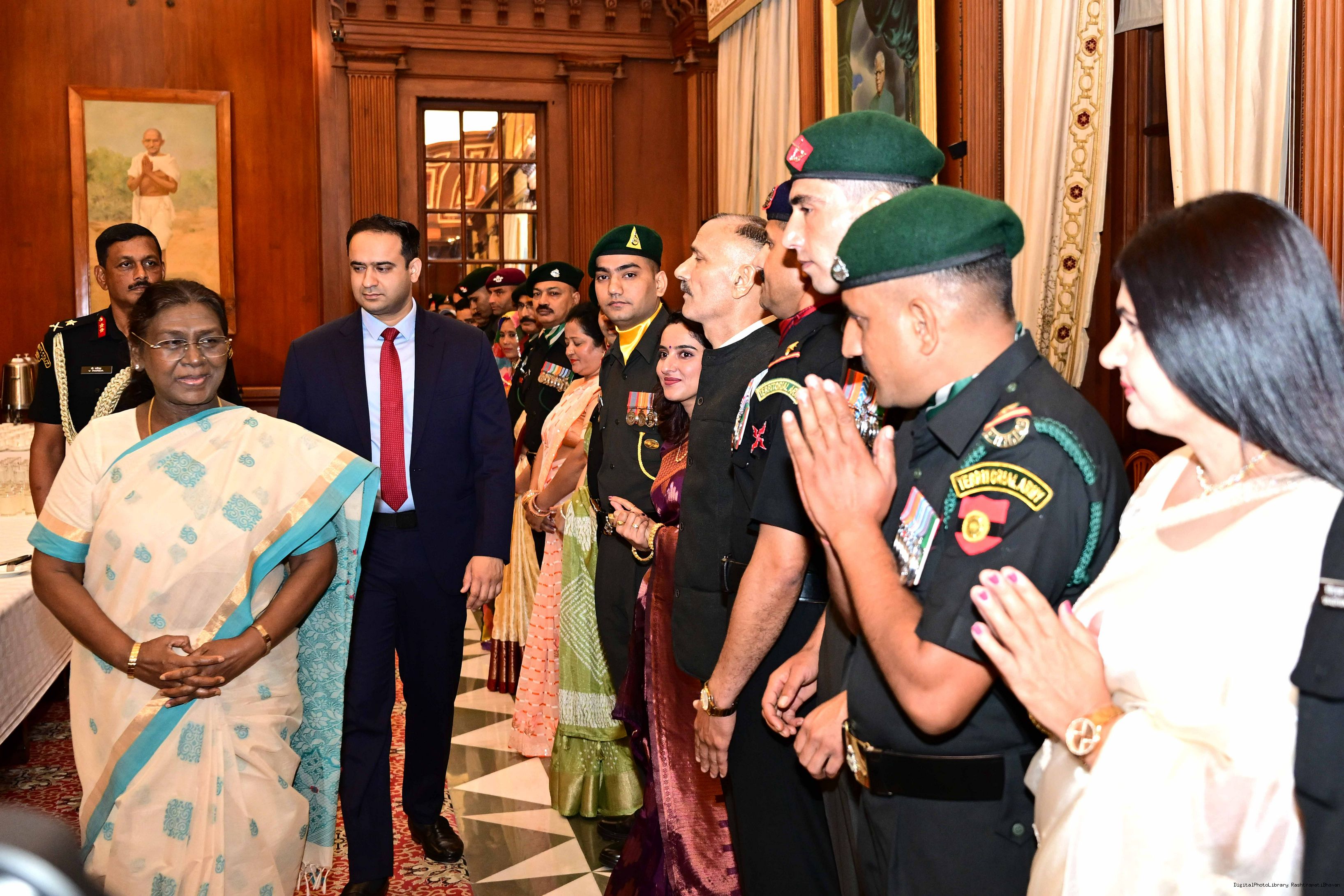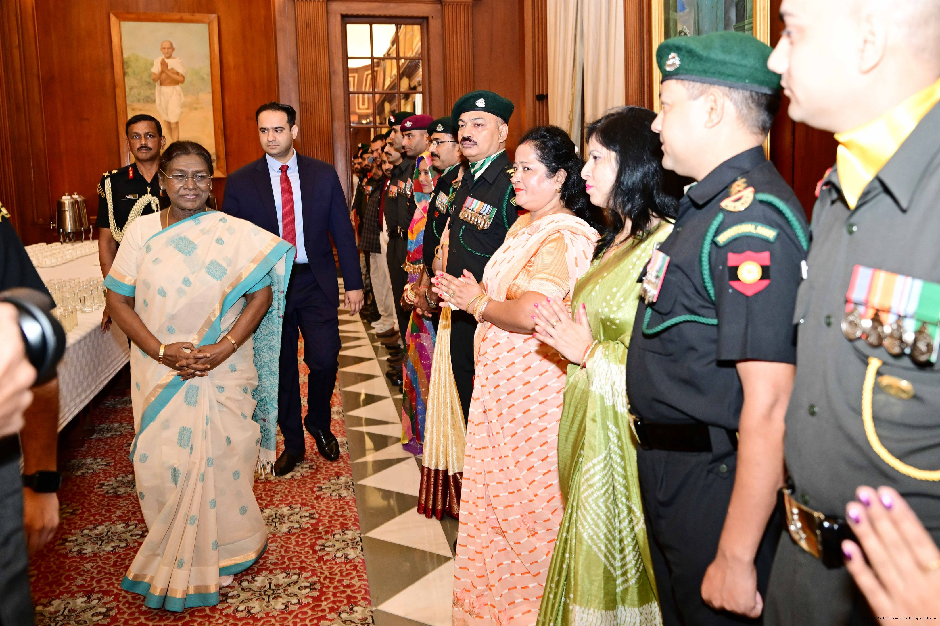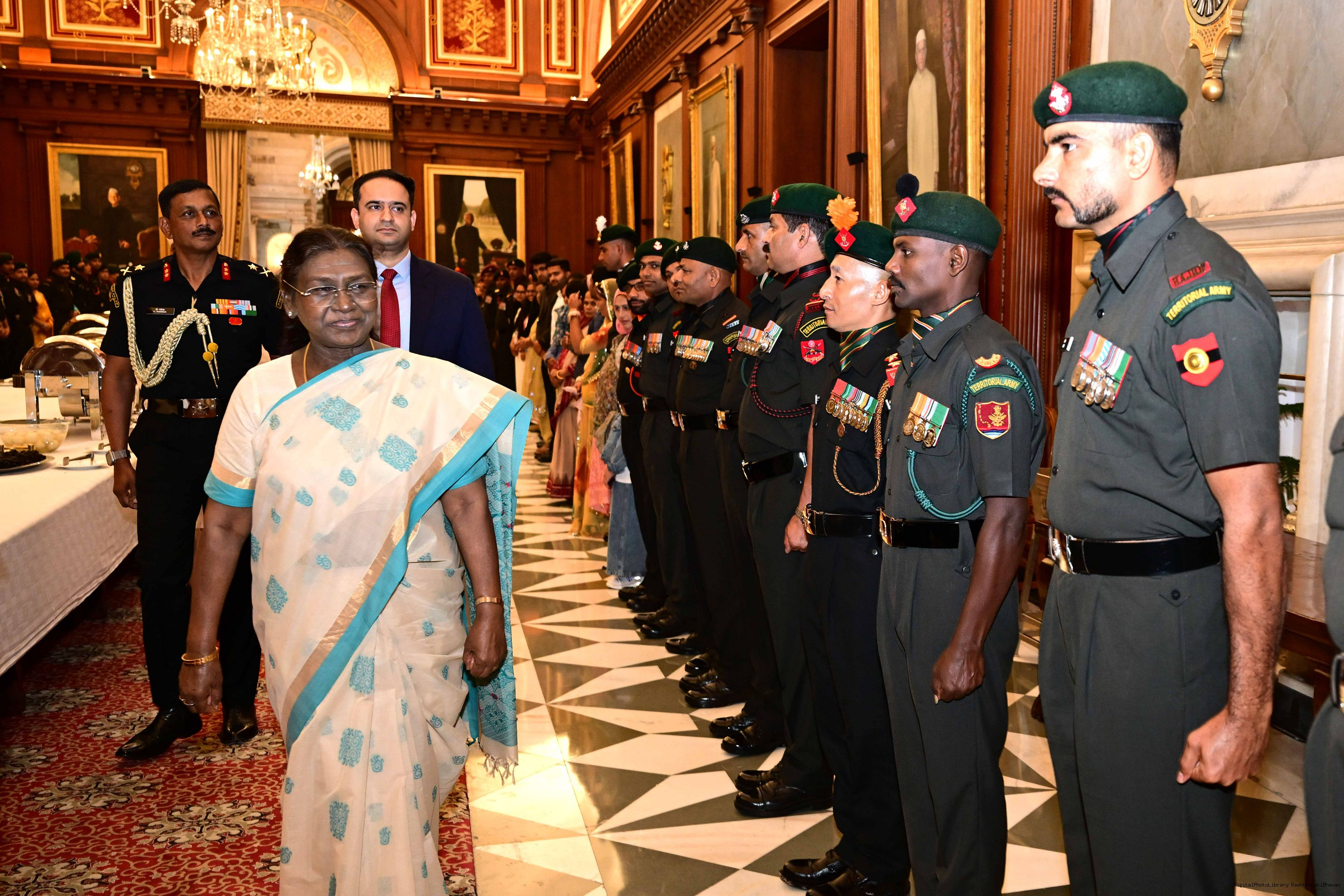 | Caption: | The President of India, Smt. Droupadi Murmu interacted and met Territorial Army (TA) Officers, JCOs and Ors and their families with selected civilian staff of the Territorial Army Directorate at Rashtrapati Bhavan on October 8, 2025. |