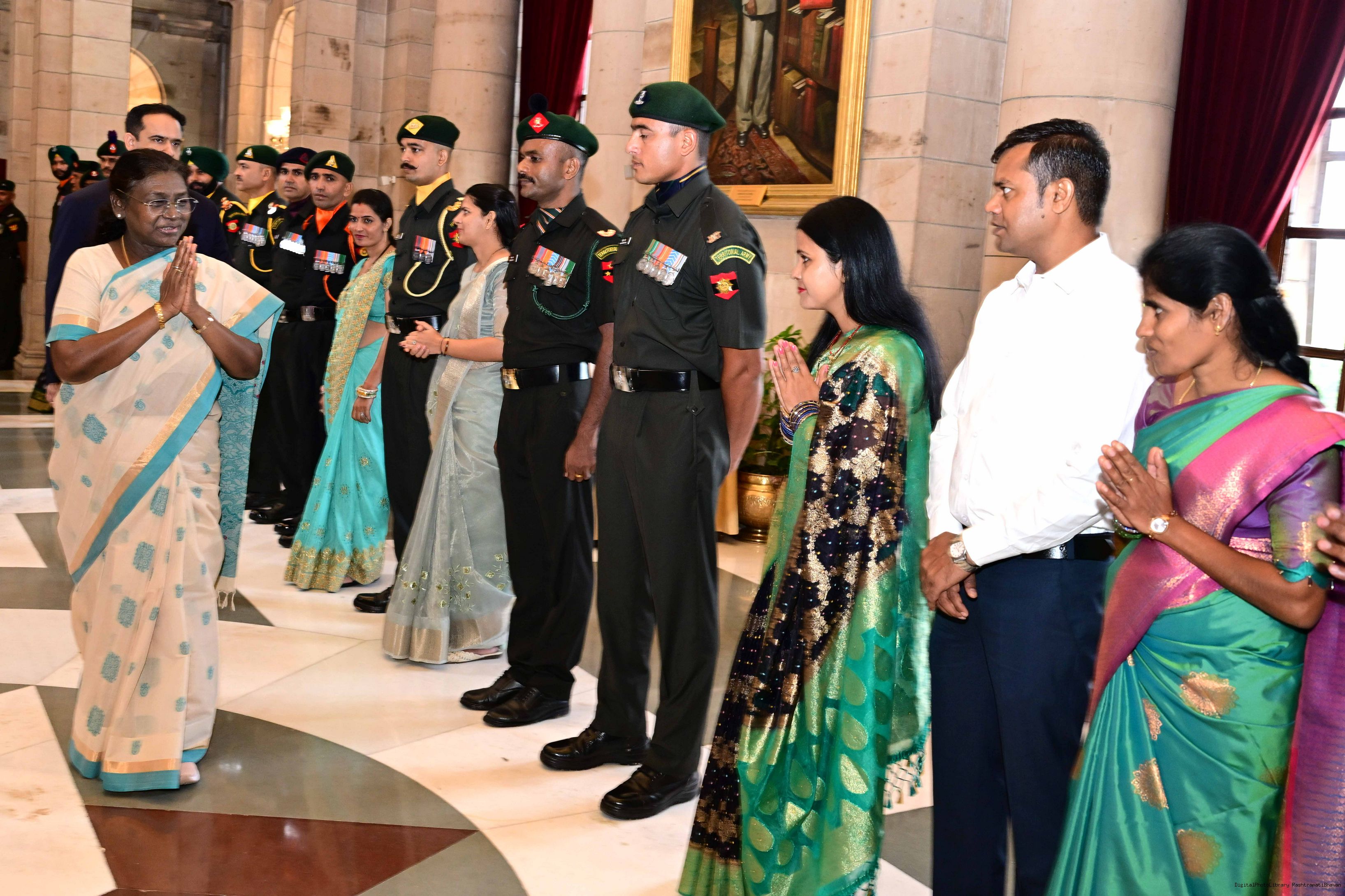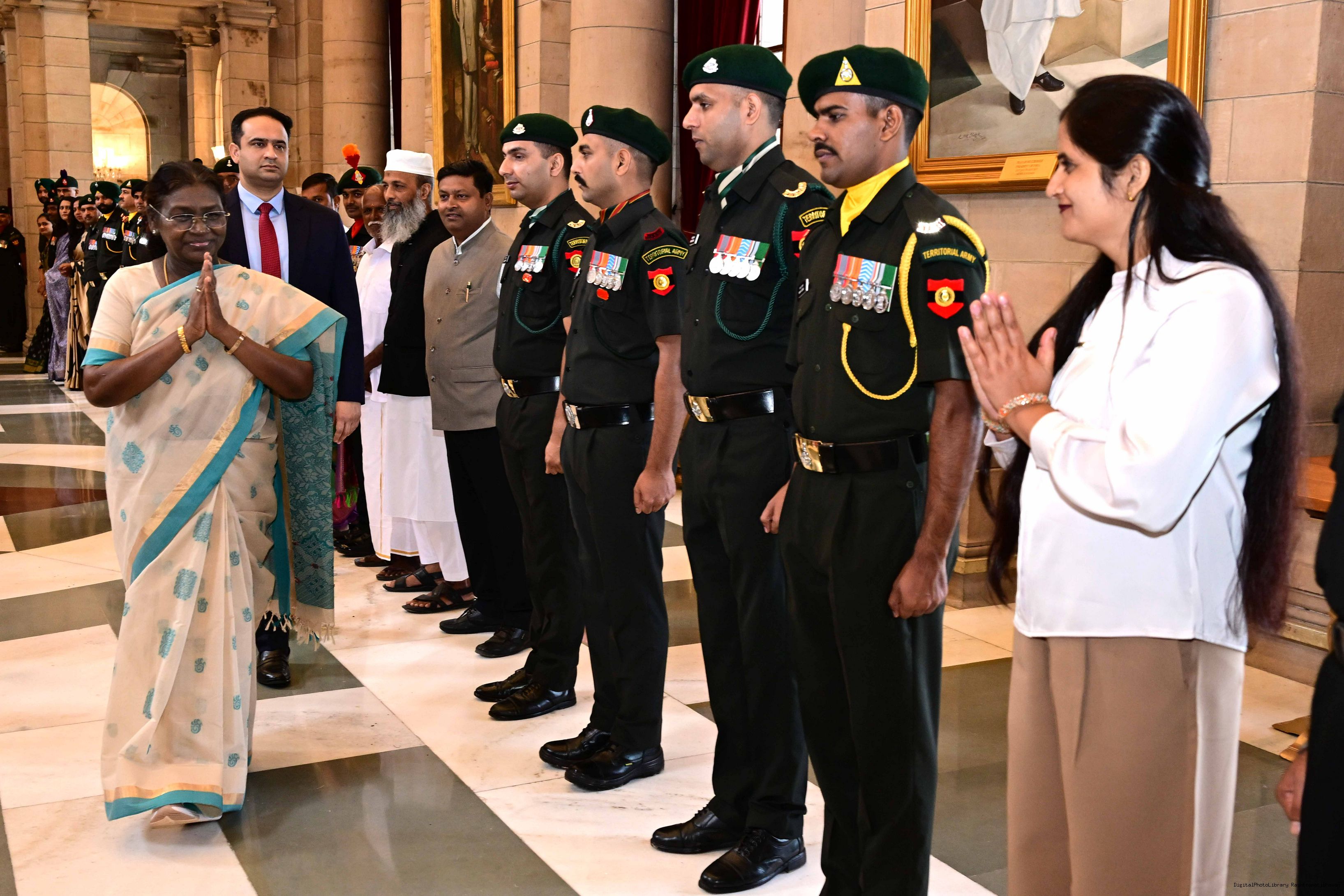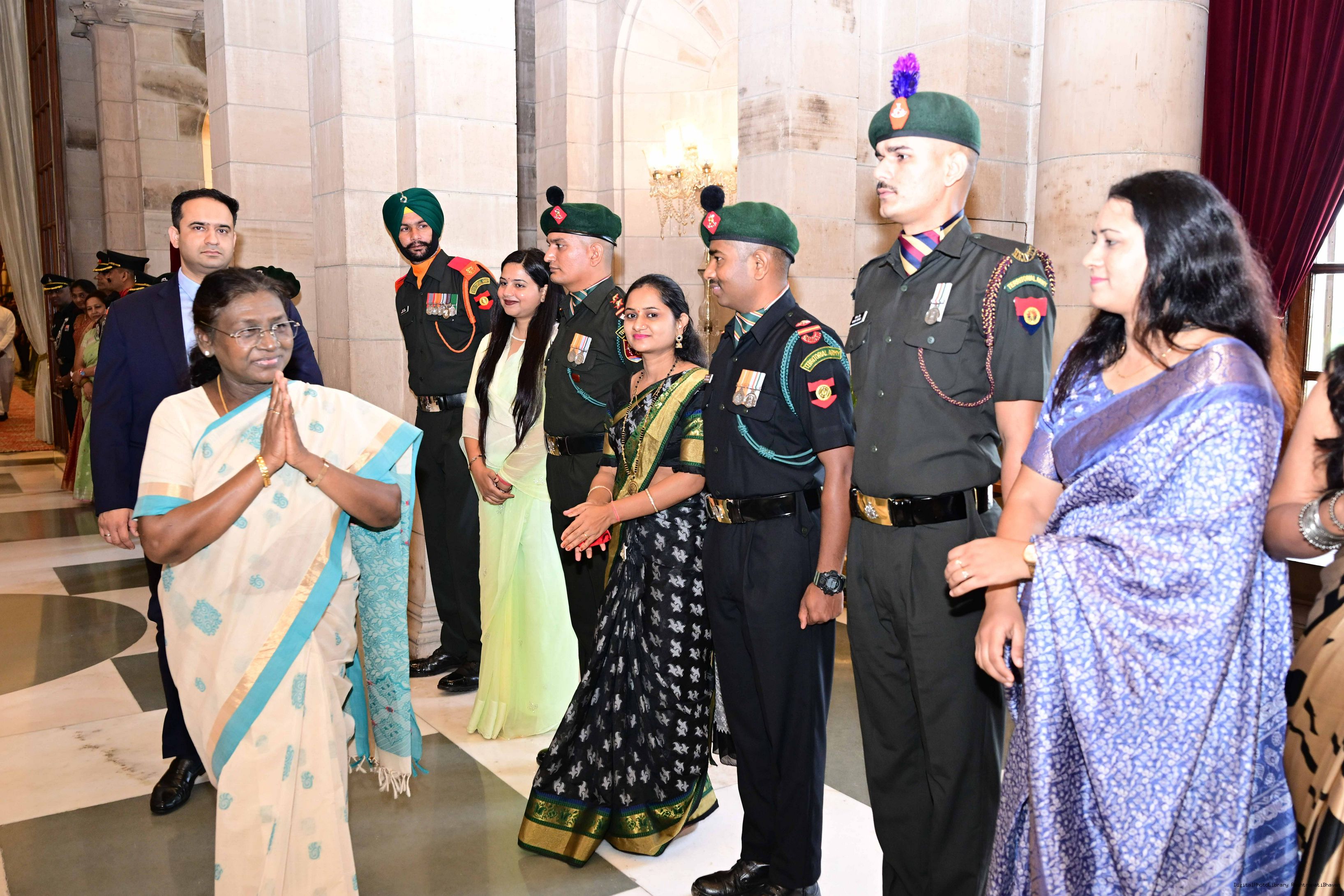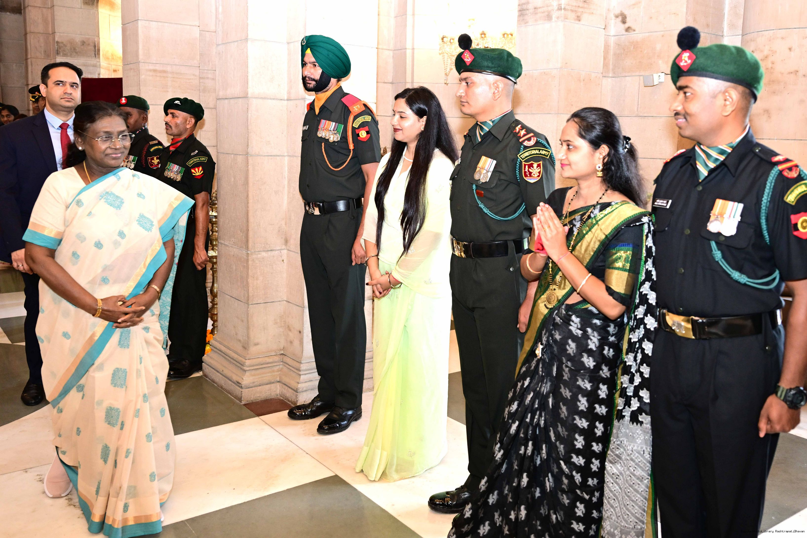 | Caption: | The President of India, Smt. Droupadi Murmu interacted and met Territorial Army (TA) Officers, JCOs and Ors and their families with selected civilian staff of the Territorial Army Directorate at Rashtrapati Bhavan on October 8, 2025. |
