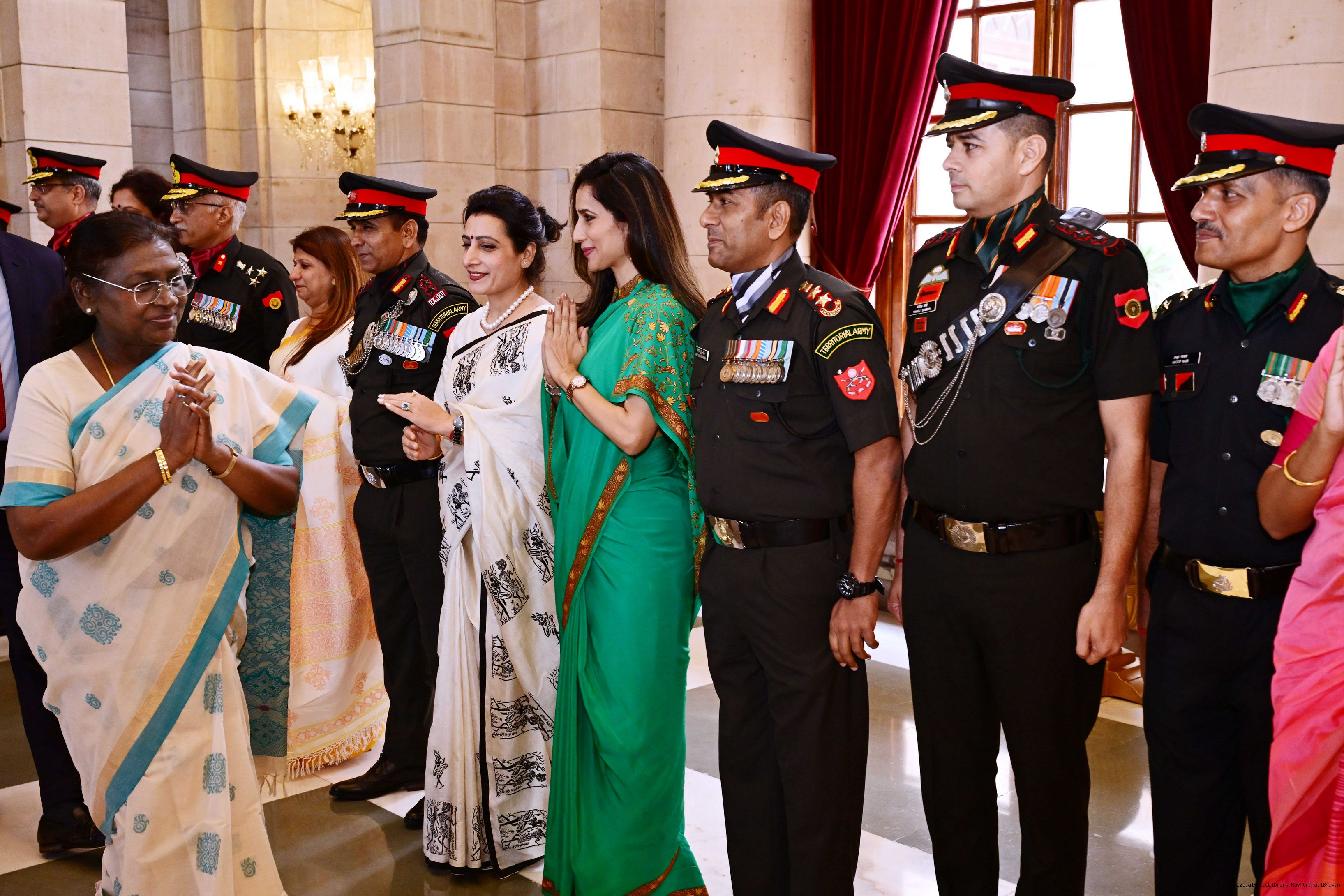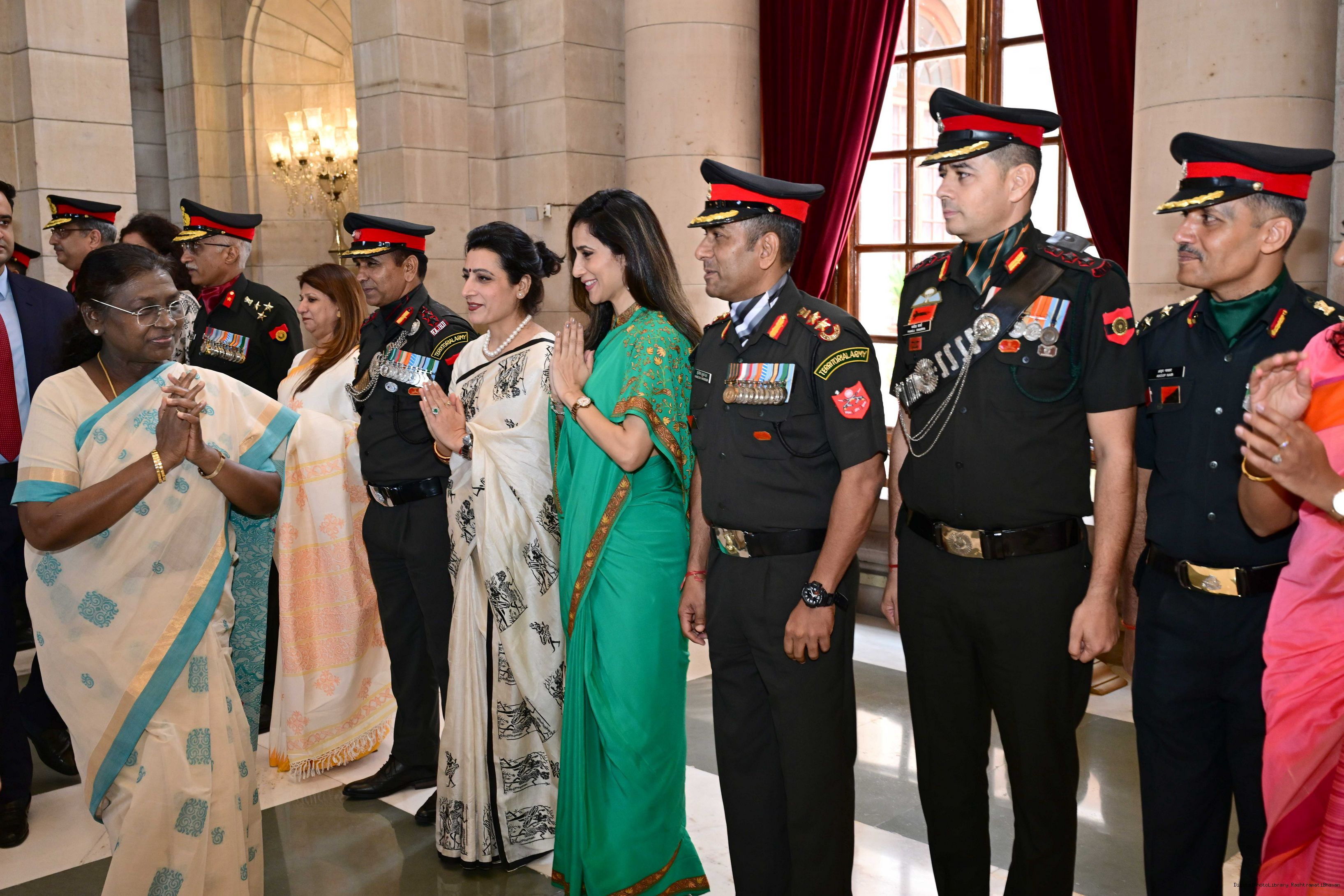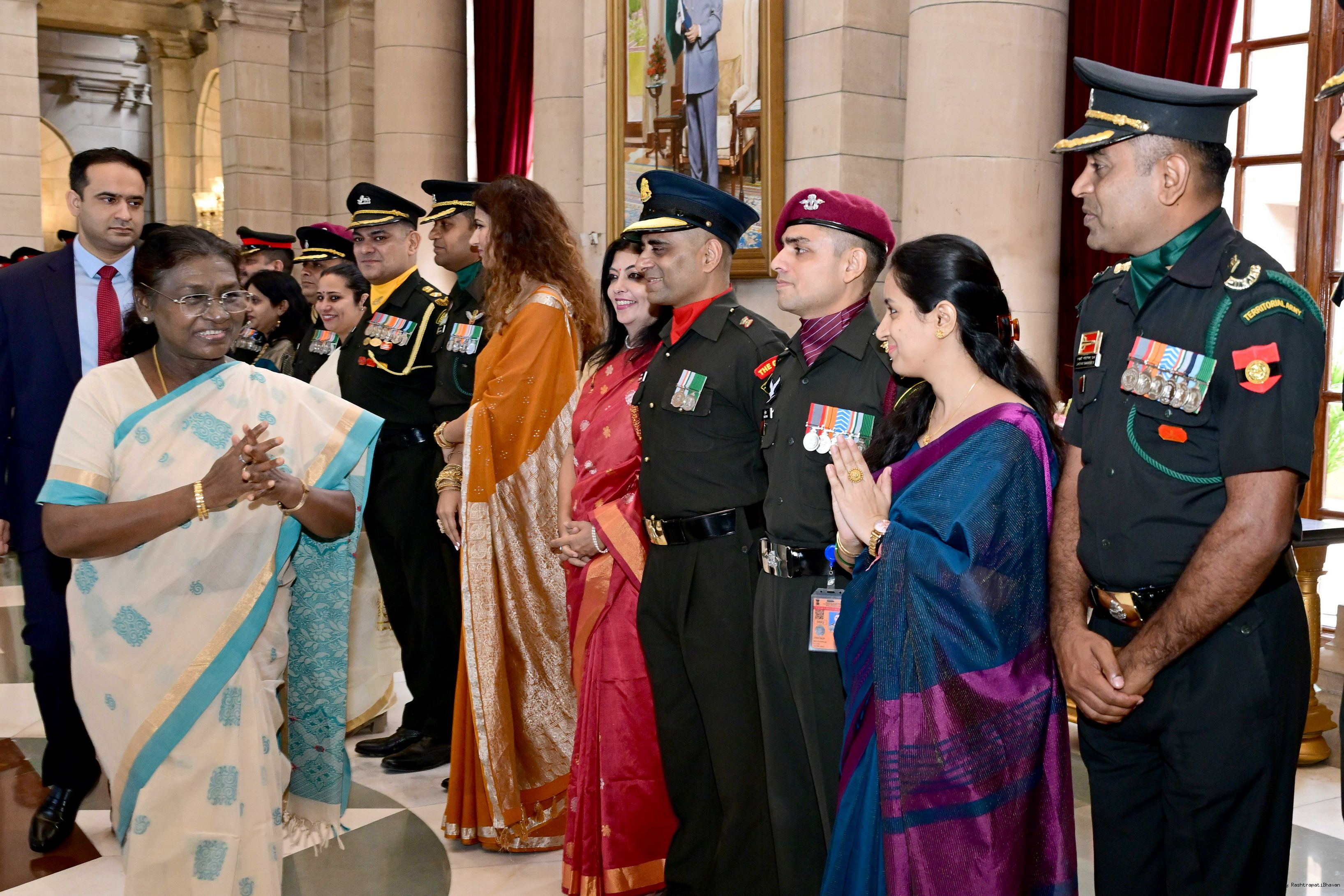 | Caption: | The President of India, Smt. Droupadi Murmu interacted and met Territorial Army (TA) Officers, JCOs and Ors and their families with selected civilian staff of the Territorial Army Directorate at Rashtrapati Bhavan on October 8, 2025. |