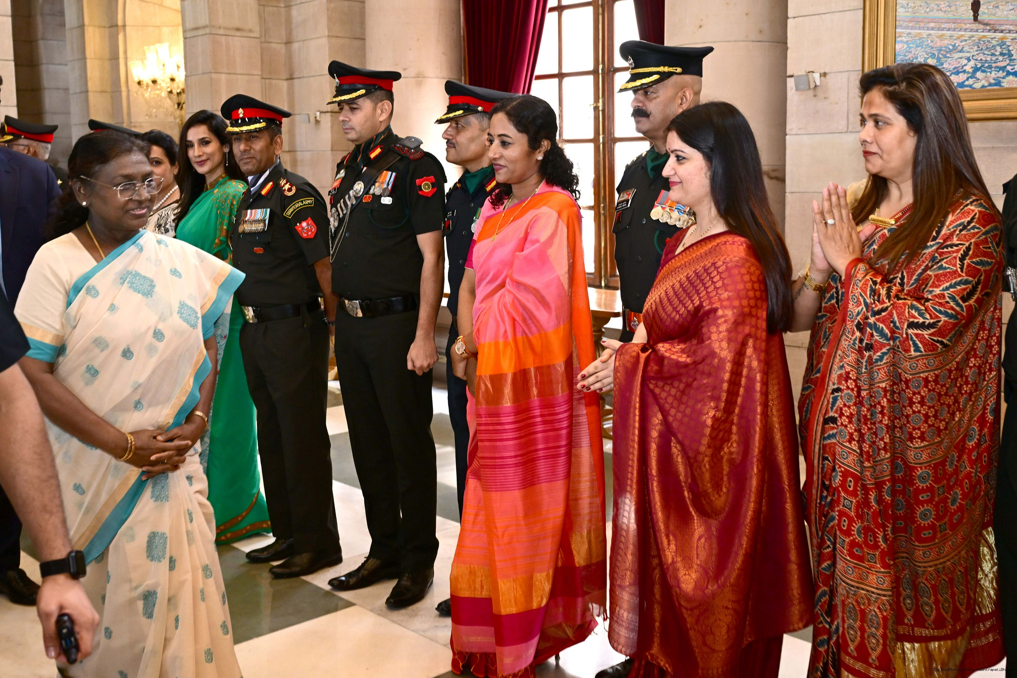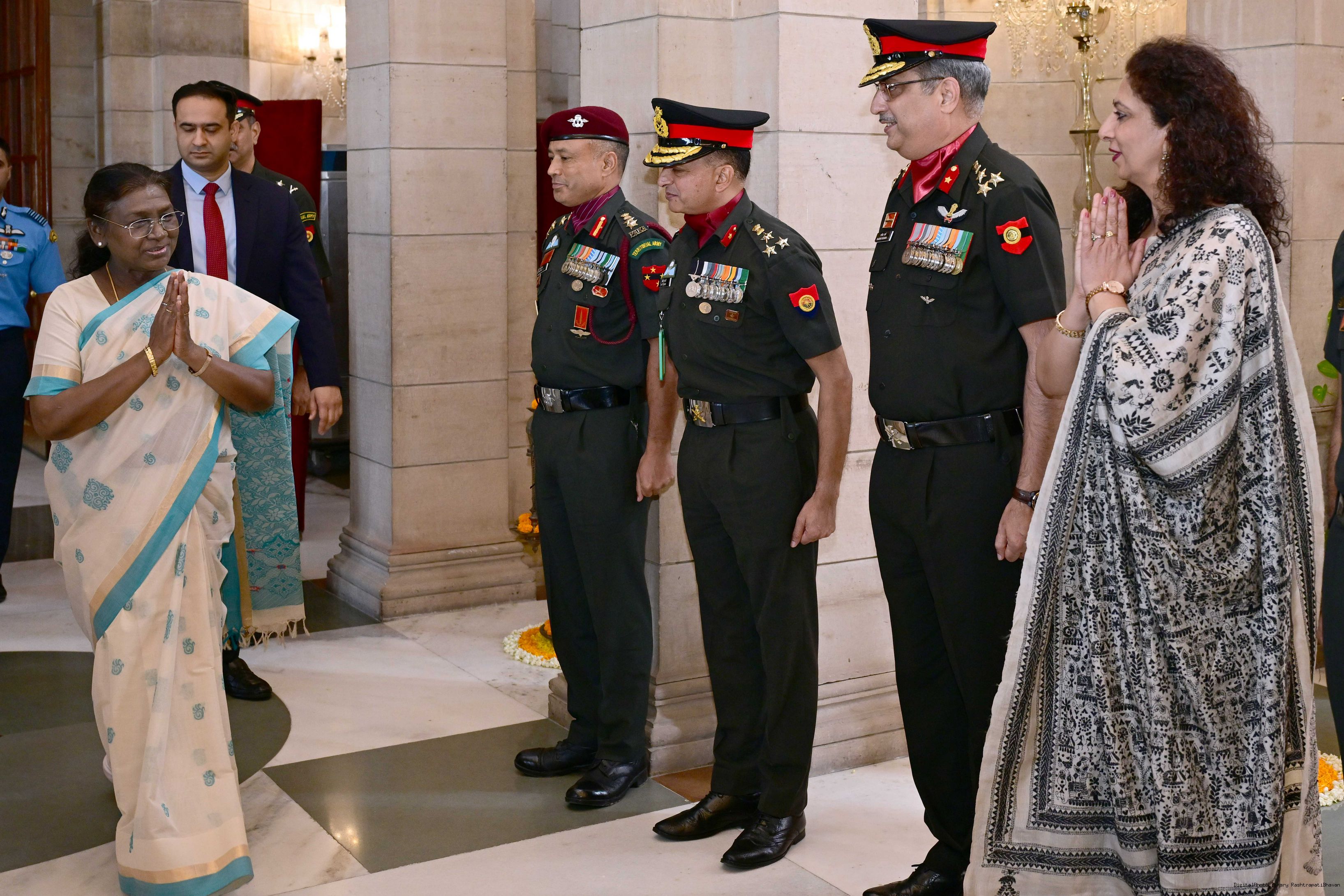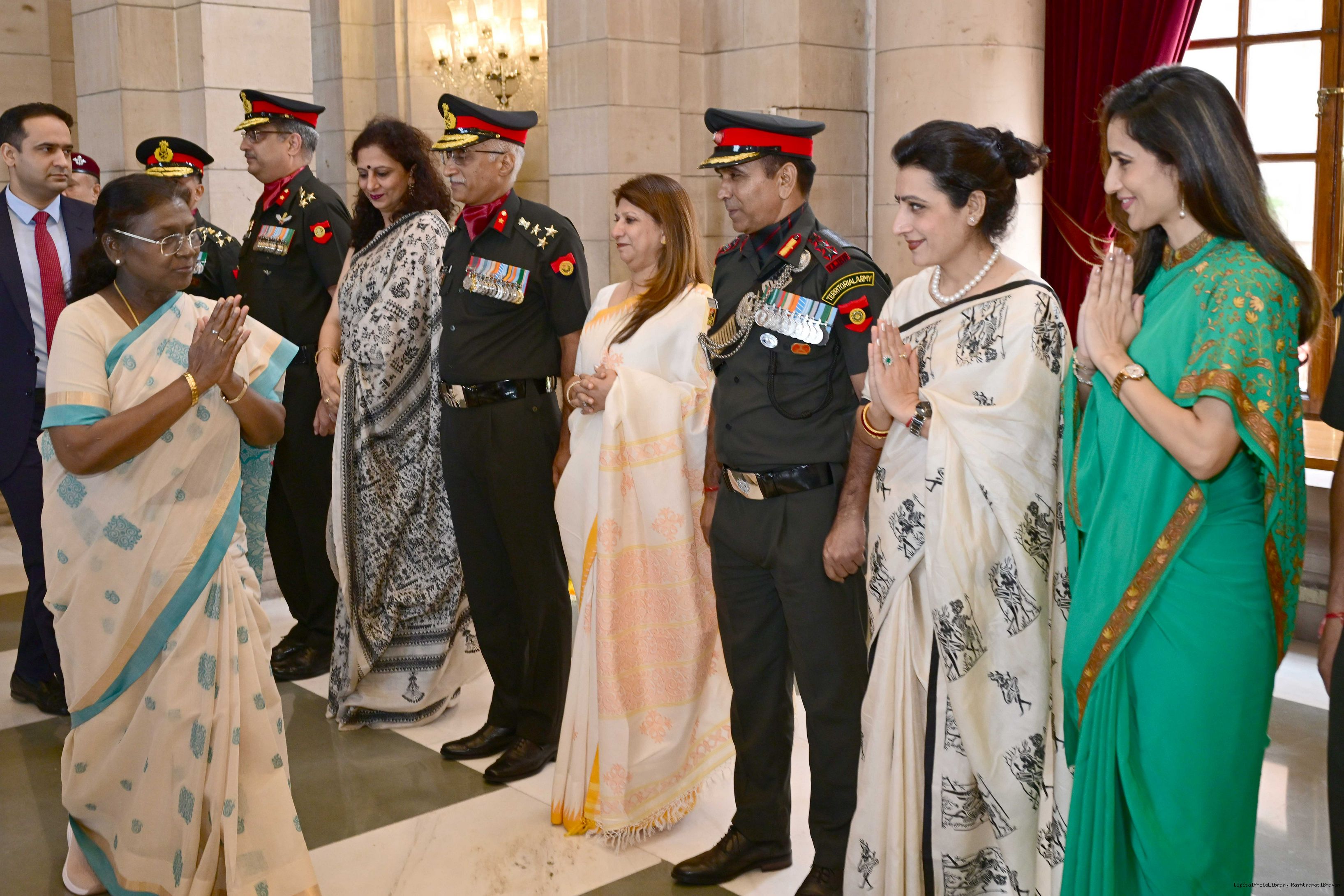 | Caption: | The President of India, Smt. Droupadi Murmu interacted and met Territorial Army (TA) Officers, JCOs and Ors and their families with selected civilian staff of the Territorial Army Directorate at Rashtrapati Bhavan on October 8, 2025. |