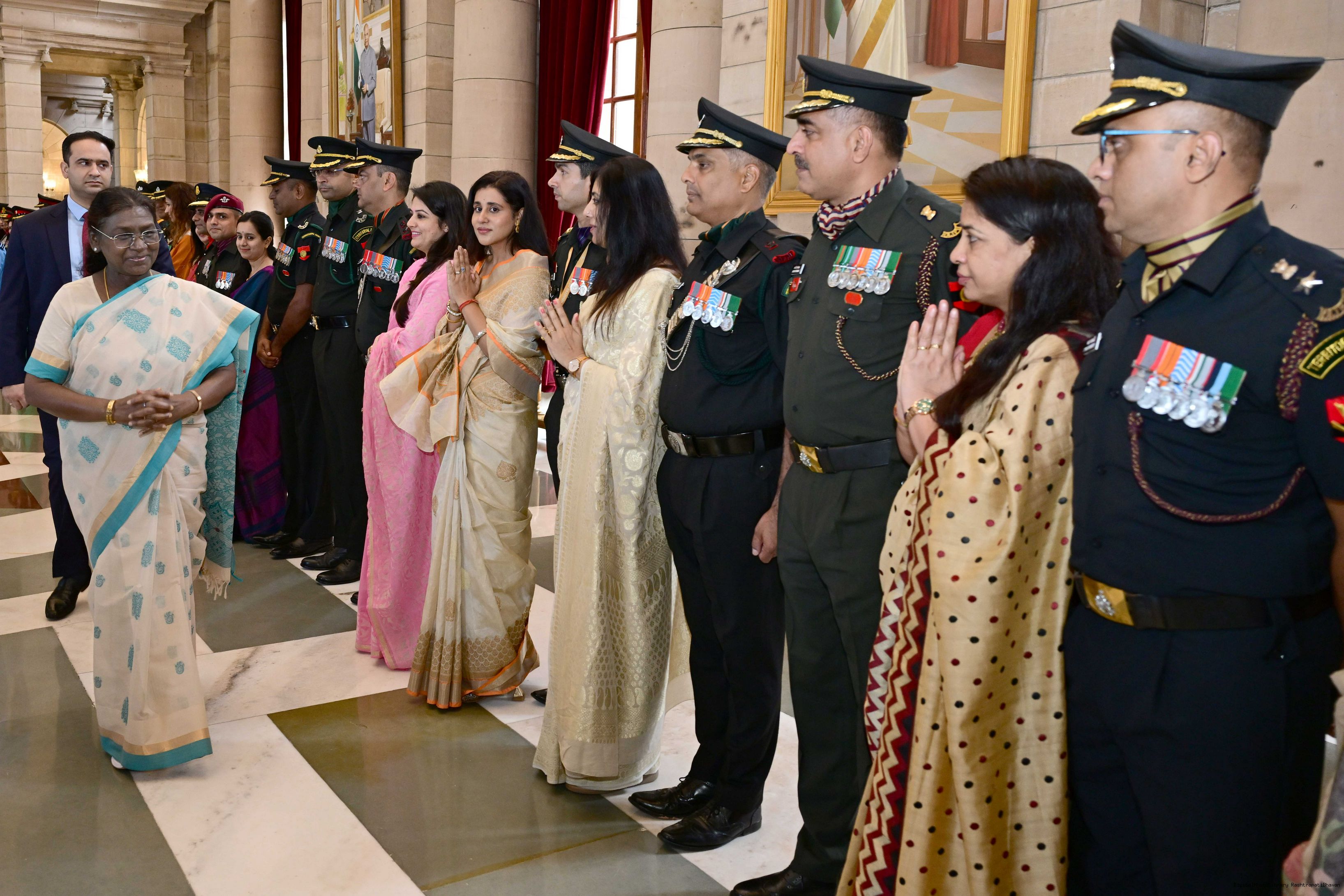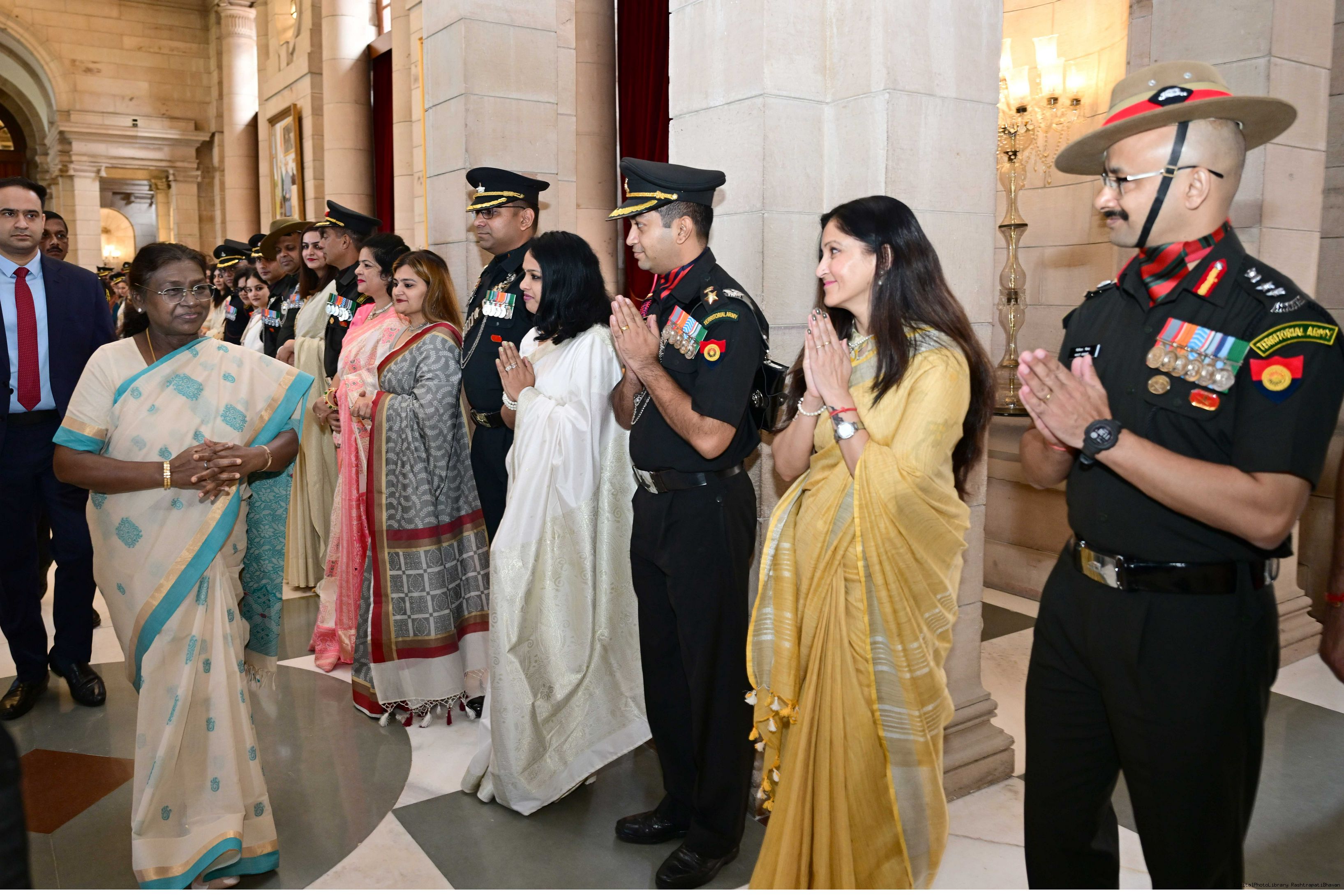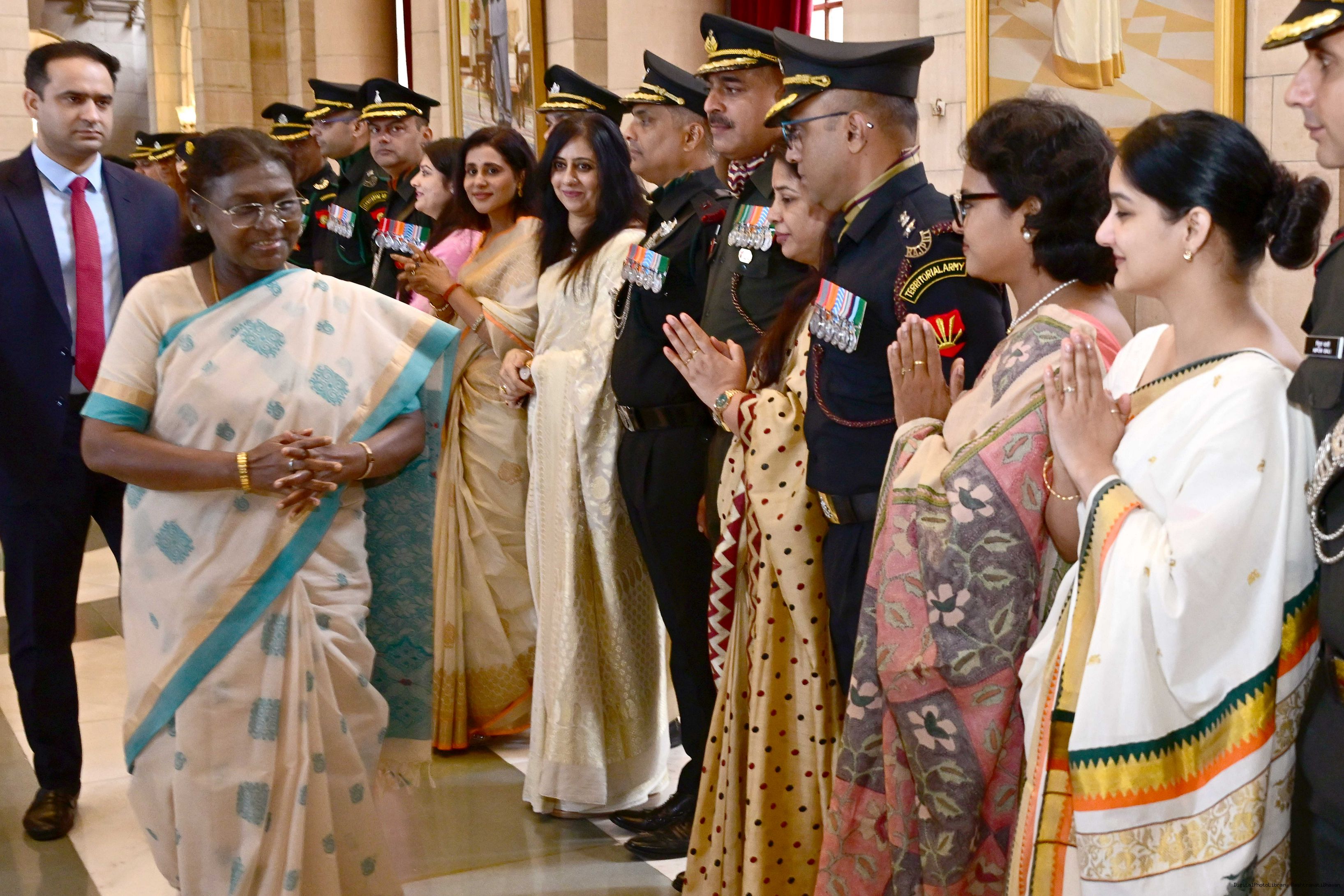 | Caption: | The President of India, Smt. Droupadi Murmu interacted and met Territorial Army (TA) Officers, JCOs and Ors and their families with selected civilian staff of the Territorial Army Directorate at Rashtrapati Bhavan on October 8, 2025. |