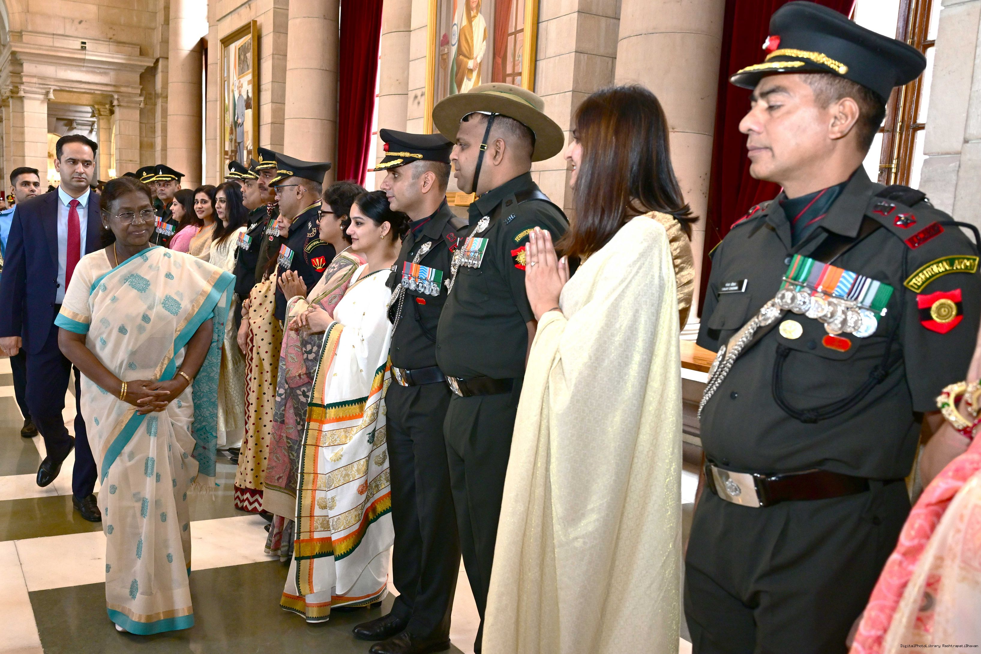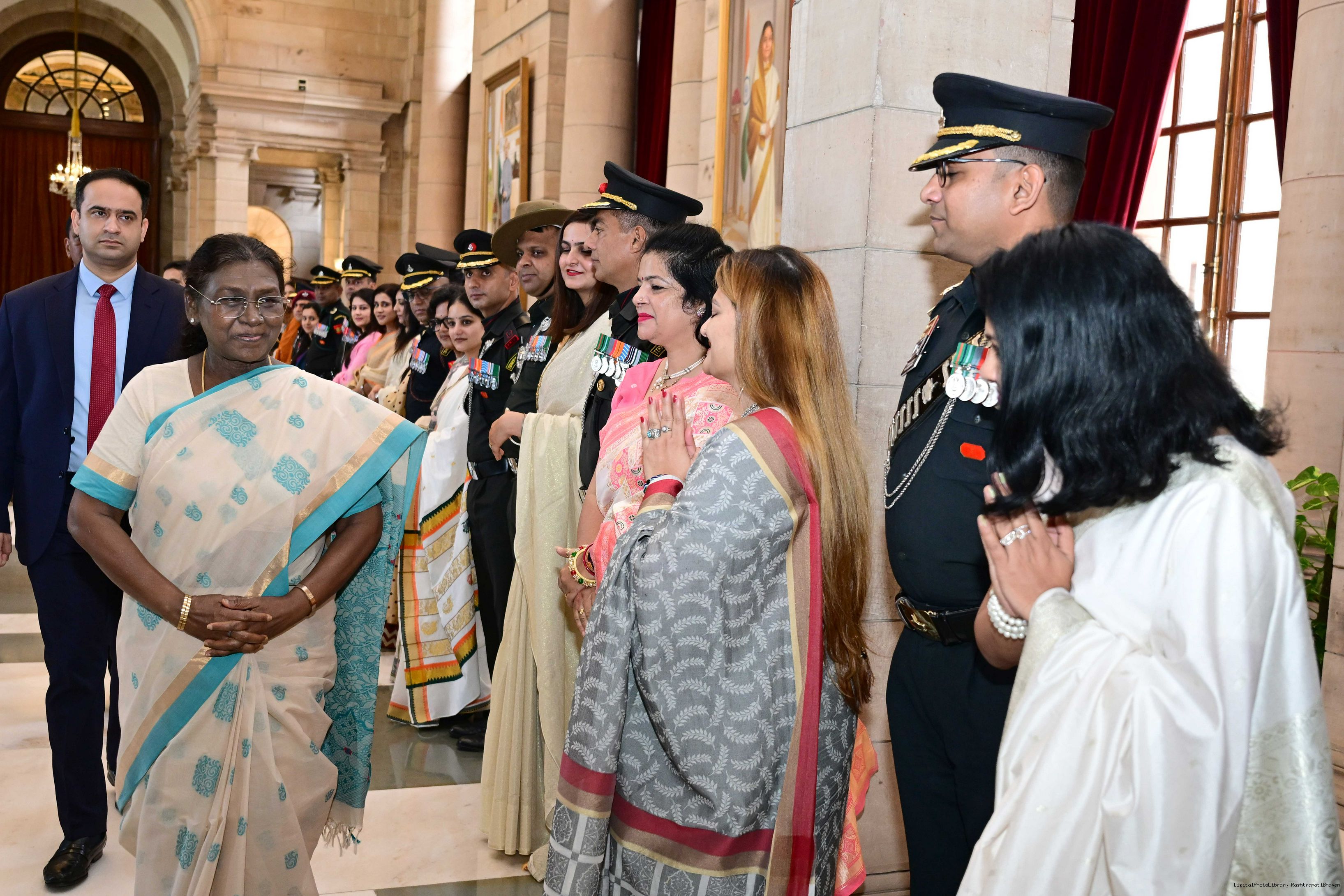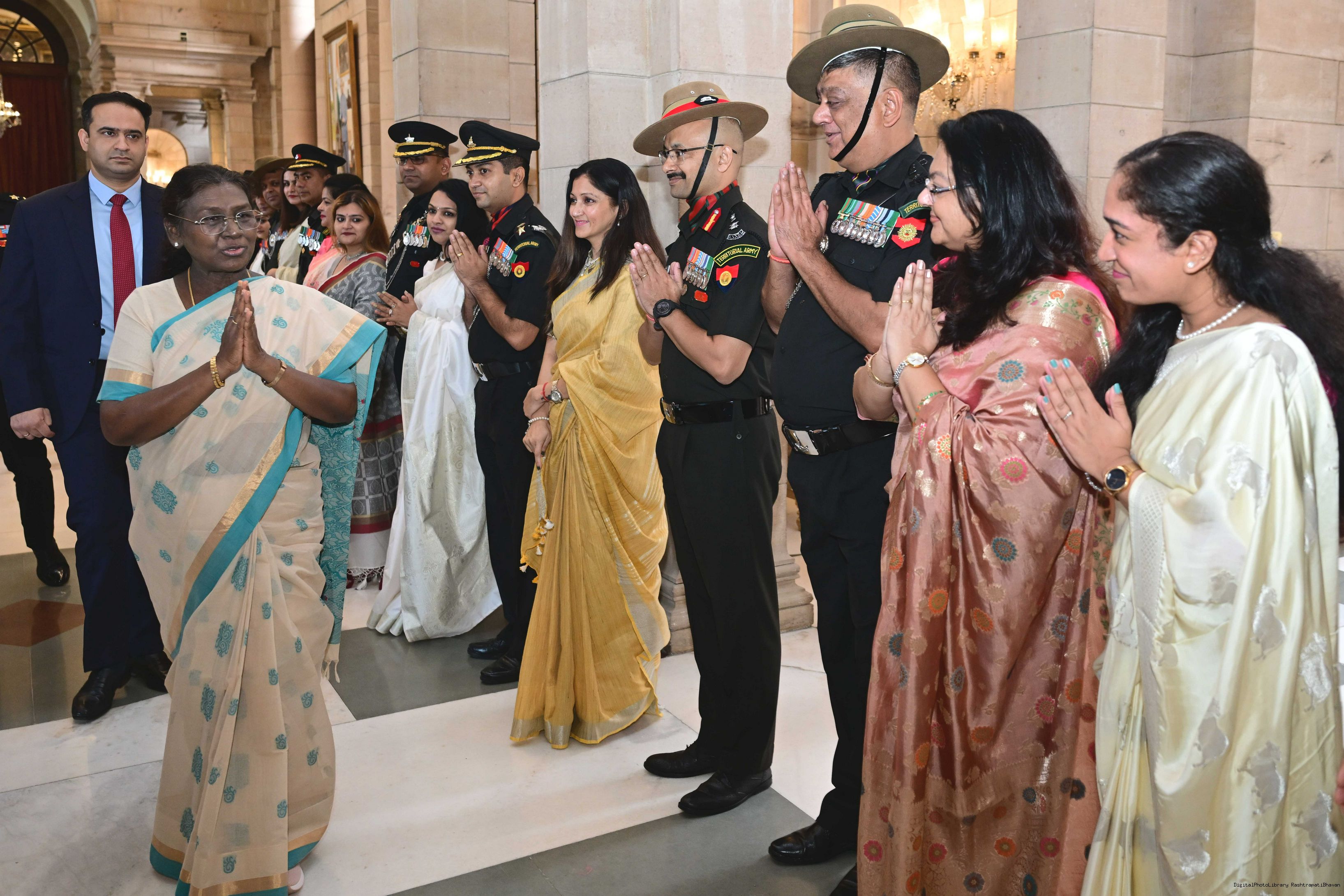 | Caption: | The President of India, Smt. Droupadi Murmu interacted and met Territorial Army (TA) Officers, JCOs and Ors and their families with selected civilian staff of the Territorial Army Directorate at Rashtrapati Bhavan on October 8, 2025. |