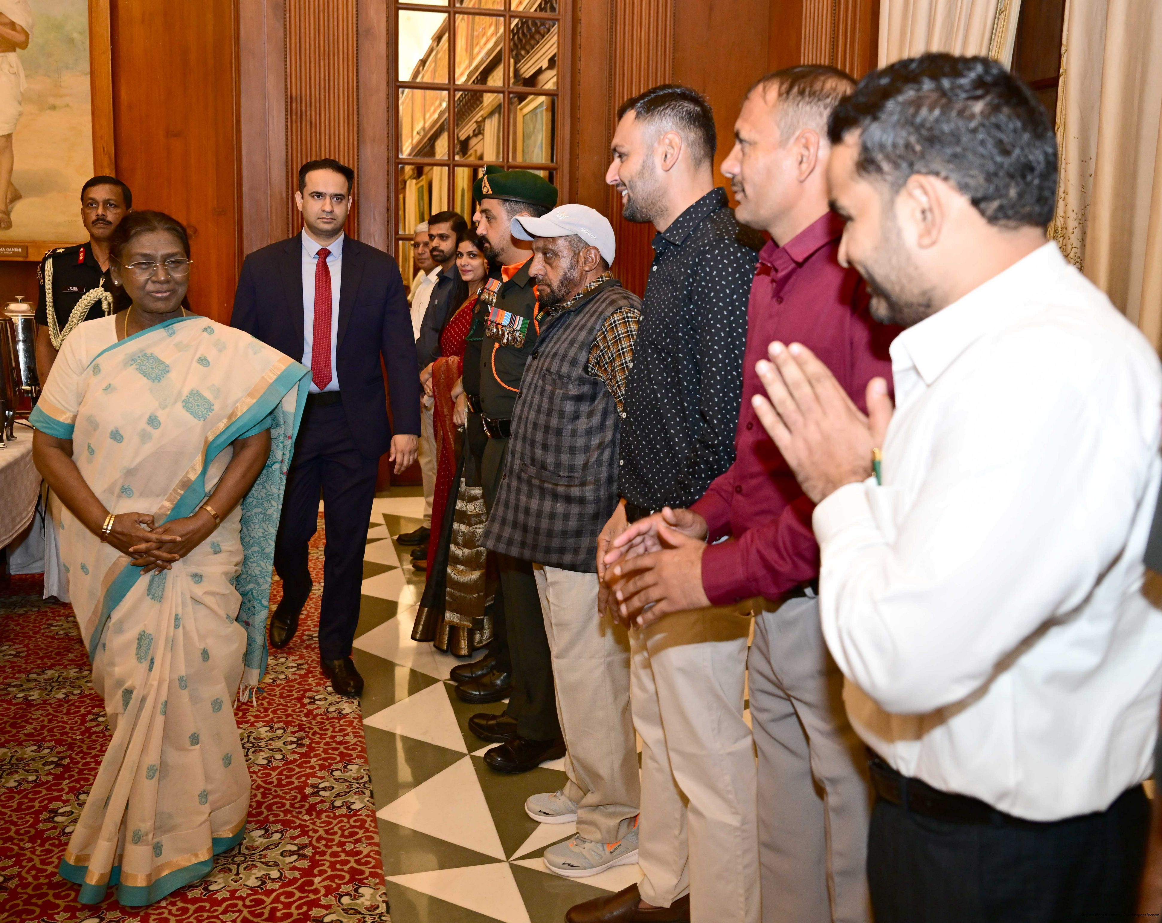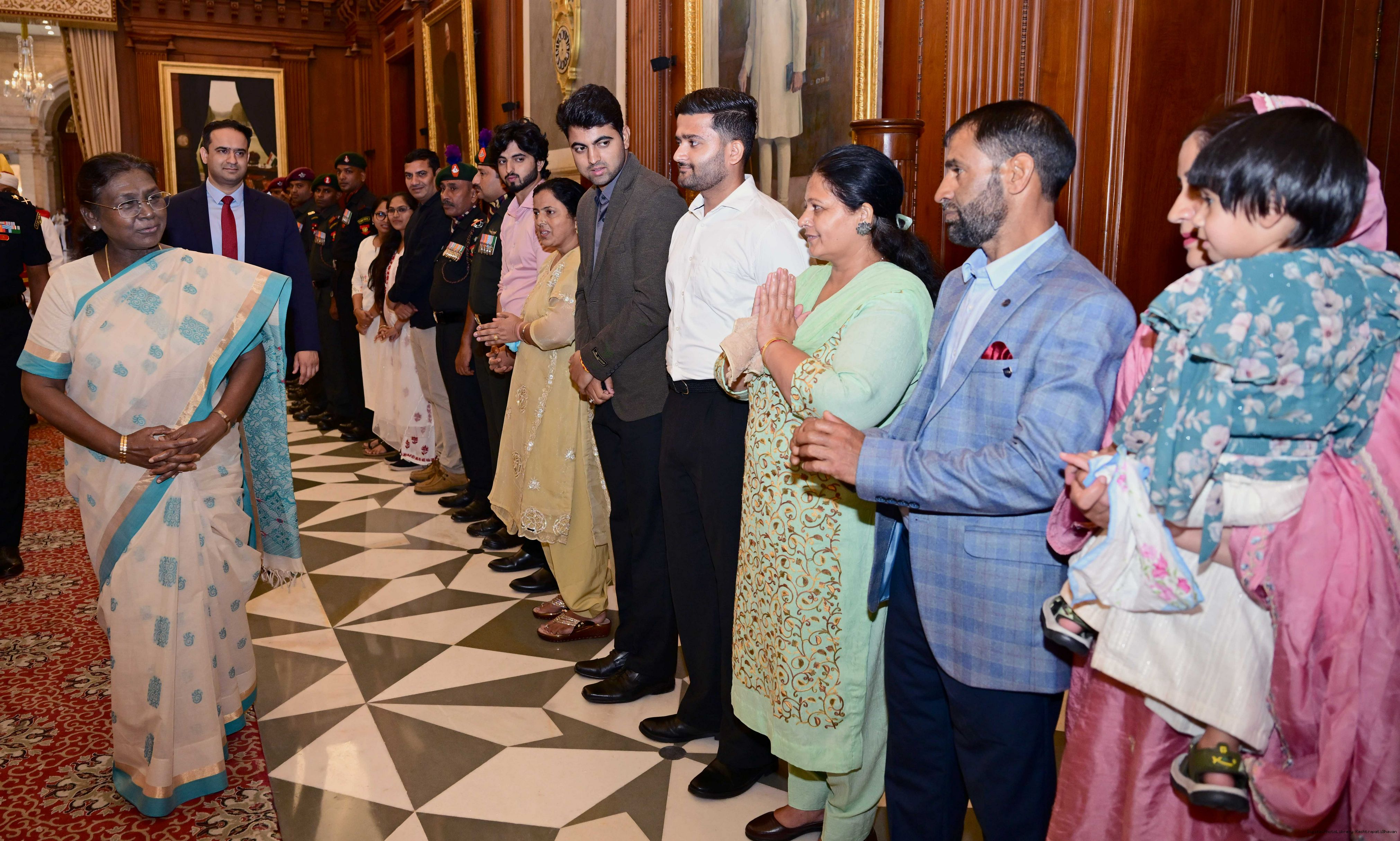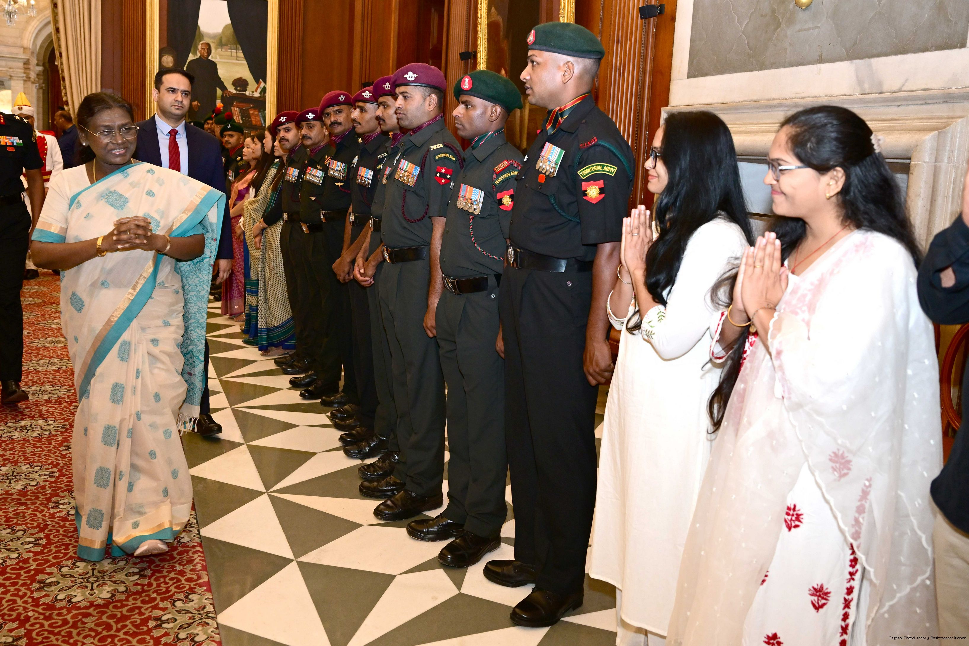 | Caption: | The President of India, Smt. Droupadi Murmu interacted and met Territorial Army (TA) Officers, JCOs and Ors and their families with selected civilian staff of the Territorial Army Directorate at Rashtrapati Bhavan on October 8, 2025. |