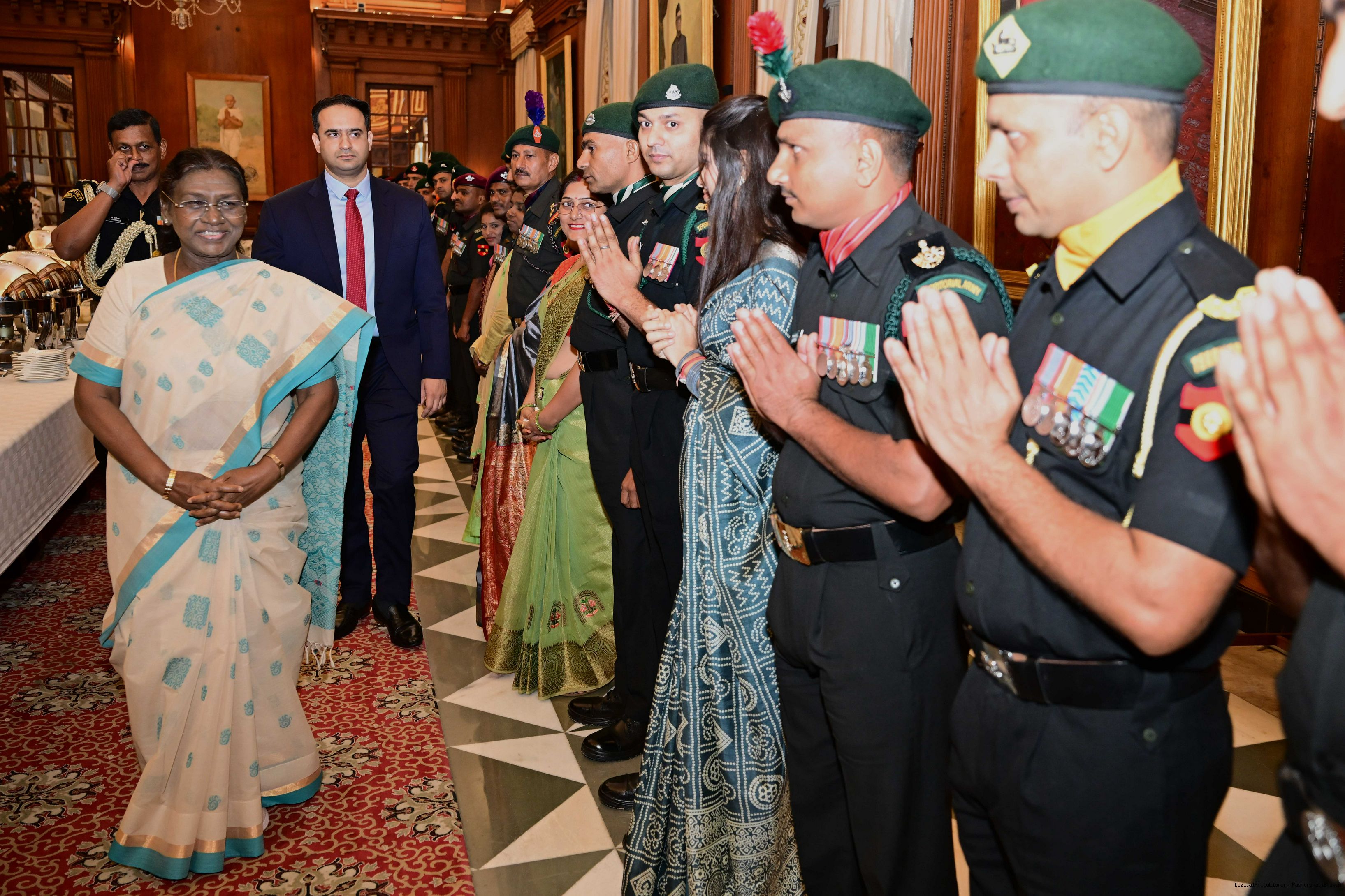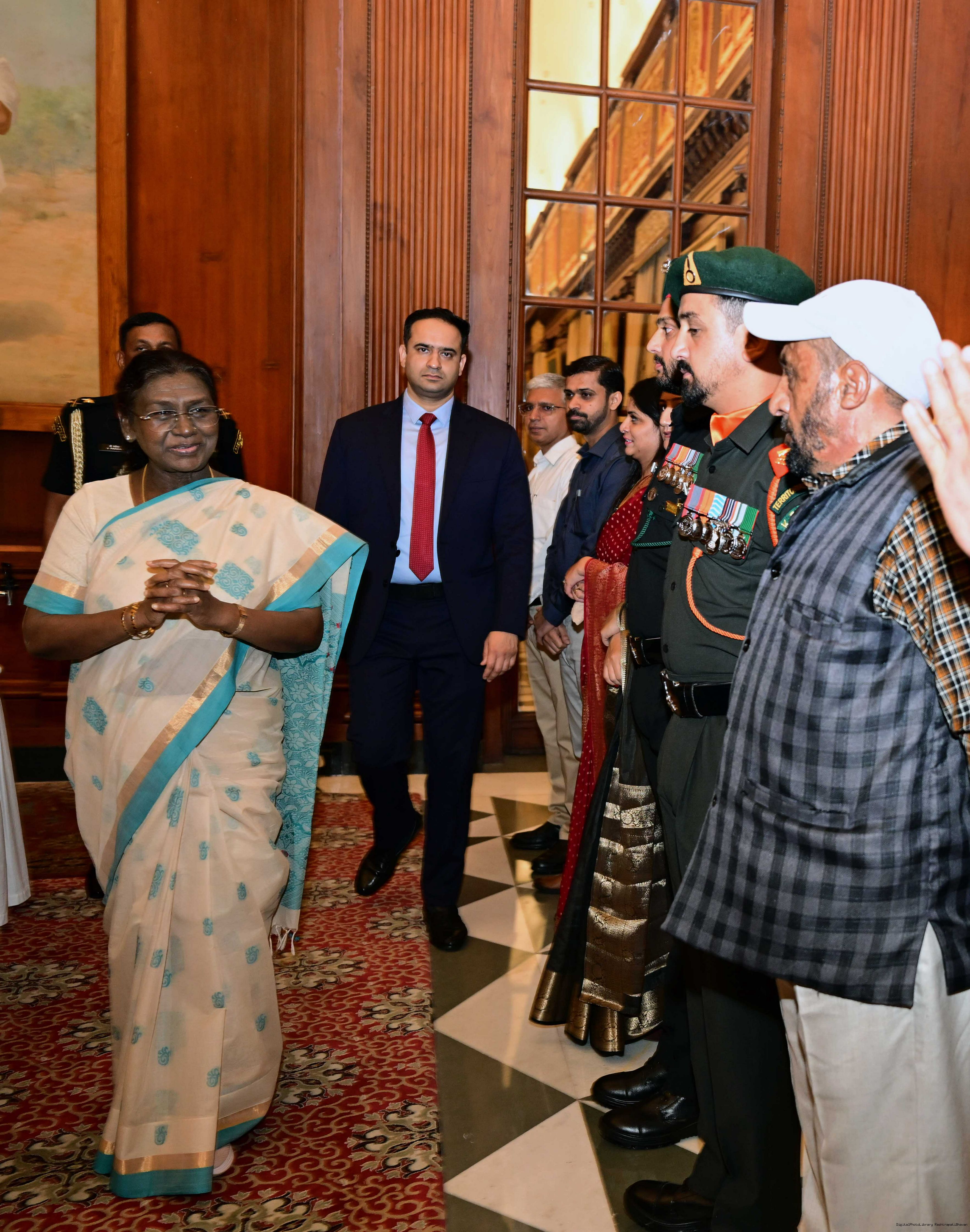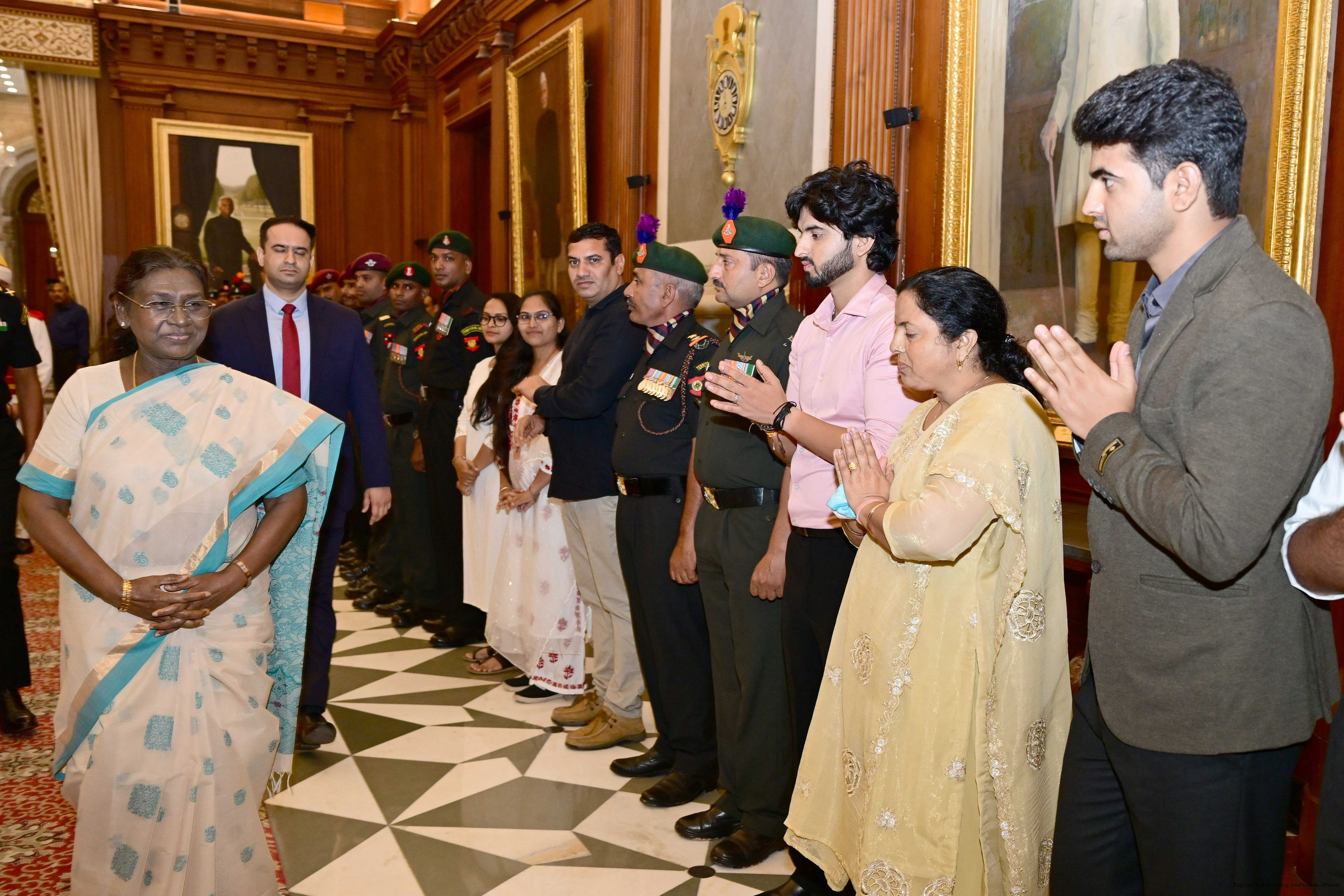 | Caption: | The President of India, Smt. Droupadi Murmu interacted and met Territorial Army (TA) Officers, JCOs and Ors and their families with selected civilian staff of the Territorial Army Directorate at Rashtrapati Bhavan on October 8, 2025. |