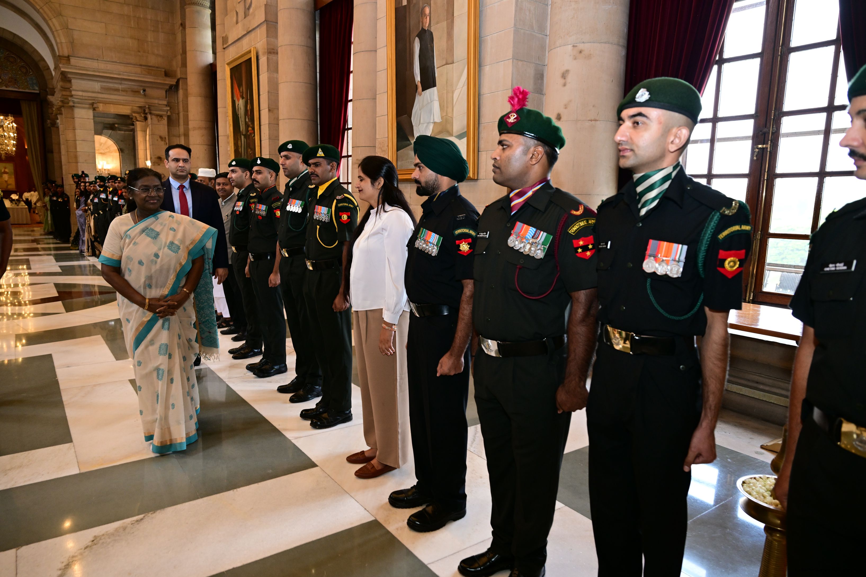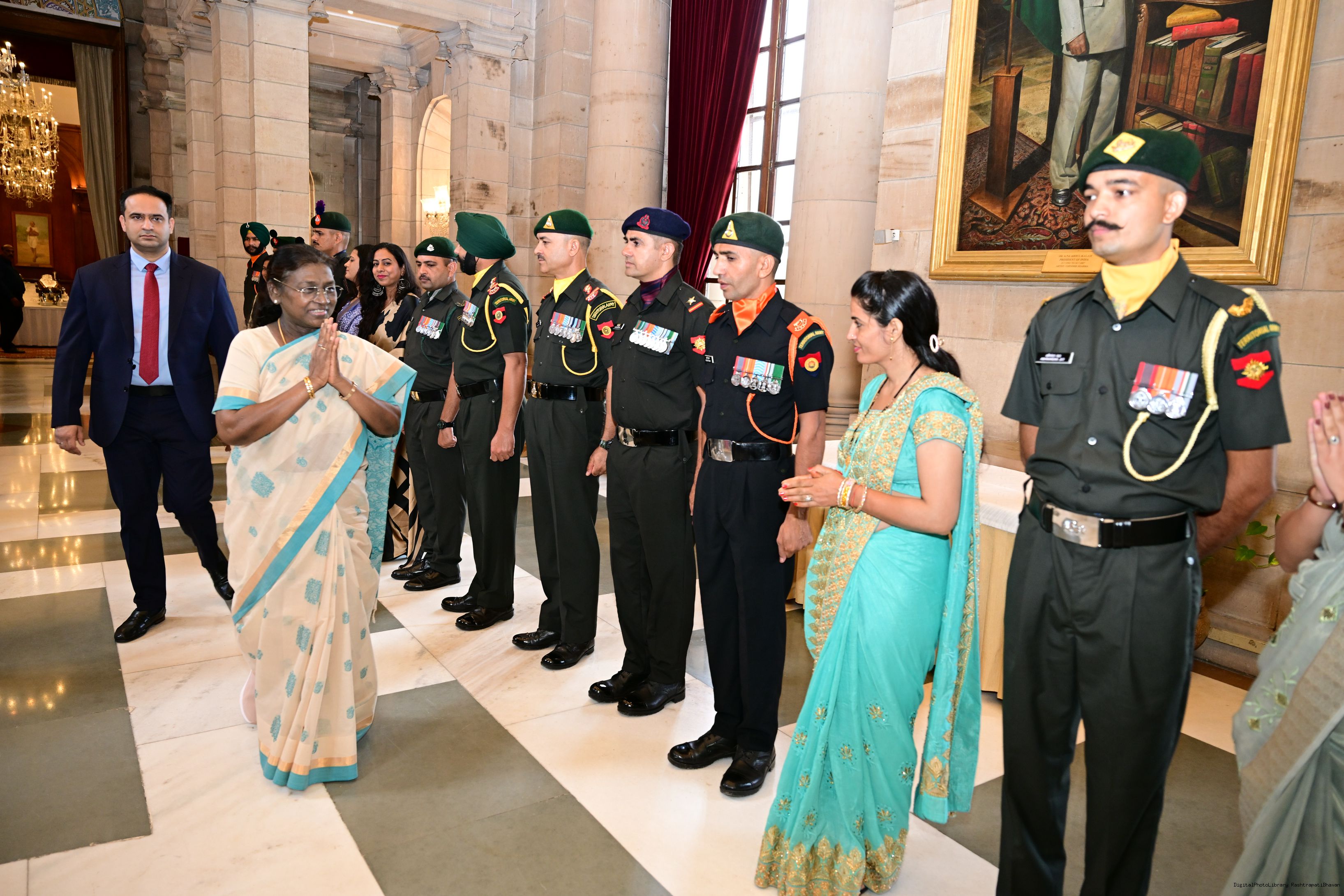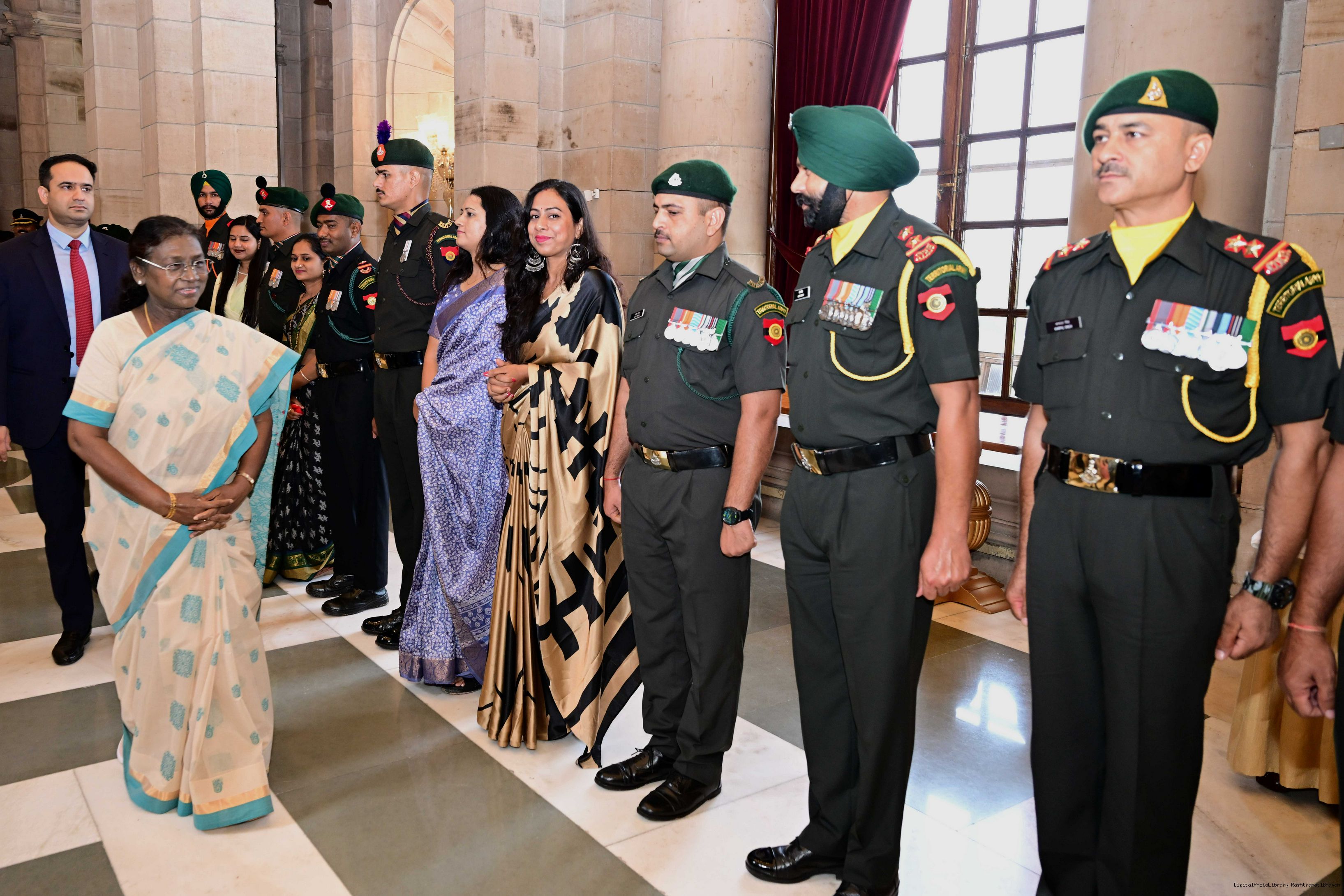 | Caption: | The President of India, Smt. Droupadi Murmu interacted and met Territorial Army (TA) Officers, JCOs and Ors and their families with selected civilian staff of the Territorial Army Directorate at Rashtrapati Bhavan on October 8, 2025. |