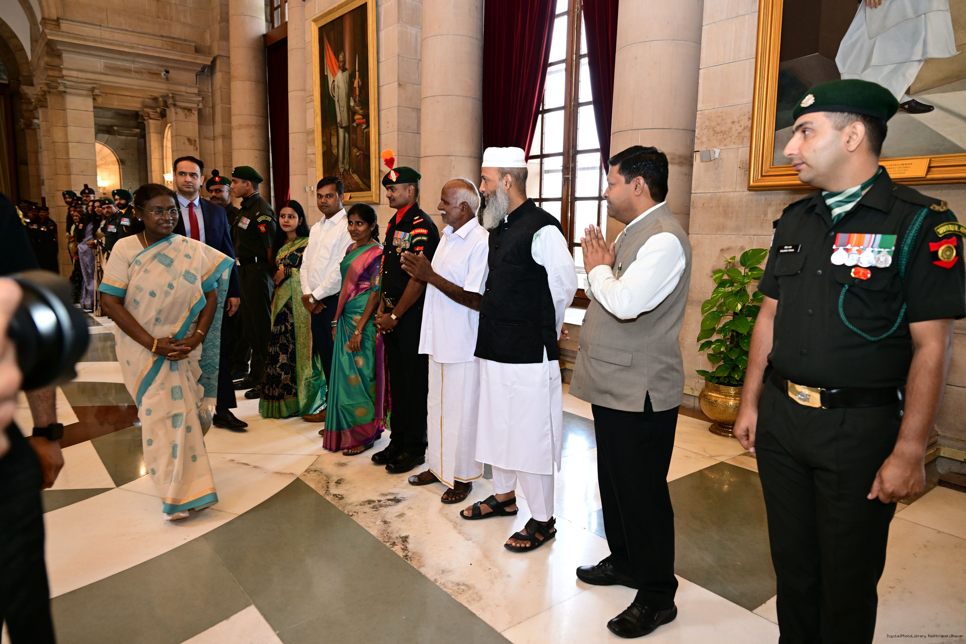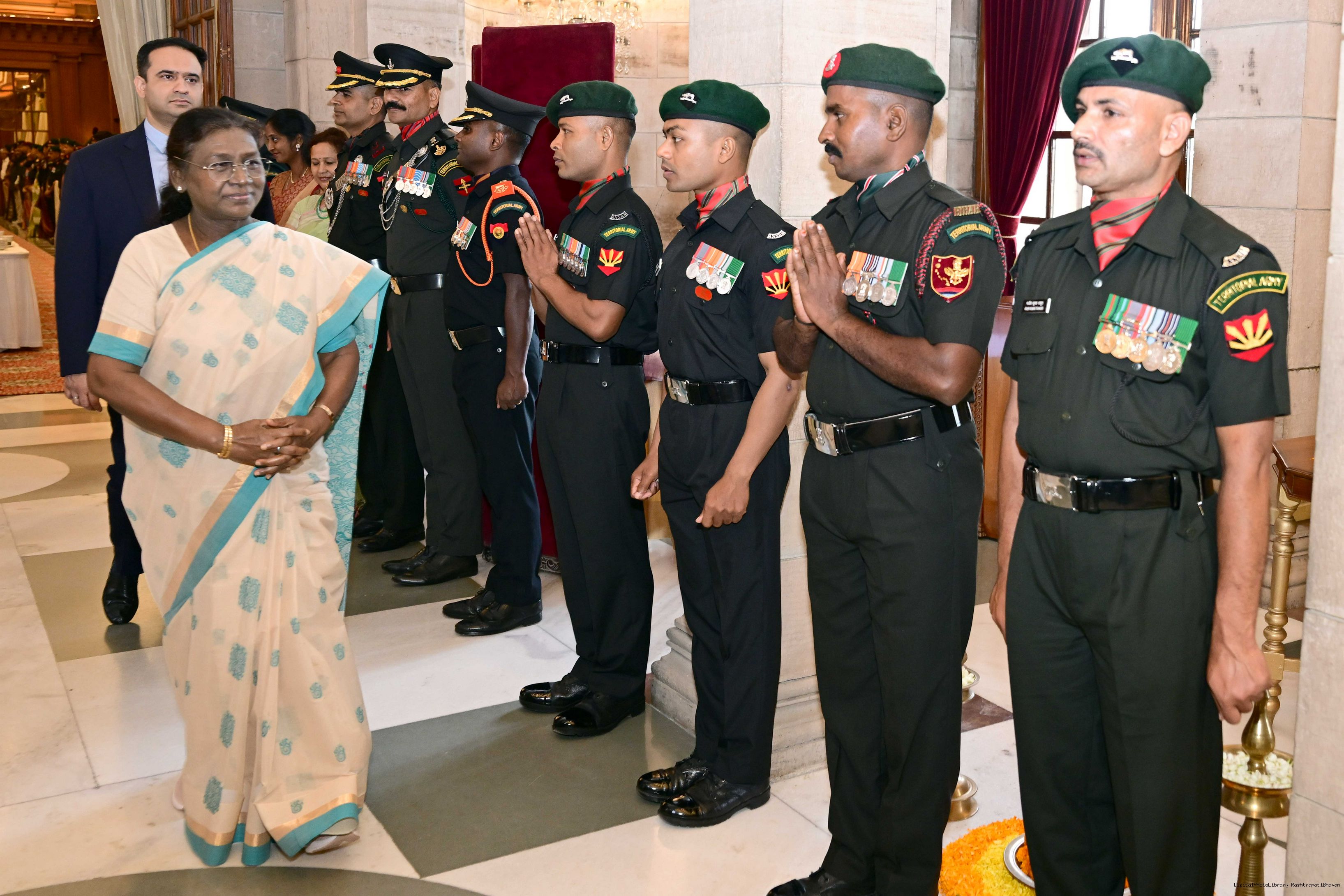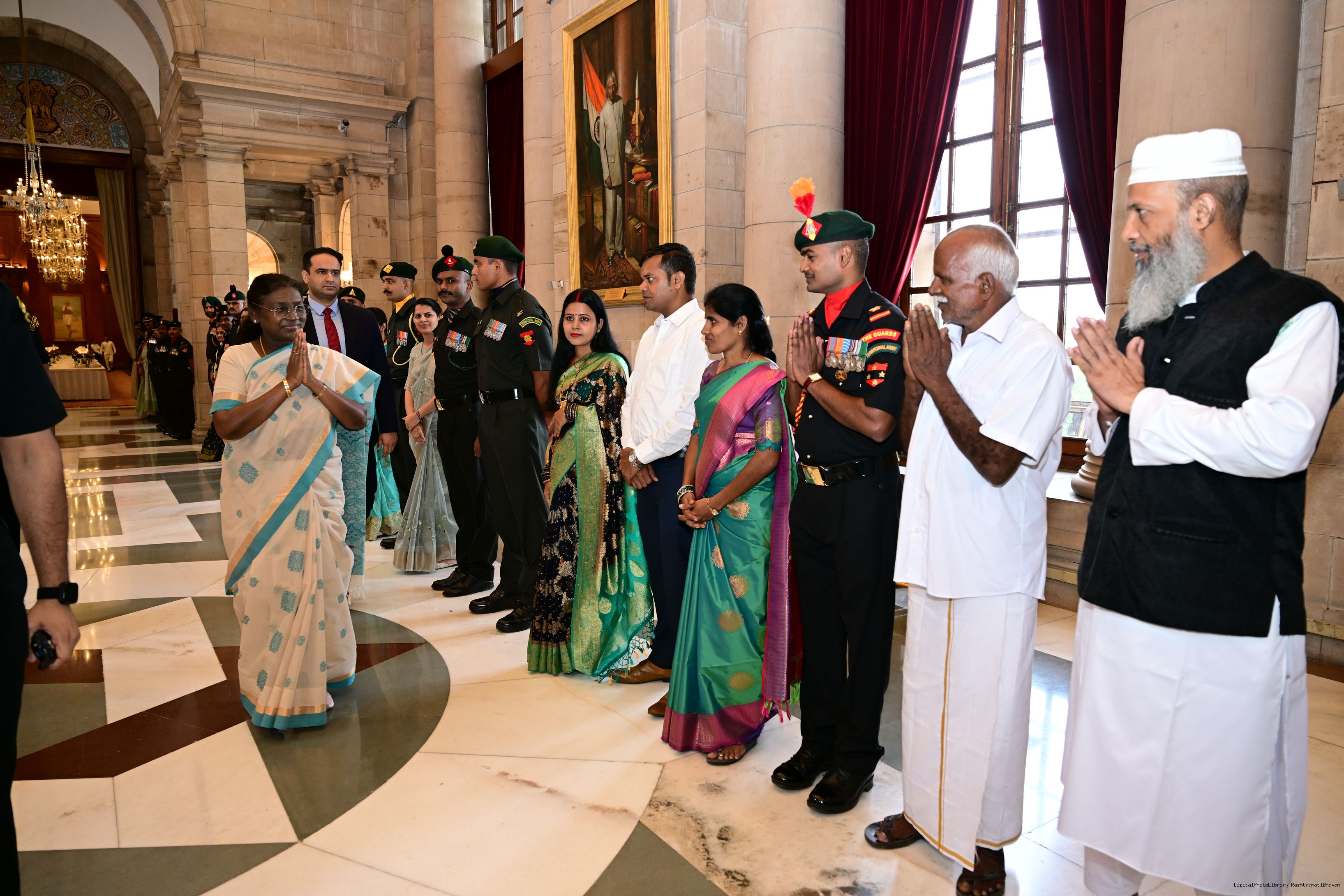 | Caption: | The President of India, Smt. Droupadi Murmu interacted and met Territorial Army (TA) Officers, JCOs and Ors and their families with selected civilian staff of the Territorial Army Directorate at Rashtrapati Bhavan on October 8, 2025. |