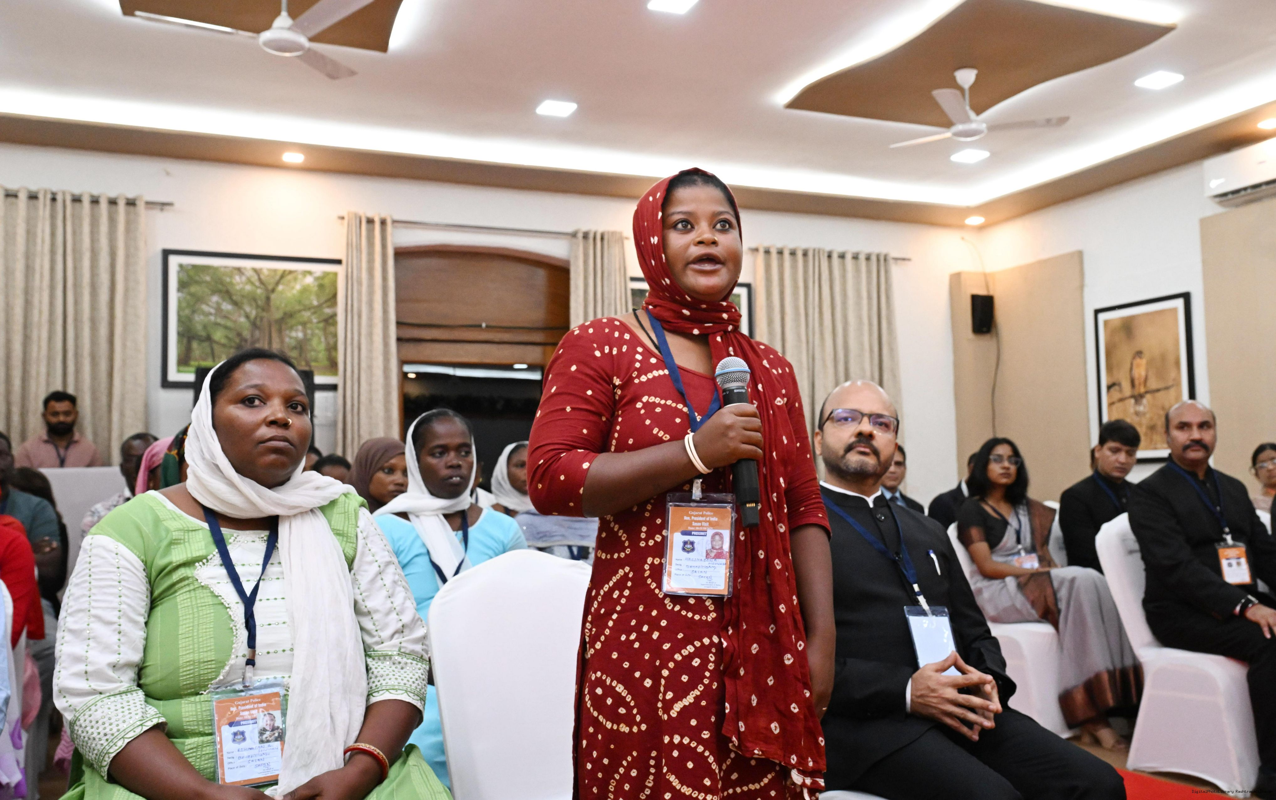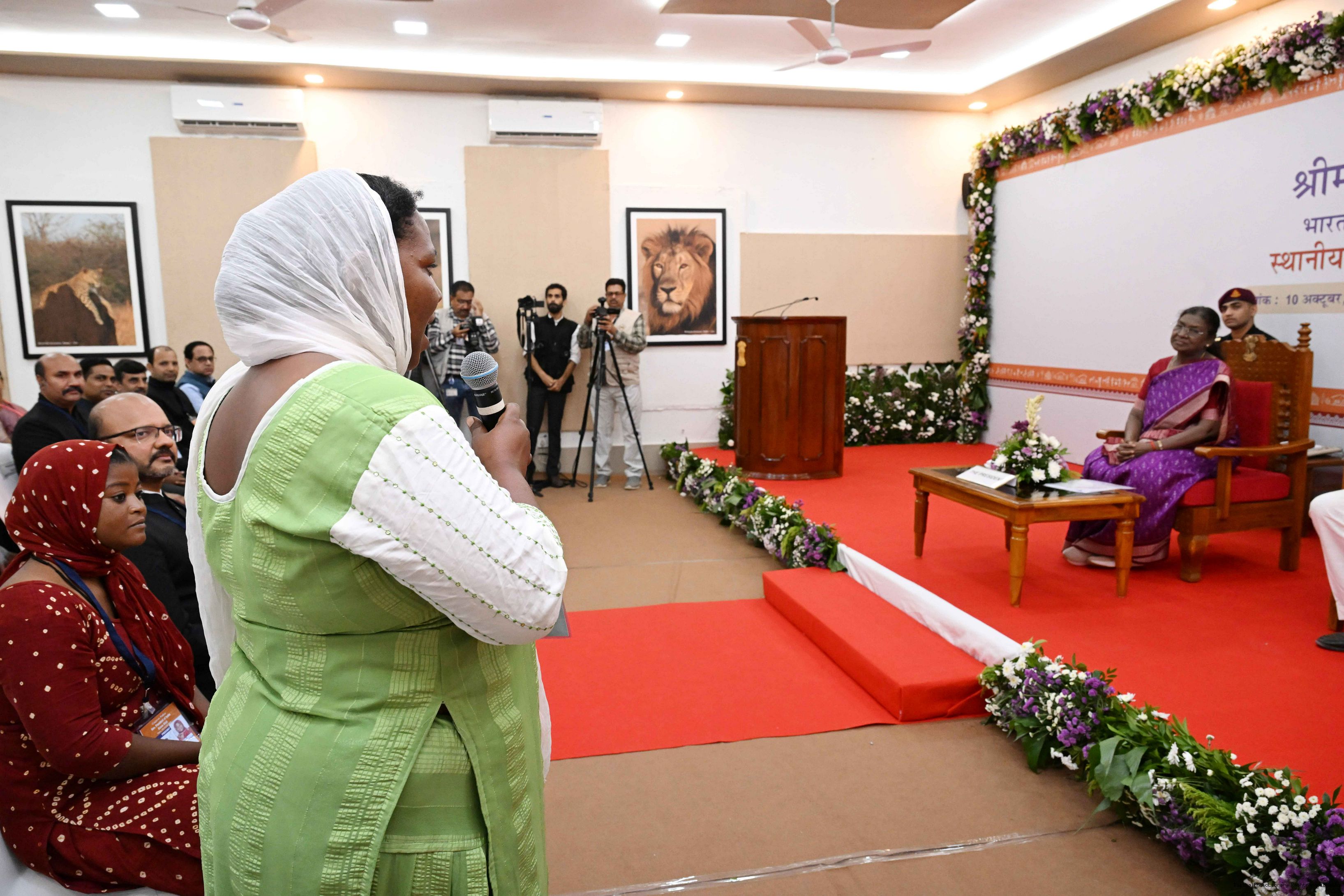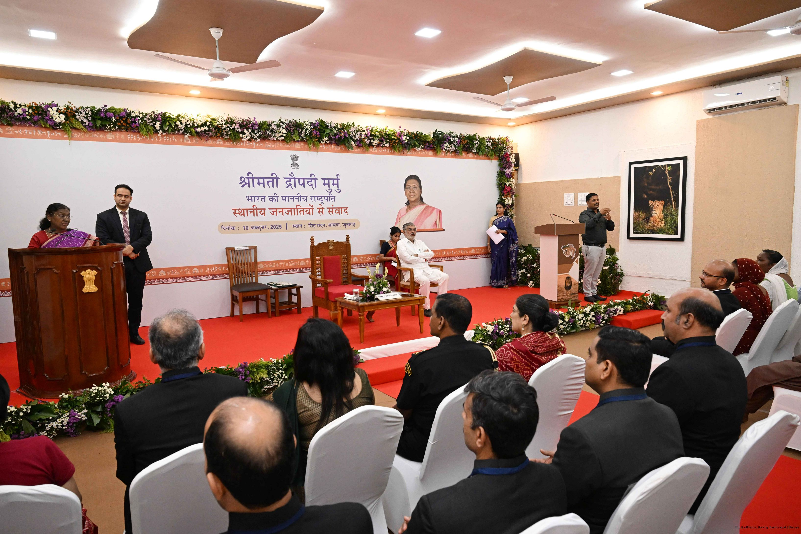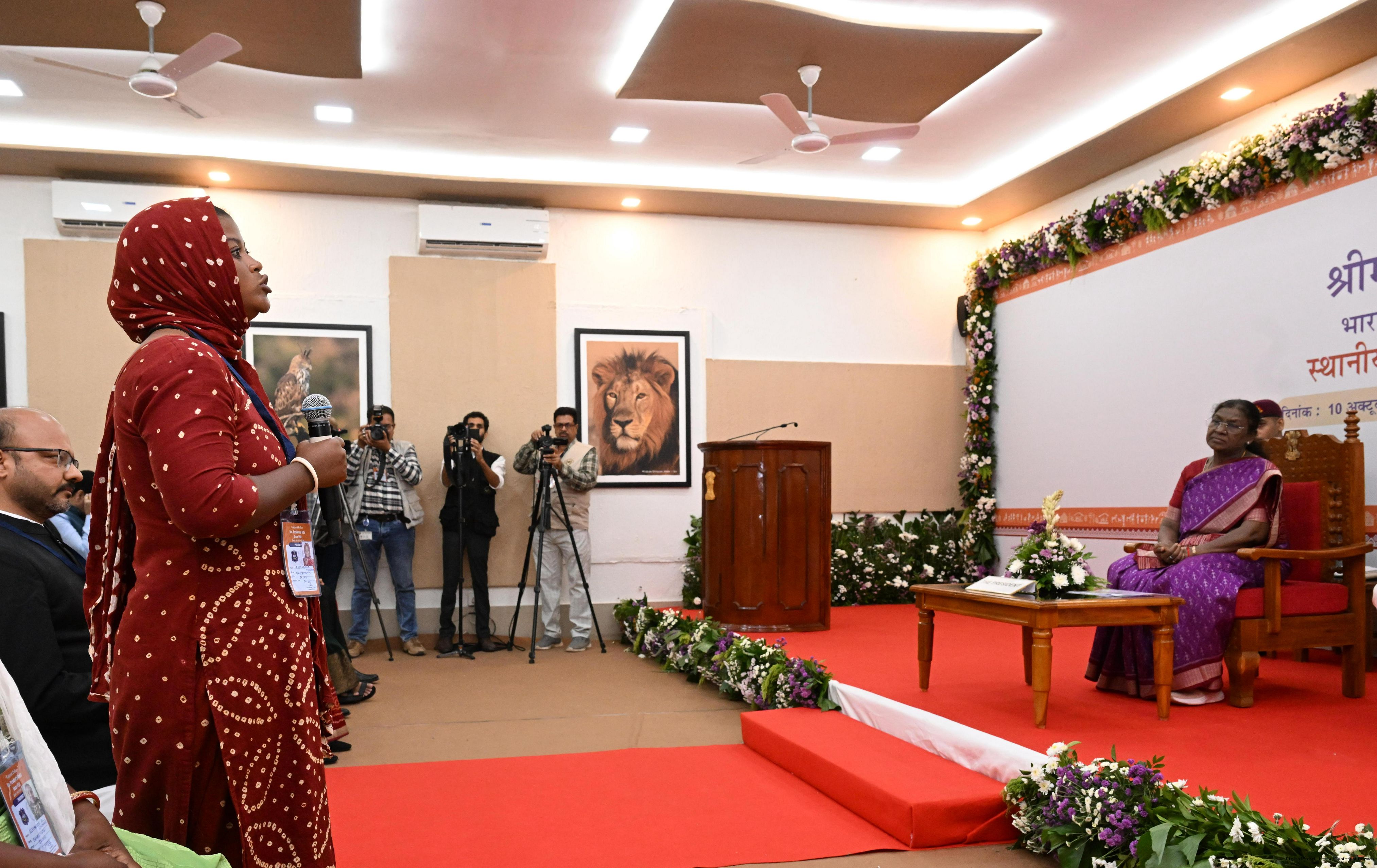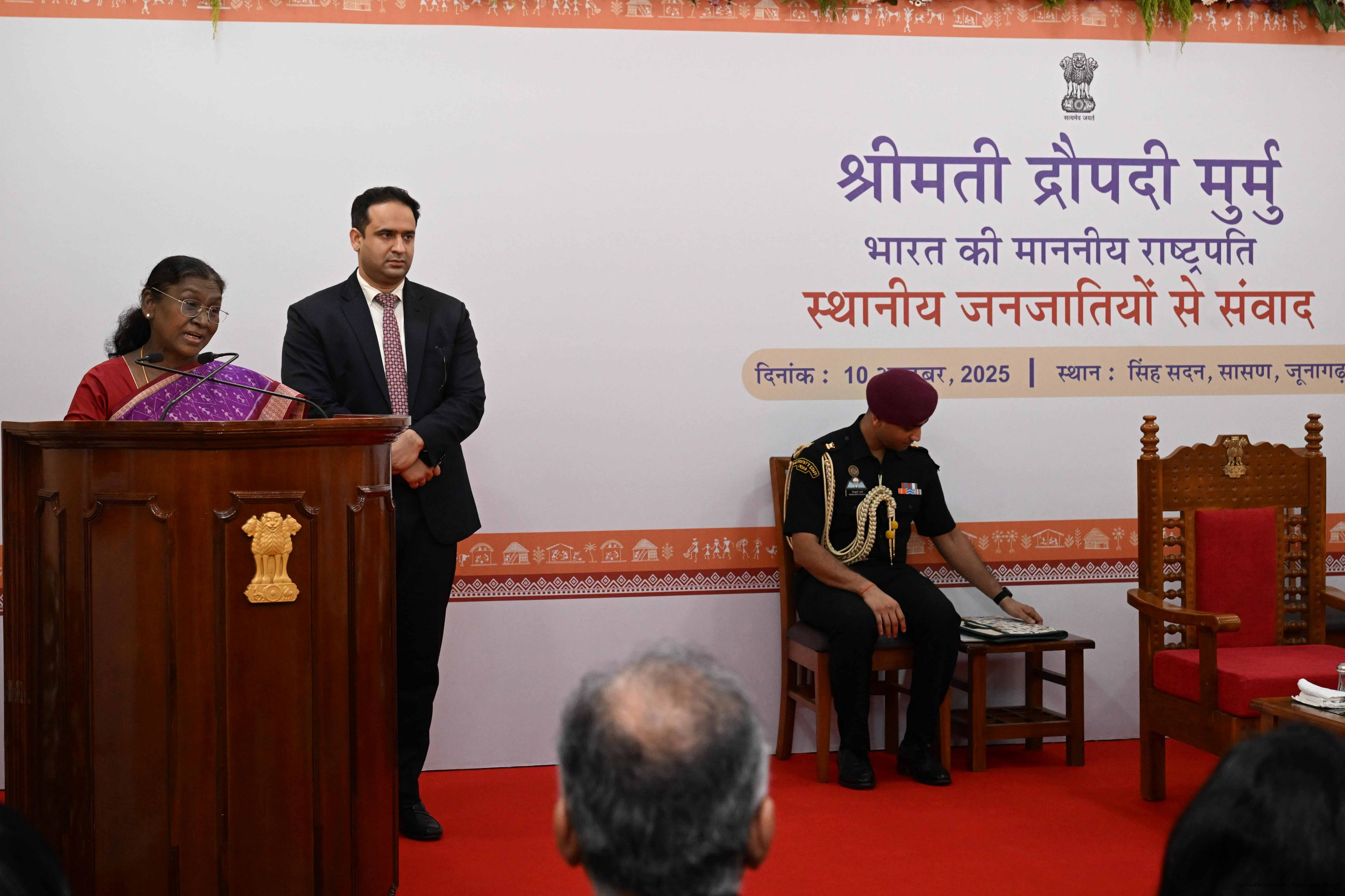 | Caption: | The President of India, Smt. Droupadi Murmu addresses the members of the local tribal community at Sasan Gir, Gujarat on October 10, 2025. |