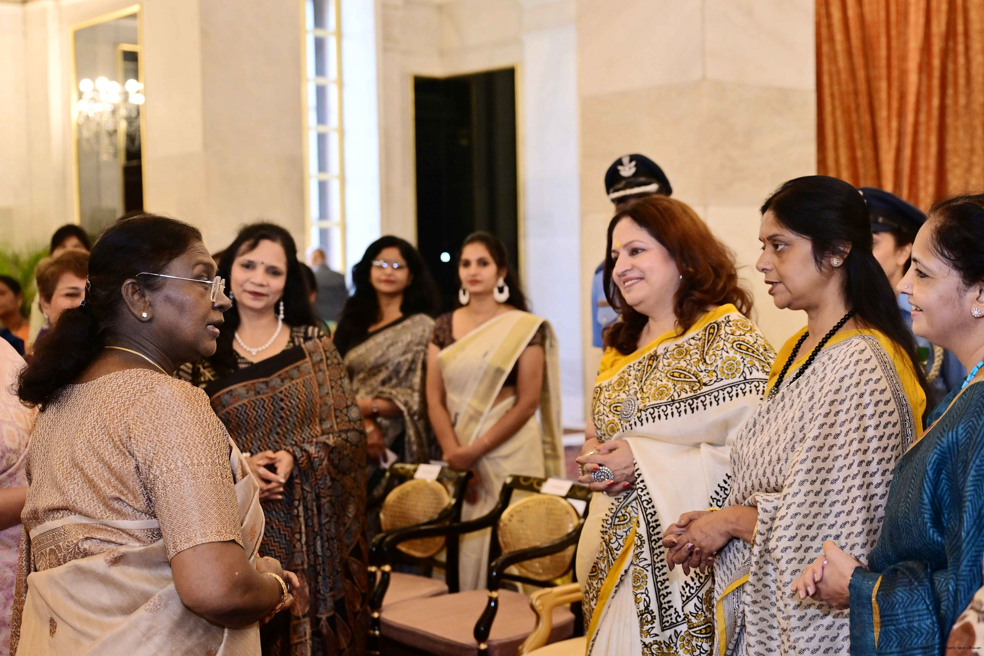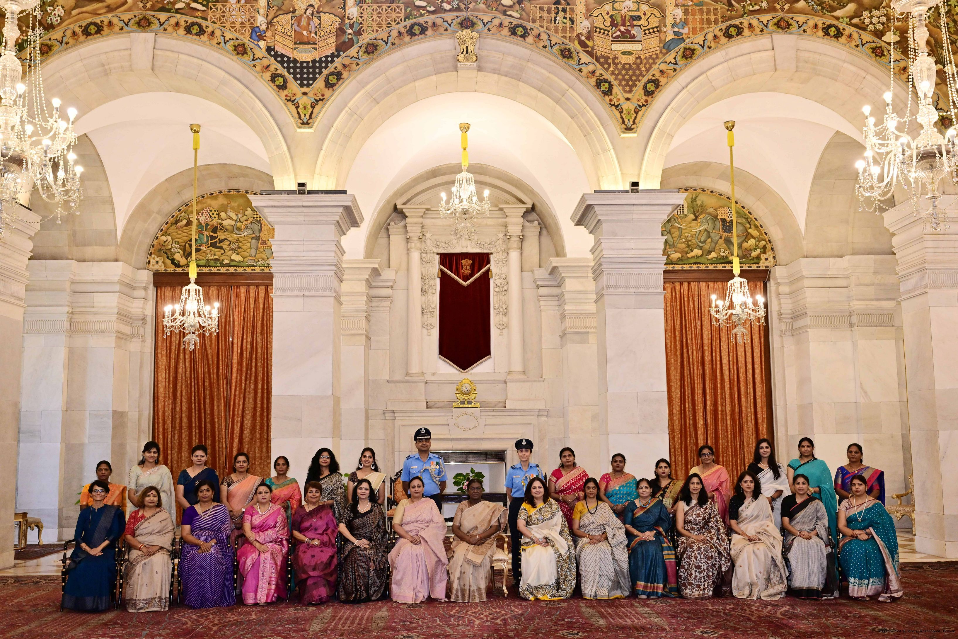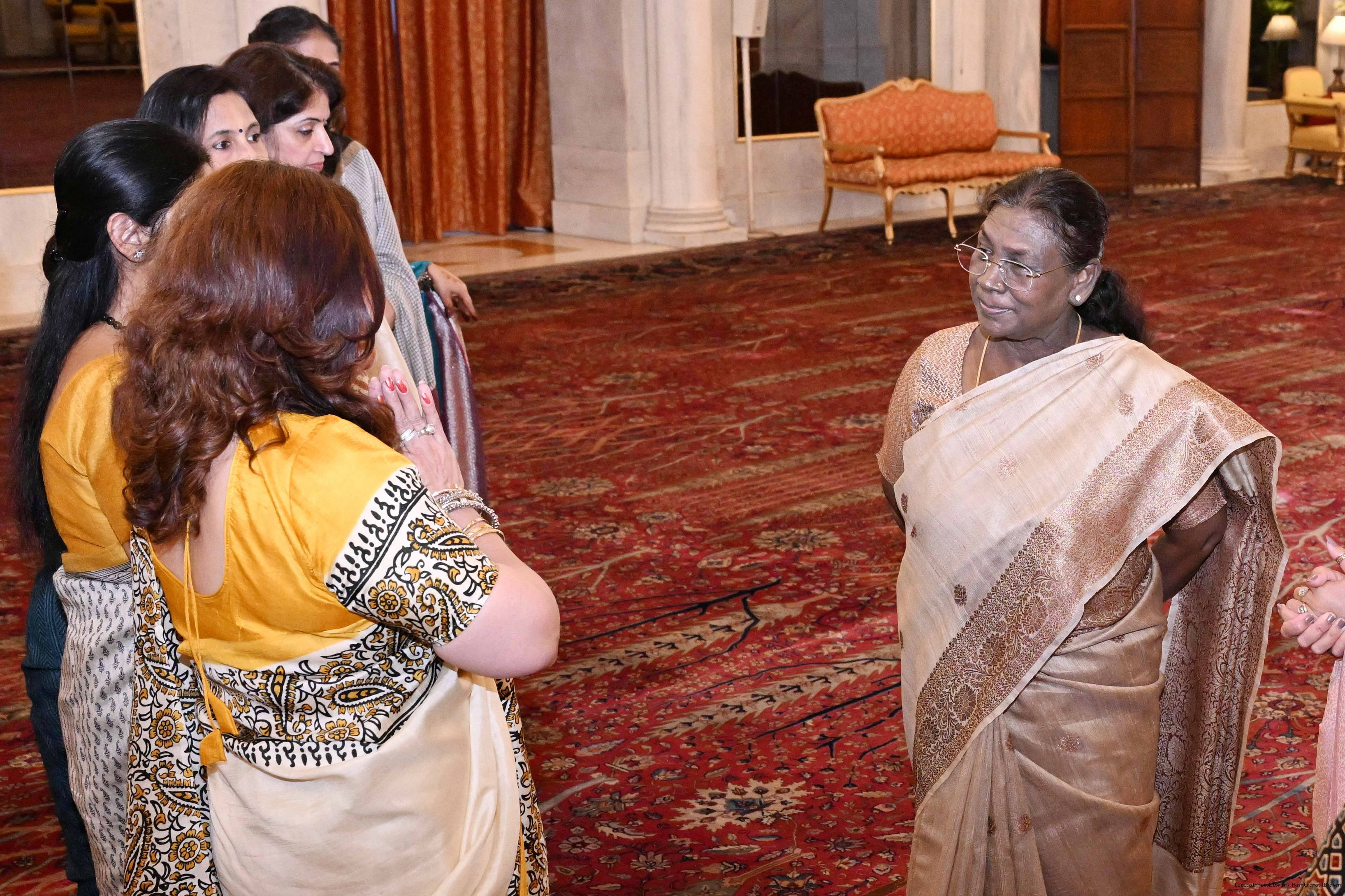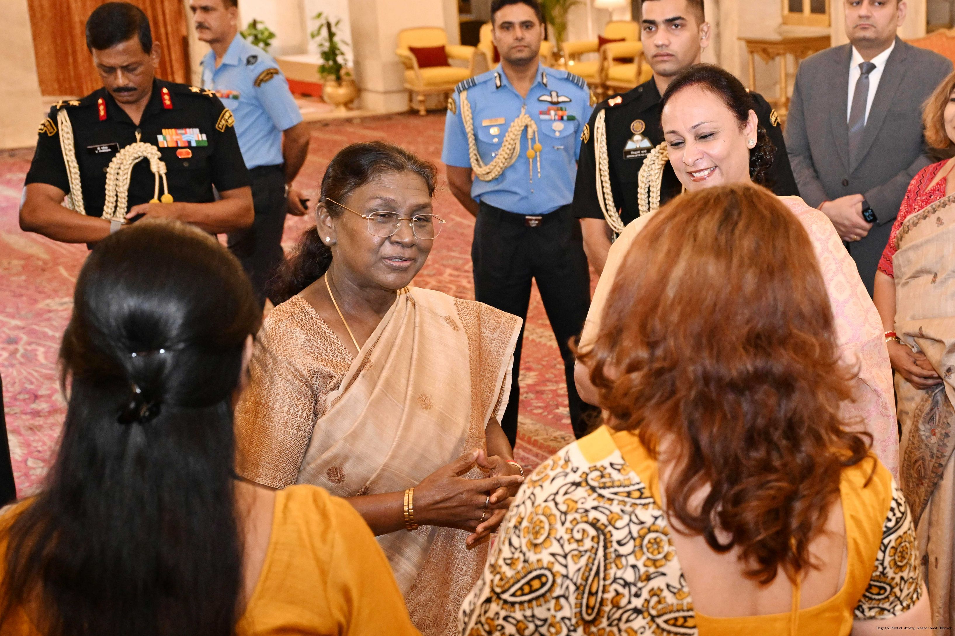 | Caption: | The President of India, Smt Droupadi Murmu interacted and posing a group photographs with 30 members of Air Force Families Welfare Association (AFFWA) at Rashtrapati Bhavan on October 13, 2025. |