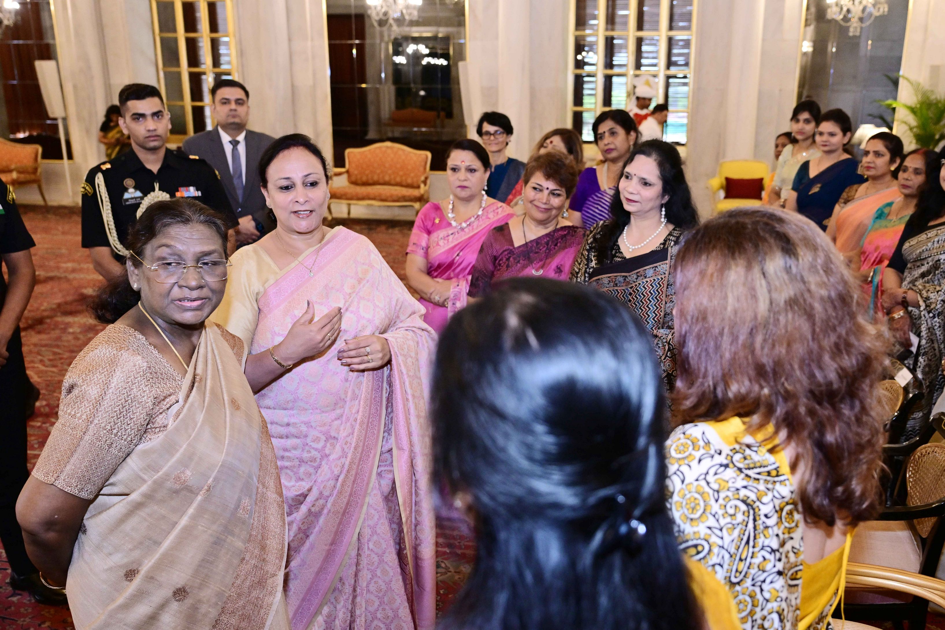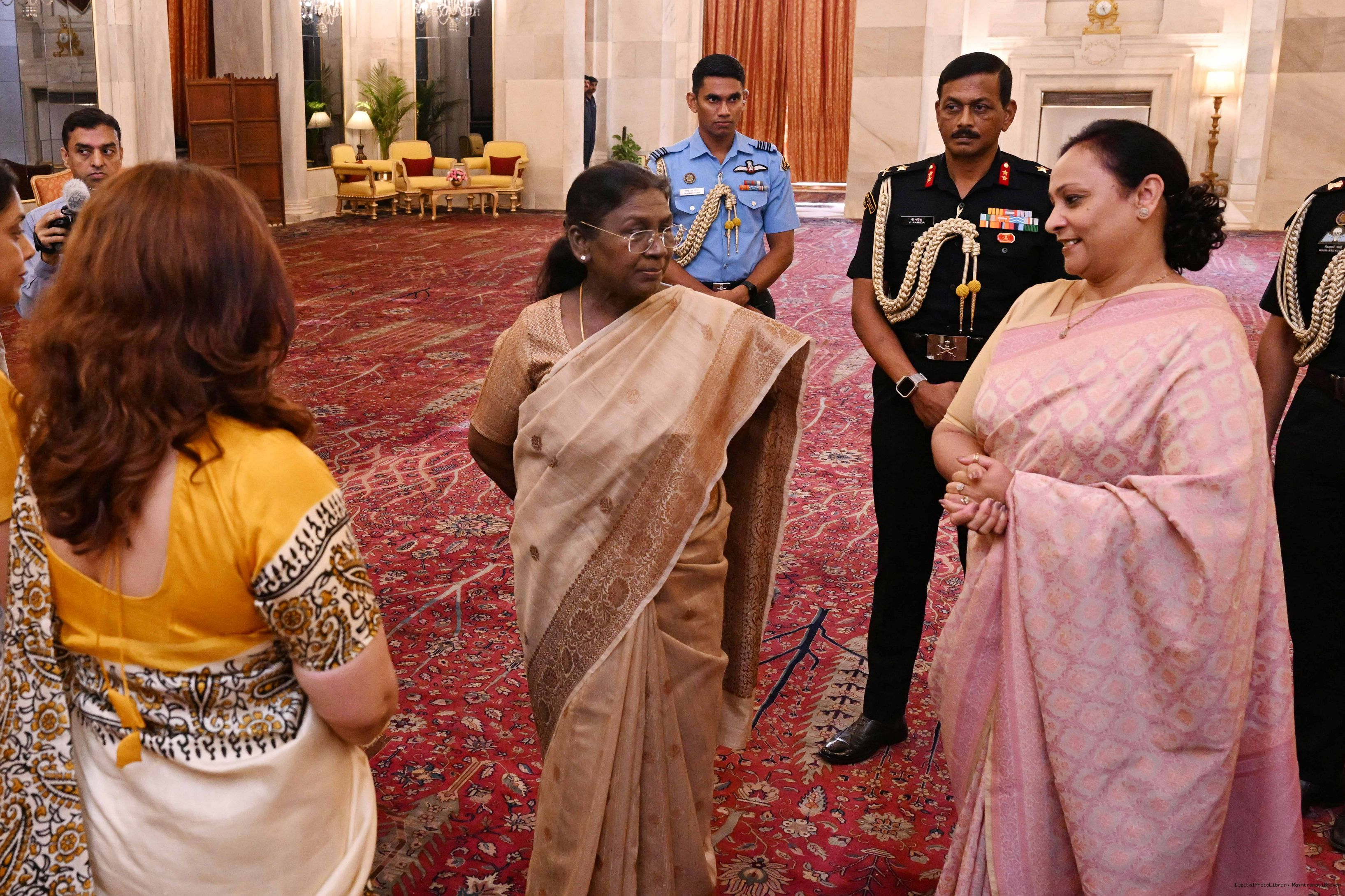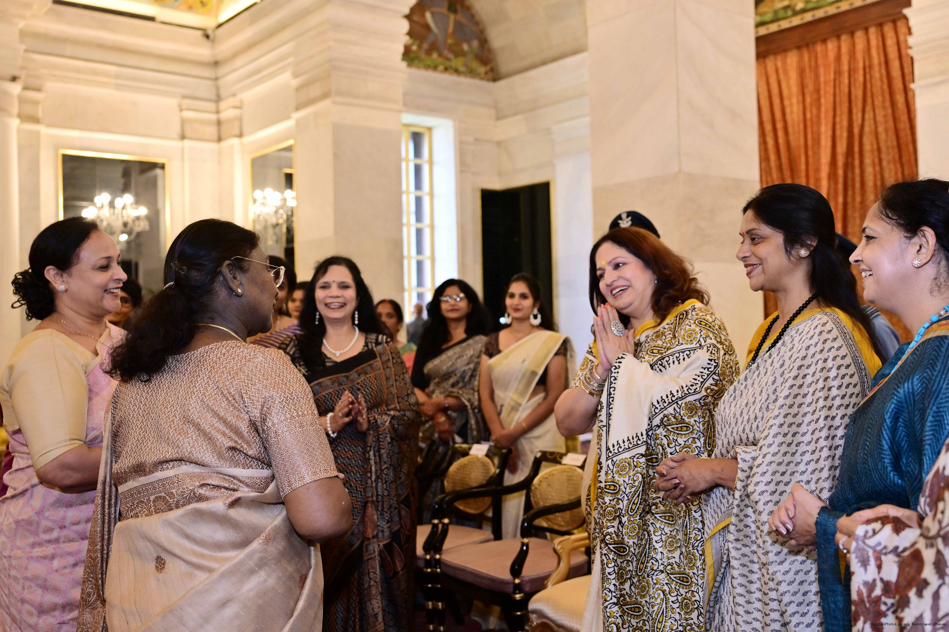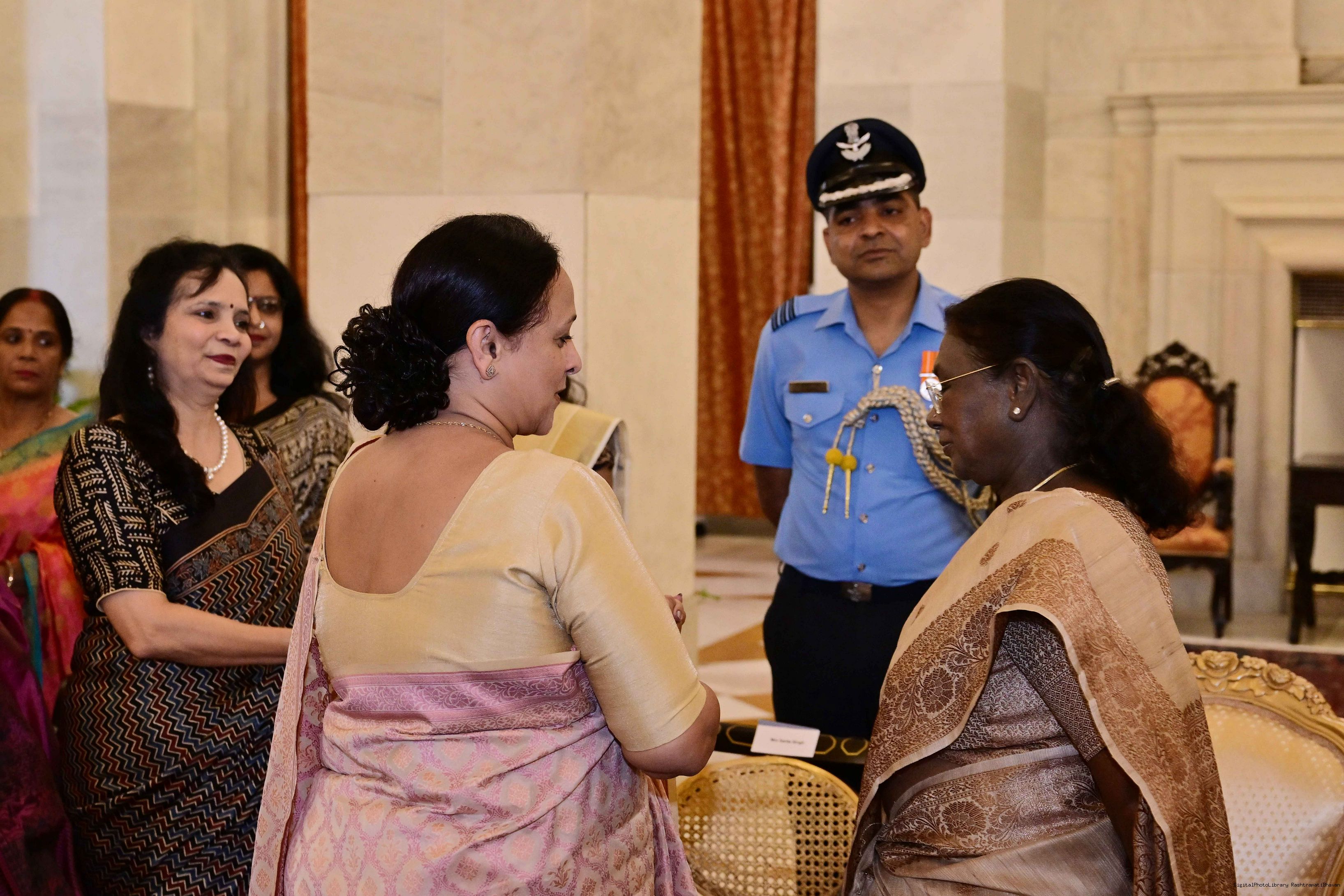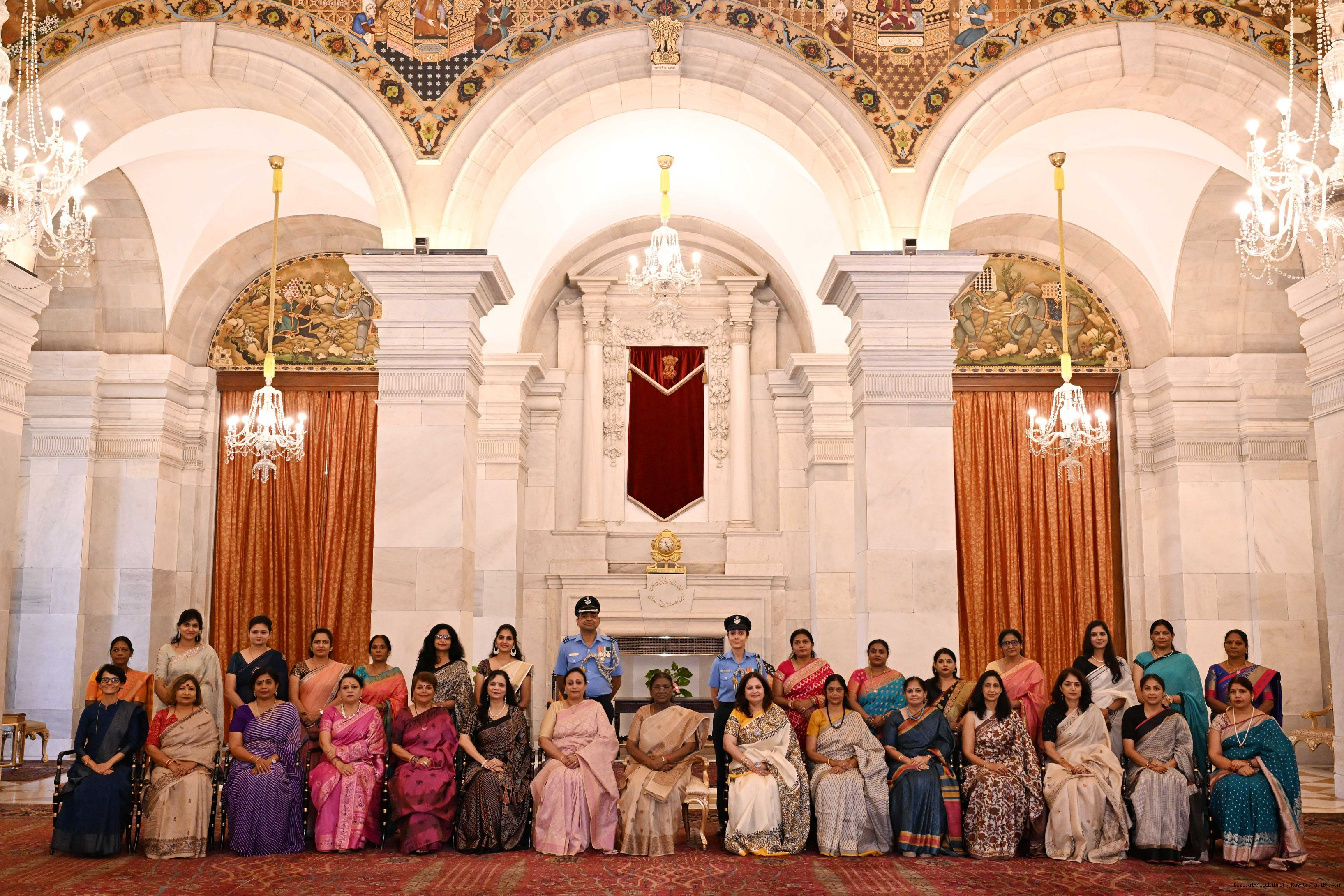 | Caption: | The President of India, Smt Droupadi Murmu interacted and posing a group photographs with 30 members of Air Force Families Welfare Association (AFFWA) at Rashtrapati Bhavan on October 13, 2025. |