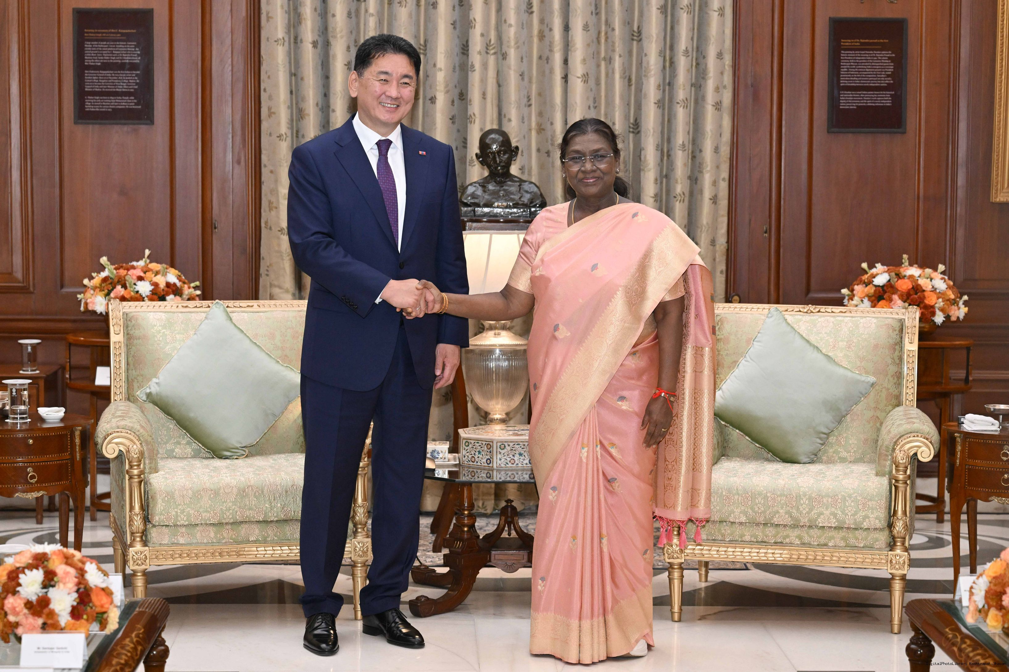 | Caption: | The President of India, Smt. Droupadi Murmu received H.E. Mr Khurelsukh Ukhnaa, President of Mongolia at Rashtrapati Bhavan on October 14, 2025. |