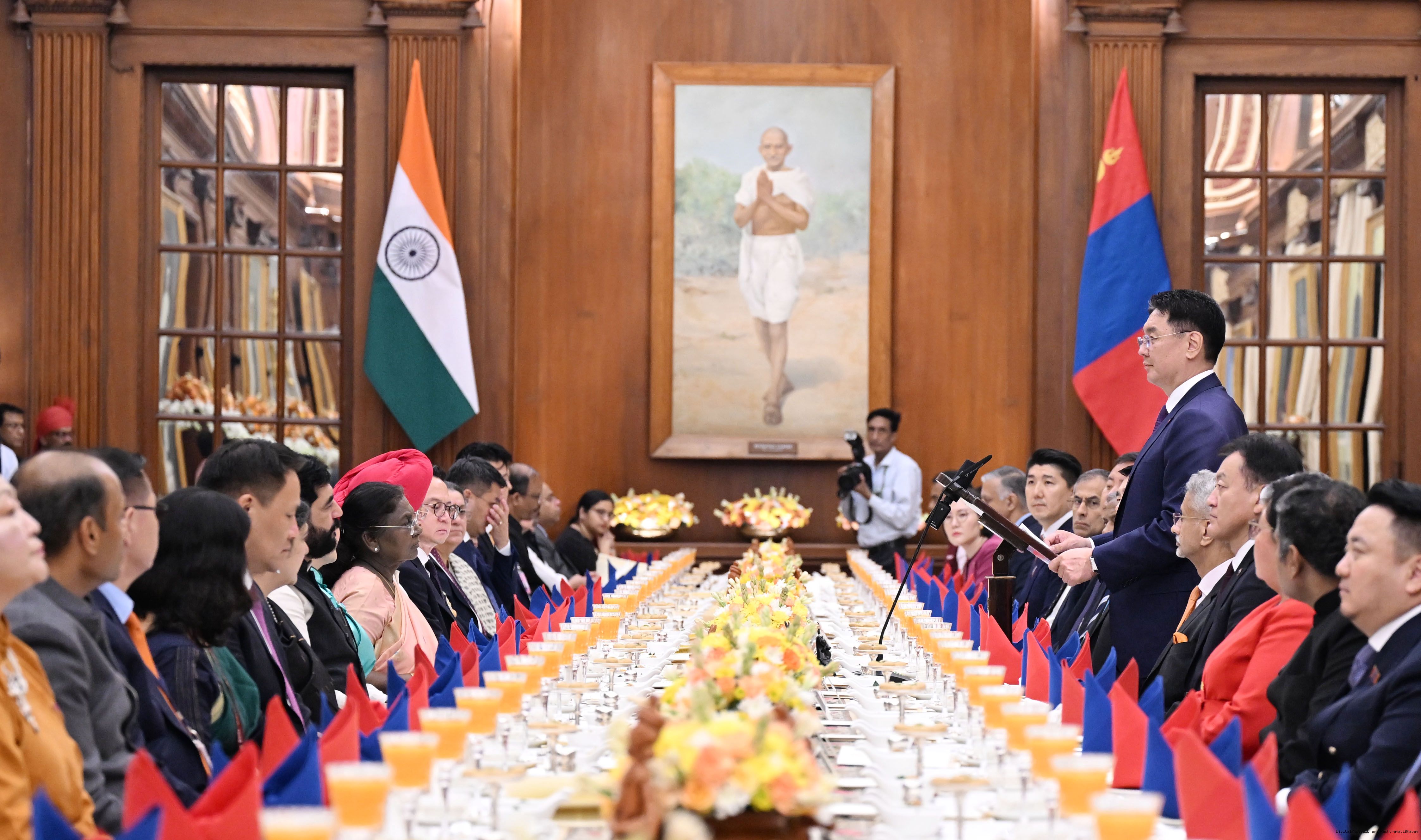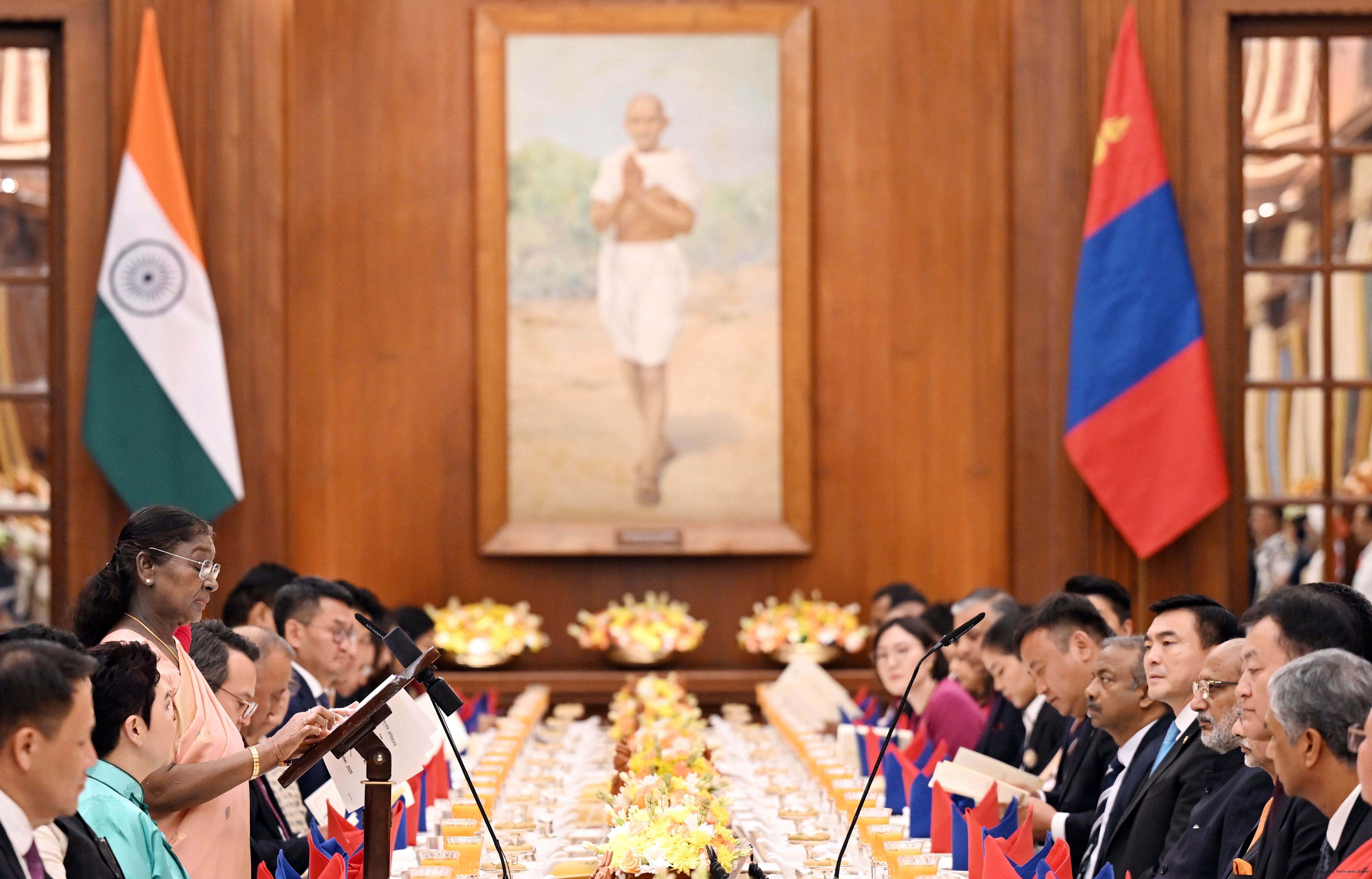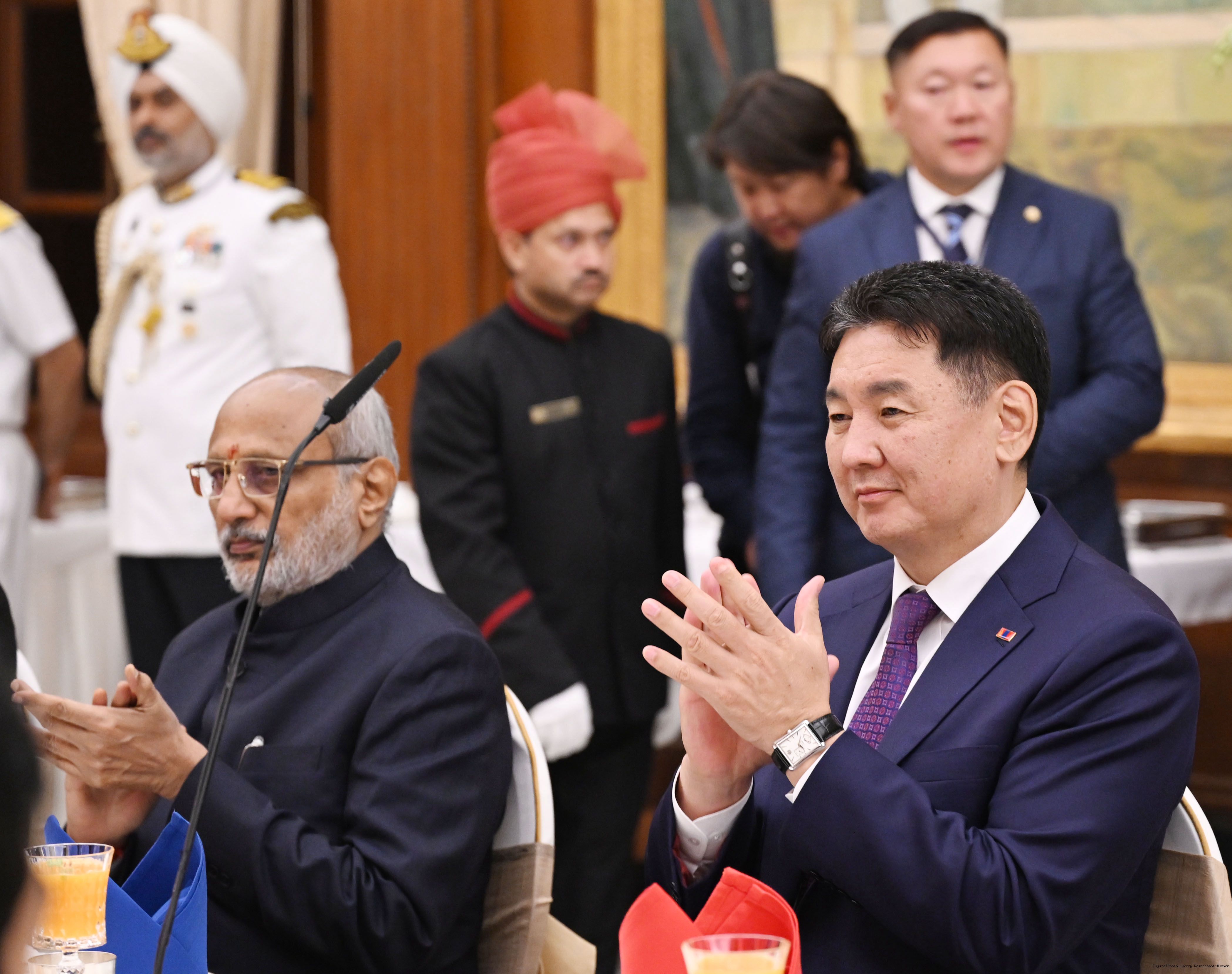 | Caption: | The President of India, Smt Droupadi Murmu hosted a banquet in the honour to H.E. Mr Khurelsukh Ukhnaa, President of Mongolia at Rashtrapati Bhavan on October 14, 2025. |