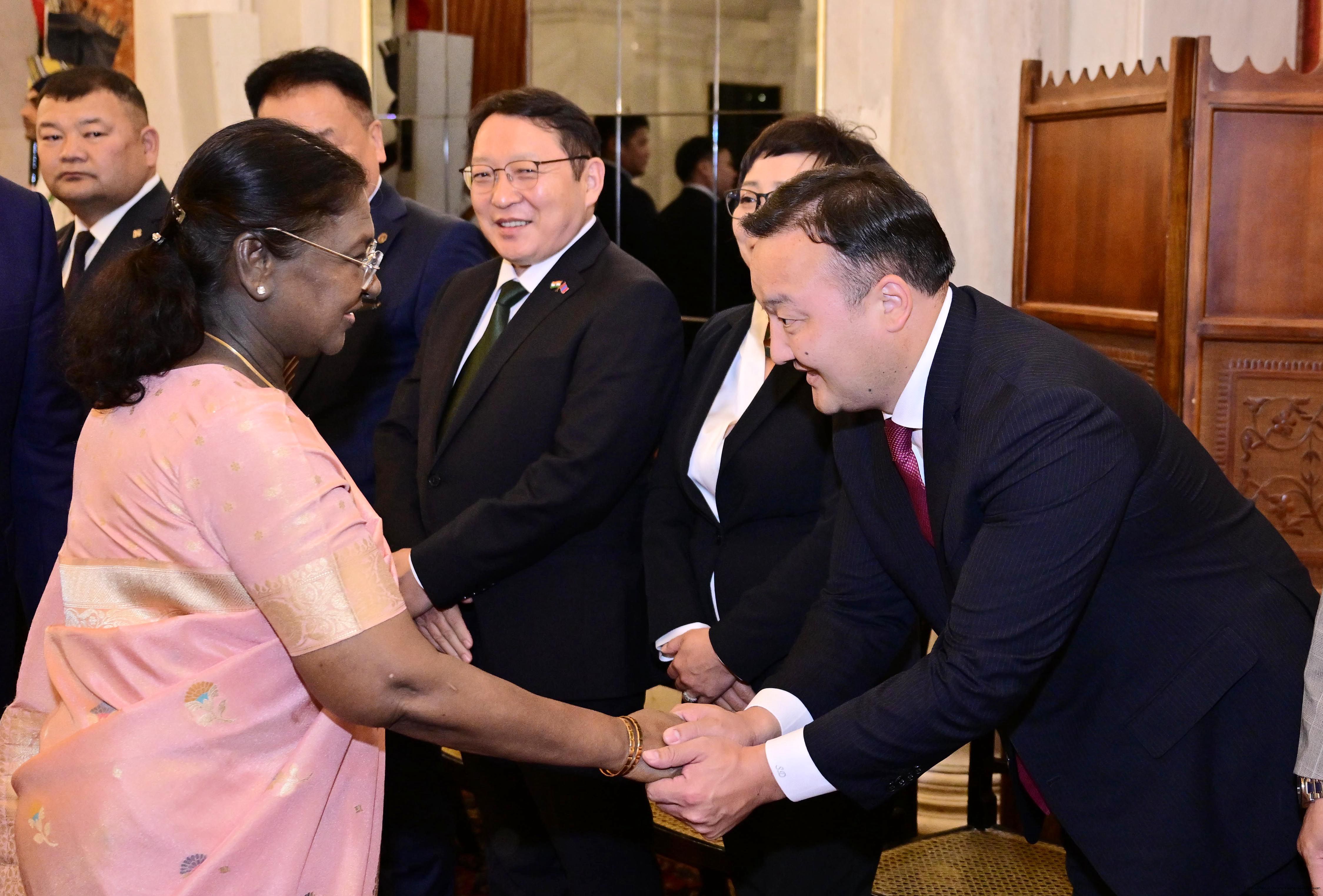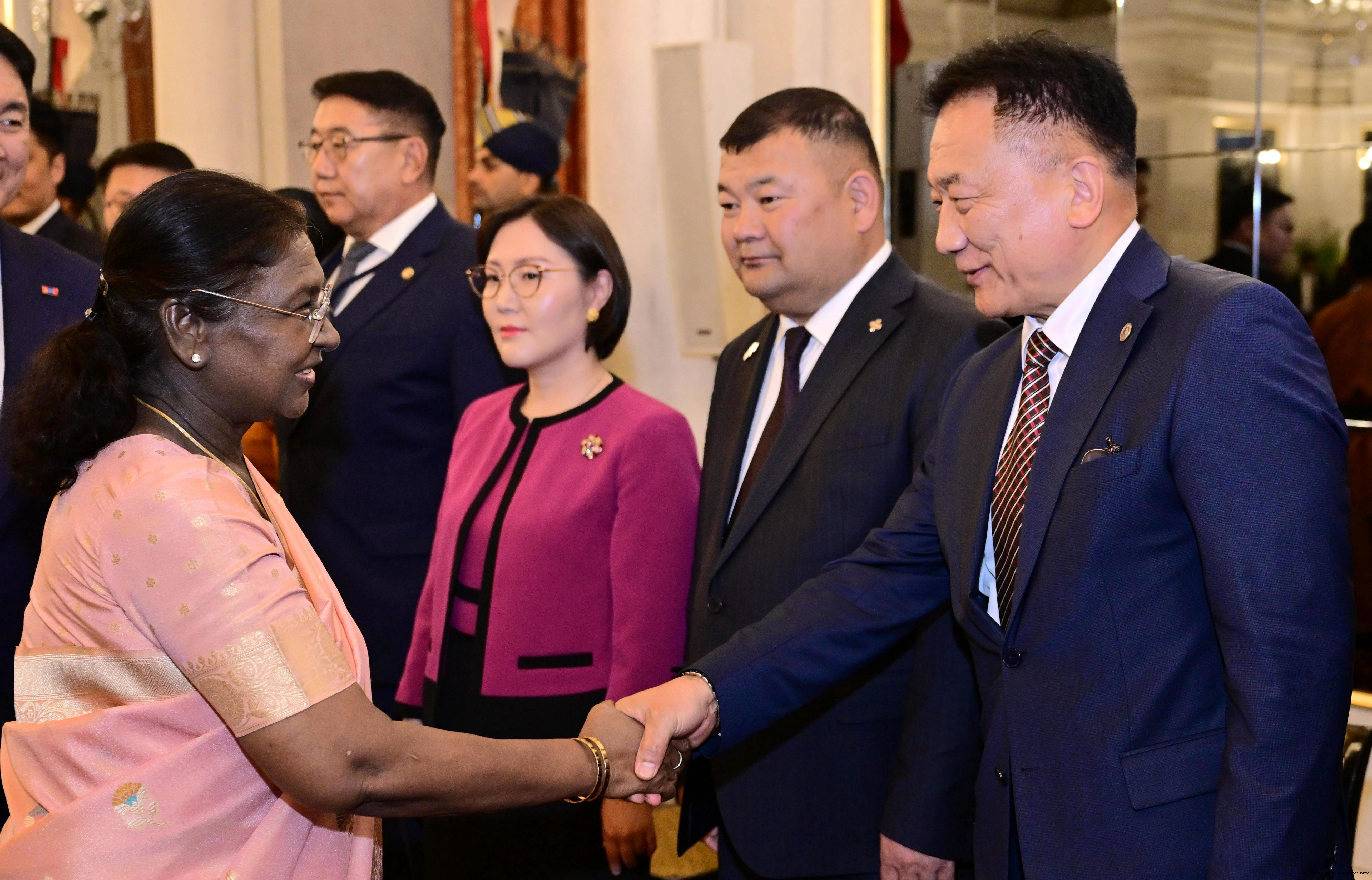 | Caption: | The President of India, Smt Droupadi Murmu hosted a banquet in the honour to H.E. Mr Khurelsukh Ukhnaa, President of Mongolia at Rashtrapati Bhavan on October 14, 2025. |