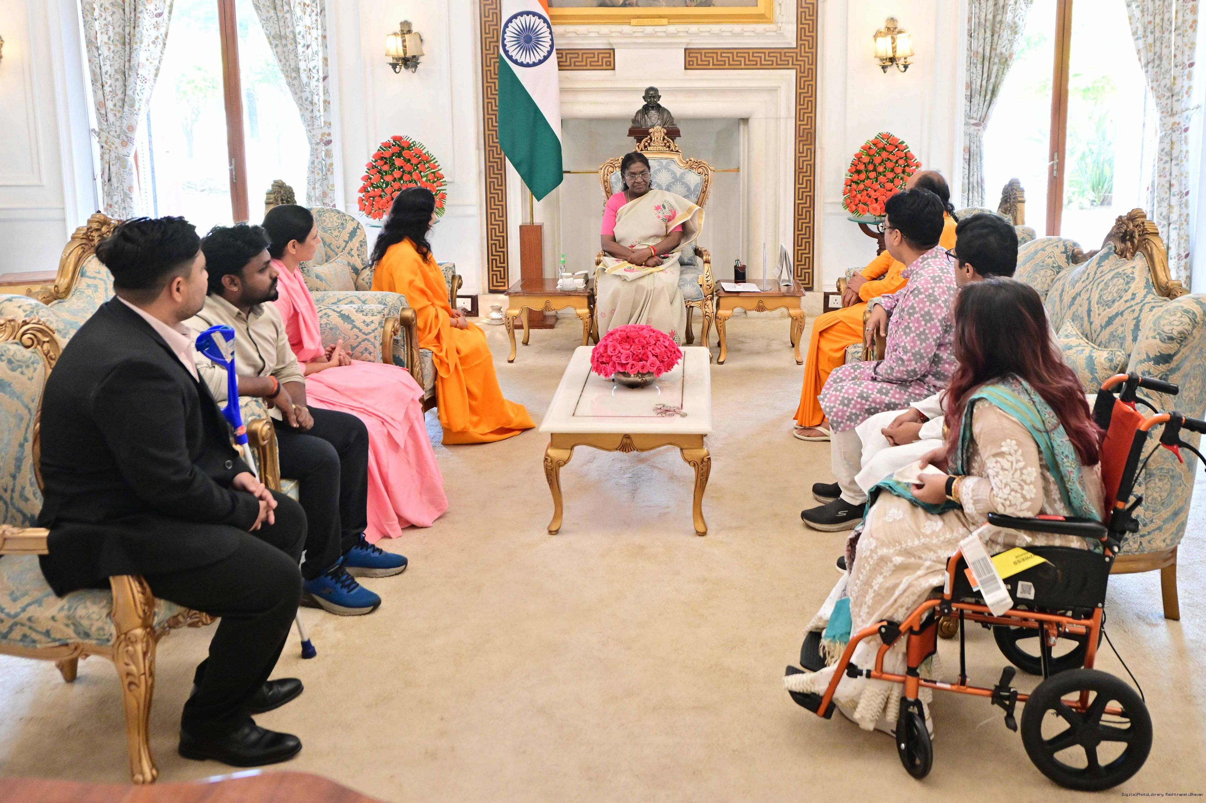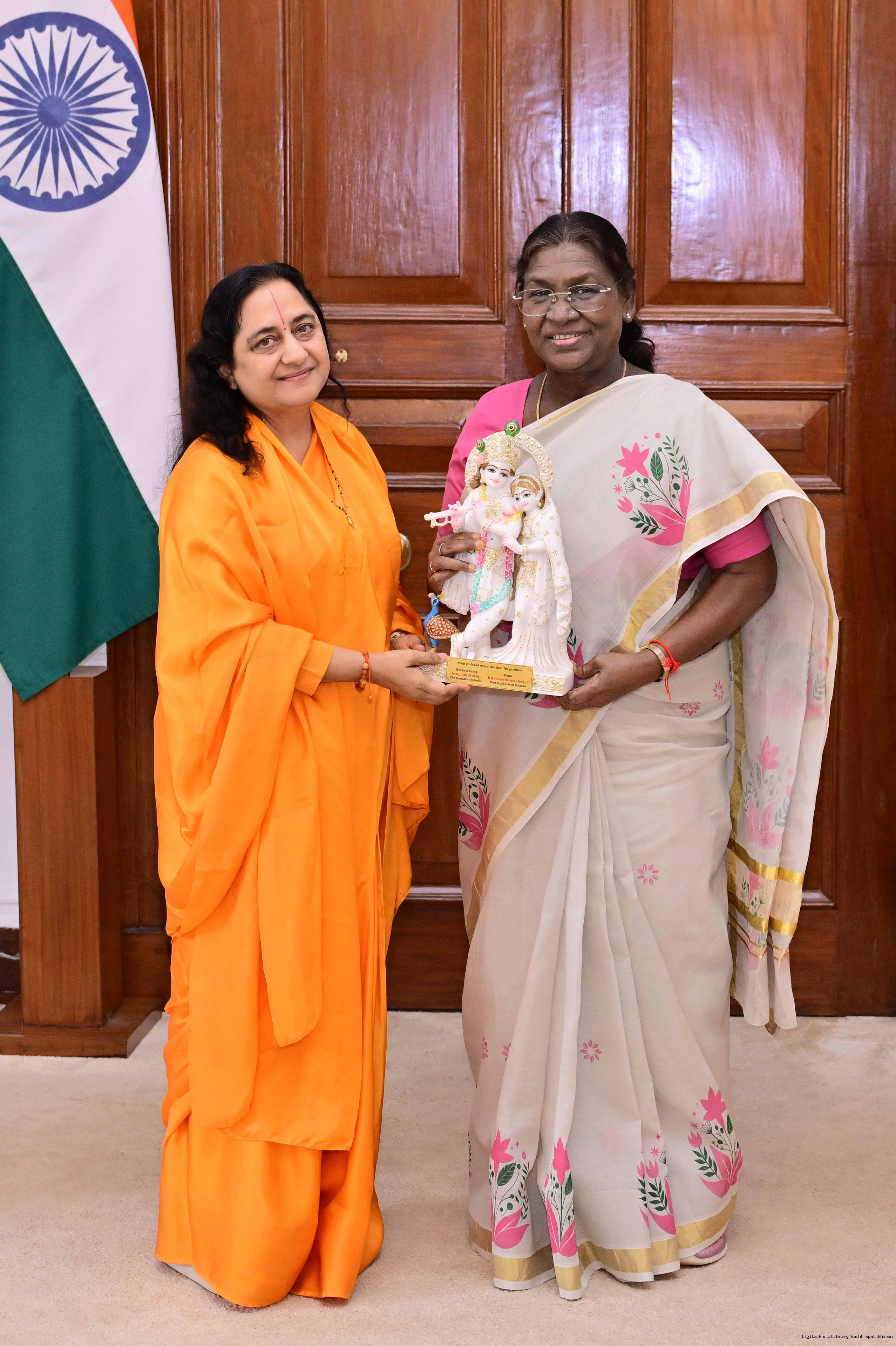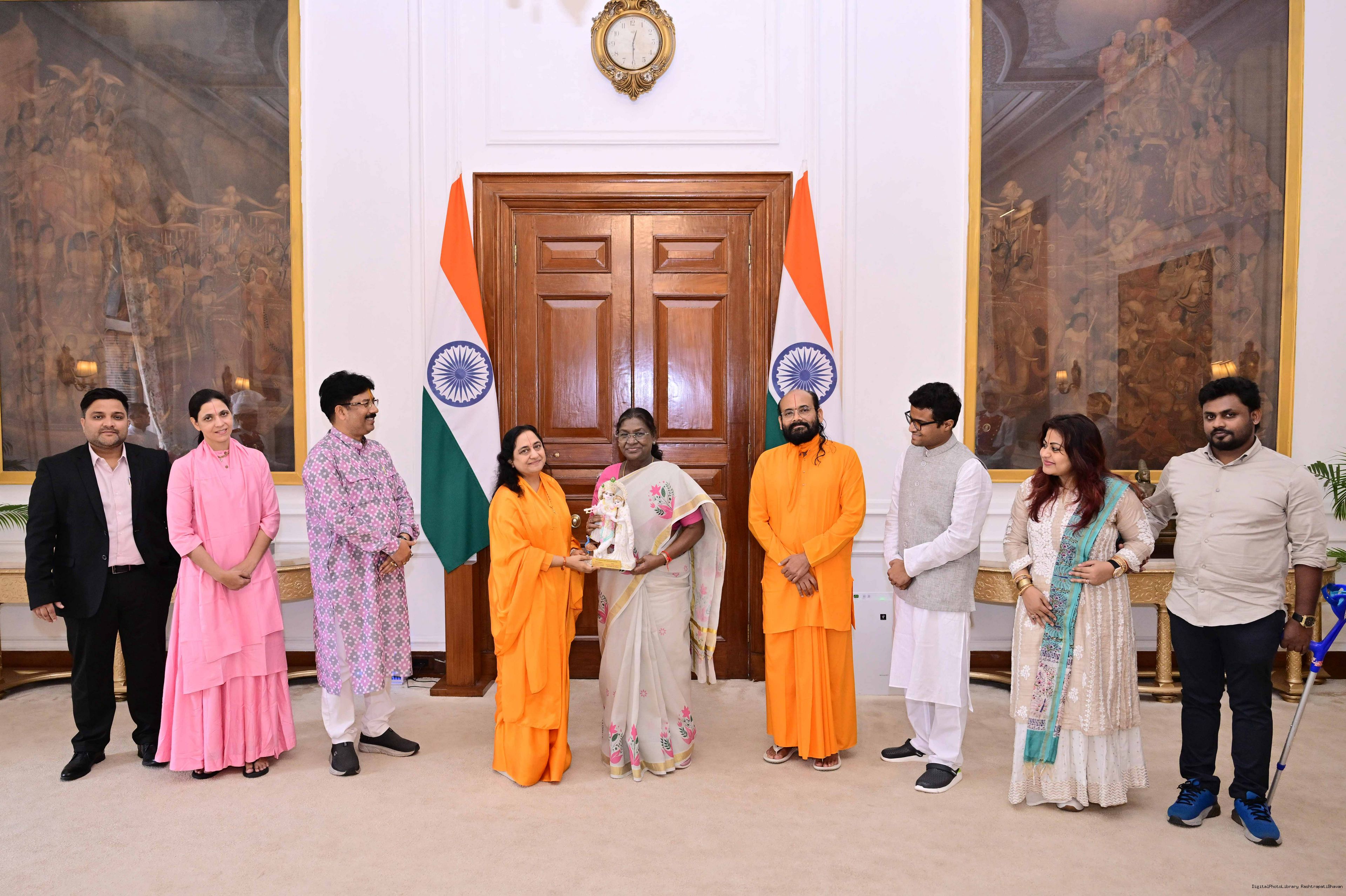 | Caption: | Dr. Krushna Chandra Mahapatra, Minister of Housing Urban Development Public Enterprises, Govt. of Odisha along with Her Holiness Raseshwari Devi of Braja Gopika Seva Mission meeting with the President of India, Smt. Droupadi Murmu at Rashtrapati Bhavan on October 15, 2025. |