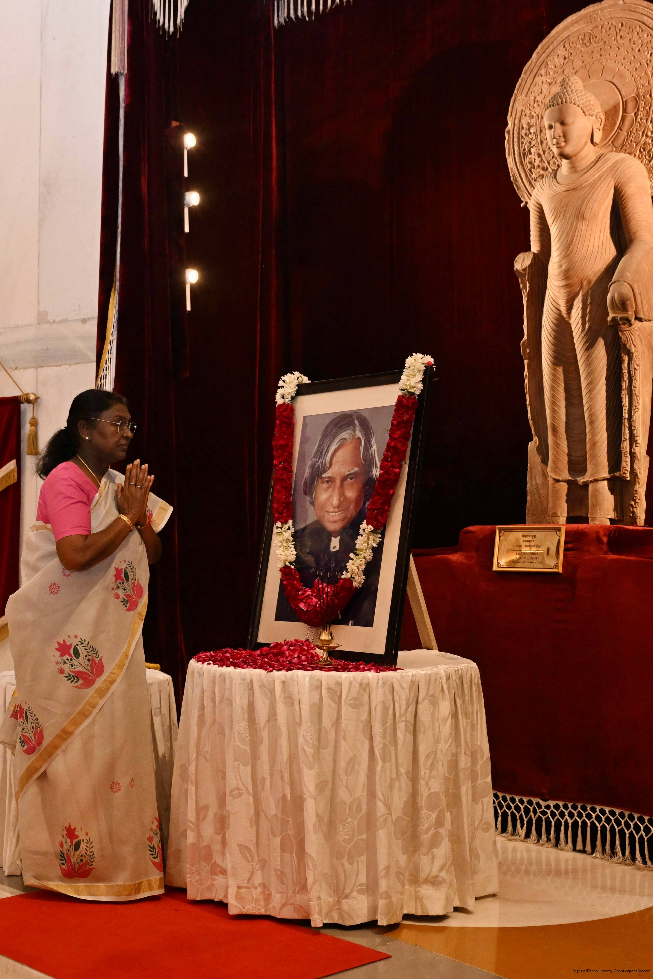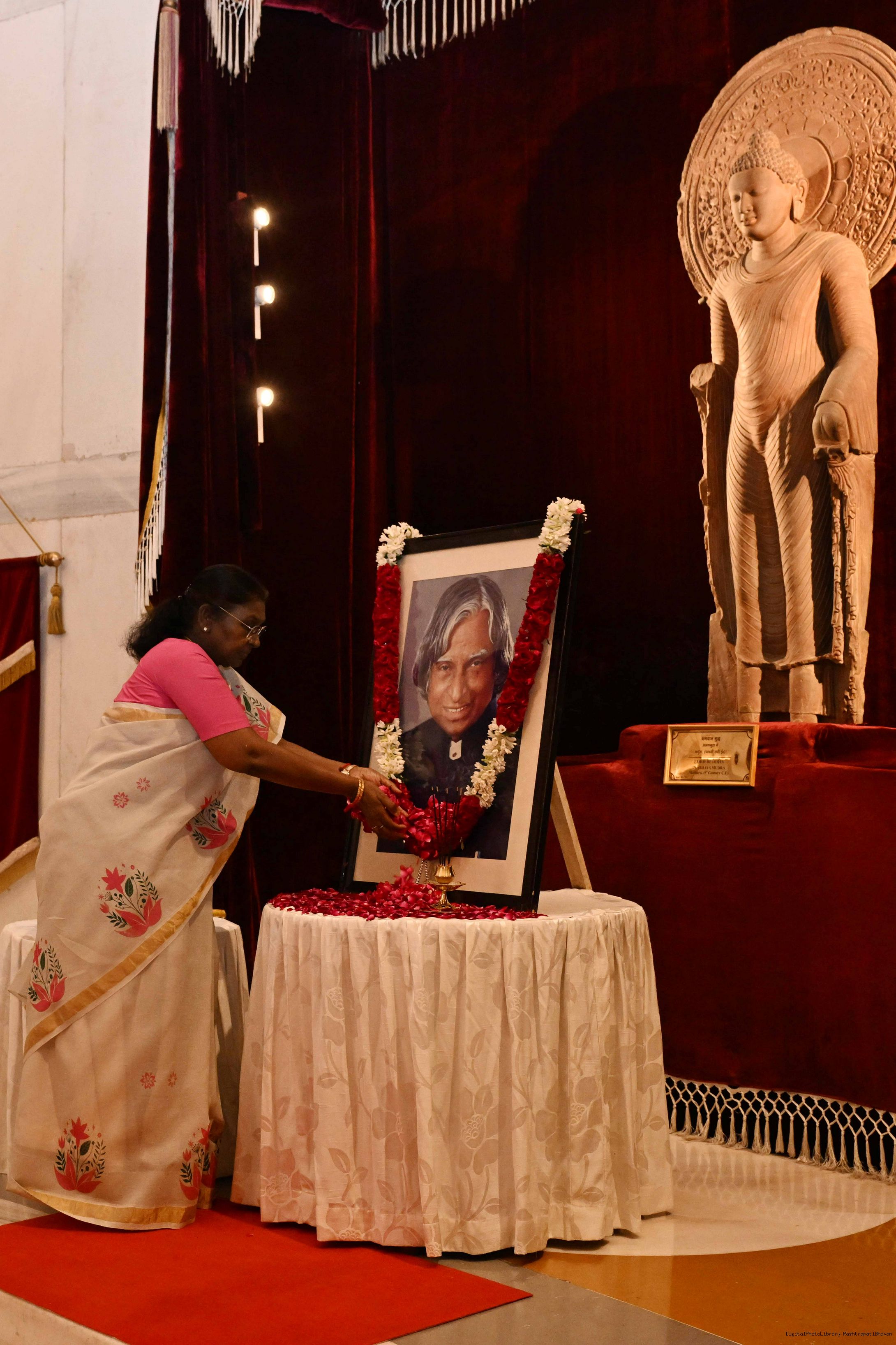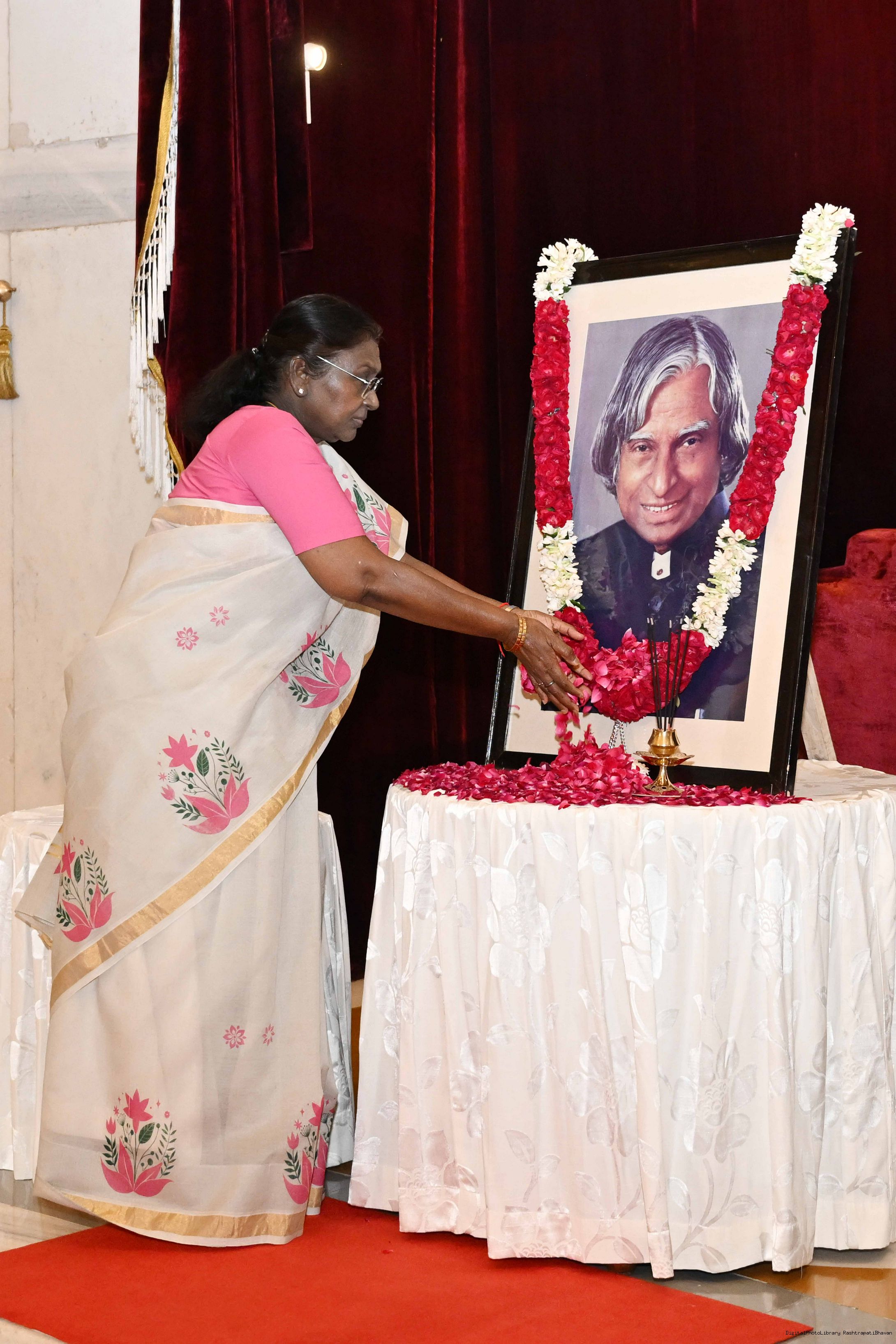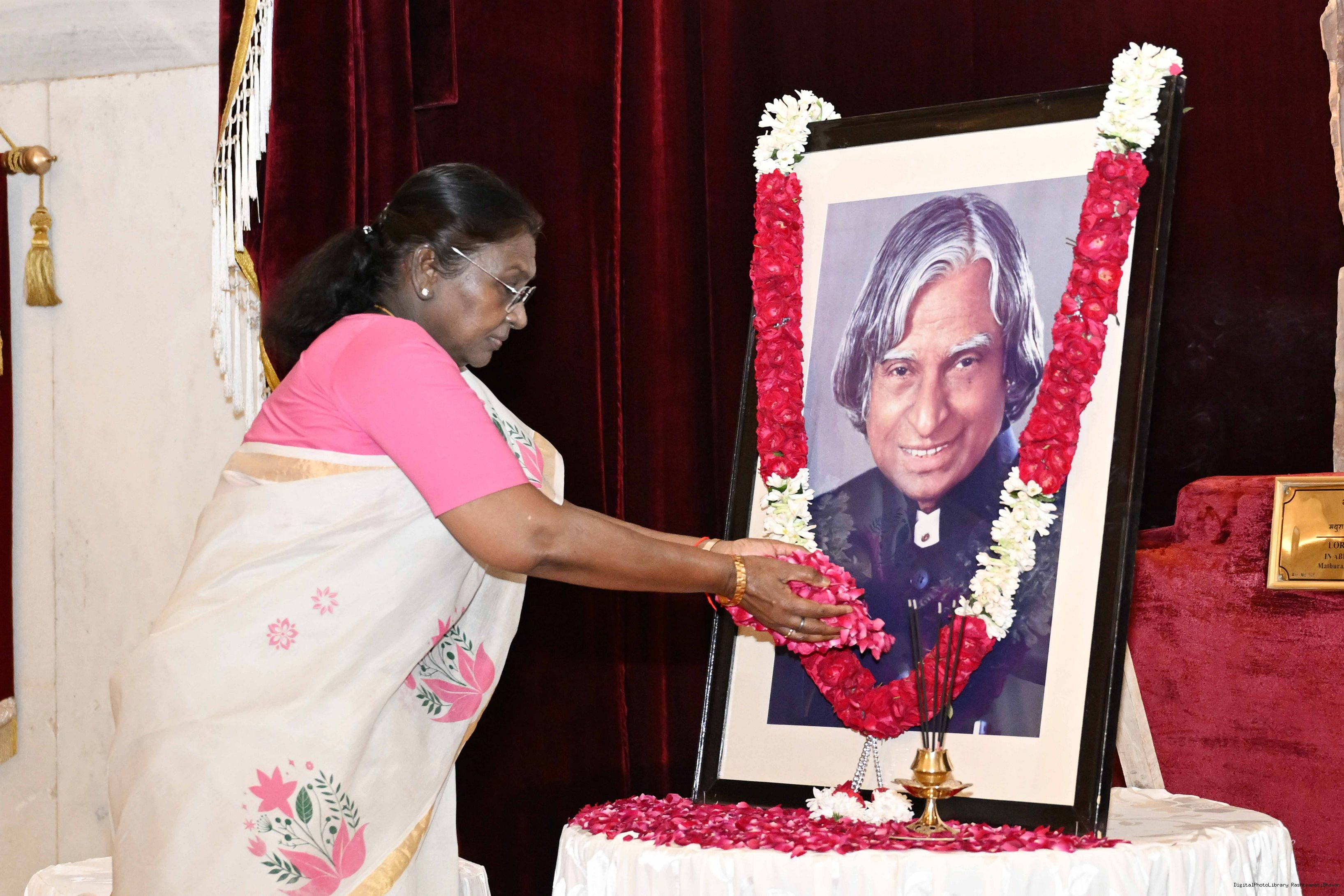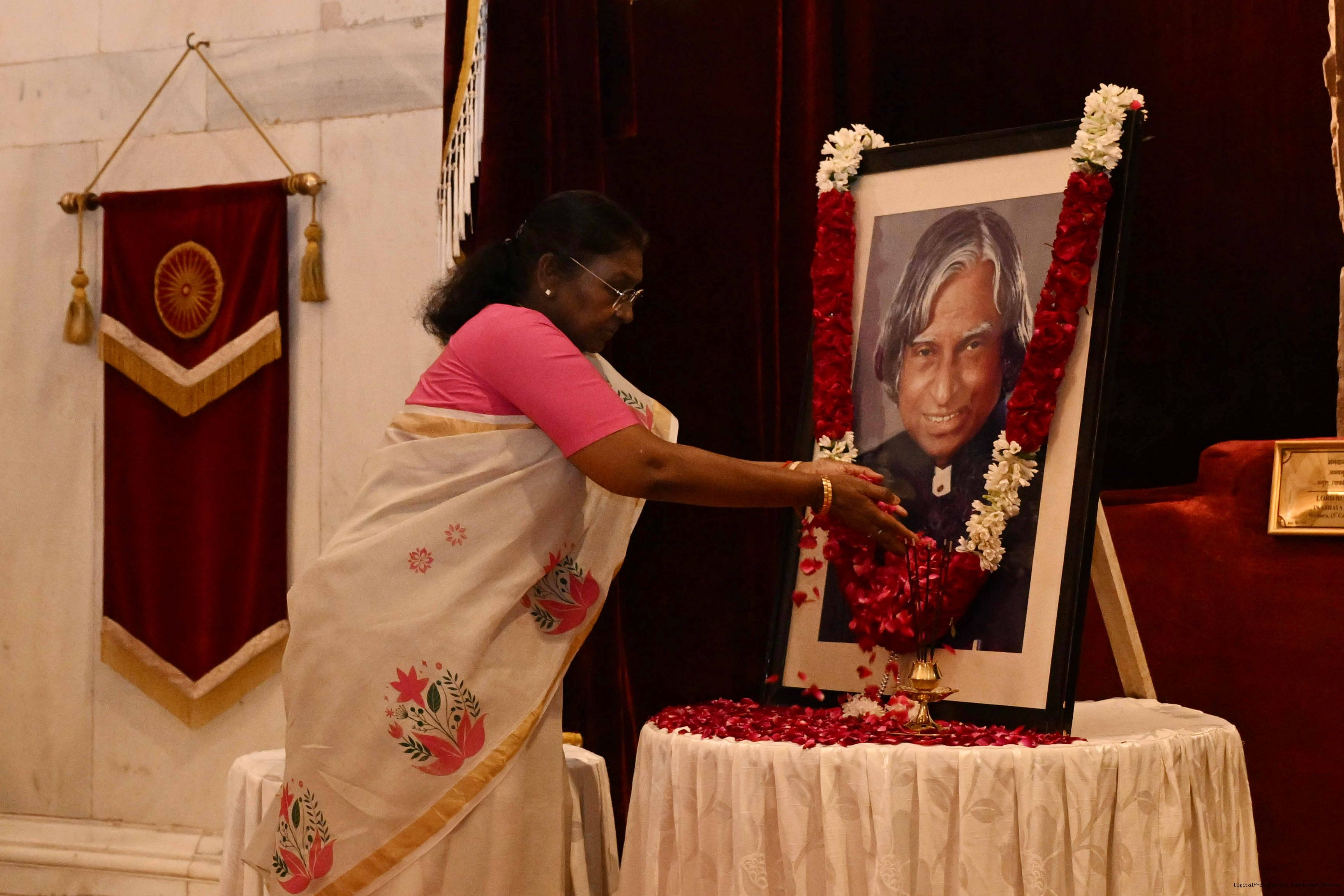 | Caption: | The President of India, Smt Droupadi Murmu, paid floral tributes to Dr. APJ Abdul Kalam, former President of India on his birth anniversary at Rashtrapati Bhavan on October 15, 2025. |