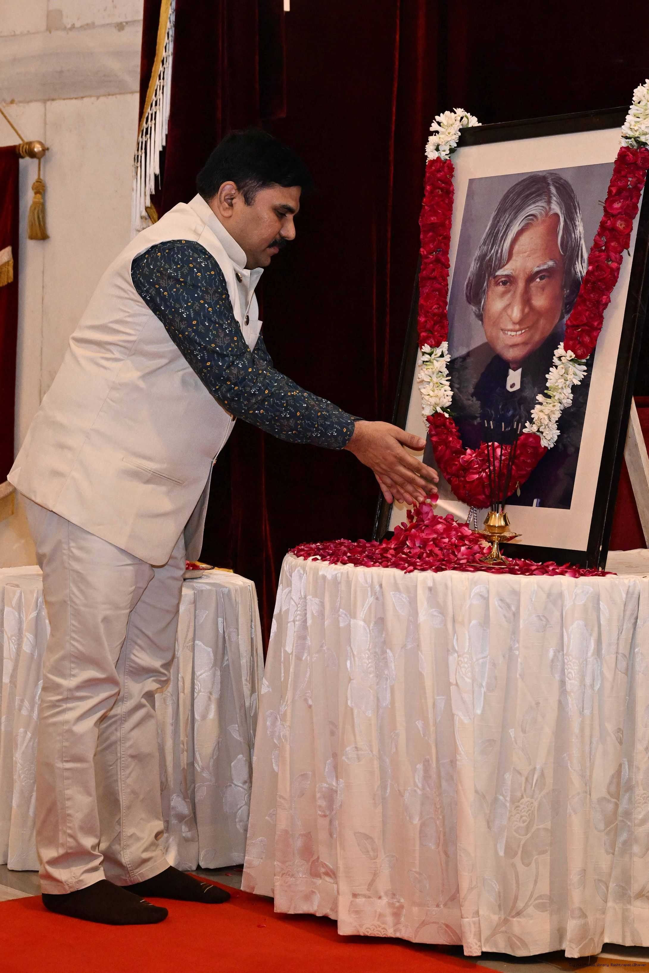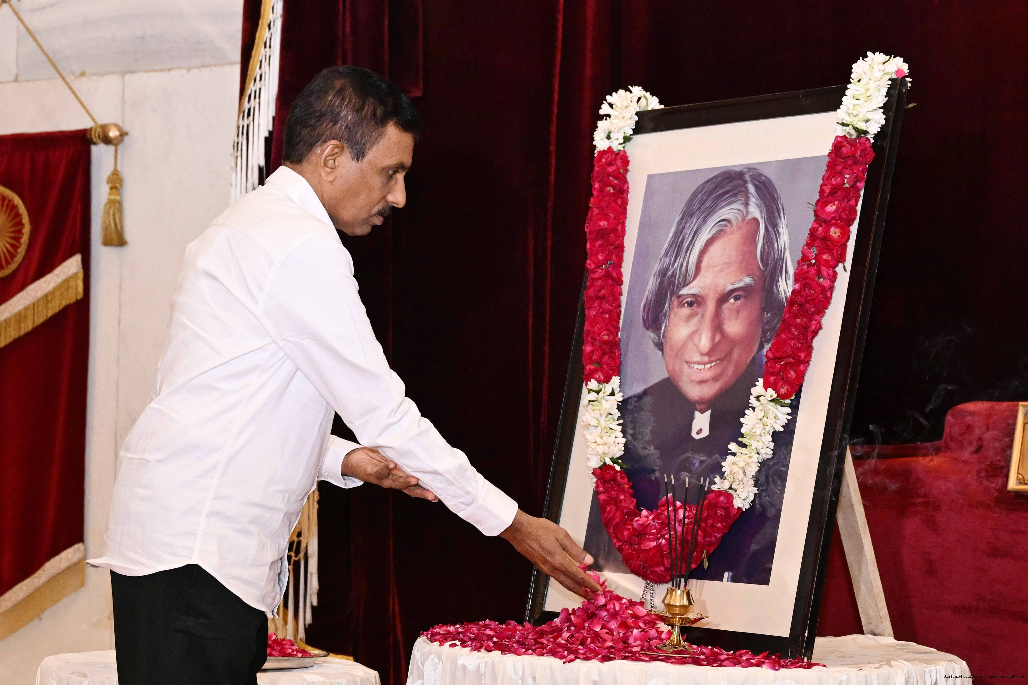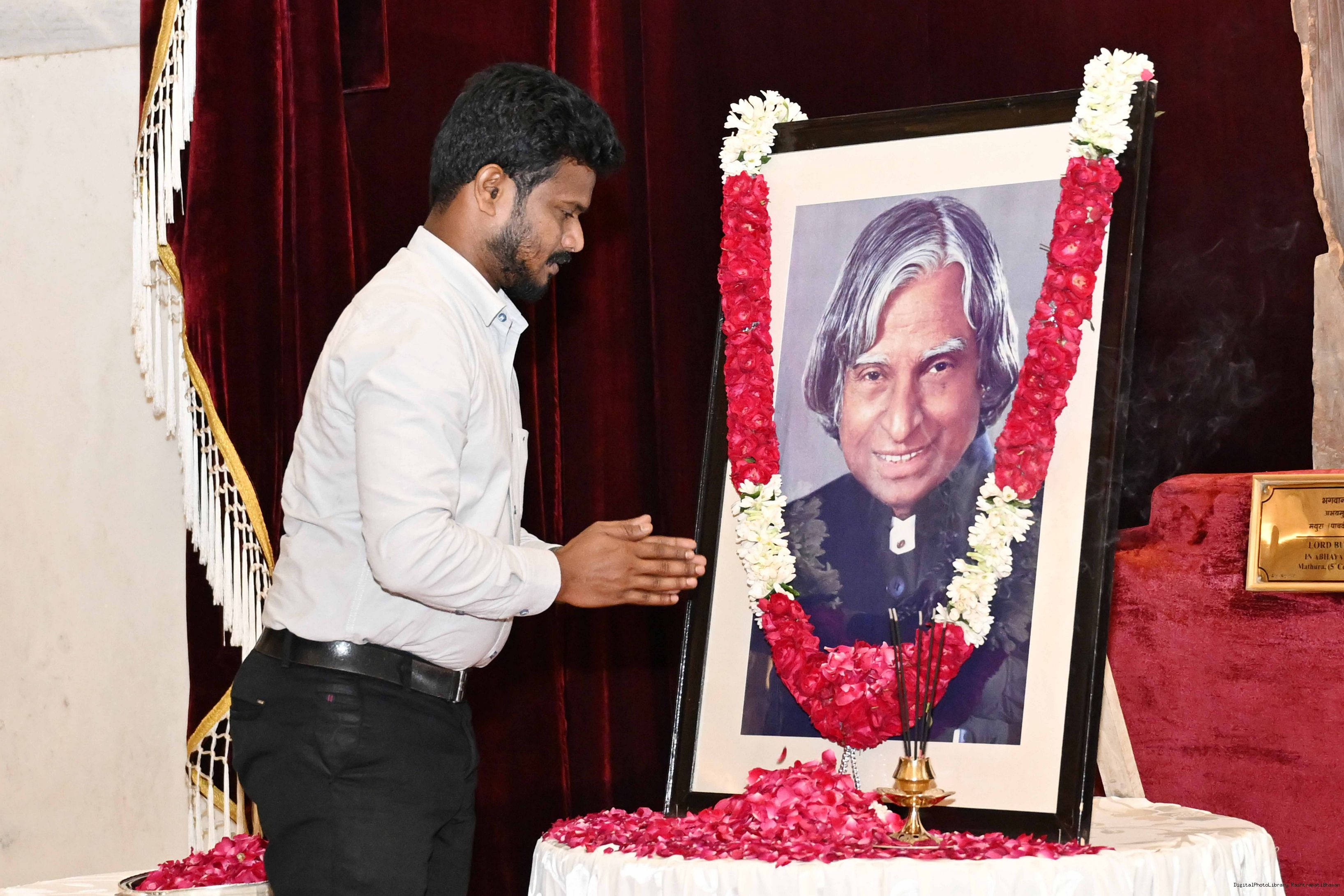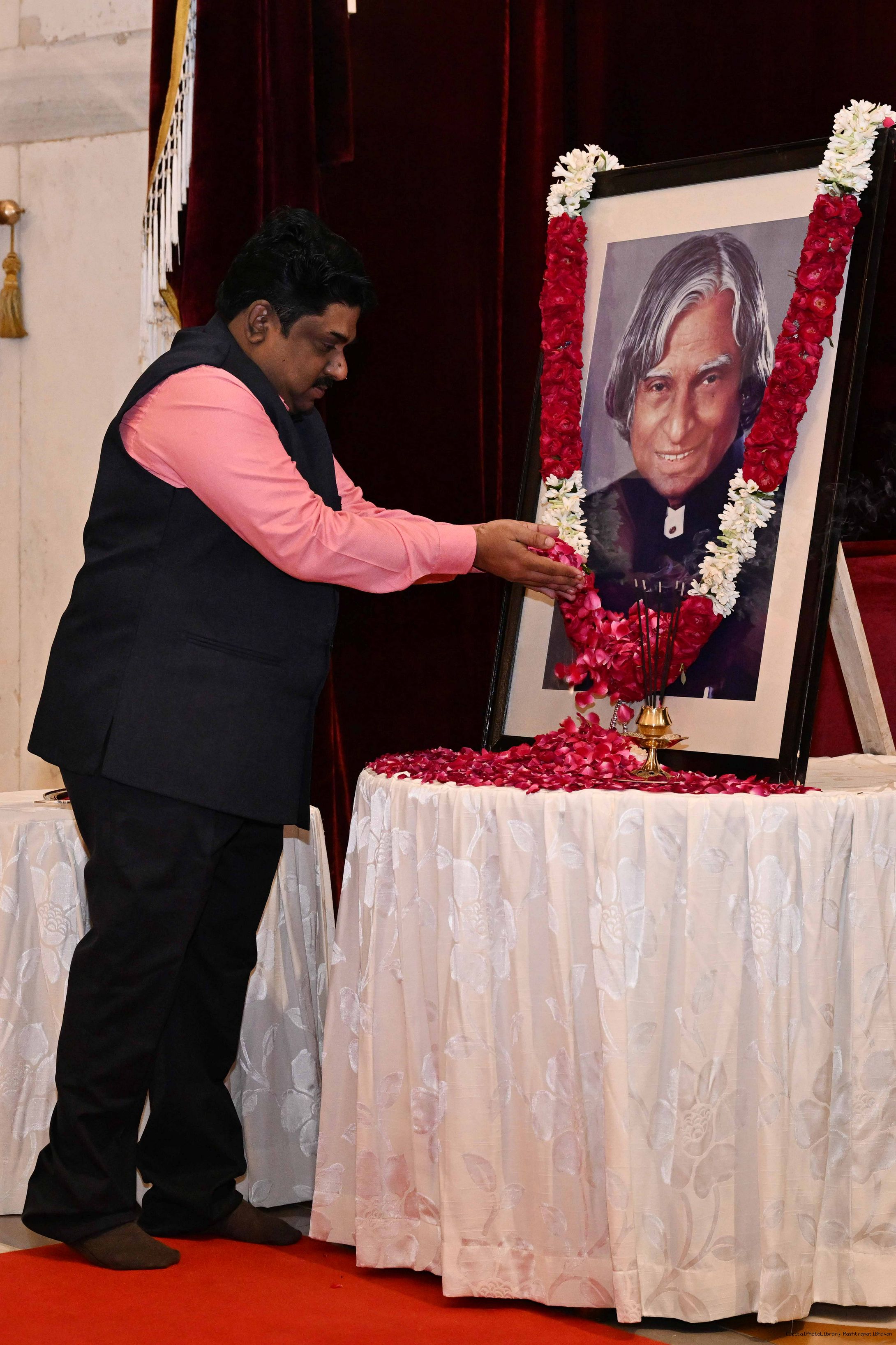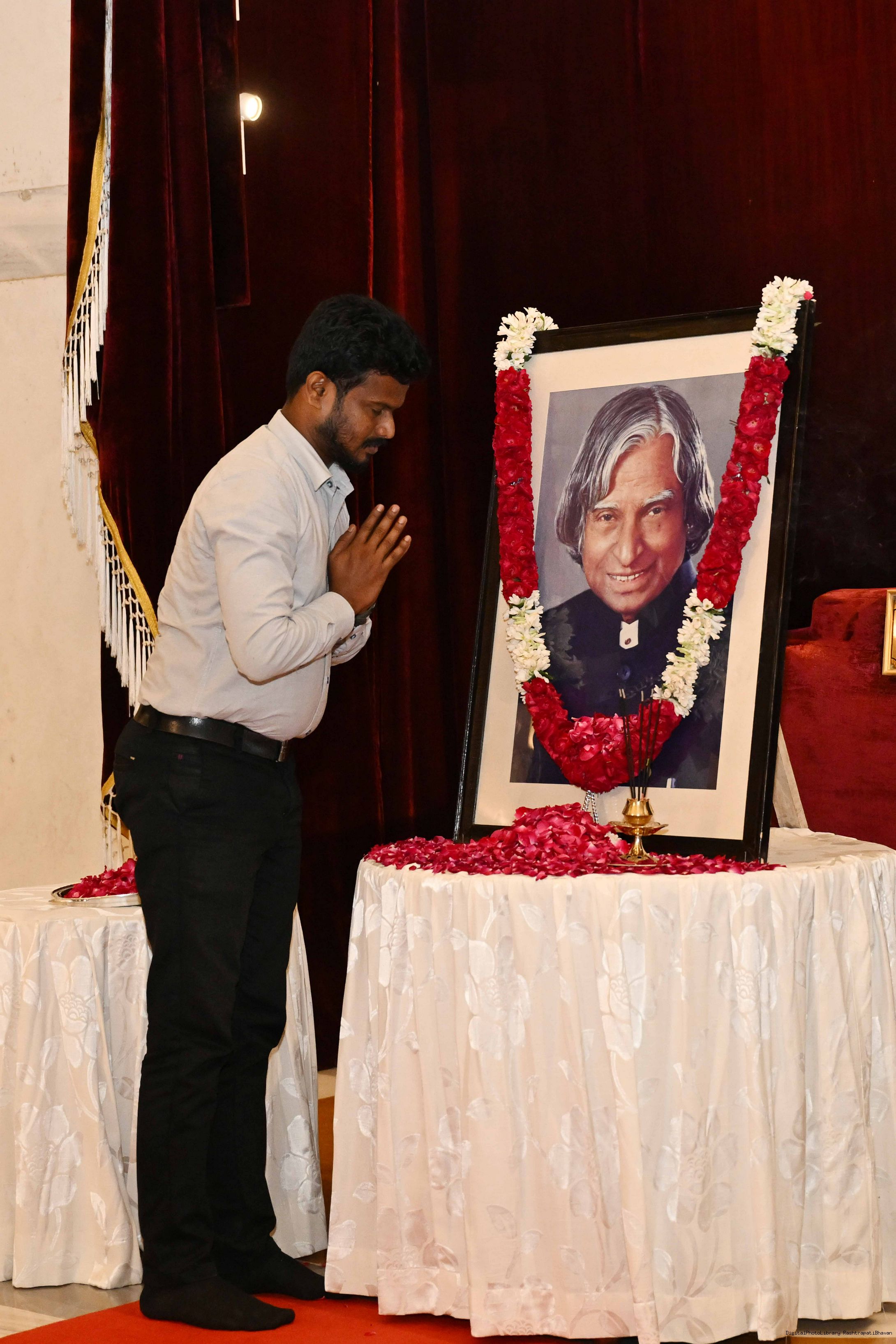 | Caption: | The President of India, Smt Droupadi Murmu, paid floral tributes to Dr. APJ Abdul Kalam, former President of India on his birth anniversary at Rashtrapati Bhavan on October 15, 2025. |