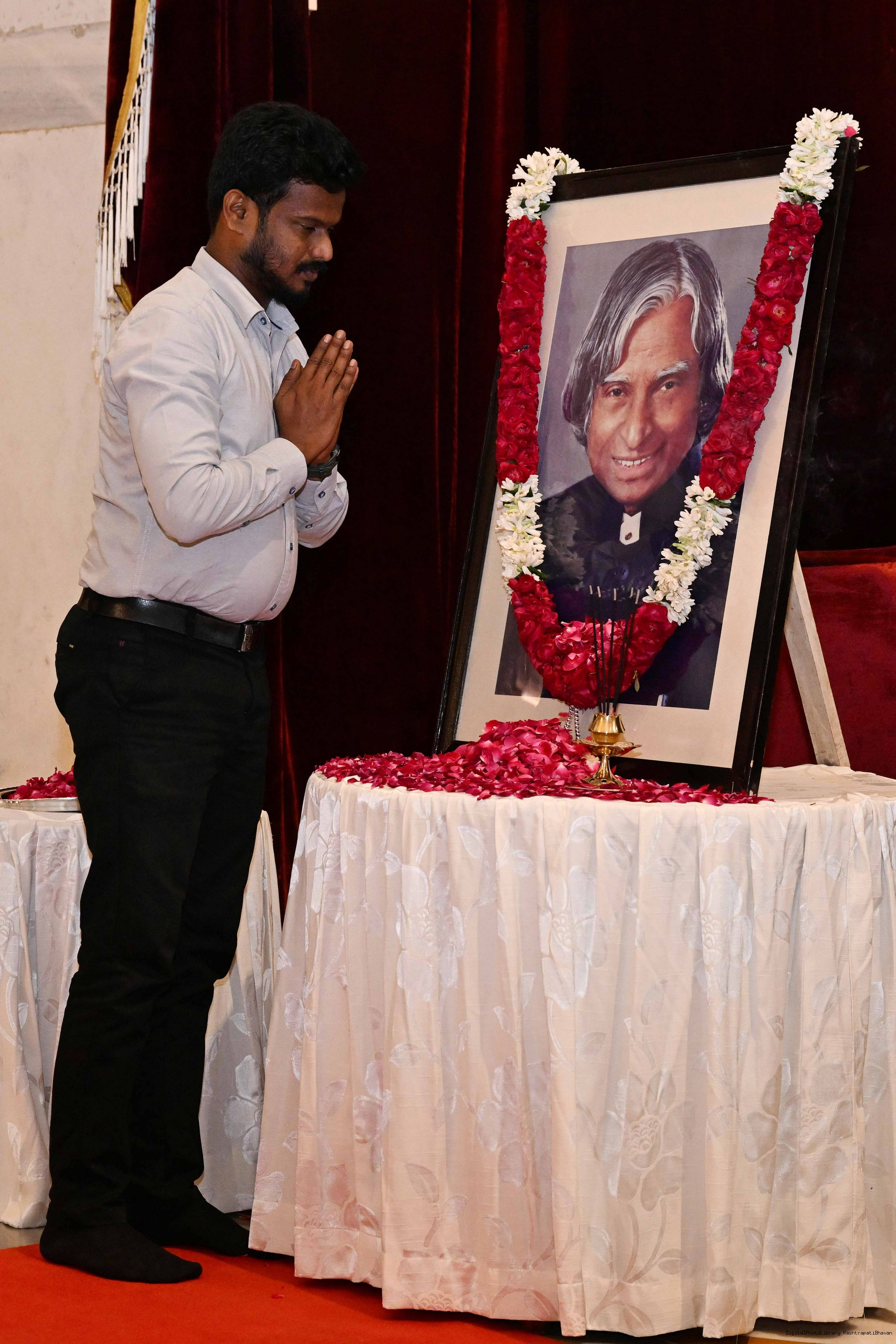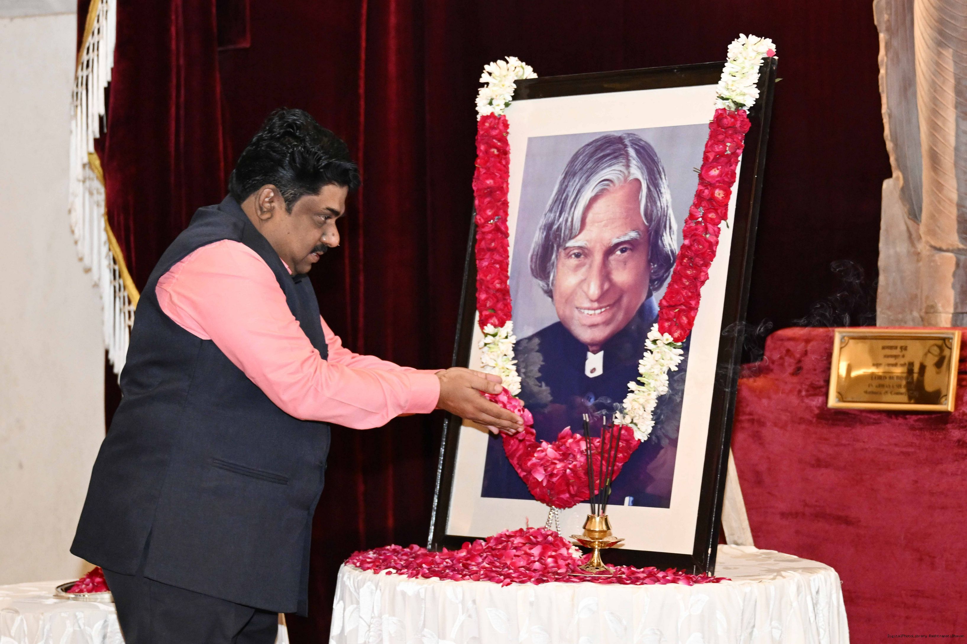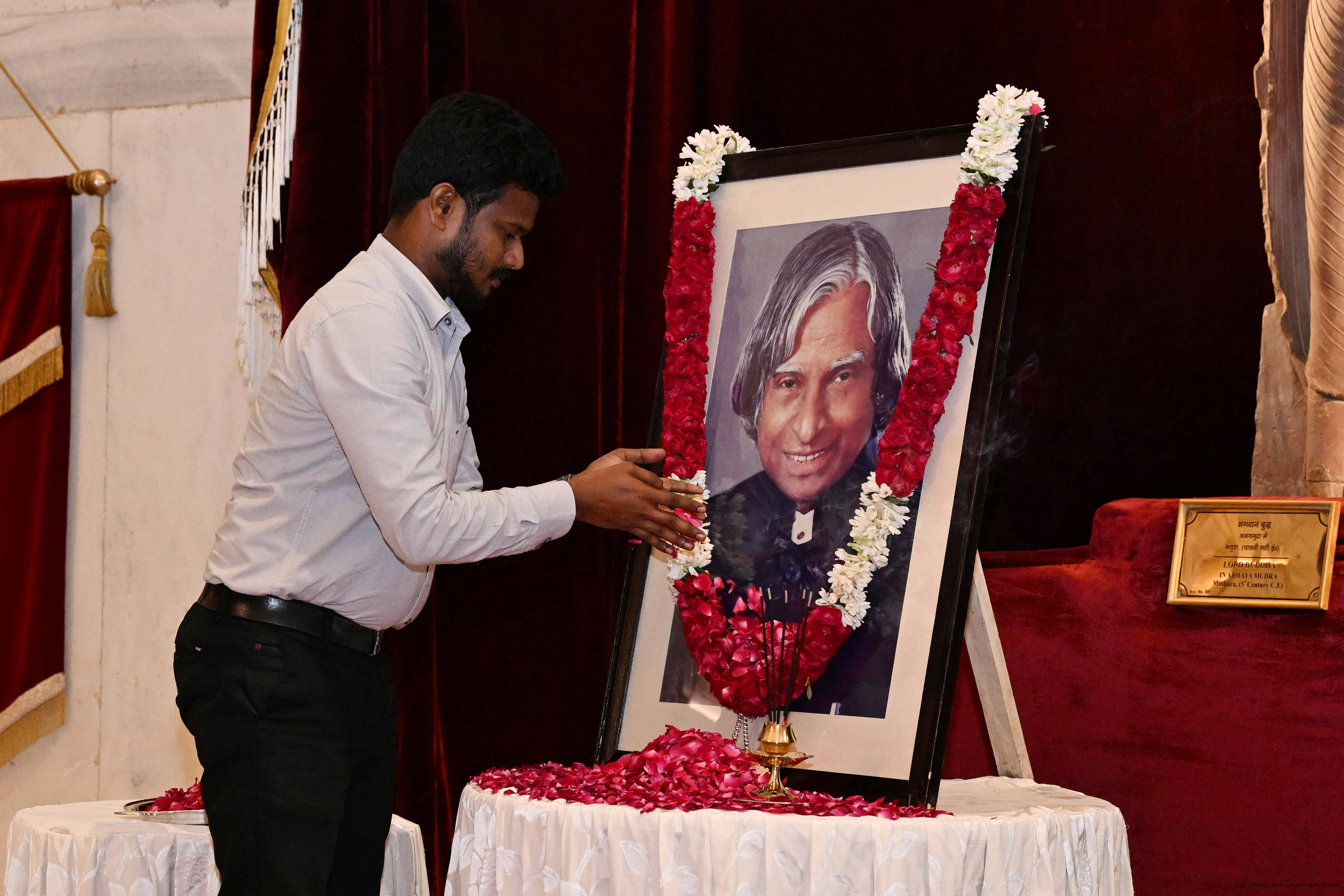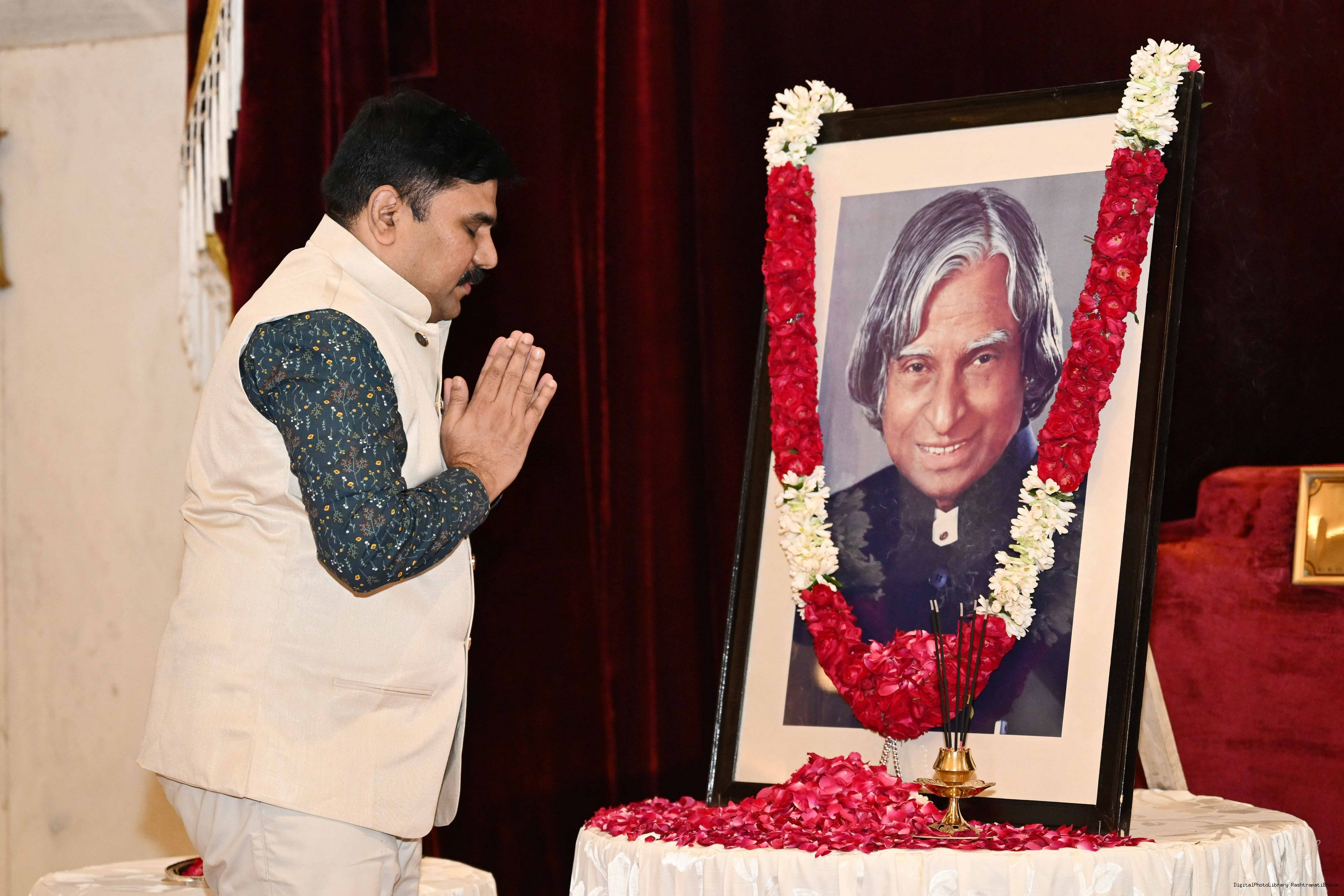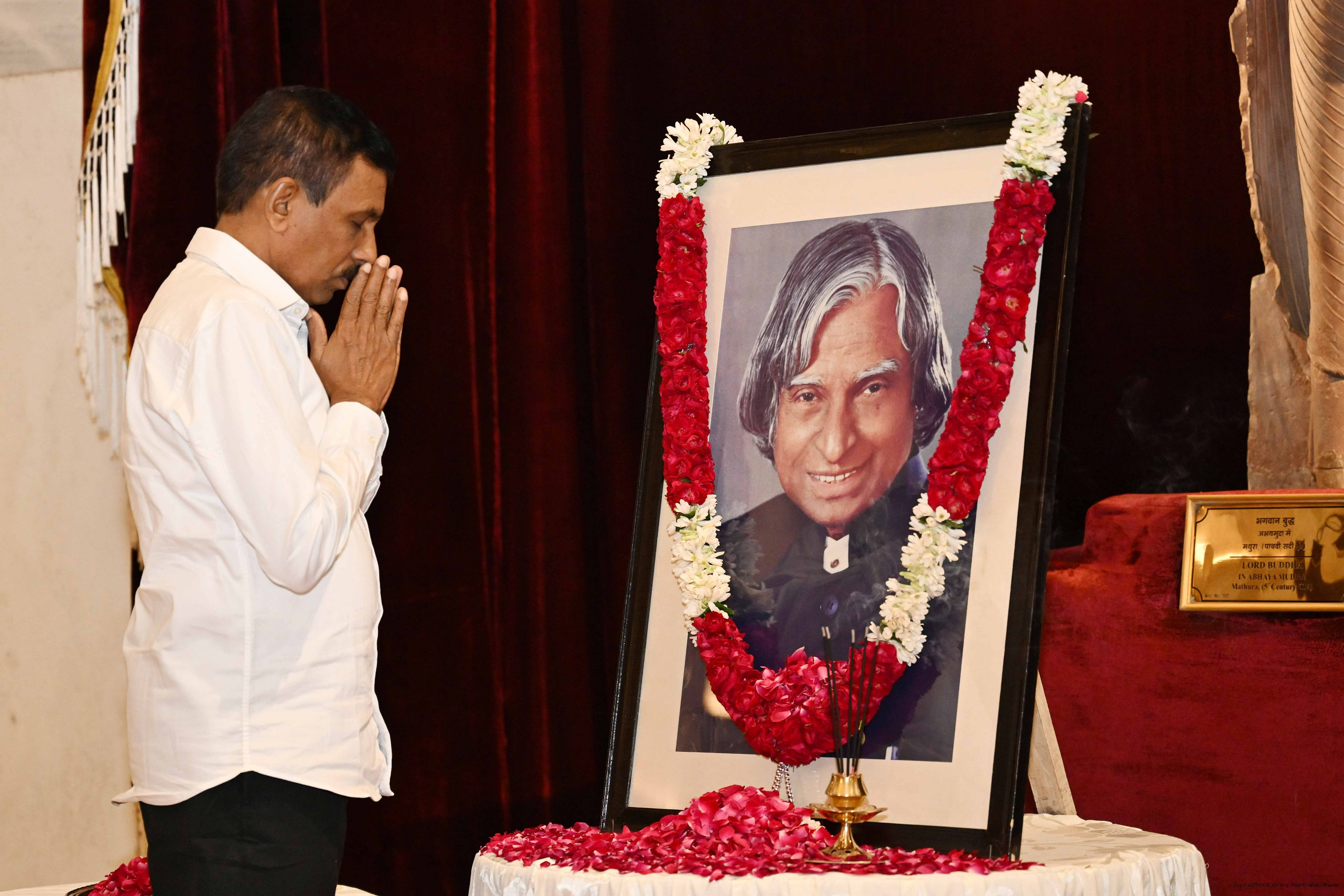| Caption: | The President of India, Smt Droupadi Murmu, paid floral tributes to Dr. APJ Abdul Kalam, former President of India on his birth anniversary at Rashtrapati Bhavan on October 15, 2025. |