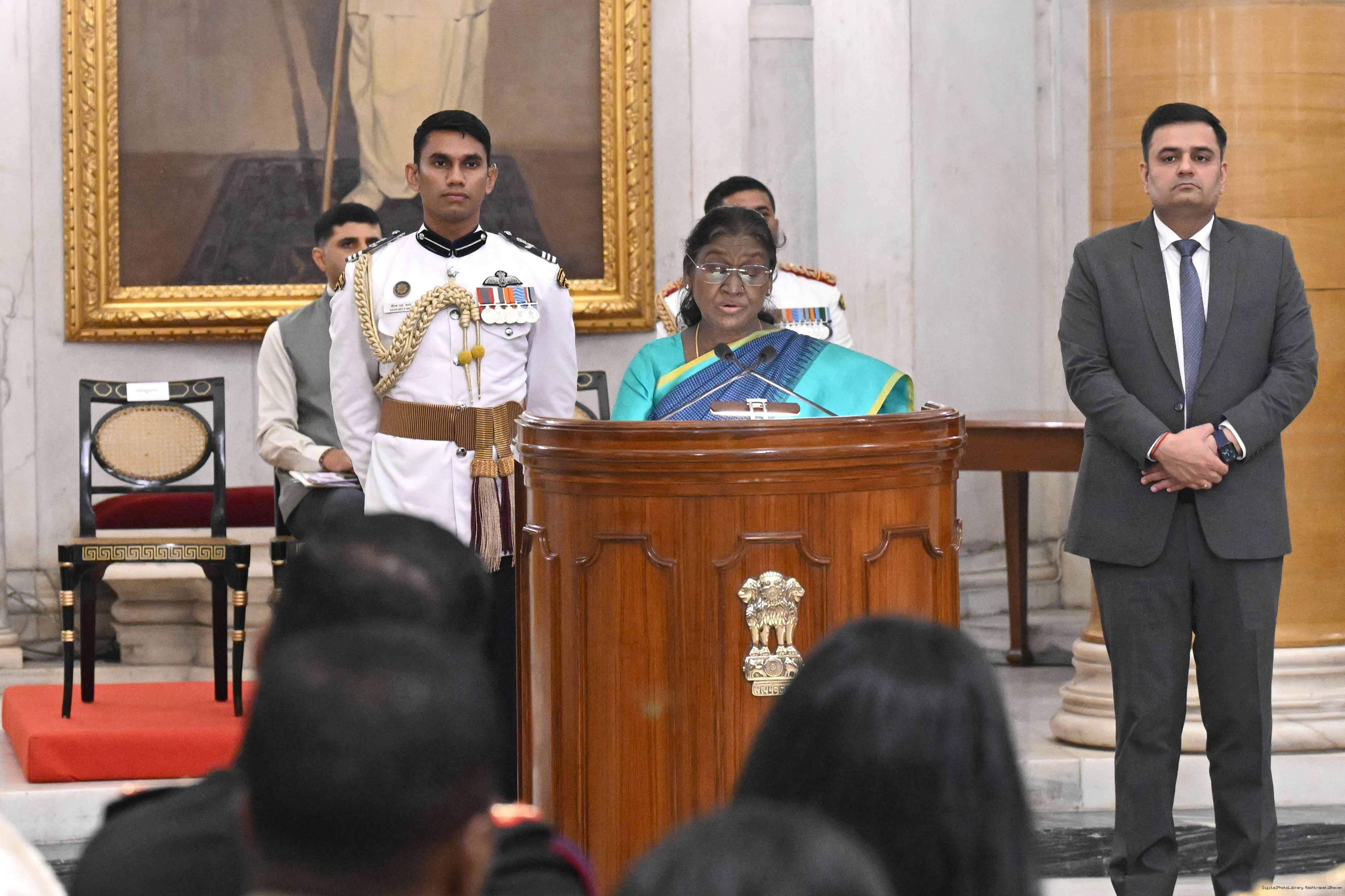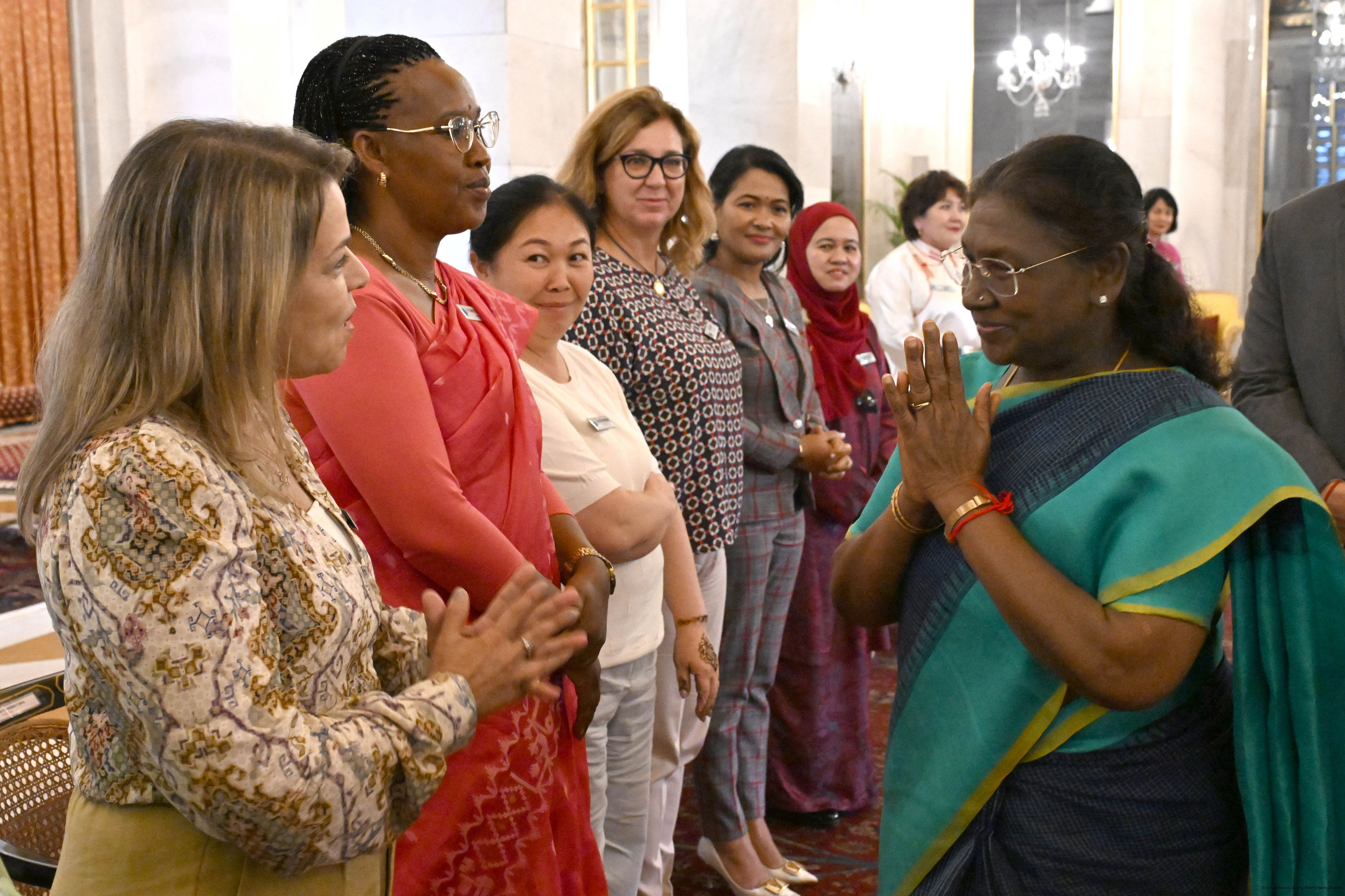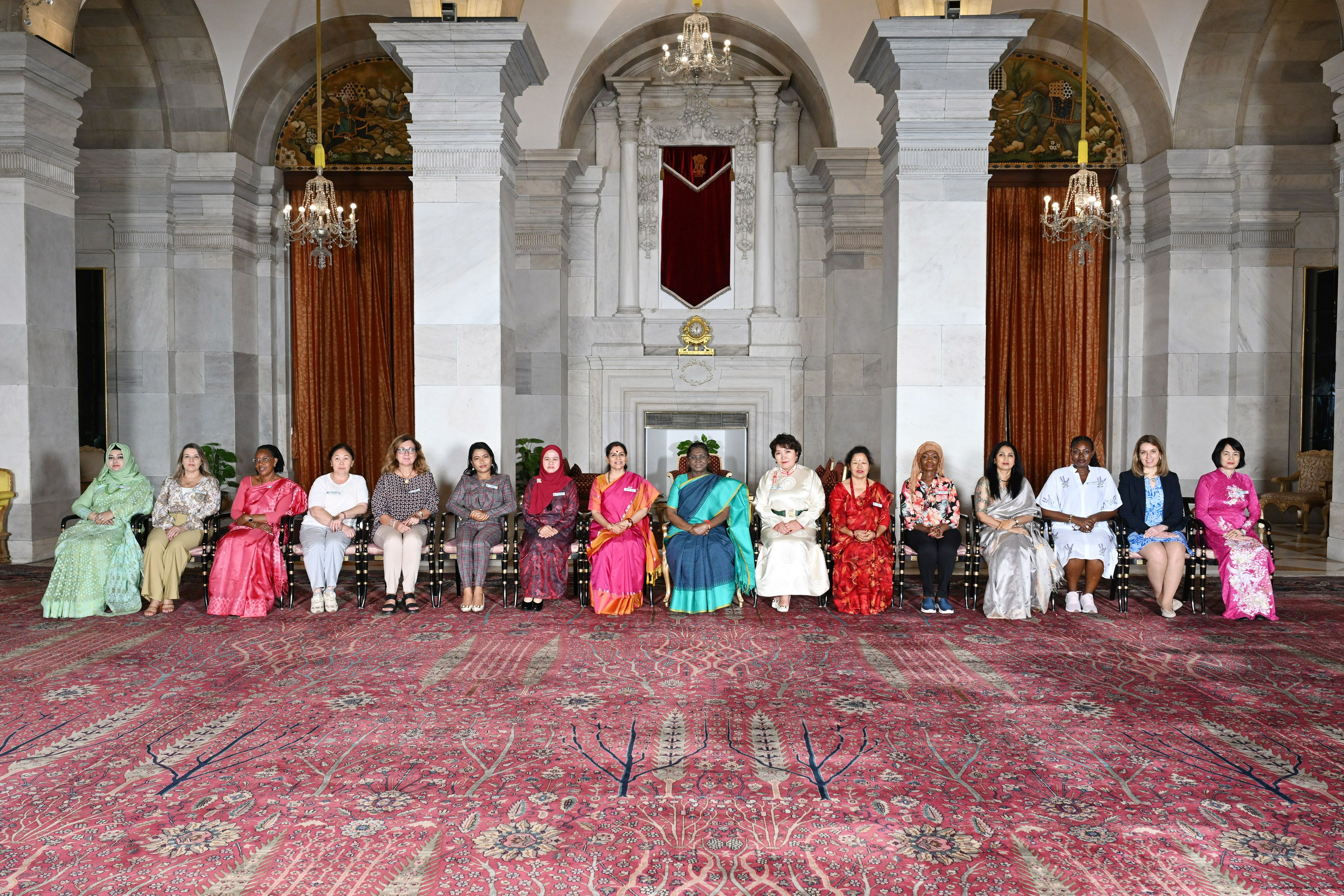 | Caption: | The Chiefs/Vice-Chiefs of Army, participating in the Army Chiefs’ Conclave for United Nations Troop Contributing Countries, along with spouses, called on the President of India, Smt. Droupadi Murmu at Rashtrapati Bhavan on October 16, 2025. |