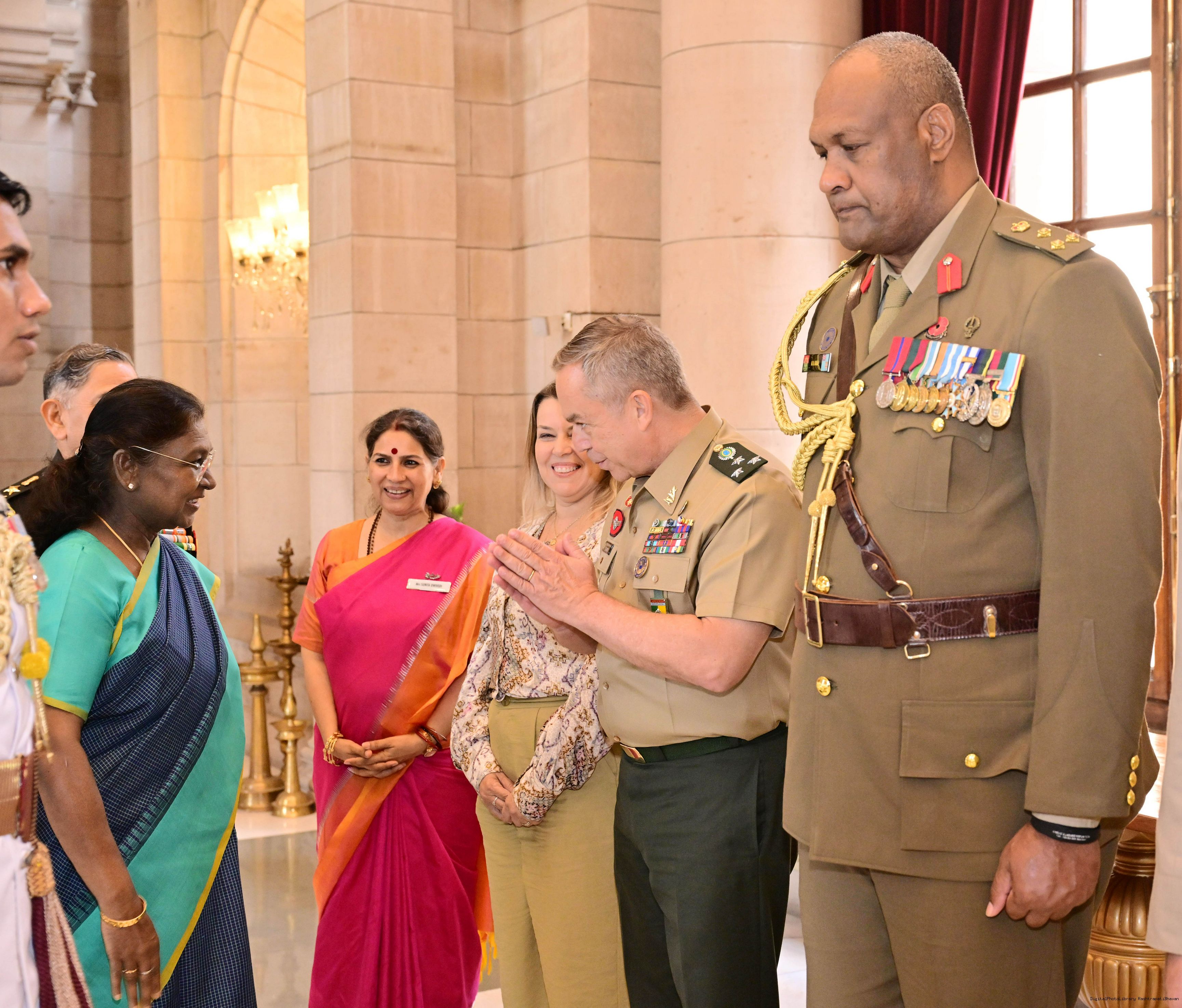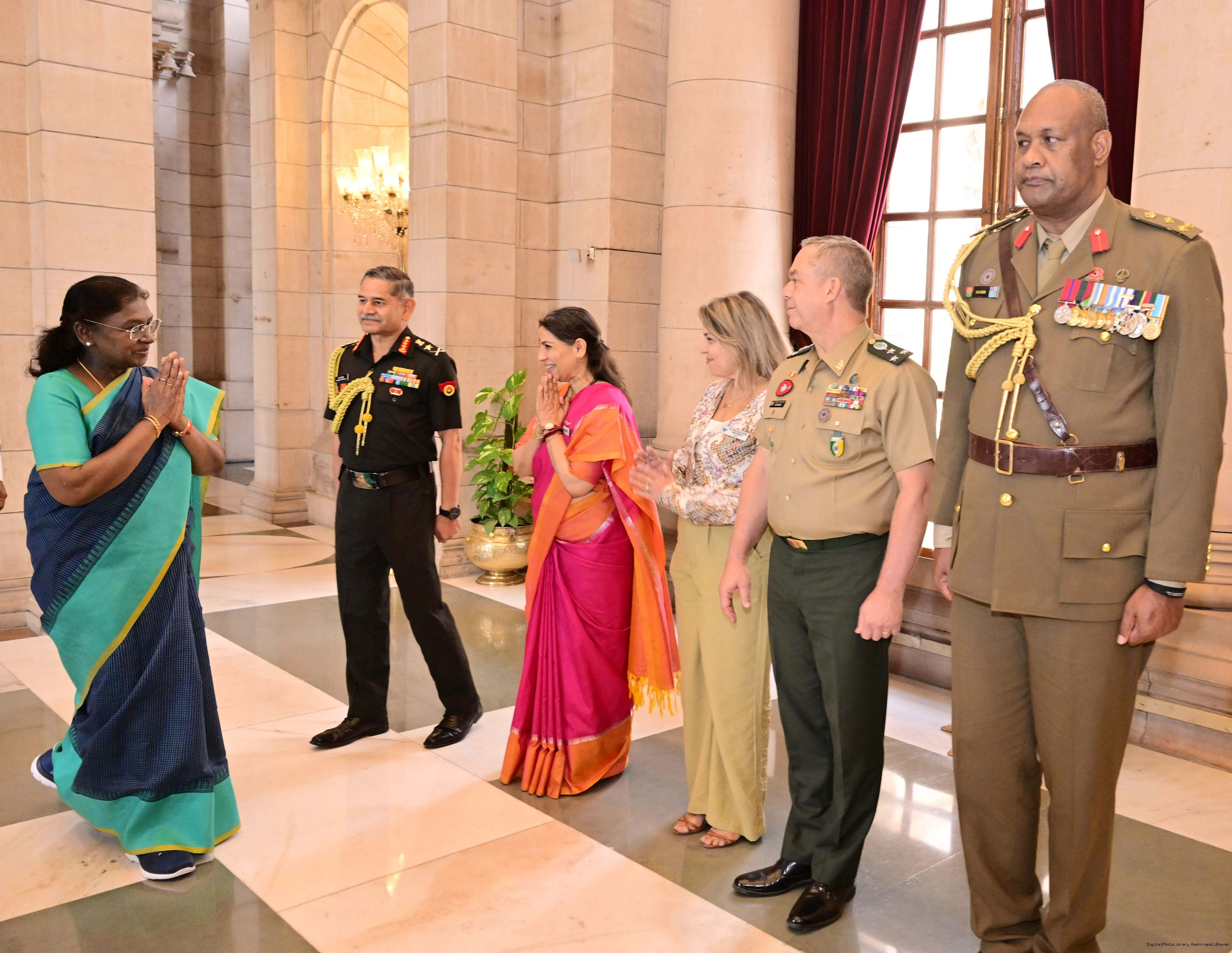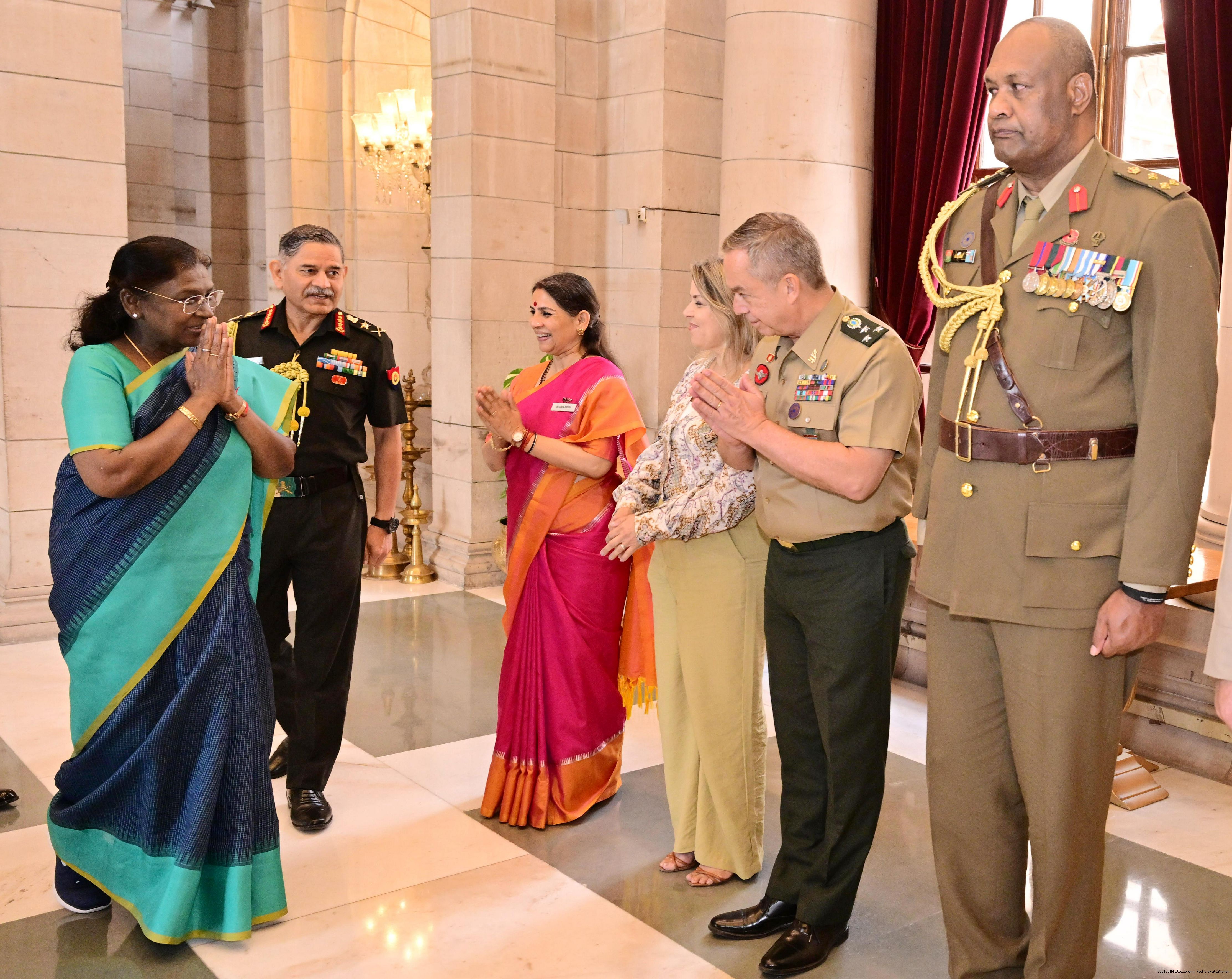 | Caption: | The Chiefs/Vice-Chiefs of Army, participating in the Army Chiefs’ Conclave for United Nations Troop Contributing Countries, along with spouses, called on the President of India, Smt. Droupadi Murmu at Rashtrapati Bhavan on October 16, 2025. |