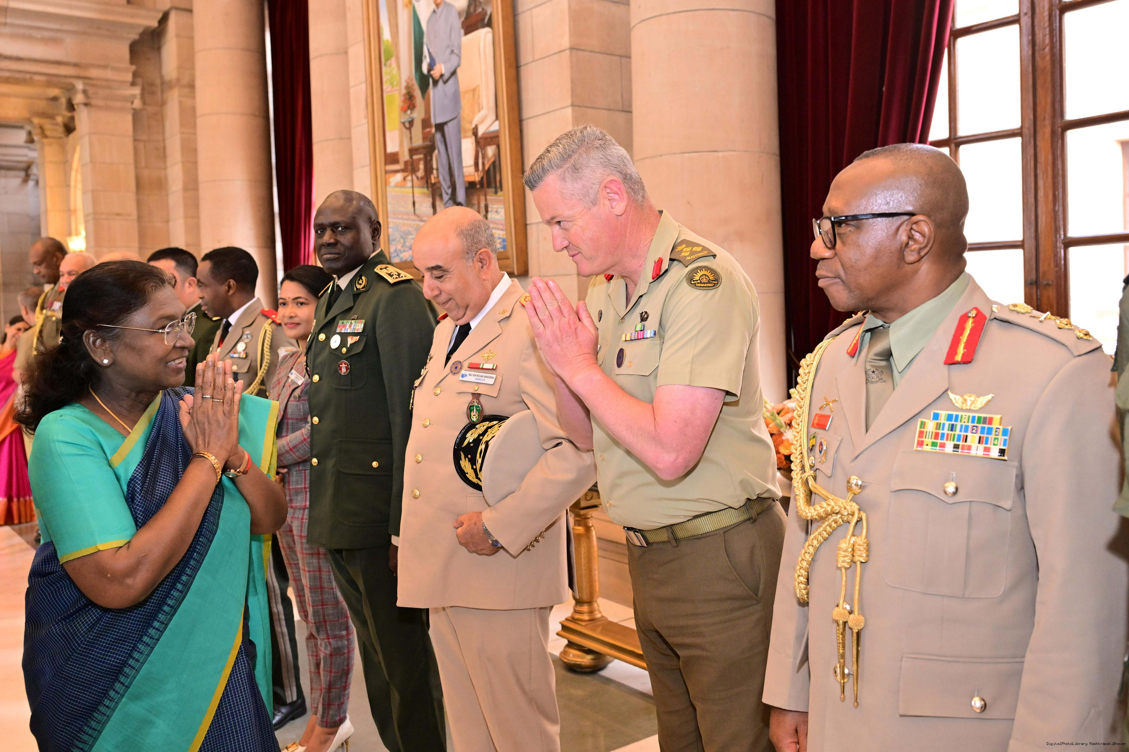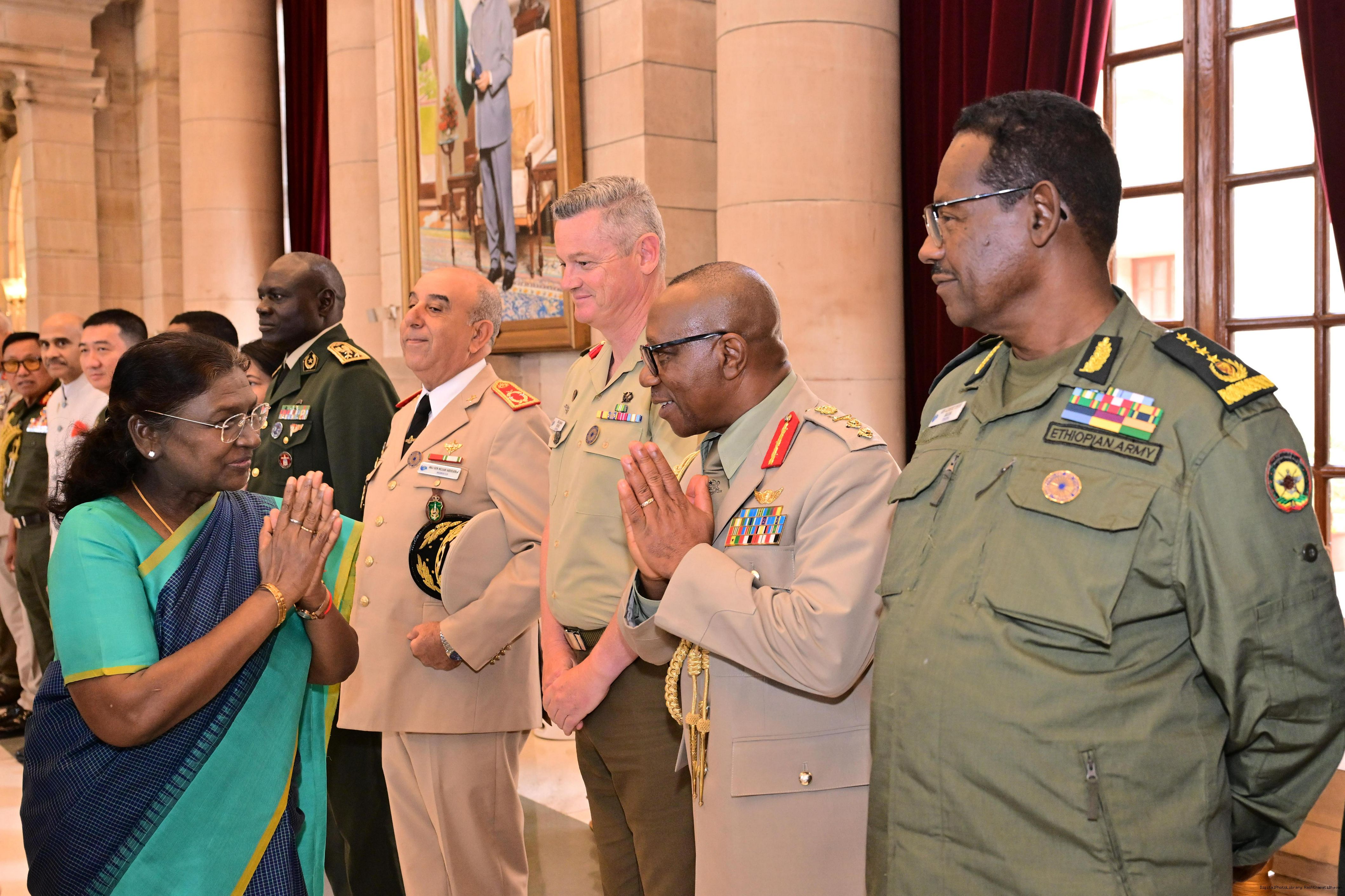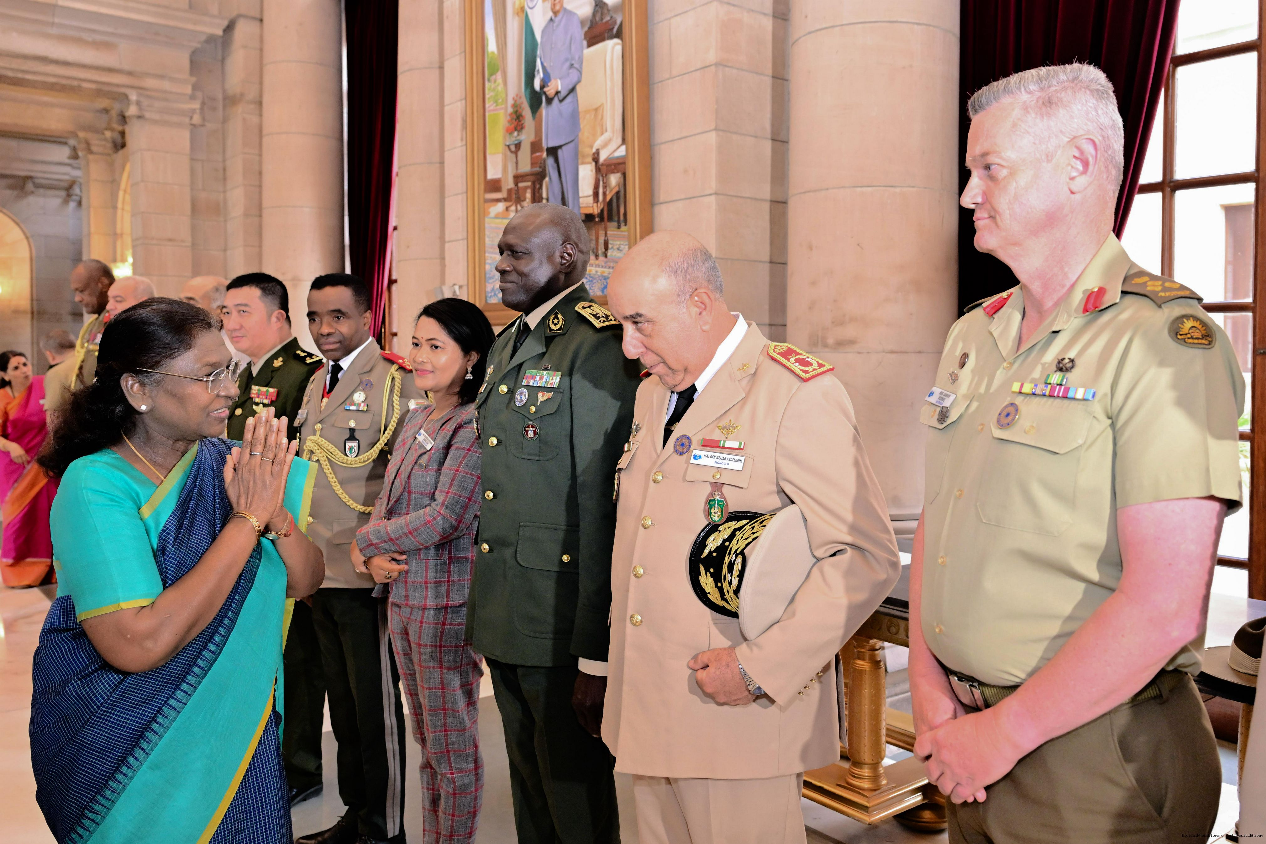 | Caption: | The Chiefs/Vice-Chiefs of Army, participating in the Army Chiefs’ Conclave for United Nations Troop Contributing Countries, along with spouses, called on the President of India, Smt. Droupadi Murmu at Rashtrapati Bhavan on October 16, 2025. |