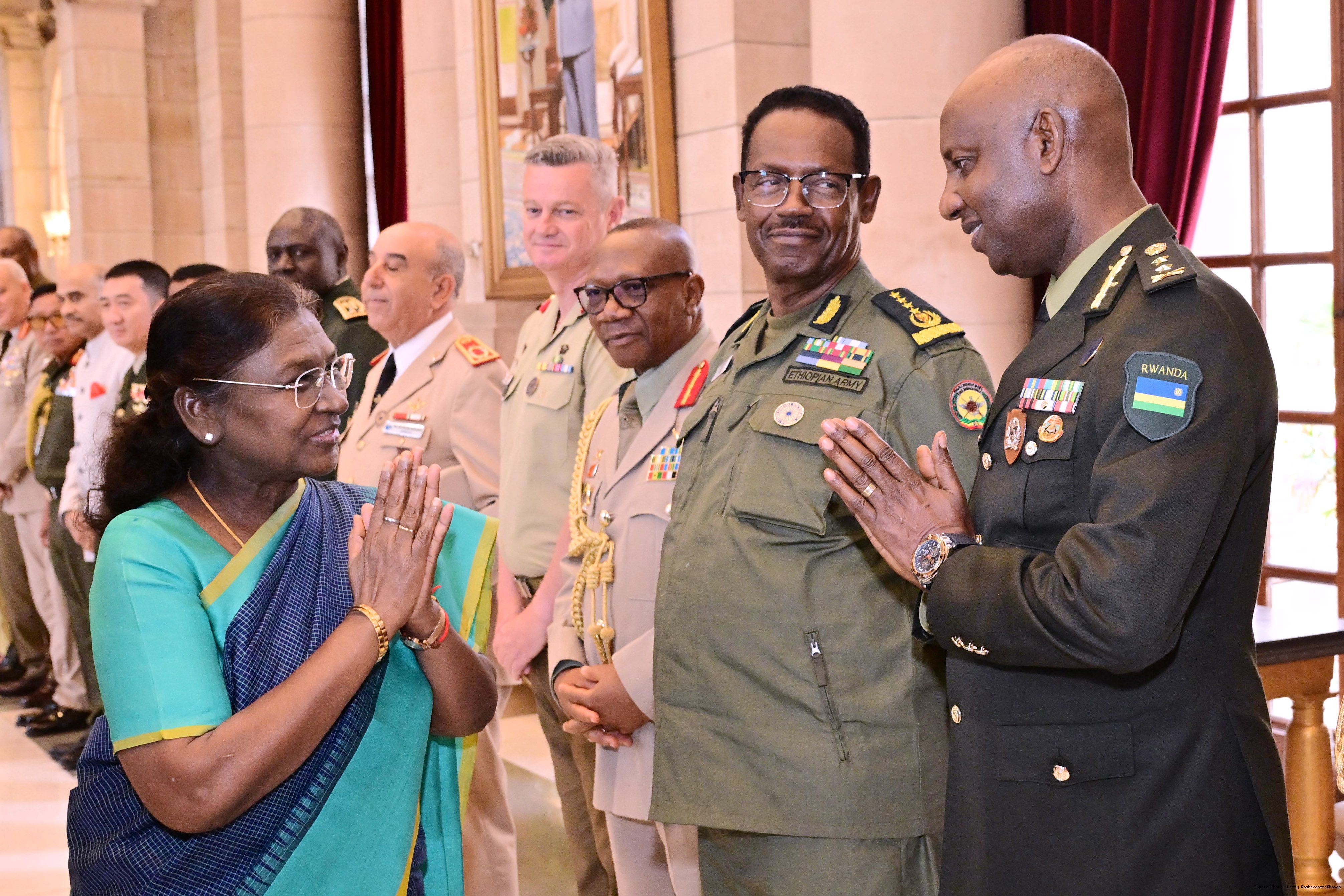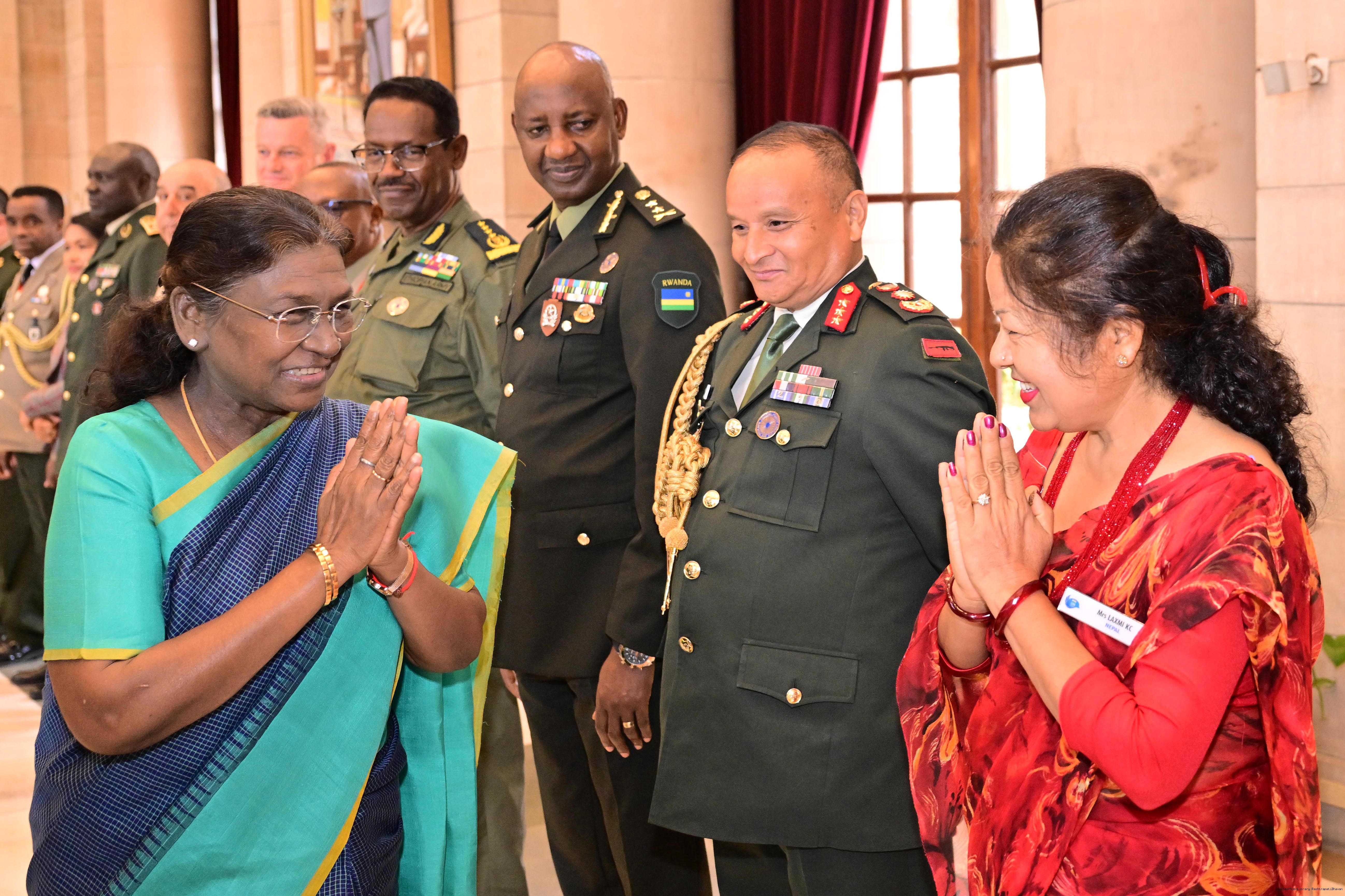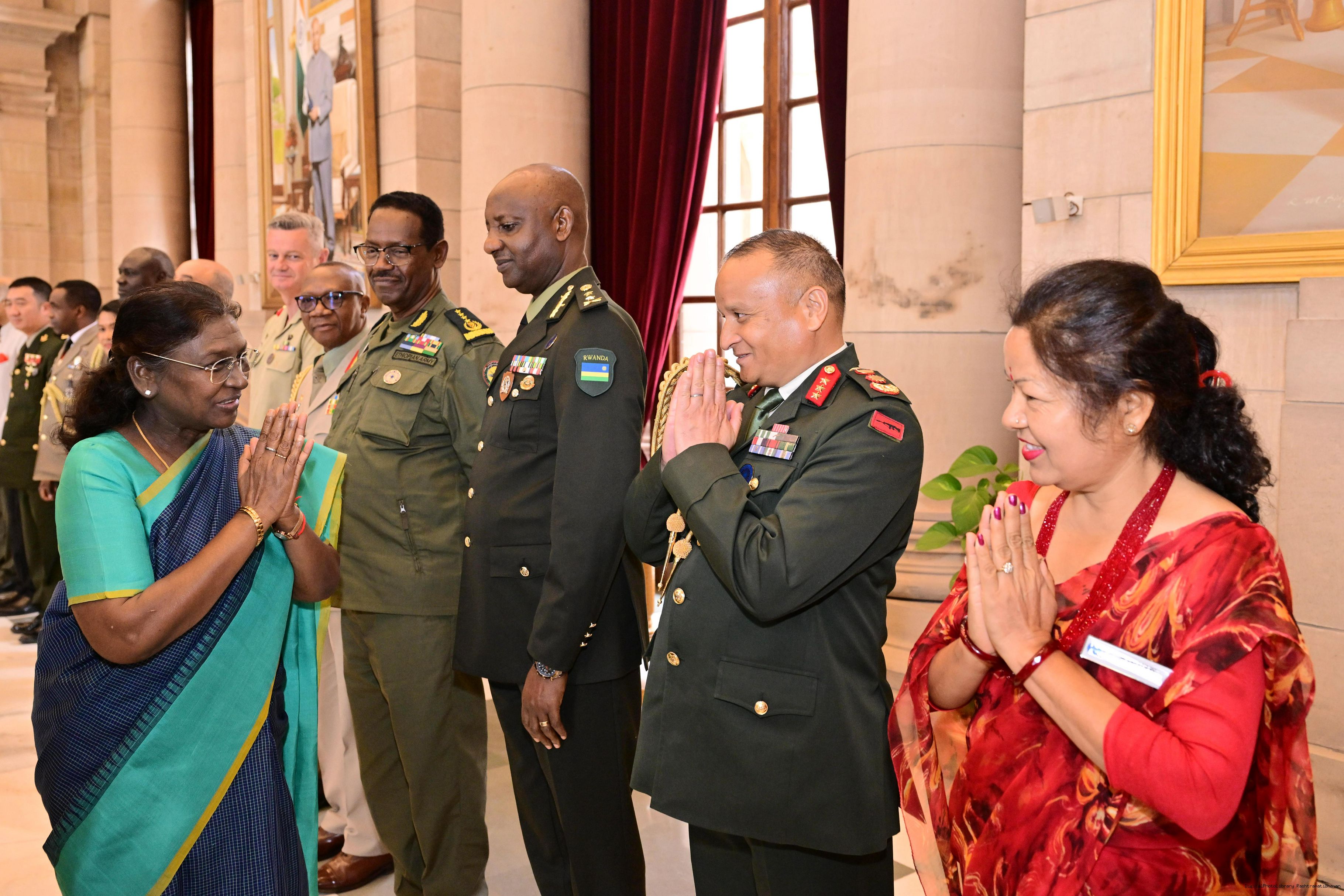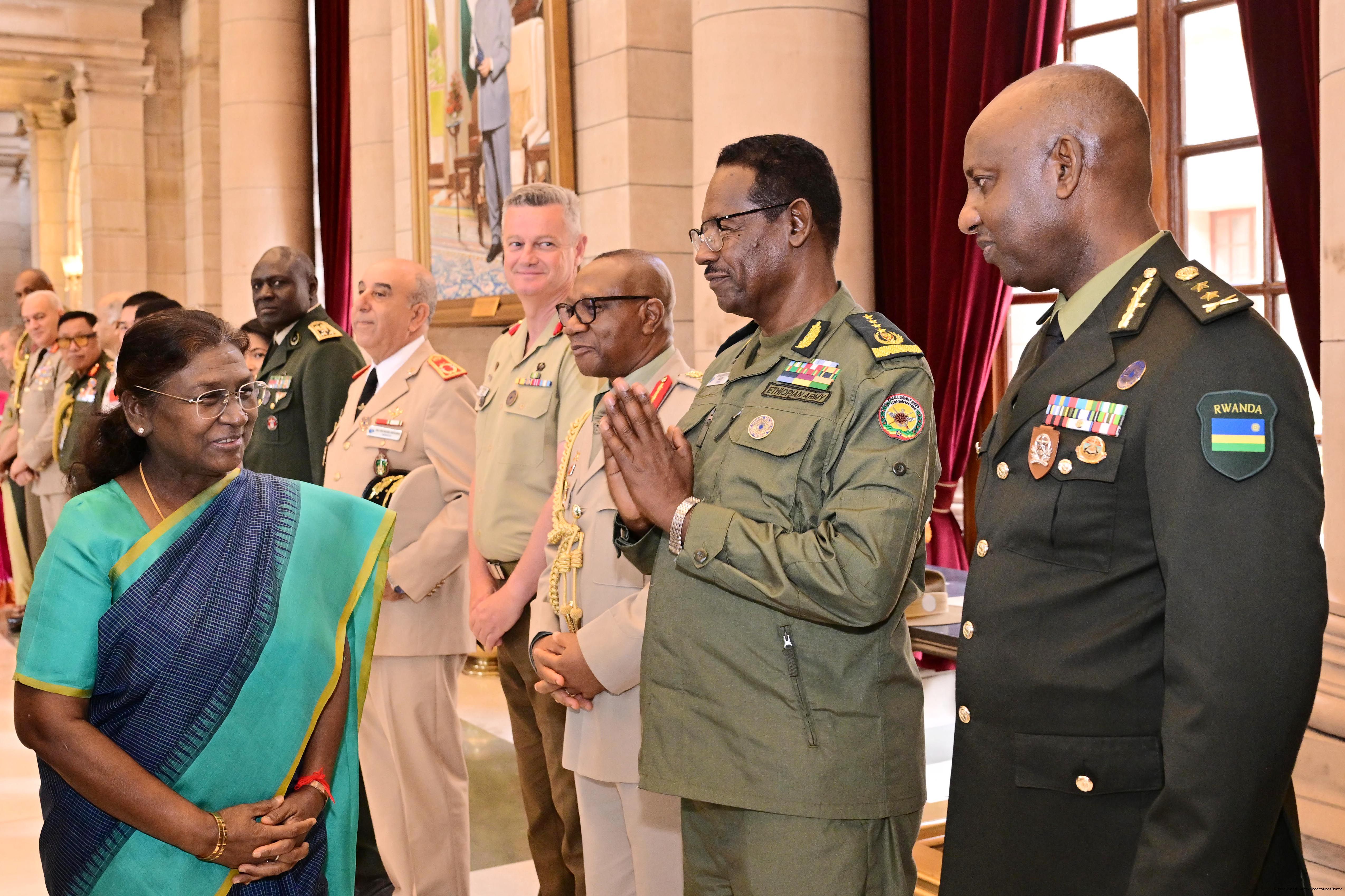 | Caption: | The Chiefs/Vice-Chiefs of Army, participating in the Army Chiefs’ Conclave for United Nations Troop Contributing Countries, along with spouses, called on the President of India, Smt. Droupadi Murmu at Rashtrapati Bhavan on October 16, 2025. |
