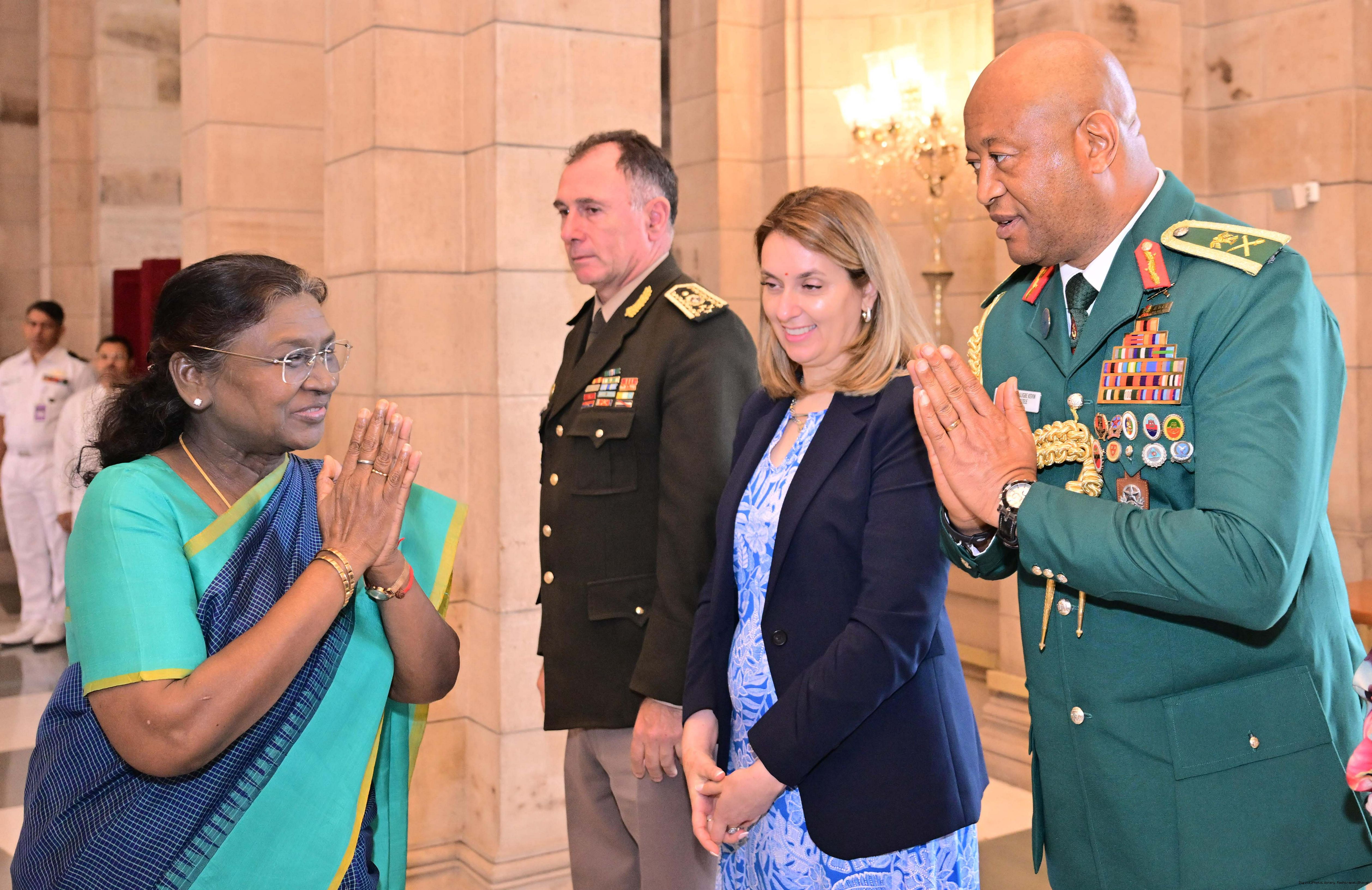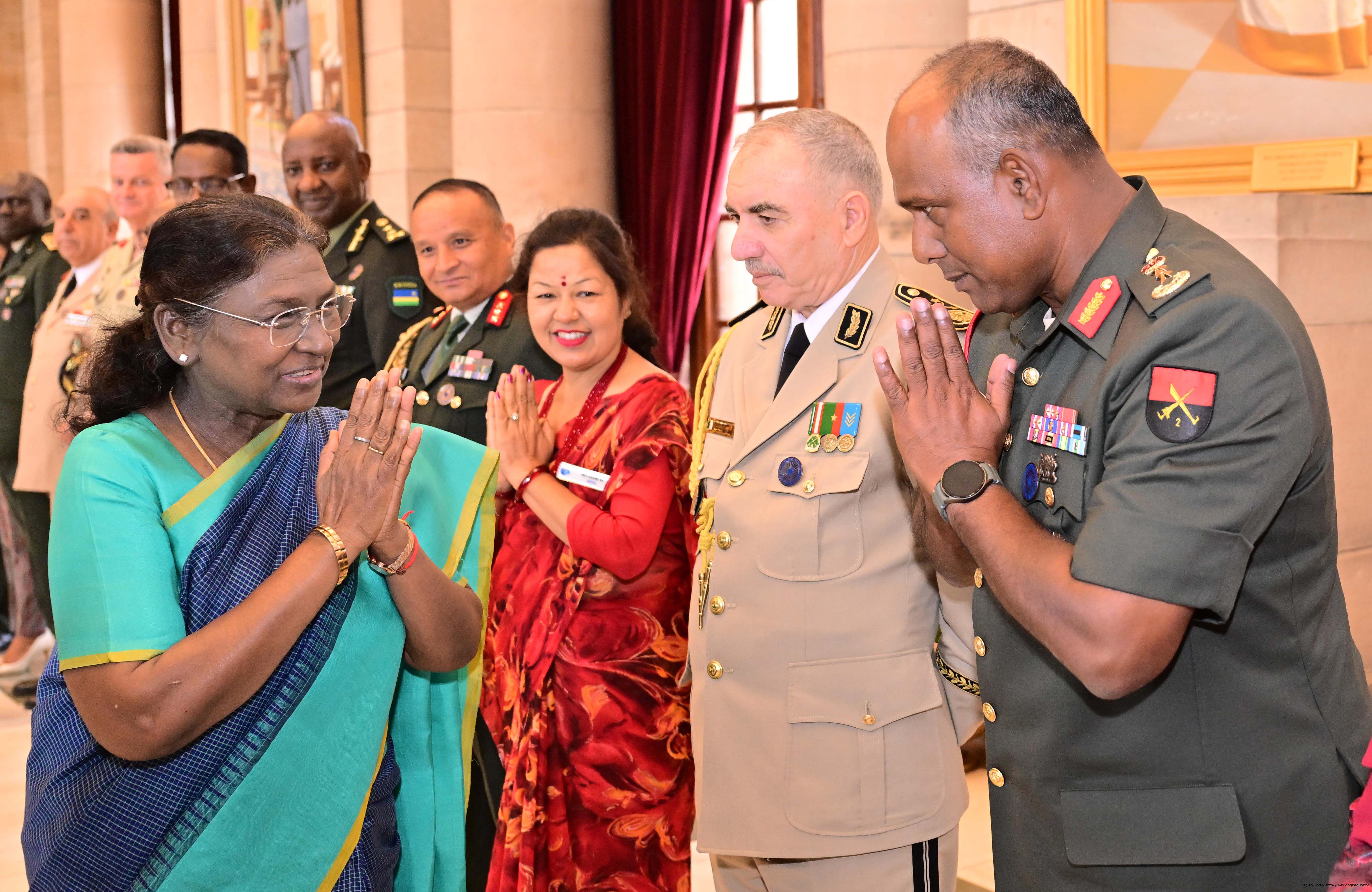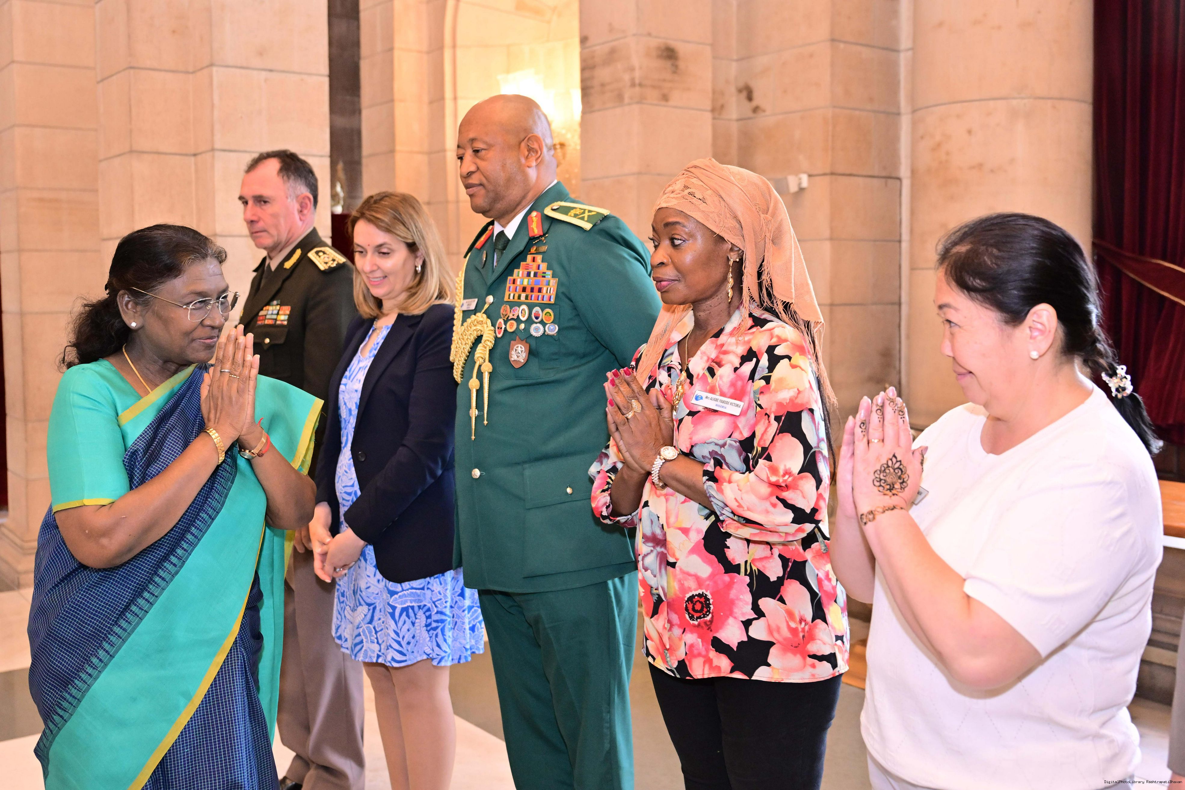 | Caption: | The Chiefs/Vice-Chiefs of Army, participating in the Army Chiefs’ Conclave for United Nations Troop Contributing Countries, along with spouses, called on the President of India, Smt. Droupadi Murmu at Rashtrapati Bhavan on October 16, 2025. |
